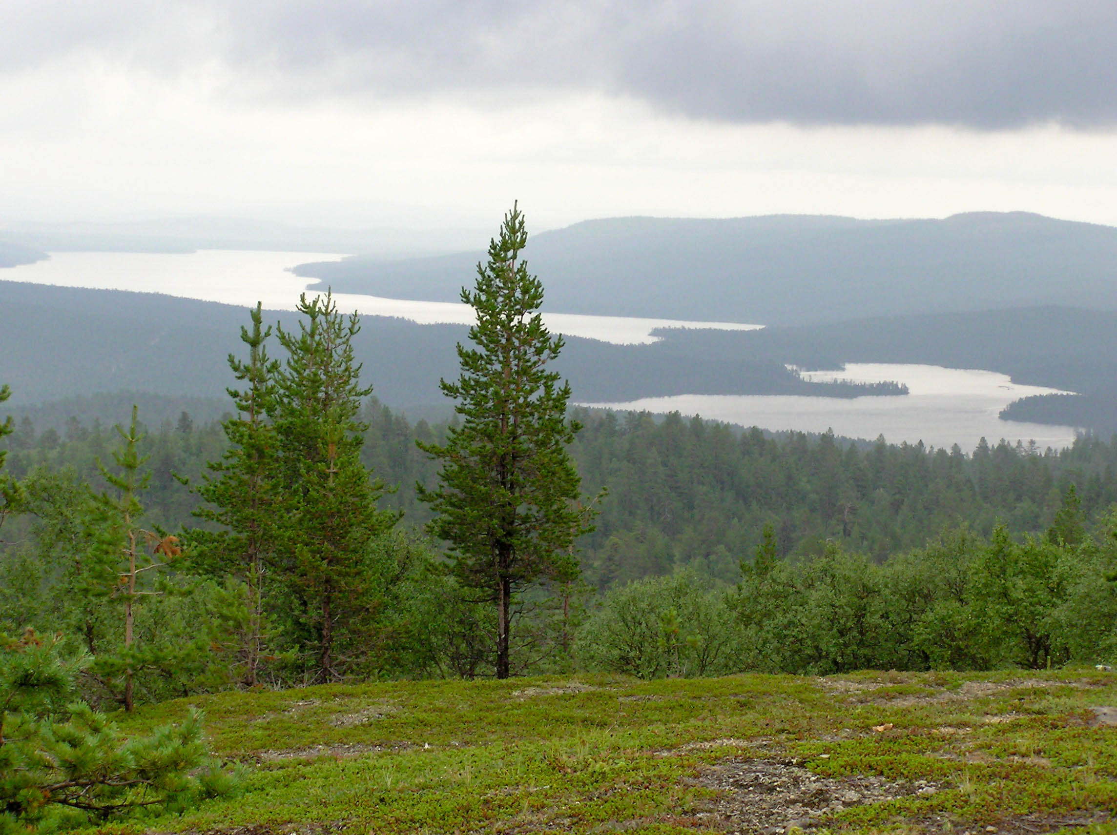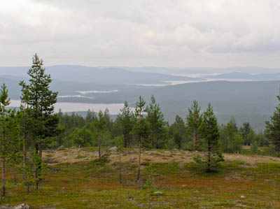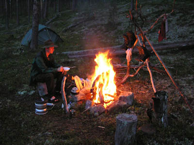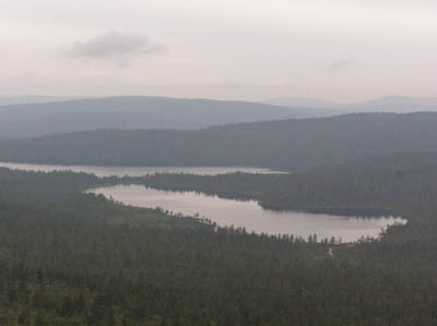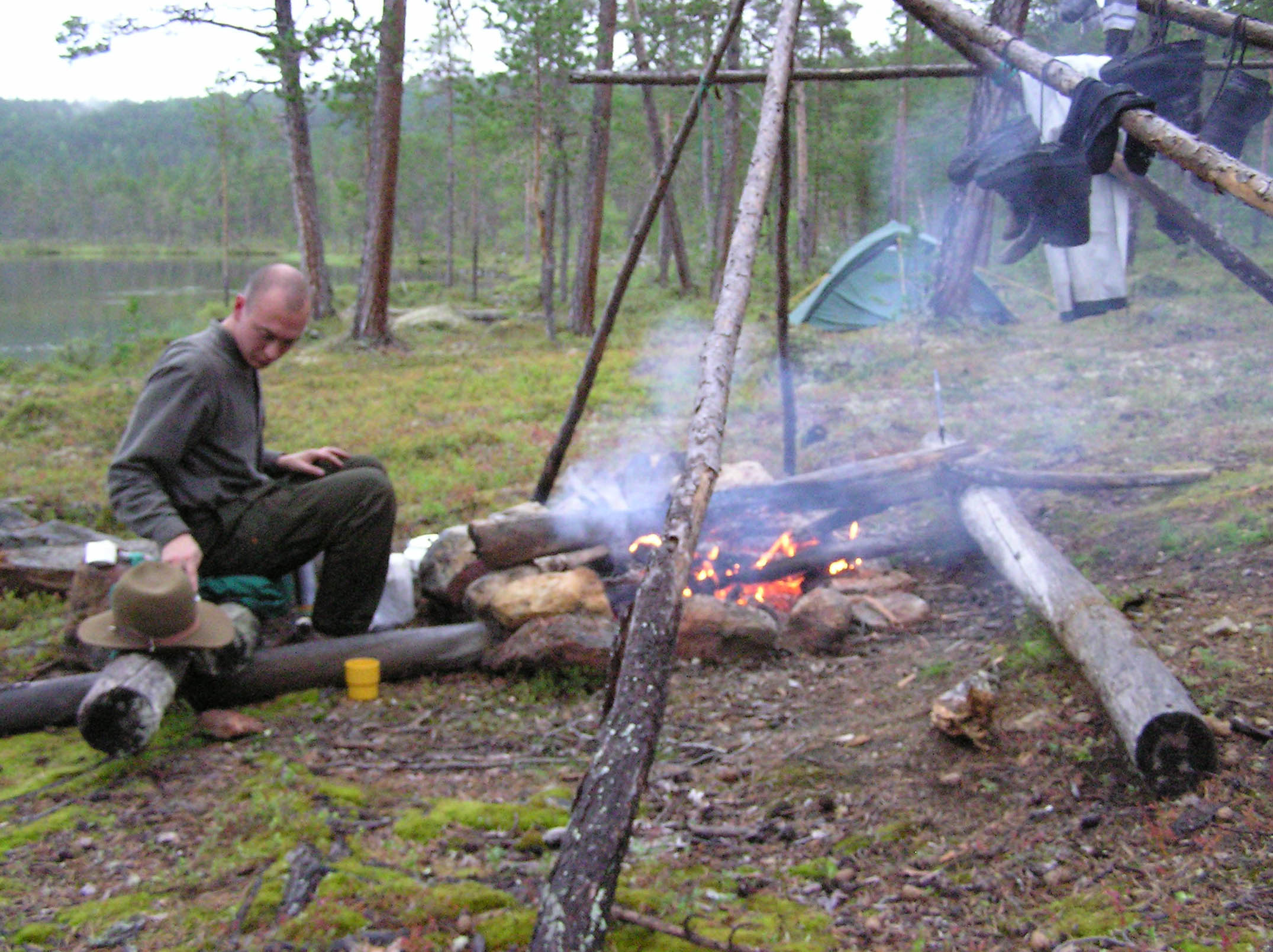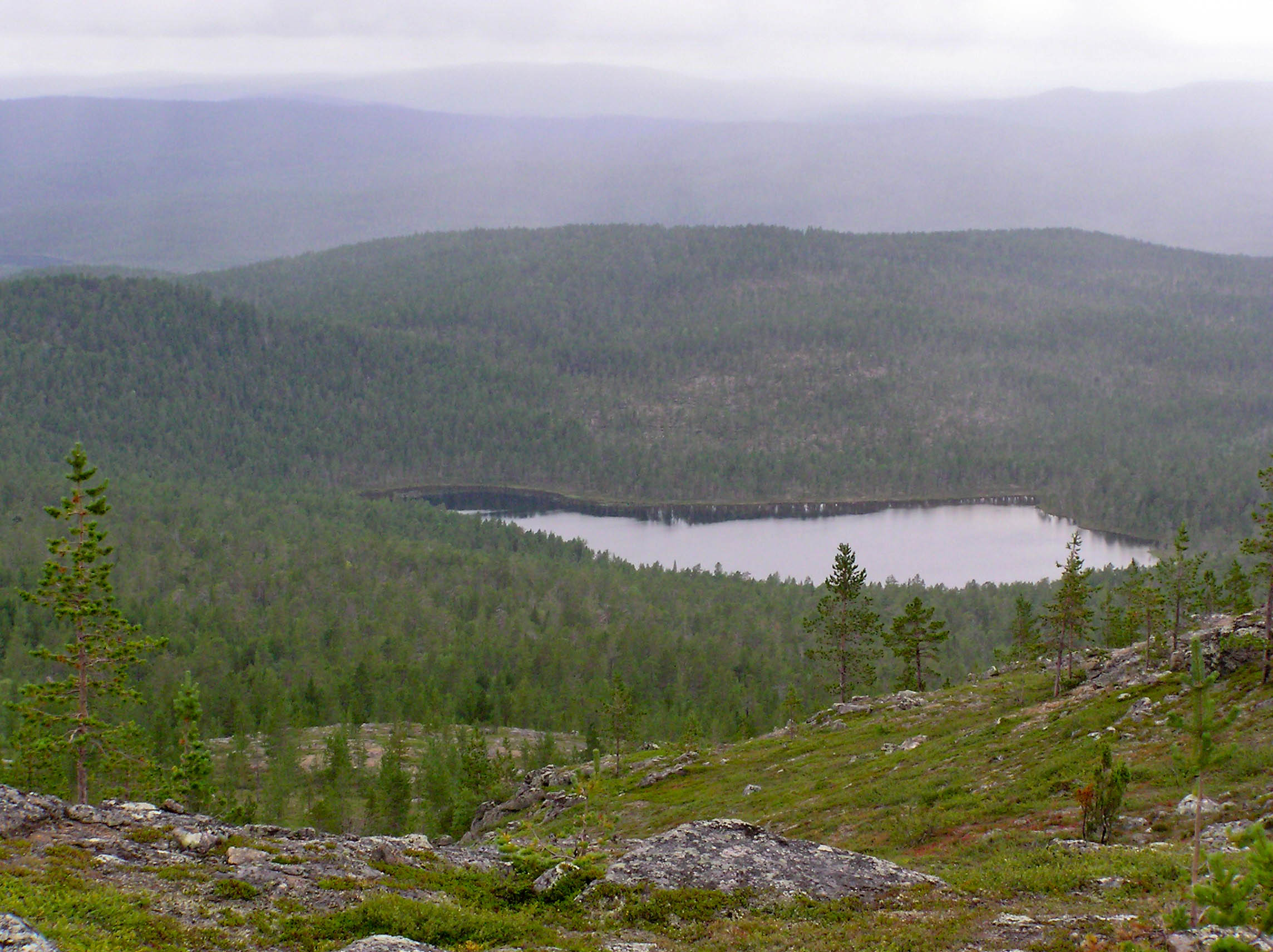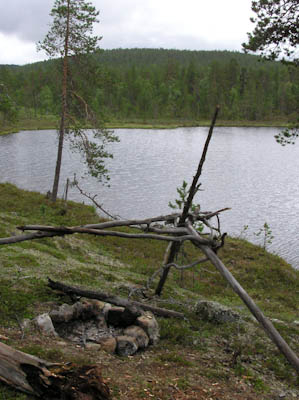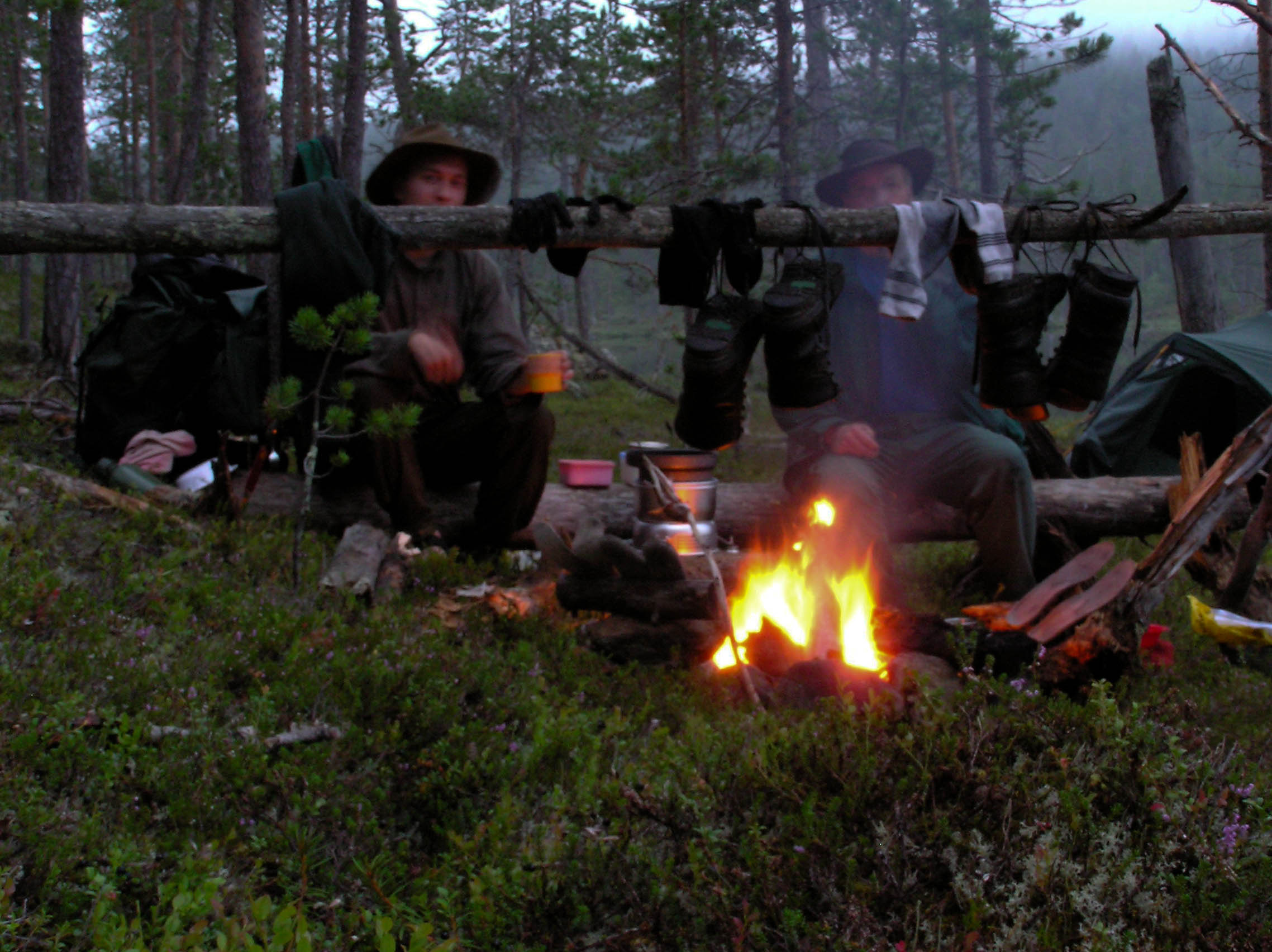 Reissu alkaa lähestyä loppuaan. Vielä pitäisi löytää yksi hieno paikka viimeisen yön leiriksi kohtuullisen matkan päähän Lapiojärvestä, jonka rannalla auto odotteli. Kun ei haluttu koluta samoja paikkoja uudestaan, päädyttiin Jakujärven pitkäjärveen. Alkajaisiksi kiivettiin Jursuloiden kaakkoiselle huipulle, josta saattaisi olla hienot näkymät ympäröiville järville. Eikä arvaus mennyt yhtään pieleen. Sään haltija ei vaan ollut kanssamme samalla aallonpituudella. Seuraava kohde oli Kalliovaarankuru, jota seuraillen päädyttäisiin kohdejärvelle. Helppokulkuinen jänkä päättyi jykänteeseen. Näkymä oli hieno, mutta kurun pohjalla oleva louhikko ei houkutellut tekemään lähempää tuttavuutta. Seurailimme jyrkänteen reunaa järvelle. Järven länsipuolelta löytyi hieno kumpare kuivaa, jäkälää kasvavaa mäntykangasta. Kankaalla lojui mielin määrin kelottuneita oksia ja runkoja. Sumun kastelema varvikko oli kastellut kenkämme niin, että heti ensitöiksemme teimme korennon vanhan nuotiopaikan ylle. Ei ehditty montaakaan heittoa tekemään, kun järvestä nousi suon reunasta aikamoinen jänkäkoira. Se ei ollut ihan sitä mitä tavoittelimme. No, tuli sieltä aika pian yksi harrikin, josta saatiin makoisat jälkiruoat. Kun seuraavat kaksi kalaa olivat taas haukia, katsottiin ettei kannata jatkaa. Toinen hauista oli senverran pahasti kiinni, että otettin ylös ja laitettiin nuotion pohjaan tekeytymään. Siitä sitten makoisat aamupalat.