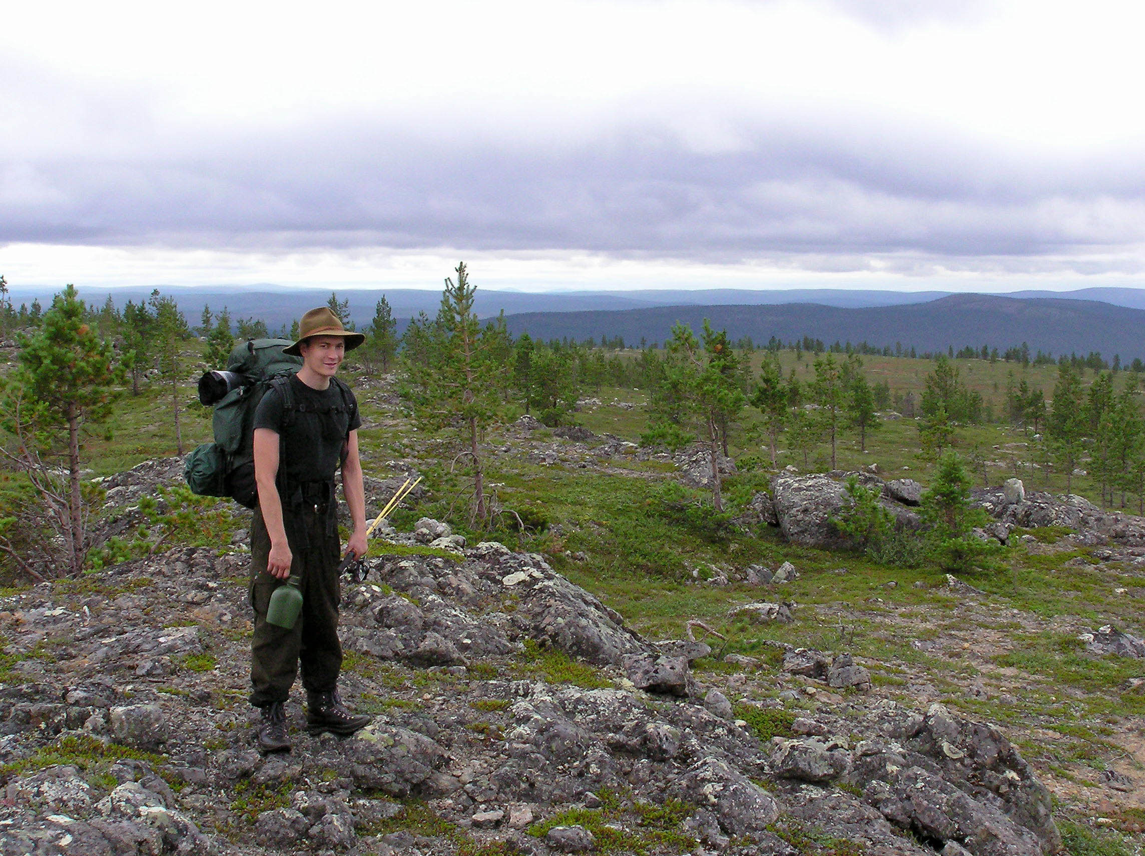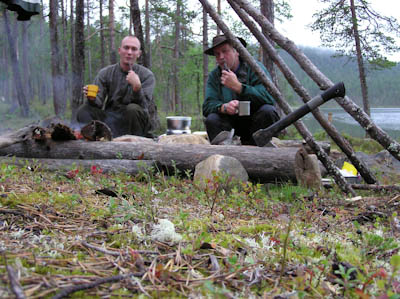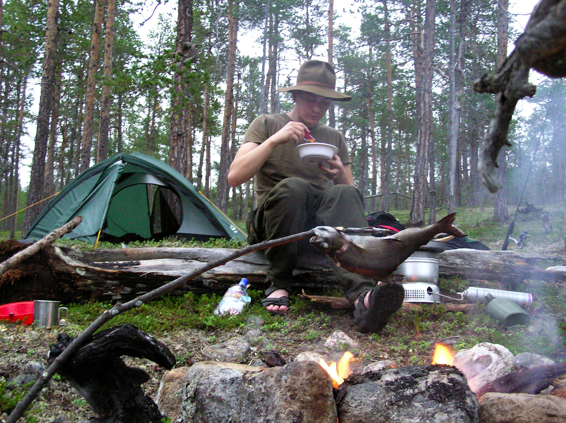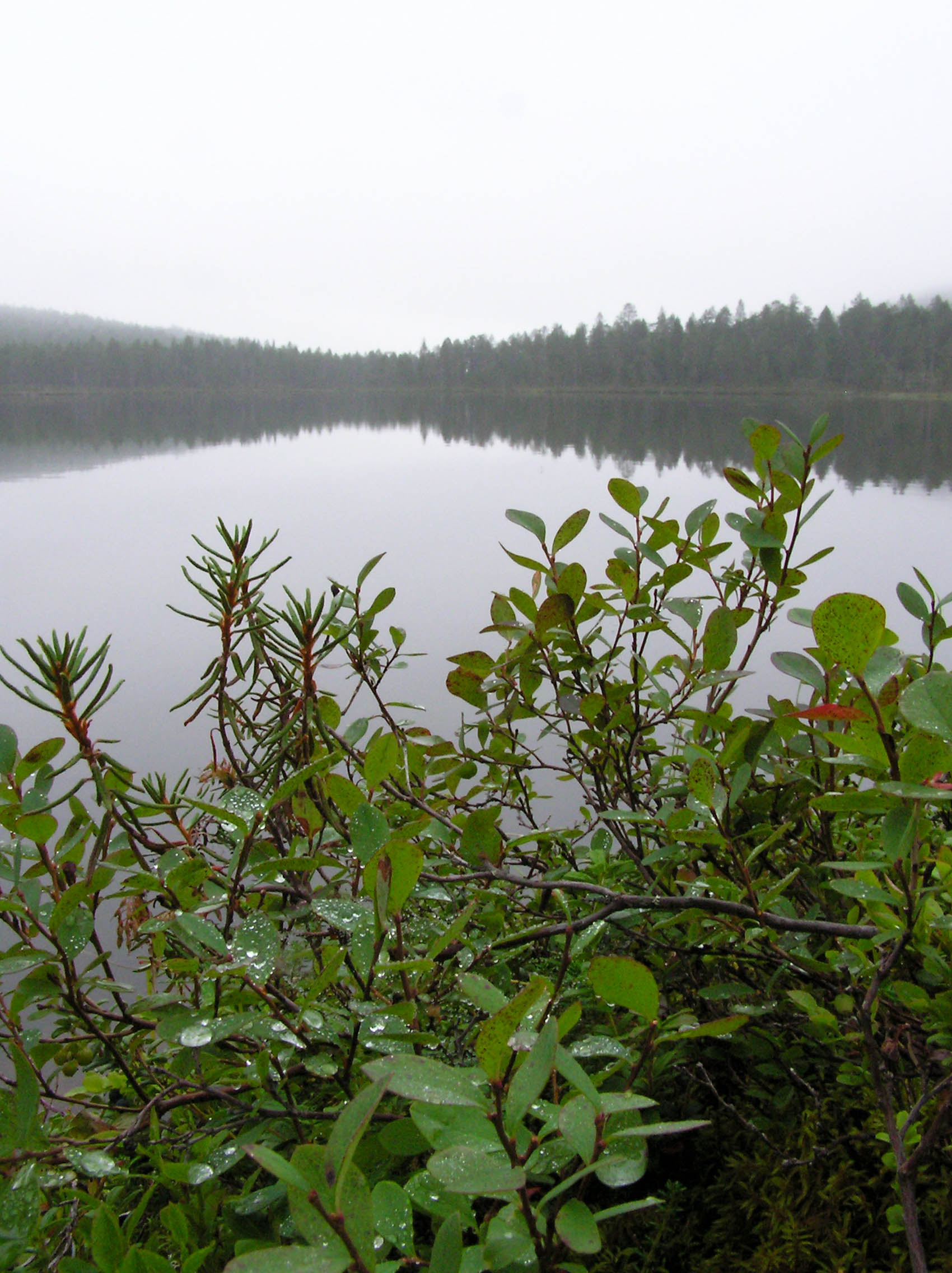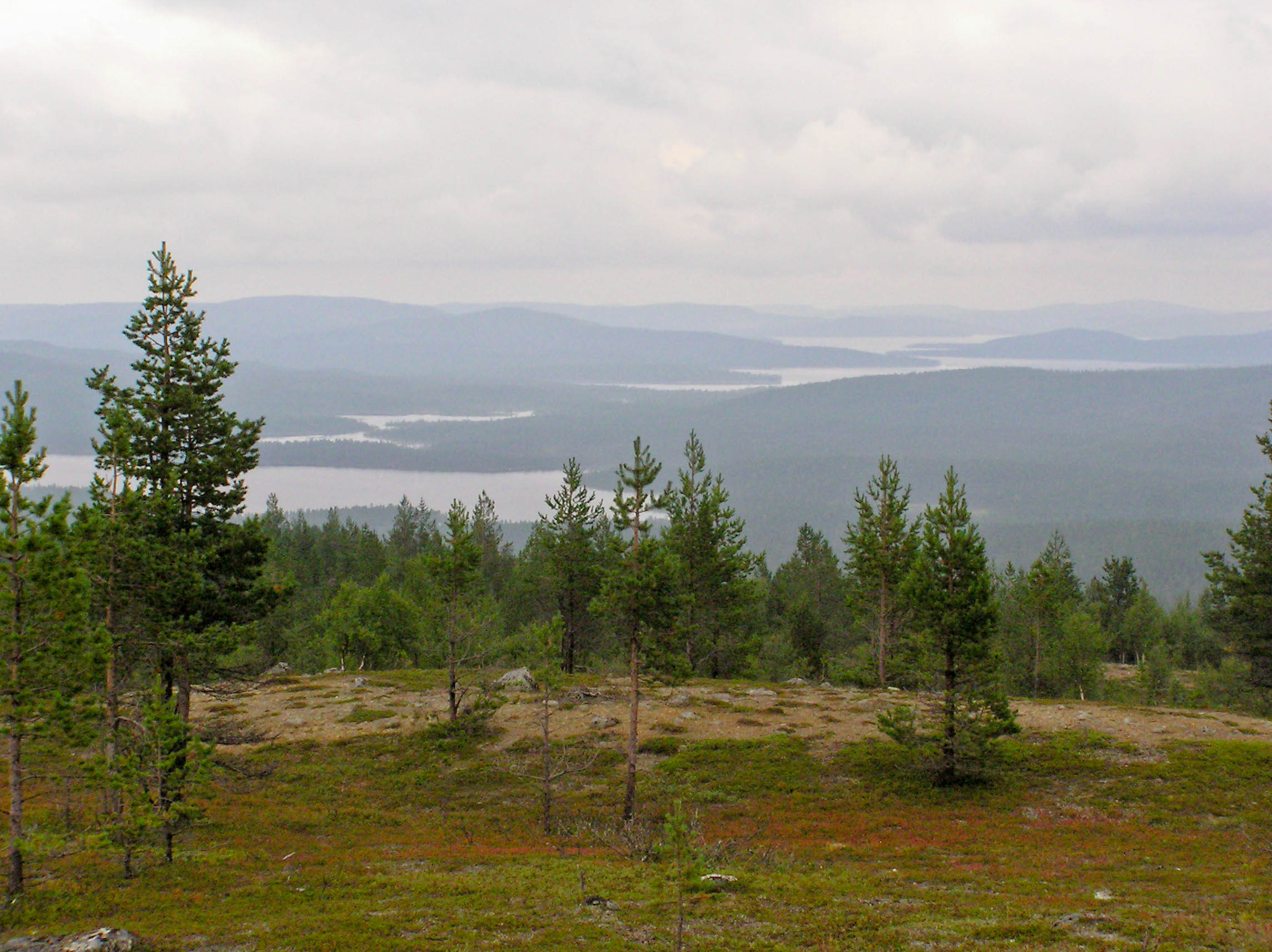 Reissu alkaa lähestyä loppuaan. Vielä pitäisi löytää yksi hieno paikka viimeisen yön leiriksi kohtuullisen matkan päähän Lapiojärvestä, jonka rannalla auto odotteli. Kun ei haluttu koluta samoja paikkoja uudestaan, päädyttiin Jakujärven pitkäjärveen. Alkajaisiksi kiivettiin Jursuloiden kaakkoiselle huipulle, josta saattaisi olla hienot näkymät ympäröiville järville. Eikä arvaus mennyt yhtään pieleen. Sään haltija ei vaan ollut kanssamme samalla aallonpituudella. Seuraava kohde oli Kalliovaarankuru, jota seuraillen päädyttäisiin kohdejärvelle. Helppokulkuinen jänkä päättyi jykänteeseen. Näkymä oli hieno, mutta kurun pohjalla oleva louhikko ei houkutellut tekemään lähempää tuttavuutta. Seurailimme jyrkänteen reunaa järvelle. Järven länsipuolelta löytyi hieno kumpare kuivaa, jäkälää kasvavaa mäntykangasta. Kankaalla lojui mielin määrin kelottuneita oksia ja runkoja. Sumun kastelema varvikko oli kastellut kenkämme niin, että heti ensitöiksemme teimme korennon vanhan nuotiopaikan ylle. Ei ehditty montaakaan heittoa tekemään, kun järvestä nousi suon reunasta aikamoinen jänkäkoira. Se ei ollut ihan sitä mitä tavoittelimme. No, tuli sieltä aika pian yksi harrikin, josta saatiin makoisat jälkiruoat. Kun seuraavat kaksi kalaa olivat taas haukia, katsottiin ettei kannata jatkaa. Toinen hauista oli senverran pahasti kiinni, että otettin ylös ja laitettiin nuotion pohjaan tekeytymään. Siitä sitten makoisat aamupalat.