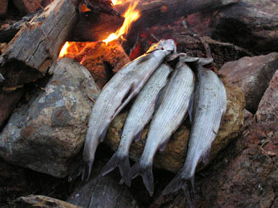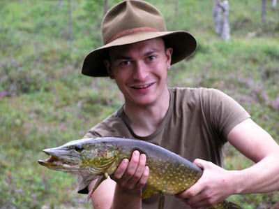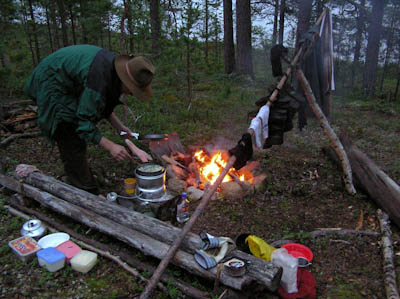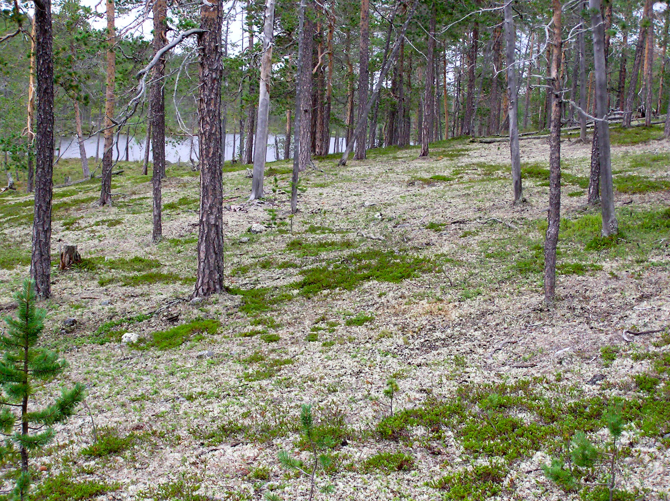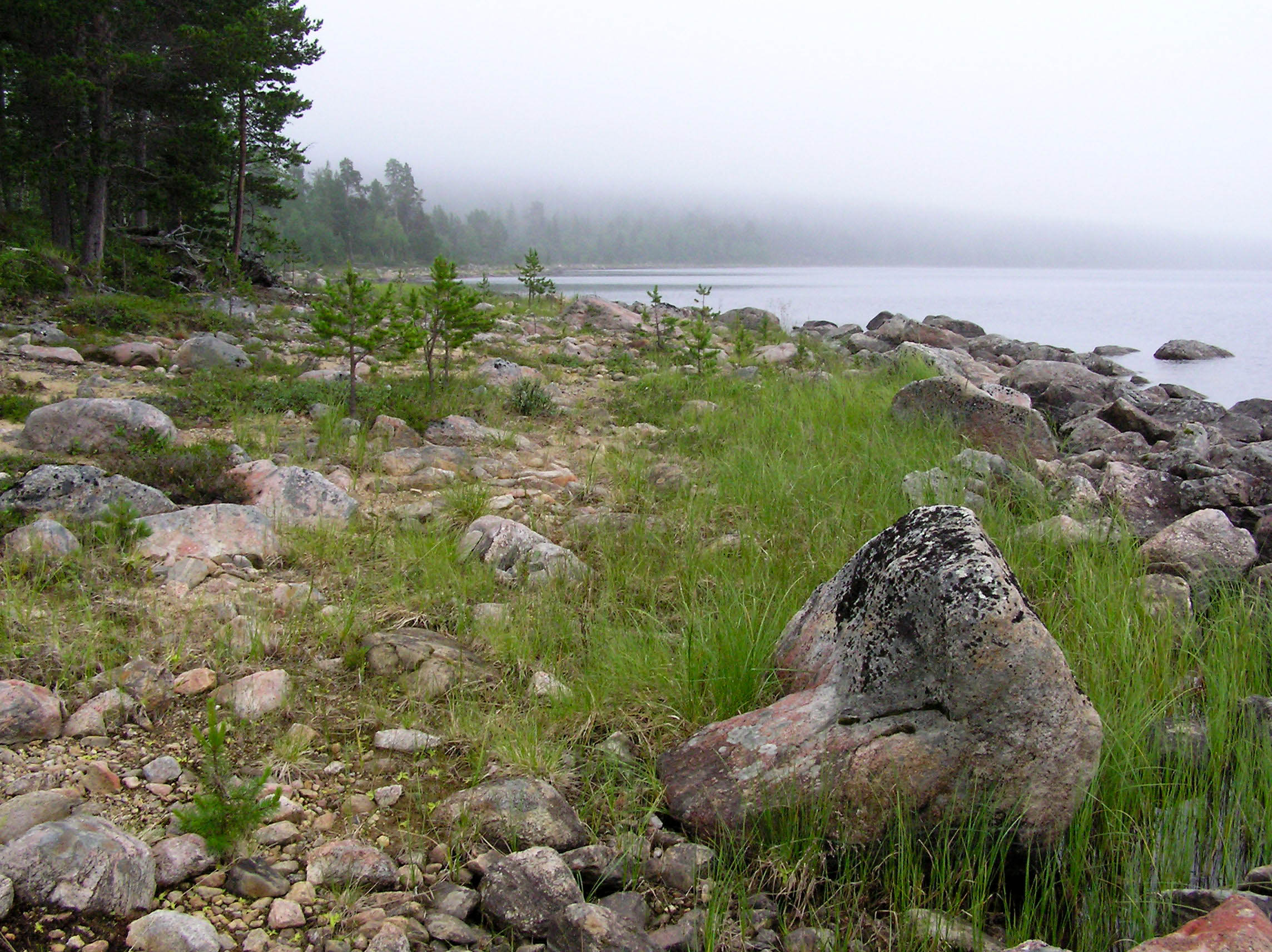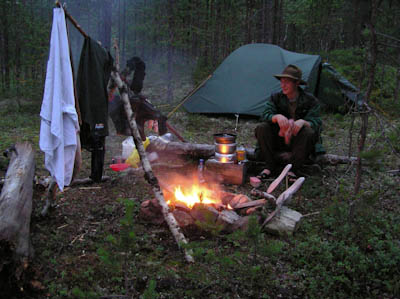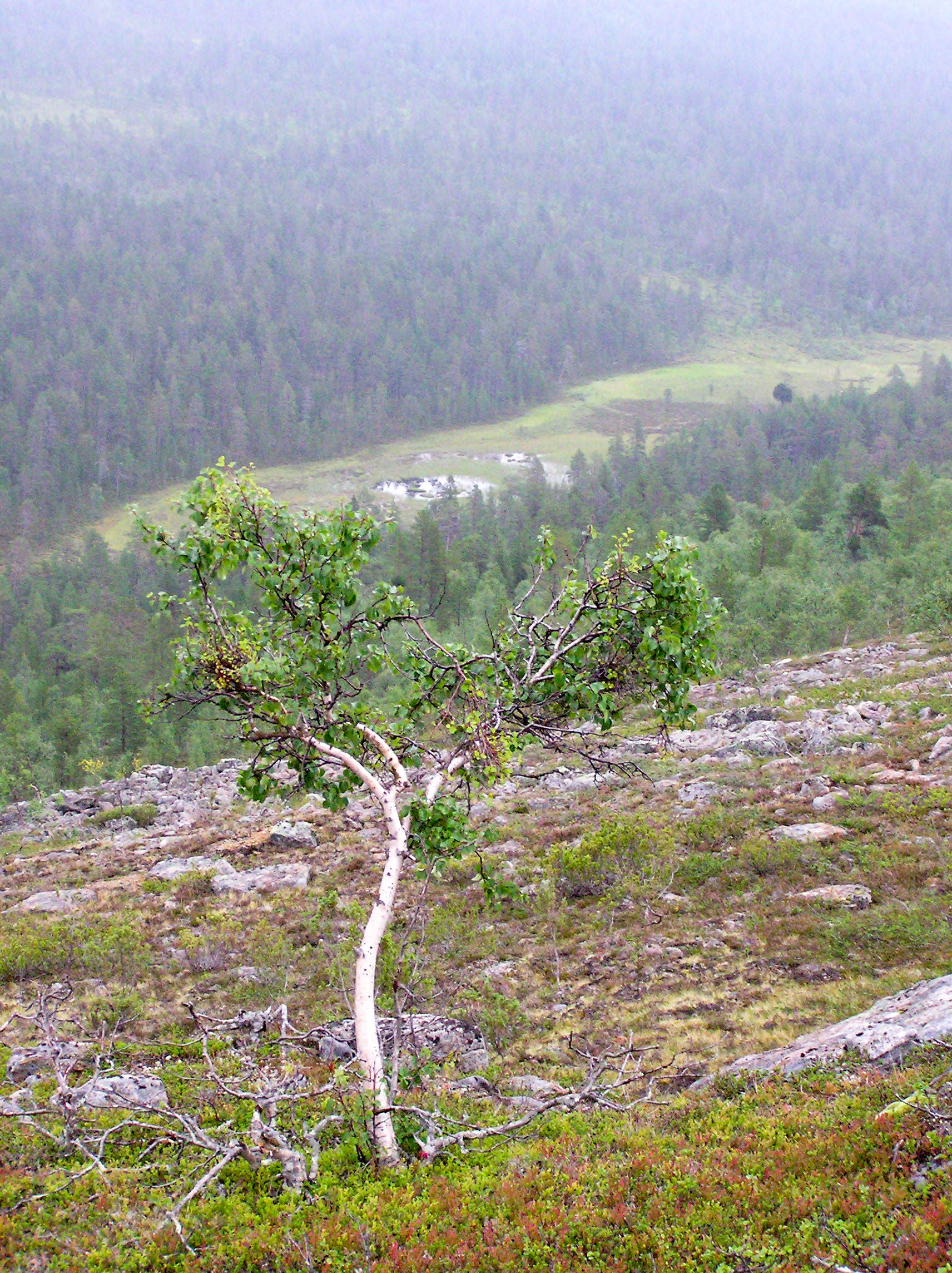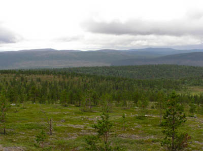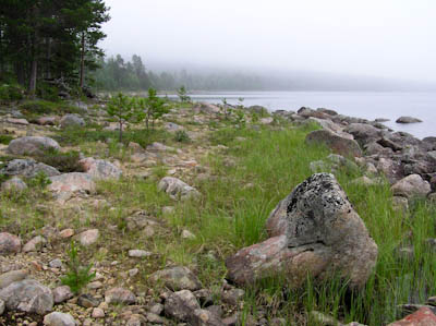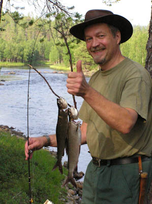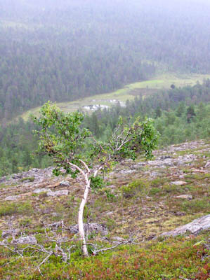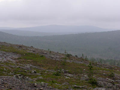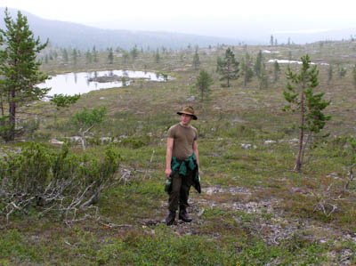Reissu alkaa lähestyä loppuaan. Vielä pitäisi löytää yksi hieno paikka viimeisen yön leiriksi kohtuullisen matkan päähän Lapiojärvestä, jonka rannalla auto odotteli. Kun ei haluttu koluta samoja paikkoja uudestaan, päädyttiin Jakujärven pitkäjärveen. Alkajaisiksi kiivettiin Jursuloiden kaakkoiselle huipulle, josta saattaisi olla hienot näkymät ympäröiville järville. Eikä arvaus mennyt yhtään pieleen. Sään haltija ei vaan ollut kanssamme samalla aallonpituudella. Seuraava kohde oli Kalliovaarankuru, jota seuraillen päädyttäisiin kohdejärvelle. Helppokulkuinen jänkä päättyi jykänteeseen. Näkymä oli hieno, mutta kurun pohjalla oleva louhikko ei houkutellut tekemään lähempää tuttavuutta. Seurailimme jyrkänteen reunaa järvelle. Järven länsipuolelta löytyi hieno kumpare kuivaa, jäkälää kasvavaa mäntykangasta. Kankaalla lojui mielin määrin kelottuneita oksia ja runkoja. Sumun kastelema varvikko oli kastellut kenkämme niin, että heti ensitöiksemme teimme korennon vanhan nuotiopaikan ylle. Ei ehditty montaakaan heittoa tekemään, kun järvestä nousi suon reunasta aikamoinen jänkäkoira. Se ei ollut ihan sitä mitä tavoittelimme. No, tuli sieltä aika pian yksi harrikin, josta saatiin makoisat jälkiruoat. Kun seuraavat kaksi kalaa olivat taas haukia, katsottiin ettei kannata jatkaa. Toinen hauista oli senverran pahasti kiinni, että otettin ylös ja laitettiin nuotion pohjaan tekeytymään. Siitä sitten makoisat aamupalat.