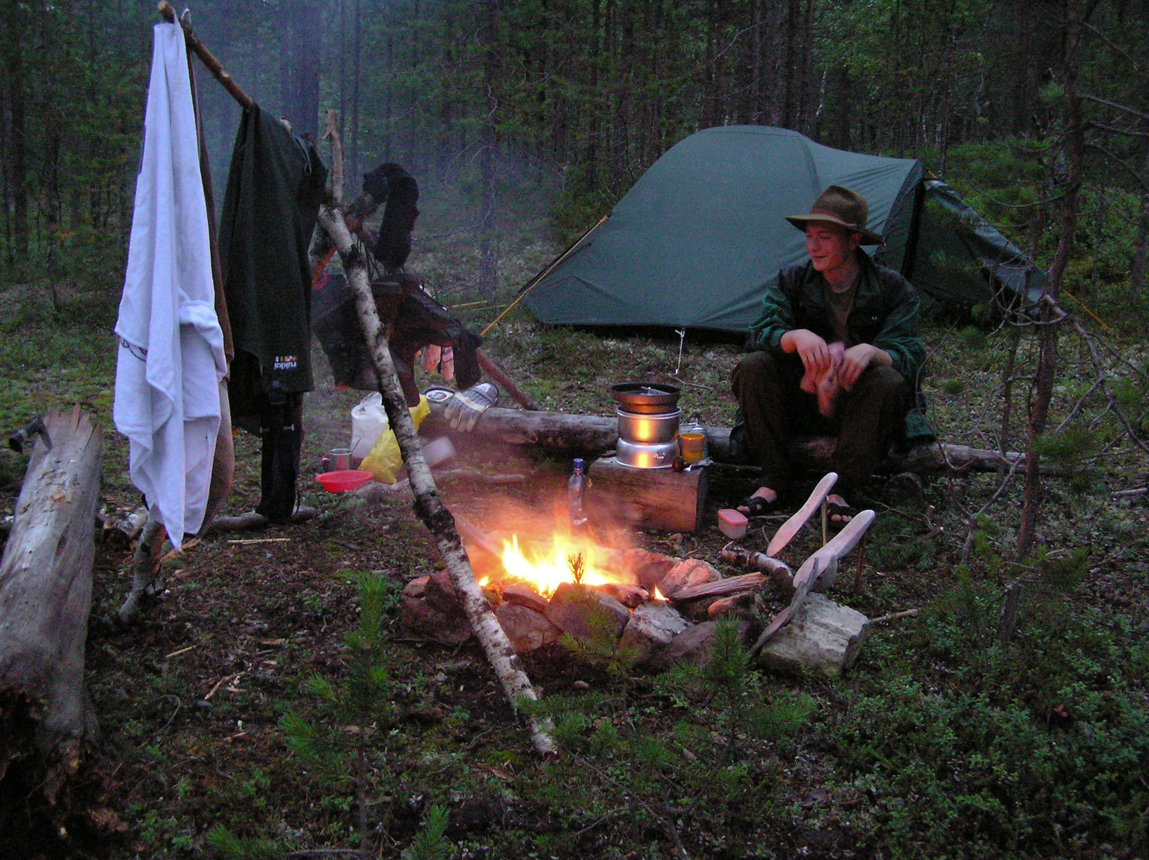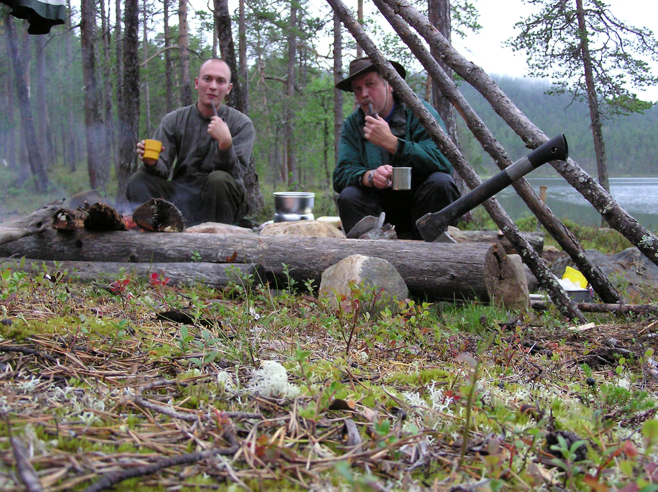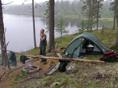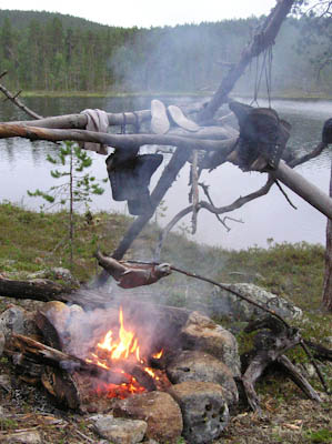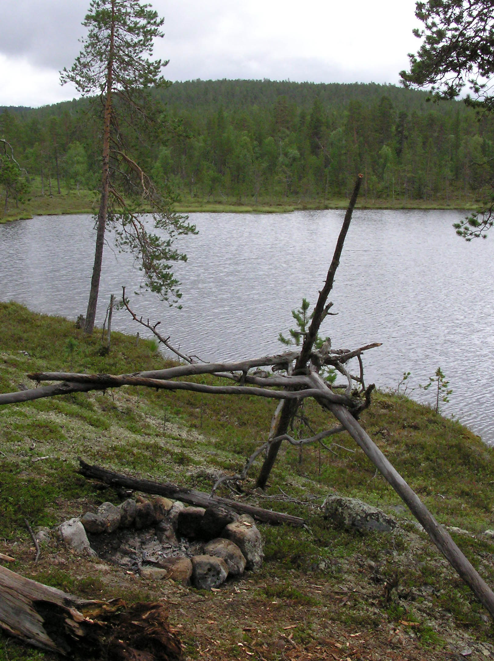 Aamulla ei onneksi satanut, mutta yön aikana laskeutunut paksu sumu kasteli aluskasvillisuuden. Se tietäisi nahkajalkinehemmoille kengänkuivattelua seuraavaksikin illaksi. Aamupalan jälkeen päätimme alkajaisiksi käydä huiputtamassa Lapiopää ja sitten jatkaa Hammasjärven suuntaan. Rinkat jätettiin huiputuksen ajaksi leiripaikalle. Palattuamme Harrijärven rantaan päivä oli jo pitkällä. Toinen leiri pystytettiin Jakujärven rantaan vajaan kolmen kilometrin päähän ensimmäisestä. Kuitenkin oltiin taas ihan eri paikassa ja se oikeastaan on siirtymisen tarkoitus, ei matkan pituus. Löydettiin hyvä leiripaikka rantatöyrään juurelta niin, että melkein ylettyi teltasta käsin kauhomaan vettä järvestä. Nuotion ylle rakennettiin taas kenkien ja sukkien kuvatteluteline. Ei se goreteksikaan pidä jalkoja kuivana, jos aluskasvillisuus on litimärkää. Jakujärvi ei antanut kuin yhden harrin iltapalaksi. Siinä kalastellessa huomattiin vaalea kota vastarannalla, joka nettikartan mukaan on nimetty Hiiri-Sammelin kodaksi. Tämäkin ilta päättyi jo ennen puolta yötä, lieneekö vielä automatkan aiheuttamaa väsymystä.