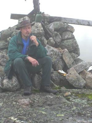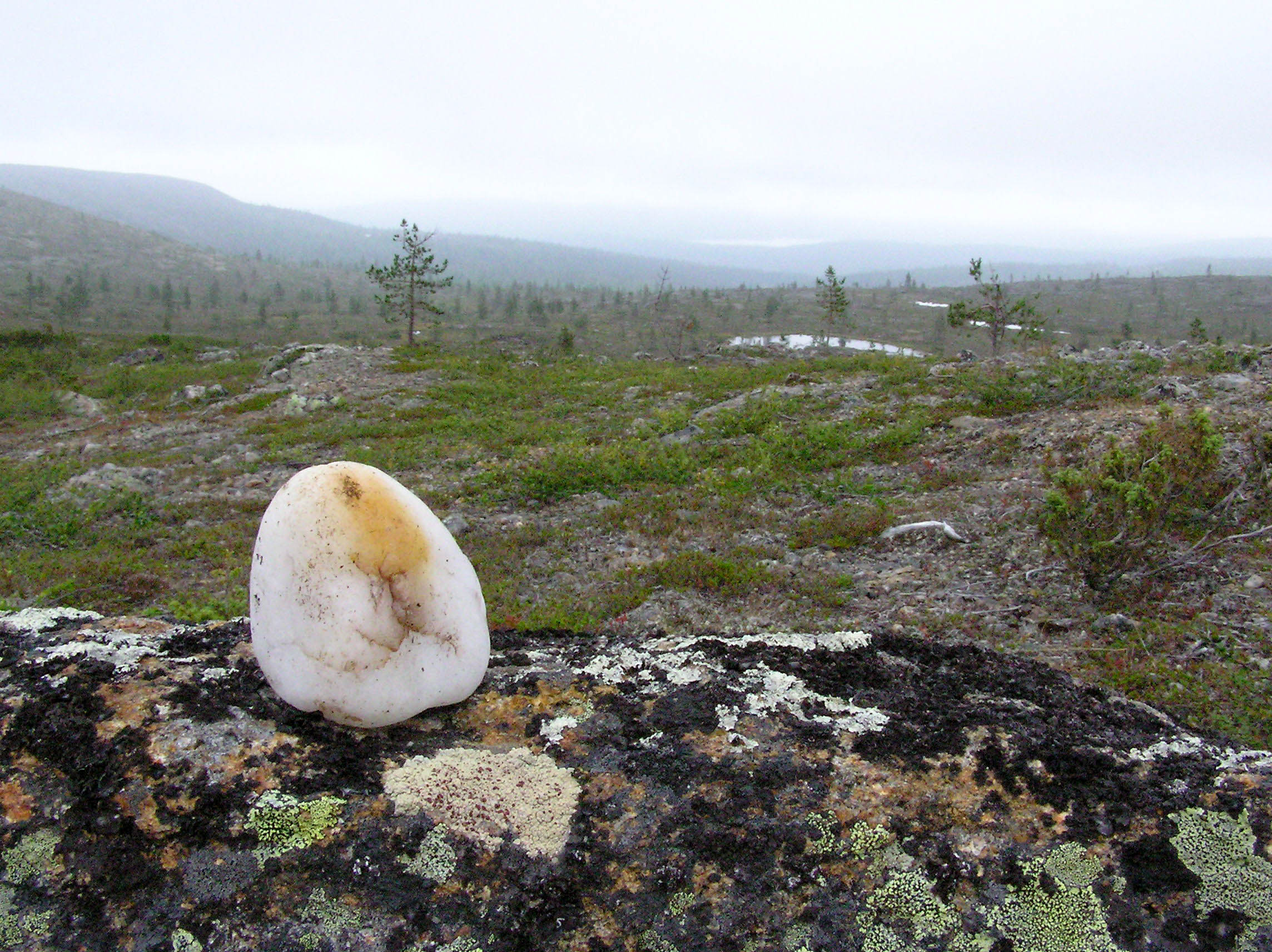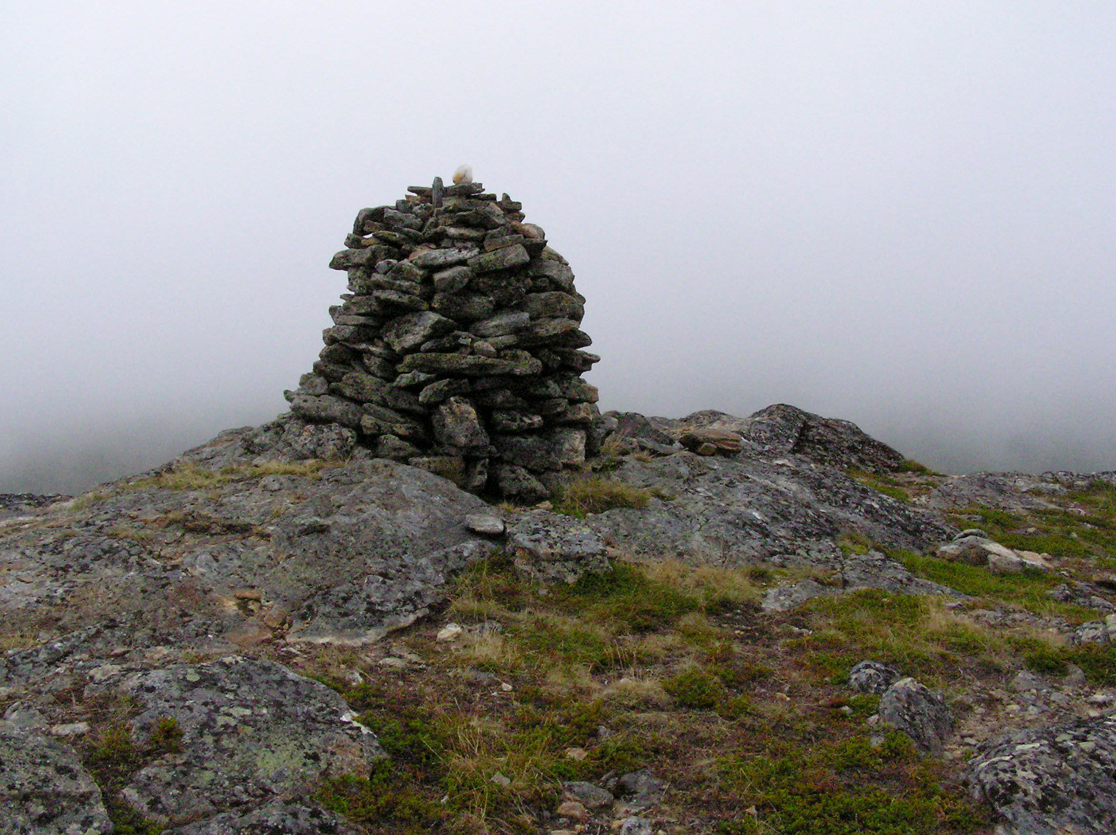 Aamu valkeni niin tuttuun tapaan sumuisena. Olimme kuitenkin illalla päättäneet käydä huiputtamassa Paskaluottumat. Siitä tulisi edestakaisin yli kymmenen kilometrin syrjähyppy, mutta suurin osa matkasta tehtäisiin ilman rinkkoja. Ylitimme Ahvenjärven ja Rautujärven välisen kannaksen ja jatkoimme pienen puron varteen, joka laskee kaakosta Pikku Ahvenjärveen. Laskimme rinkat pienelle aukiolle puron lähelle. Paikalta avautui näkymä pohjoisrinteellä olevaan rotkoon. Eiköhän sinä jo ollut riittävästi koordinaatteja rinkkojen löytymiseen. Lähdettiin kiipeämään, ensin kohti rotkoa ja sitten pitkin rotkon reunalla olevaa avokalliota. Alkujyrkän jälkeen avautui tulosuuntaan utuinen maisema yli Ahvenjärvien. Edessäpäin näkyi aika ajoin oletettu huippu, Korkianokka, joka välillä oli pilvien, välillä eturinteen takana. Edettiin sitä kohti niin, että kuljettiin koko ajan ylämäkeen. Kun yhytettiin lampi, jossa oli saari, tiedettiin, että ollaan aika lähellä. Ennen huippua osui vielä silmiimme valkoisena hohtava sileäksi hiotunut kvartsimöykky. Siinähän sopiva tuliainen. Kohta usvaverhon seassa häämöttikin huipun kivikasa, joka sai koristeekseen valkoisen hampaan. Paluumatkalla sumu hälveni sen verran, että Hammastunturin siluetti ilmestyi taivaanrantaan. Ennen laskeutumisen loppujyrkkää pysähdyimme vielä ihailemaan Kuppiskurun viheriötä. Rinkat löytyivät vaivatta. Sitten suorinta tietä Rautujärvelle ja rantajuntua pitkin järven pohjoispuolella sijaitsevalle kämpälle. Siisti kahden hengen kämppä ja pihalla iso nuotiopaikka penkkeineen. Kun ketään ei näkynyt asetuimme taloksi. Vaan illan suussa saapui paikalle kaksi riskin näköistä kaveria isot kantamukset selässään. Sanoivat aamulla jatkavansa Hammasjärven rantaan pystyttämään telttasaunaa. Tarjouduimme luovuttamaan kämpän viimeksi tulleille, niin kuin asiaan kuuluu, mutta he pystyttivät mieluummin teltan siihen lähistölle. Kämpän rannasta ei tullut rautua eikä ollut halua sen pidempään kalastusrupeamaan. Istuimme vähän aikaa tulilla ja sitten pehkuihin.