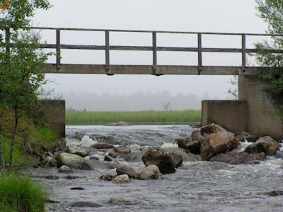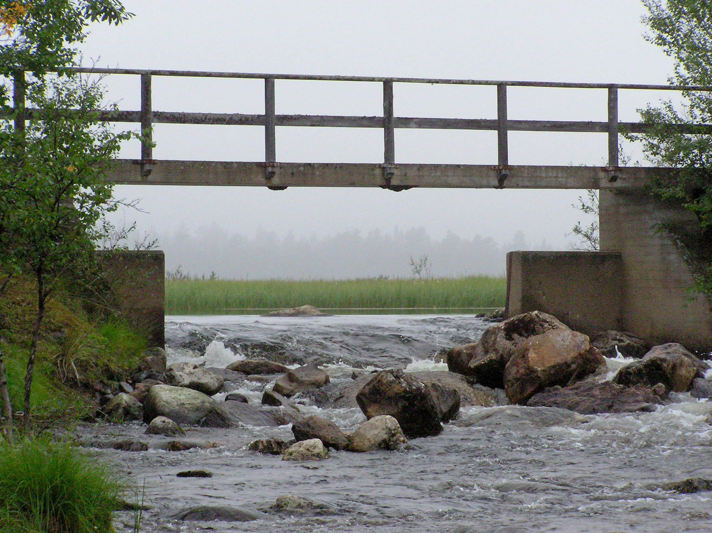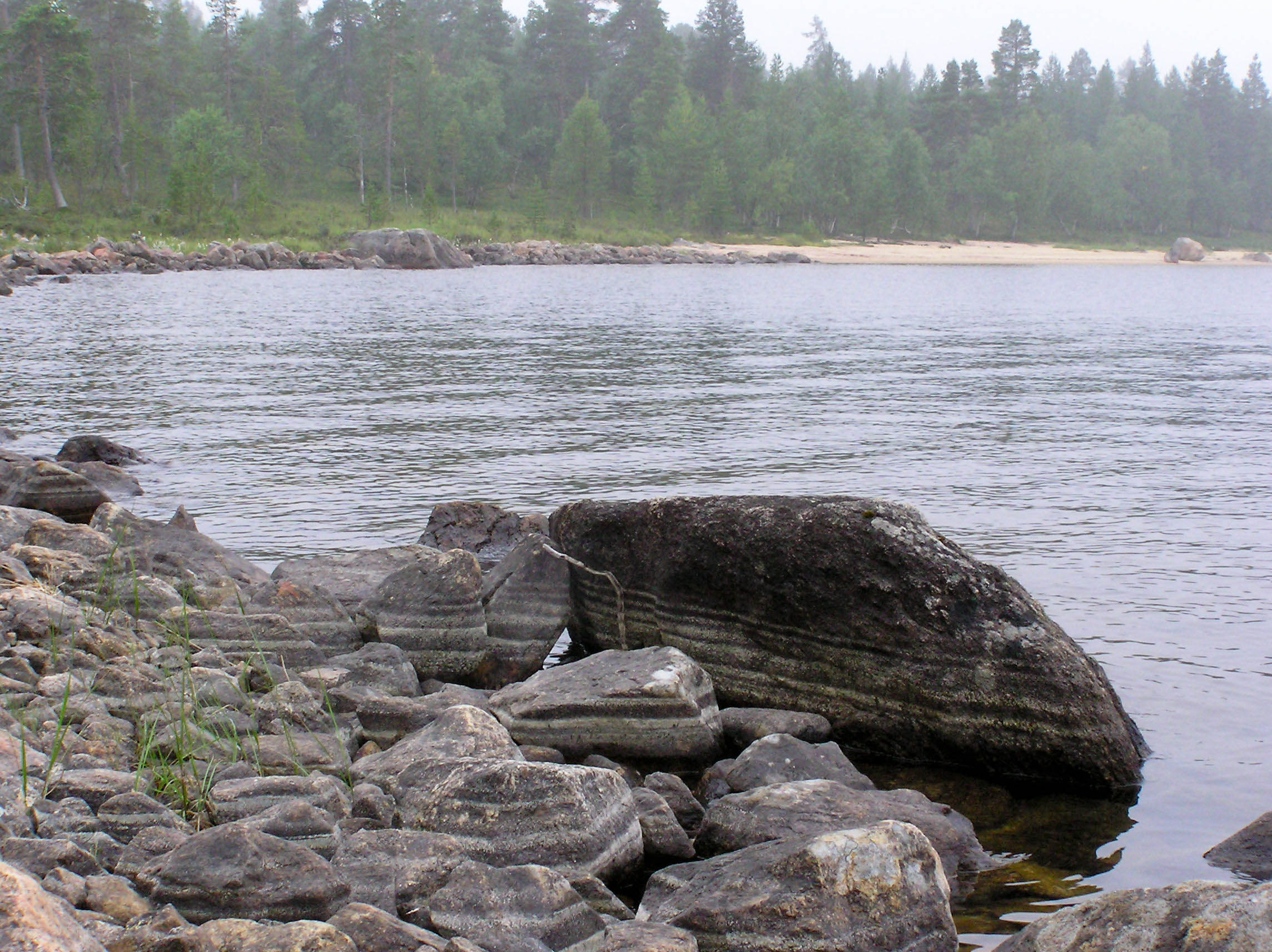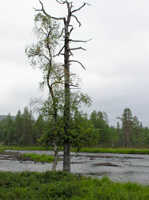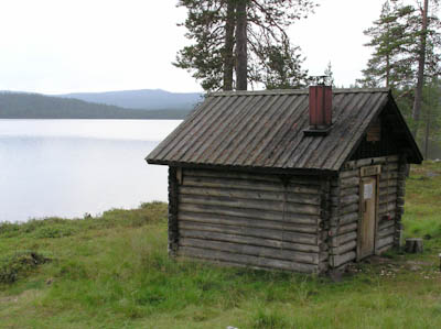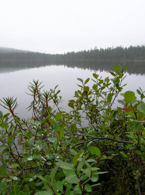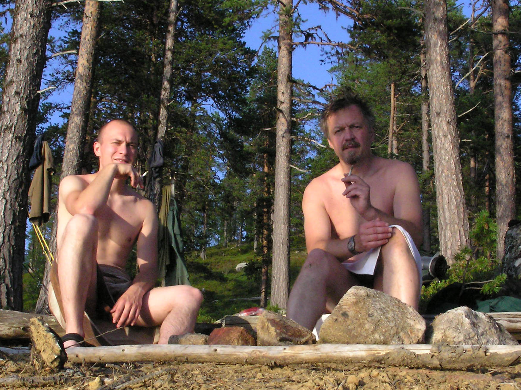 Aamu valkeni tuttuun tapaan sumuisena. Tervaspään huiputus peruttiin. Päätettiin painella Hammasjärvelle ja seurailla rantaviivaa etelään. Ei ainakaan eksyttäisi sumussa. Ranta osoittautuikin ovalliseksi kävelymaastoksi. Ei viitsitty "turhaan" pysähtyä nauttimaan mitään lounasta, vaikka raikasta vettä oli koko ajan tarjolla. Tavoitteena oli siirtyä Kirakkajoen eteläpuolelle ja sieltä sitten jossain vaiheessa Rautujärvelle. Joen ylitys vähän jännitti. Pitäisikö ylityspaikkaa etsiä pitkäänkin vai olisiko siellä sittenkin silta. Jonkinlainen ennakkotieto oli, että Kirakkajoen luusuassa on säännöstelypato, johon rantakiviä kiertävät renkaatkin viittasivat. Silta siellä oli, mutta säännöstelypatoa ei näkynyt. Sillan lähellä oli mökki samoin kuin aiemmin järven rannalla Viljaniemeä vastapäätä. Silta oli helpotus, mutta ei mitään hyvää etteikö jotain pahaakin. Alkoi nimittäin sadella. Kuljimme hetken sillan luota lähtevää polkua, mutta hylkäsimme sen, koska se mielestämme meni turhan korkealle Lusmamoroston rinteelle. Lähdimme polun sijaan seurailemaan Kirakkajokea sopivan välimatkan päästä. Se oli varmaan virhe, sillä melko pian sateen kastelema aluskasvillisuus kasteli kengät ihan totaalisesti. Muutaman kilometrin talssittuamme yhytimme polun, mutta jatkoimme edelleen omia polkujamme, koska olimme mielestämme löytäneet Ahvenjoelle paremman ylityspaikan kuin se, mihin polku johtaa. No, polku olisi mennyt poroaidan portille, mutta me jouduimme valitsemallamme tiellä ryömimään aidan ali kosteassa varvikossa. Ahvenjoenniemellä törmäsimme pariinkin lahonneeseen hirsirakennuksen raunioon. Heti Ahvenjärven rantaan päästyämme aloimme katsella sopivaa leiripaikkaa. Meille kelpaava paikka löytyi vasta runsaat pari kilometriä ennen Rautujärven tupaa. Se oli varmaan reissun raskain päivä, kun ei oltu maltettu edes syödä. Päivällinen nautittiin välimerelliseen tapaan vasta iltakymmeneltä. Siitä tuli ihan mukava ilta. Sadekin oli lakannut jossain vaiheessa ja kengät höyrysivät nuotion lämmössä. Sitten jo hymyilyttikin.