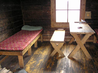 Saunan pystyttäjät olivat jo häipyneet maisemista, kun heräsimme hyvin nukutun yön jälkeen. Lähdimme pohjoiseen kohti Koijerijärveä. Jonkun matkaa kuljettuamme palasin vielä kämpälle ottamaan muutaman valokuvan, ettei muistoksi jäänyt pelkkiä muistikuvia. Kiersimme järven pohjoisrannalle, jossa oli kaistale mukavan näköistä kuivaa ja tasaista maastoa. Vaikka matkaa oli tehty vain neljä kilometriä, päätimme pystyttää leirin, niin ehtii kalastella vähän pidempään. Koijerjärvi antoi ahvenia ja taisi siinä joku haukikin näyttäytyä, mutta jalokalasta ei ollut tietoakaan. Teimme piston Kirakkajoelle. Koskesta nousi aika komea jänkäkoira, joka palasi jatkamaan tärkeää kannanhoidollista tehtäväänsä, estämään jalokalojen ylikansoitusta ja kääpiöitymistä. Taisi olla tehokas toimessaan, kun jalokalat loistivat poissaolollaan. Palasimme leiriin paistamaan tikkuahventa ja kuivattelemaan jalkineita. Ei ahvenessa mitään vikaa ole, mutta turha sitä on lähteä näin kaukaa hakemaan.