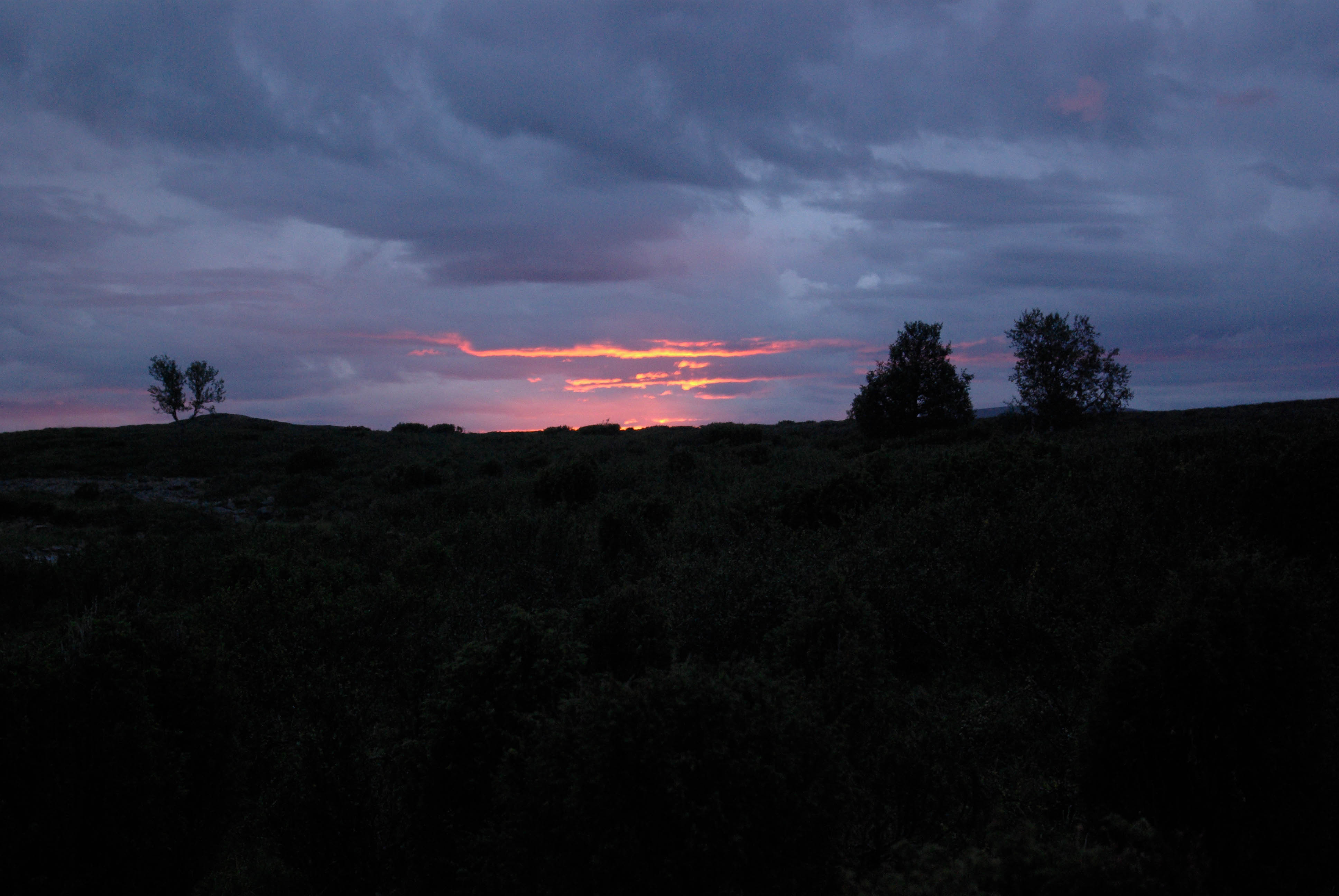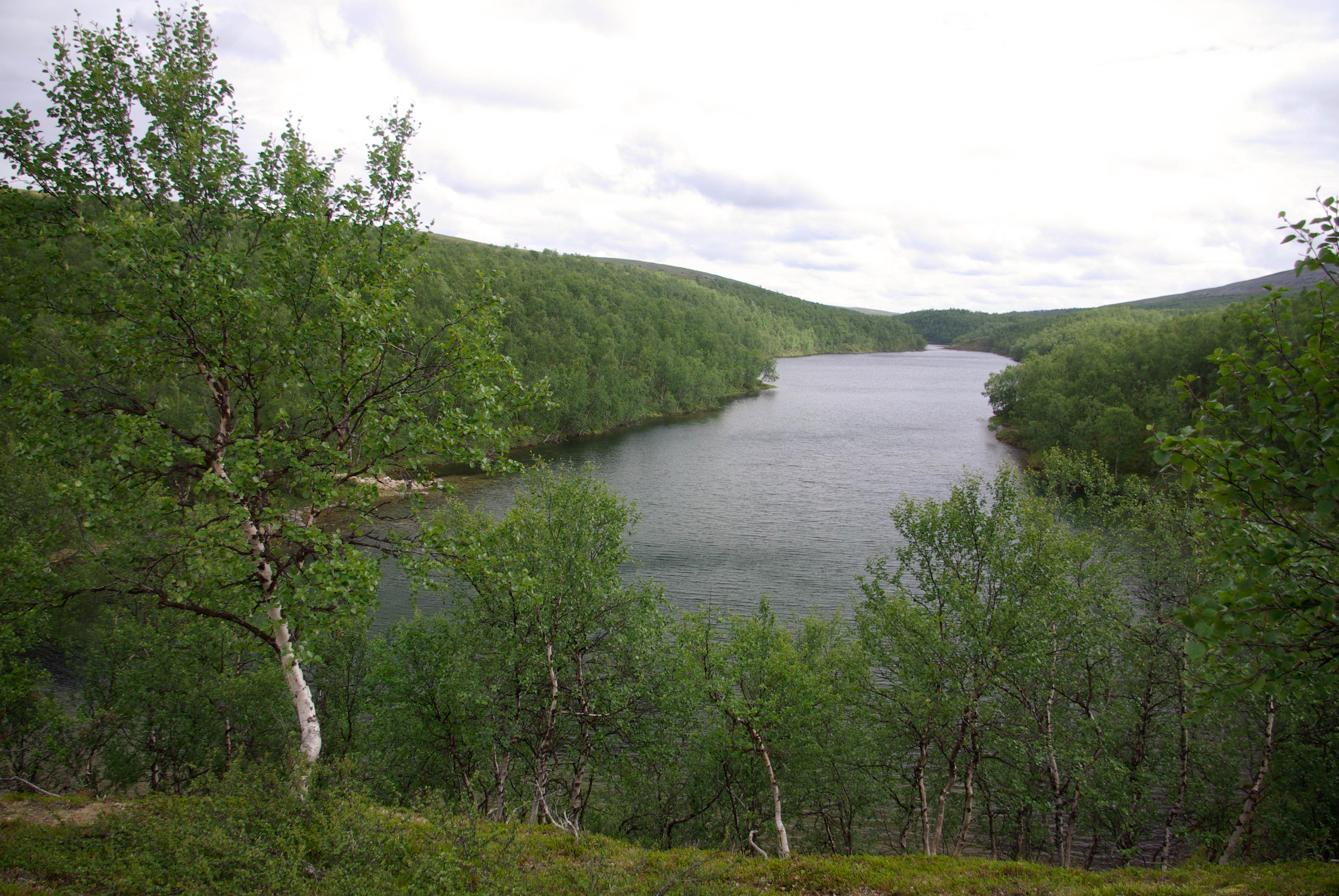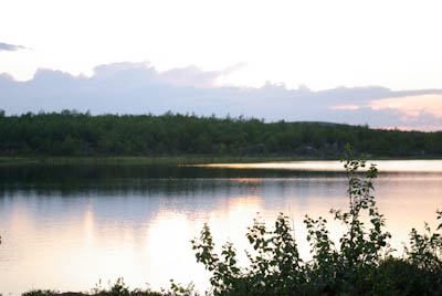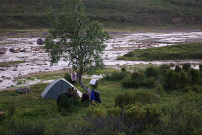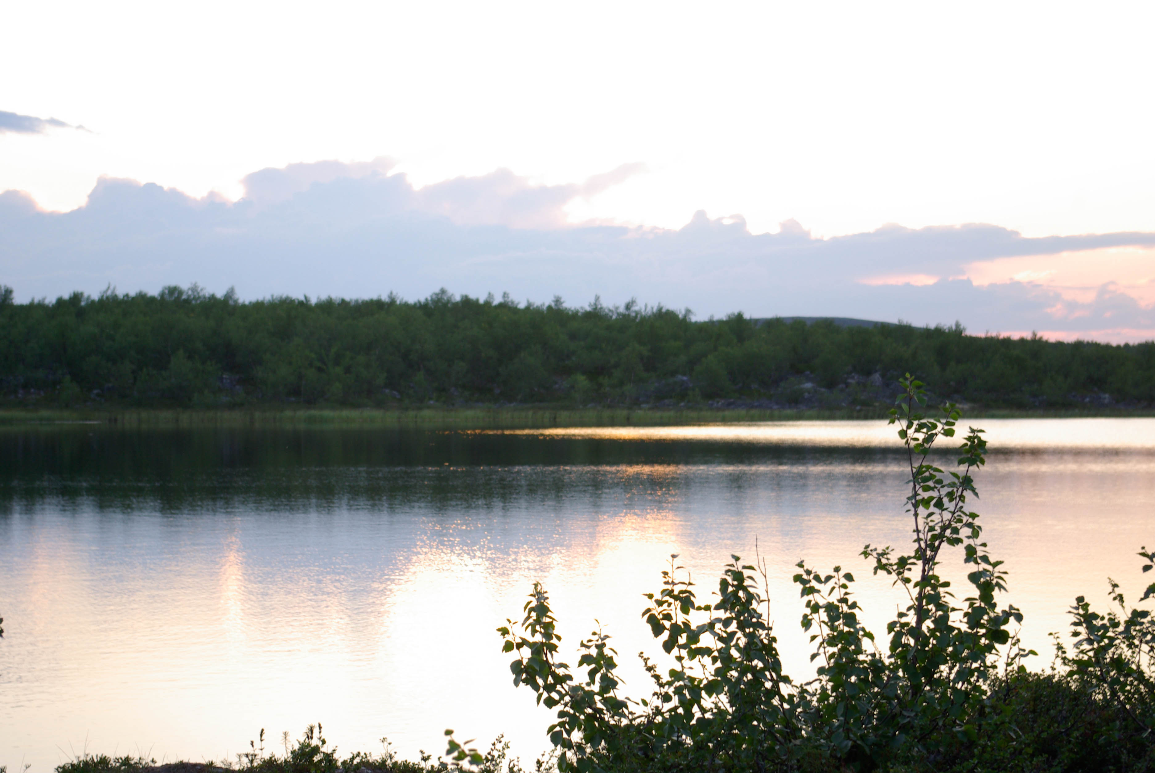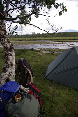 Päätimme pitää luppopäivän, käveltäisiin vain Goahppelasjärvelle. Suuntasimme järven pohjoispäässä olevalle kammille, joka ei sittenkään houkutellut jäämään yöksi. Järven pohjoispäässä olevalla saarekkeella oli teltta, joten suuntasimme kilometrin verran pohjoisempana olevalle pikkujärvelle. Järvi oli kirkasvetinen ja syvä ja rajoittui lännessä hiekkaiseen harjanteeseen, joka oli alueelle epätyypillisesti hyvää telttailumaastoa. Tämän olivat paikallisetkin huomanneet, ja perustaneet harjanteelle jonkinlaisen kiinteän leiripaikan. Siellä oli teltan pohjalavoja, polttopuita ja jopa huussi kenollaan (ei käyttökunnossa), kaikki vähän sikin sokin. Löysimme kuitenkin paikan johon sivistyksen merkit eivät näkyneet. Järvestä nousi yksi pienhkö ja yksi vähän komiampi rautu. Illasta näytti tulevan sateinen, joten säästimme kalat aamuksi ja painuimme pehkuihin. Sain kalat perattua ja pääsin telttaan juuri ennen ukkoskuuroa. Vartin verran satoi kaatamalla ja salamat leiskuivat. Onneksi ukkonen ei taaskaan osunut ihan kohdalle, vaan pysytteli jossain Loktajavren tienoilla.