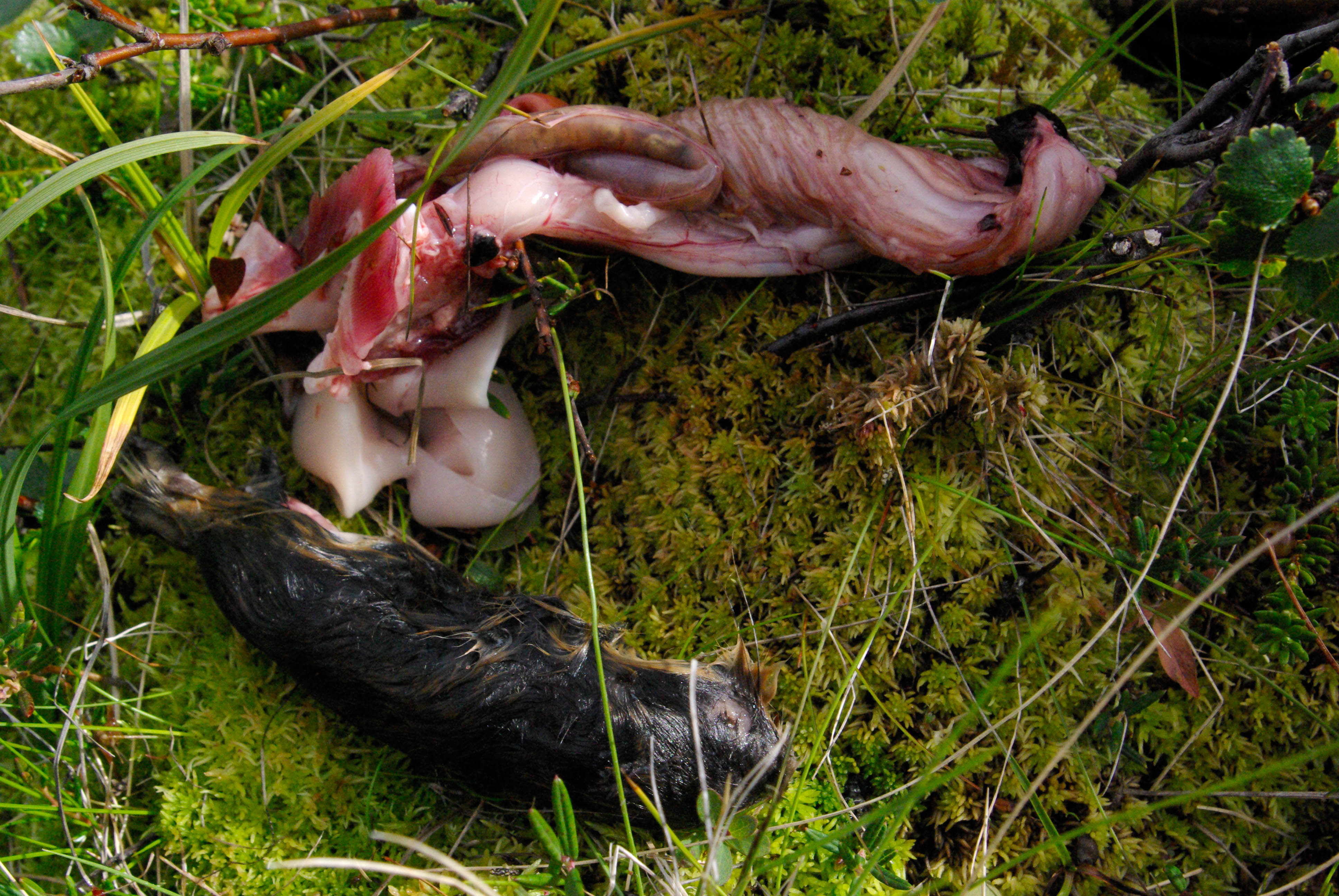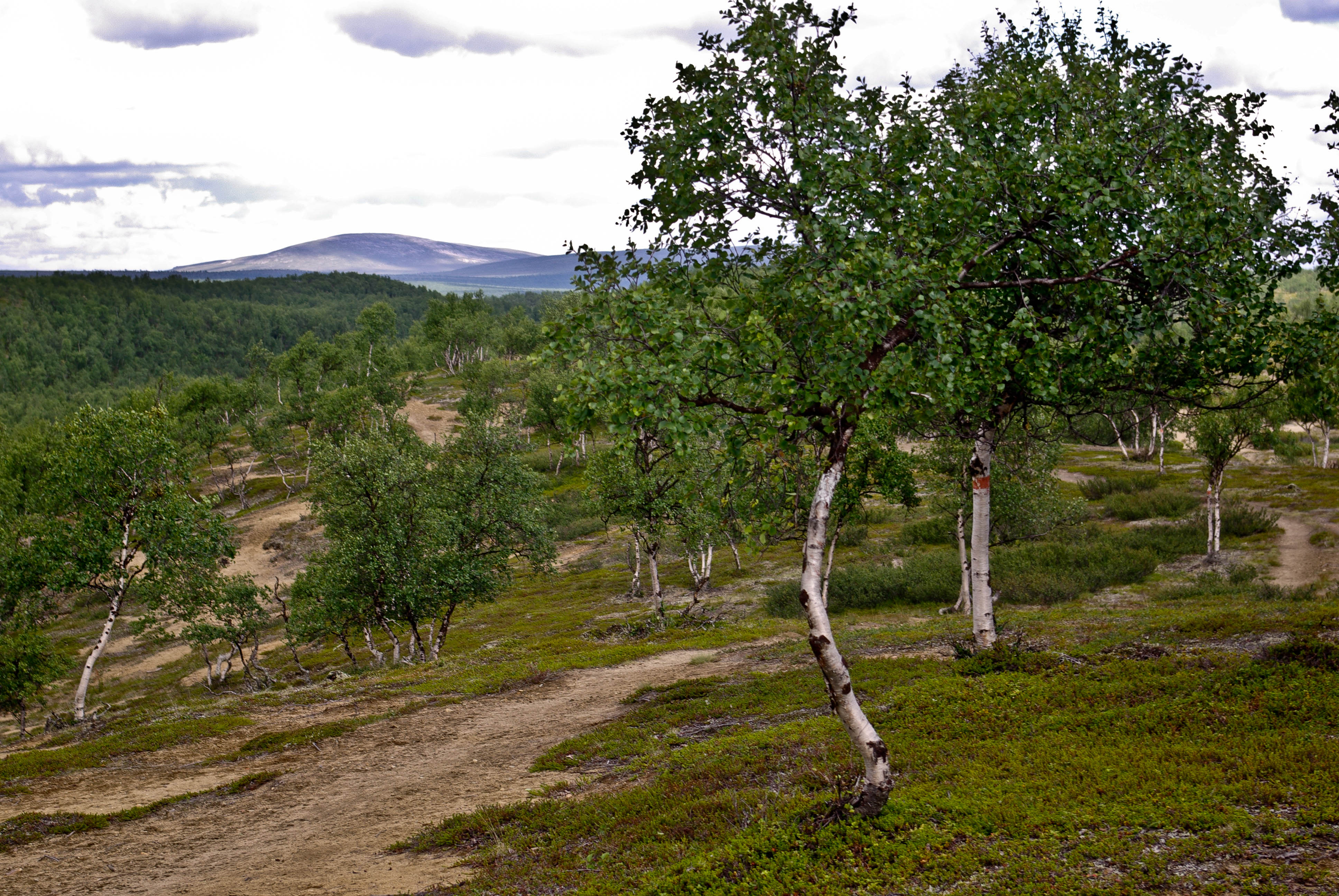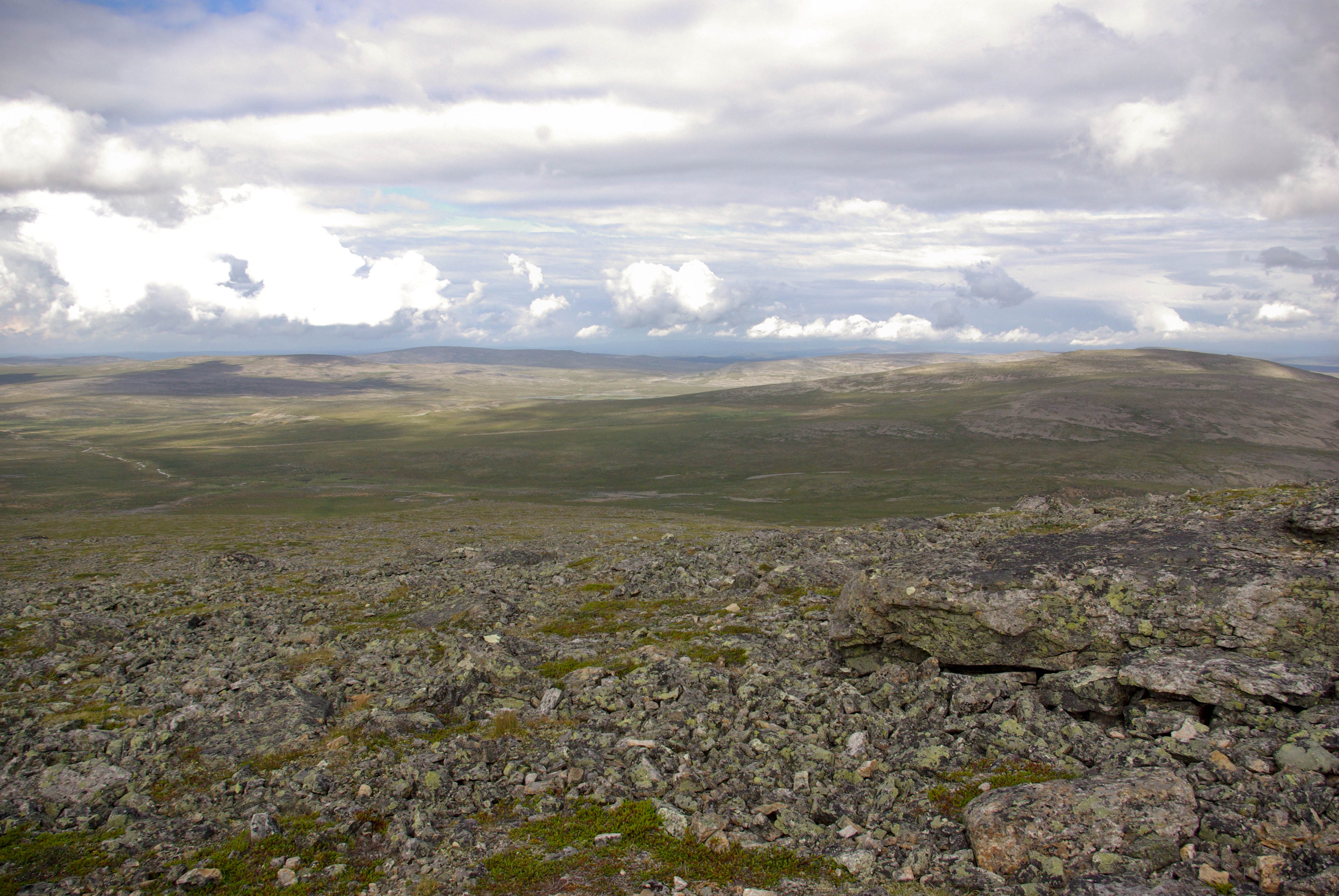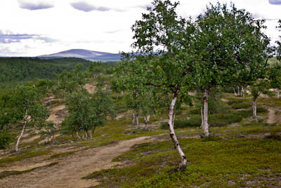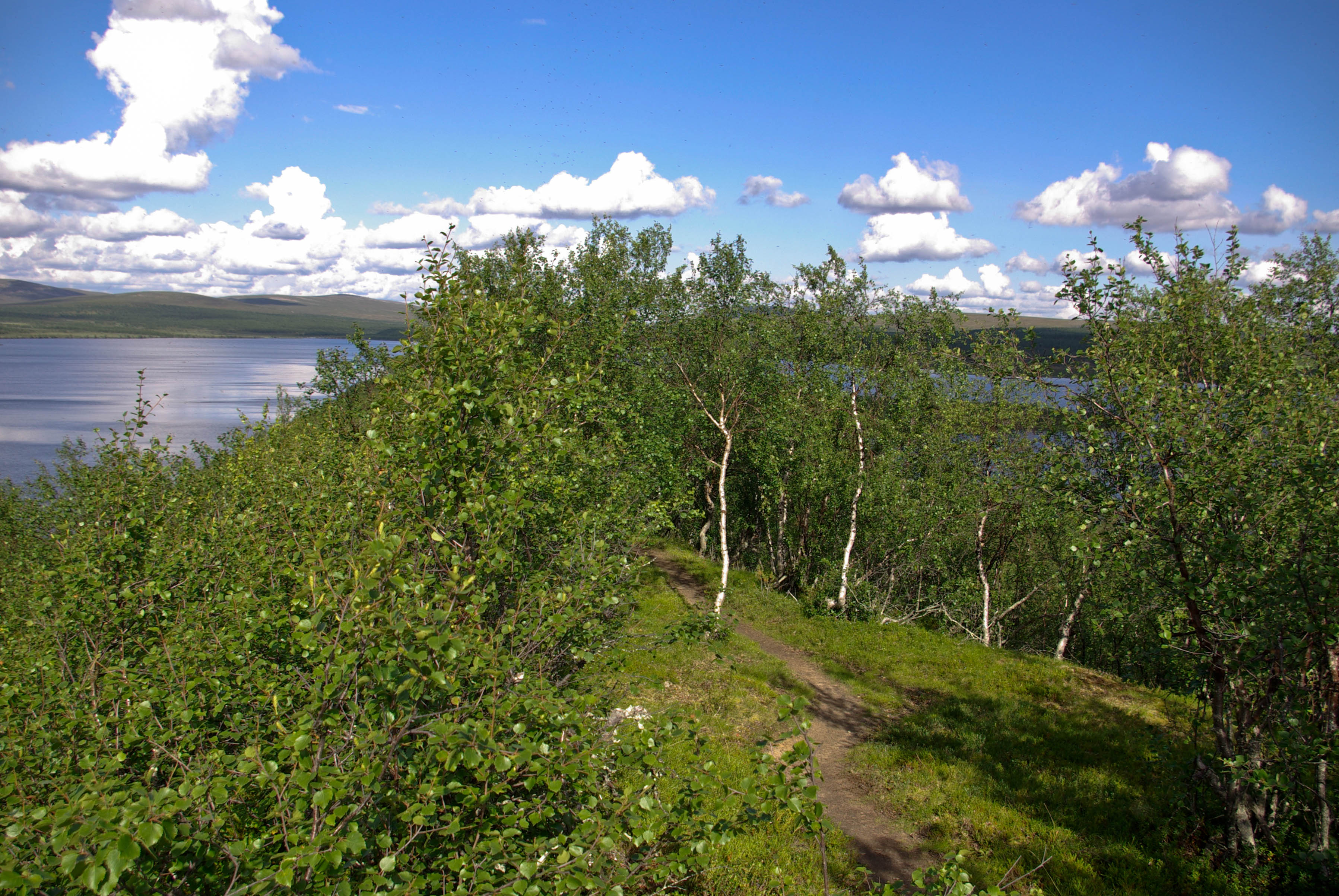 Päätimme pitää luppopäivän, käveltäisiin vain Goahppelasjärvelle. Suuntasimme järven pohjoispäässä olevalle kammille, joka ei sittenkään houkutellut jäämään yöksi. Järven pohjoispäässä olevalla saarekkeella oli teltta, joten suuntasimme kilometrin verran pohjoisempana olevalle pikkujärvelle. Järvi oli kirkasvetinen ja syvä ja rajoittui lännessä hiekkaiseen harjanteeseen, joka oli alueelle epätyypillisesti hyvää telttailumaastoa. Tämän olivat paikallisetkin huomanneet, ja perustaneet harjanteelle jonkinlaisen kiinteän leiripaikan. Siellä oli teltan pohjalavoja, polttopuita ja jopa huussi kenollaan (ei käyttökunnossa), kaikki vähän sikin sokin. Löysimme kuitenkin paikan johon sivistyksen merkit eivät näkyneet. Järvestä nousi yksi pienhkö ja yksi vähän komiampi rautu. Illasta näytti tulevan sateinen, joten säästimme kalat aamuksi ja painuimme pehkuihin. Sain kalat perattua ja pääsin telttaan juuri ennen ukkoskuuroa. Vartin verran satoi kaatamalla ja salamat leiskuivat. Onneksi ukkonen ei taaskaan osunut ihan kohdalle, vaan pysytteli jossain Loktajavren tienoilla.