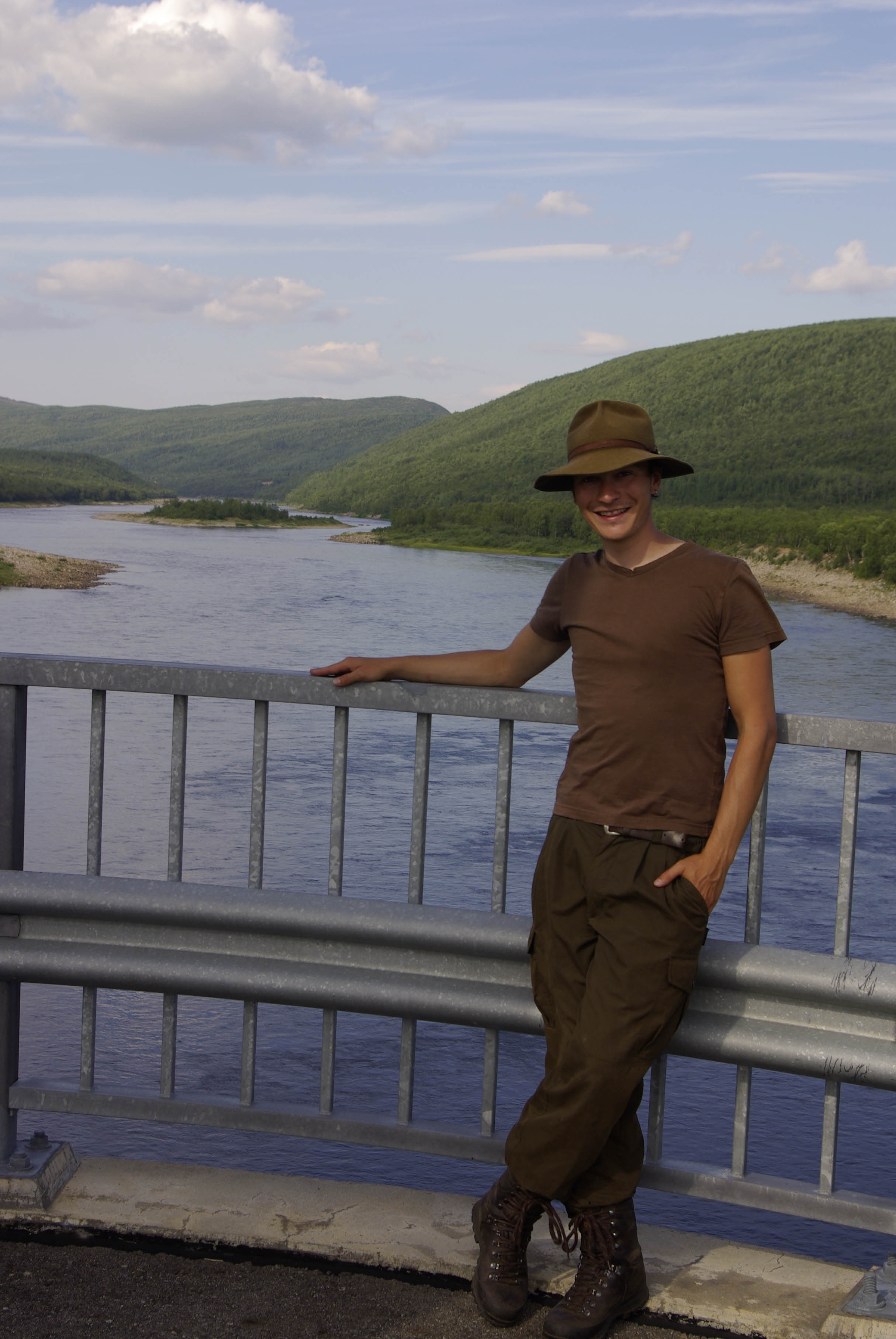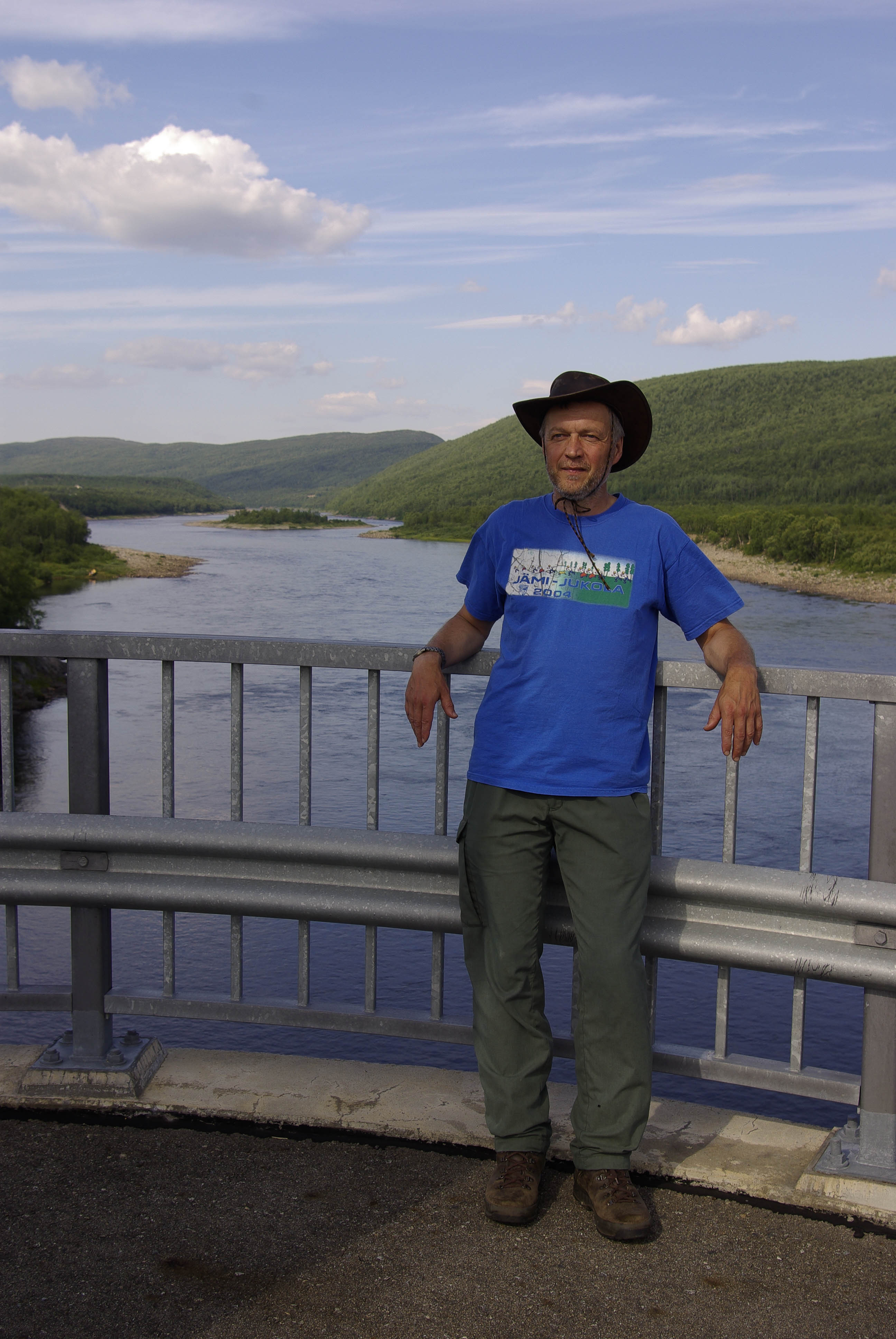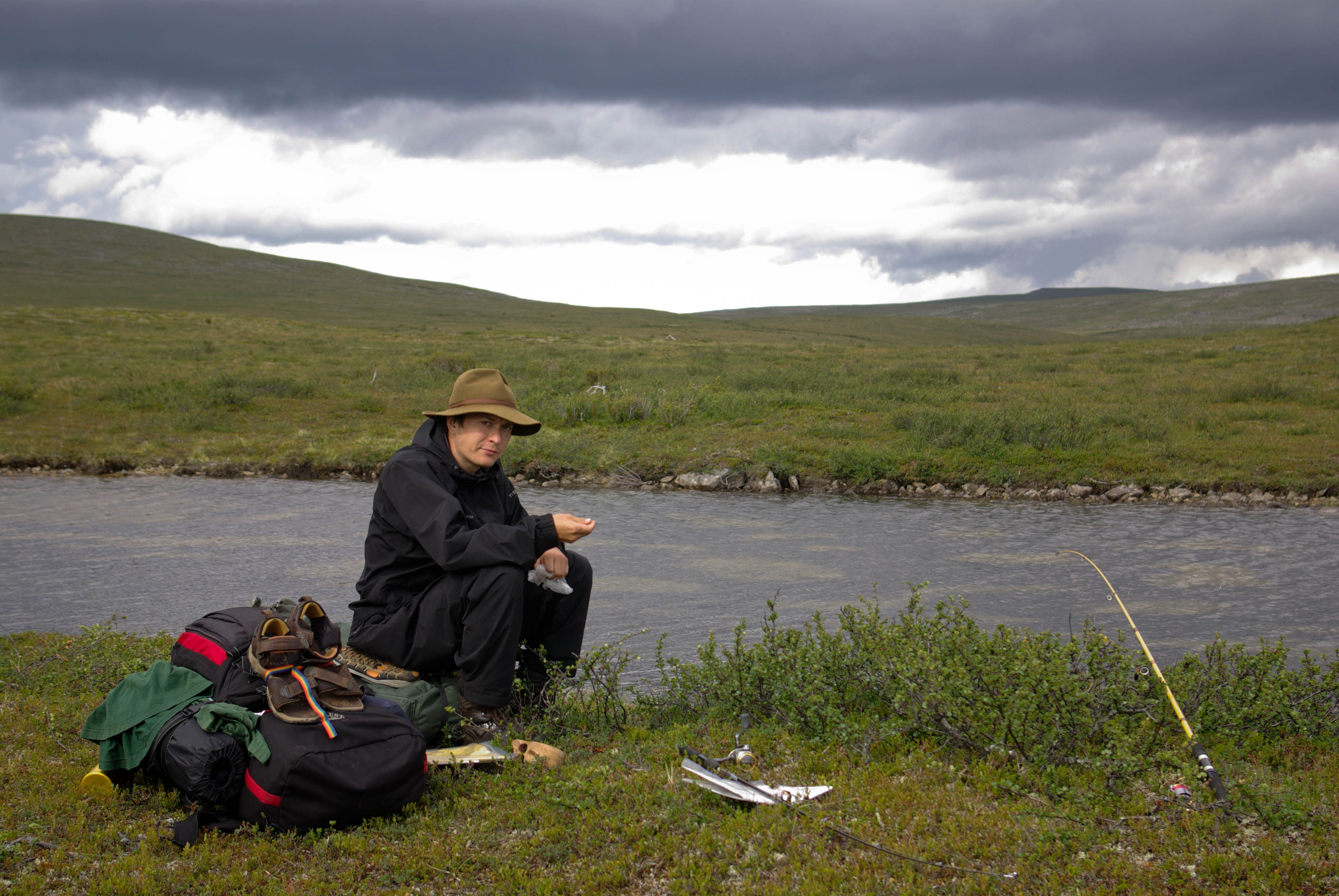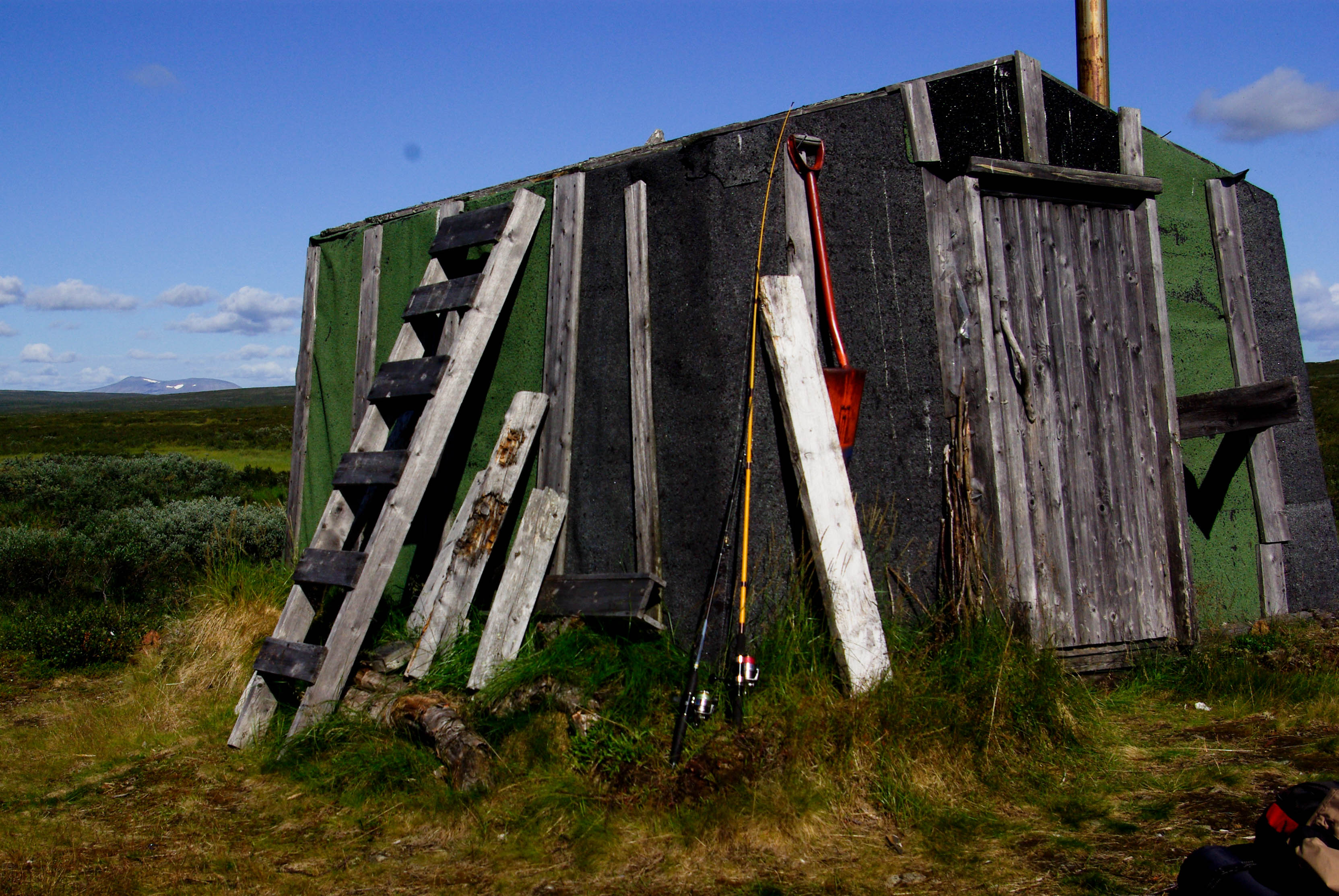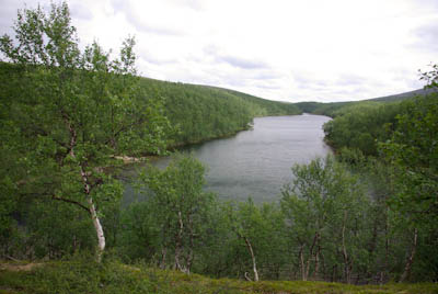 Aamupalaksi paistettiin pari rautua. Kyllä oli hyvää. Sen huomasi heti aamulla, että oli tulossa melko lämmin päivä. Taivallus alkaisi aikamoisella kiipeämisellä. Päätettiin uittaa T-paidat ja hatut järven raikkaassa vedessä ennen matkaan lähtöä. Olo parani välittömästi. Märistä paidoista huolimatta hikeä pukkasi kiipeämisen aikana. Ylös päästyämme suuntasimme kohti merkittyä reittiä, joka johti Utsjoelle. Emme kuitenkaan kävelleet illansuussa suin päin sivistyksen keskelle, vaan jäimme yöksi vajaan kilometrin päähän Koululammen kodalle. Peseydyimme lammessa ja kävimme nukkumaan pitsasta ja keskioluesta haaveillen, kuunnellen tieltä kantautuvaa liikenteen huminaa.