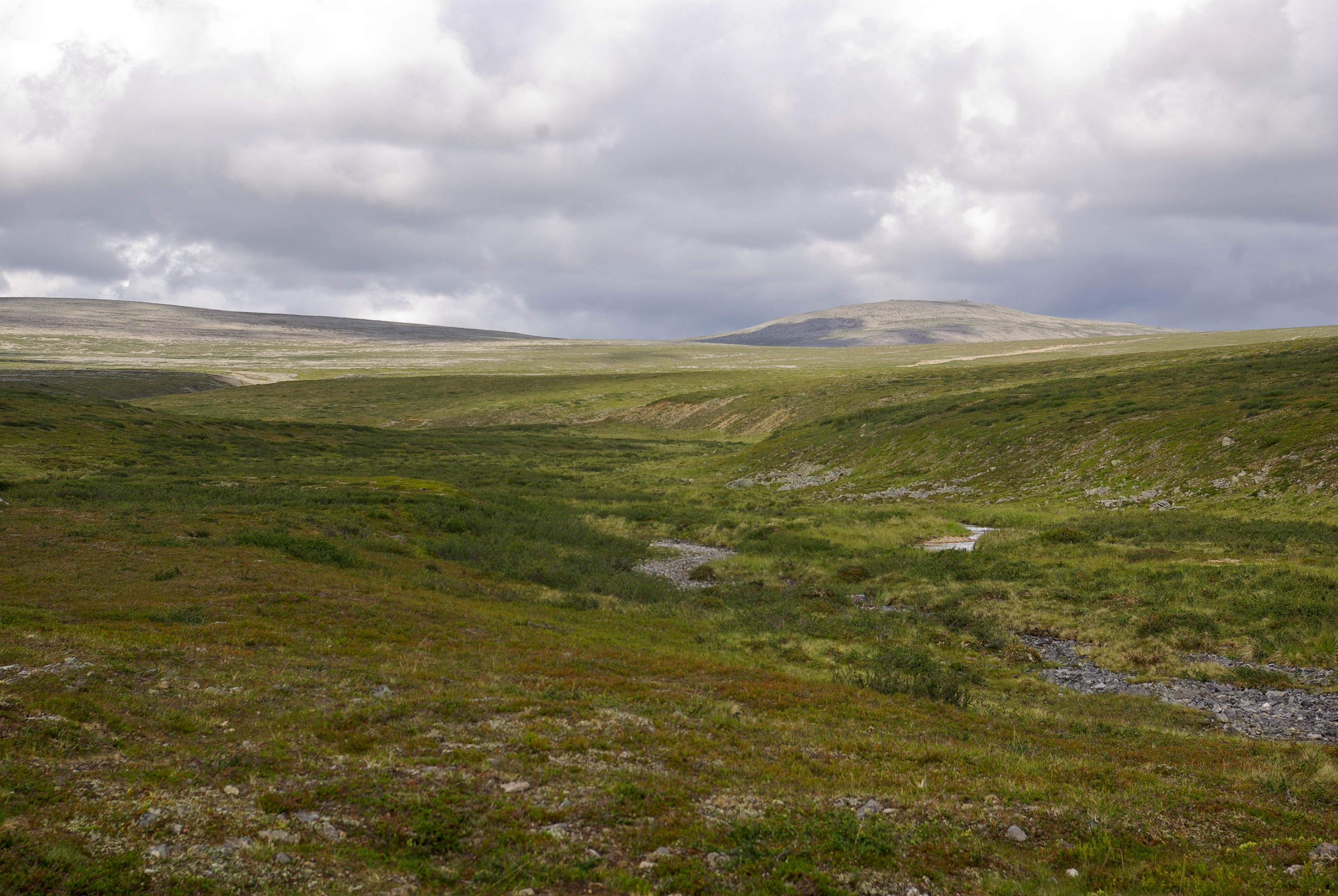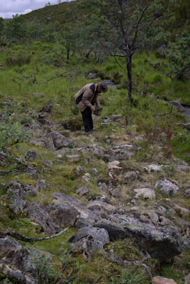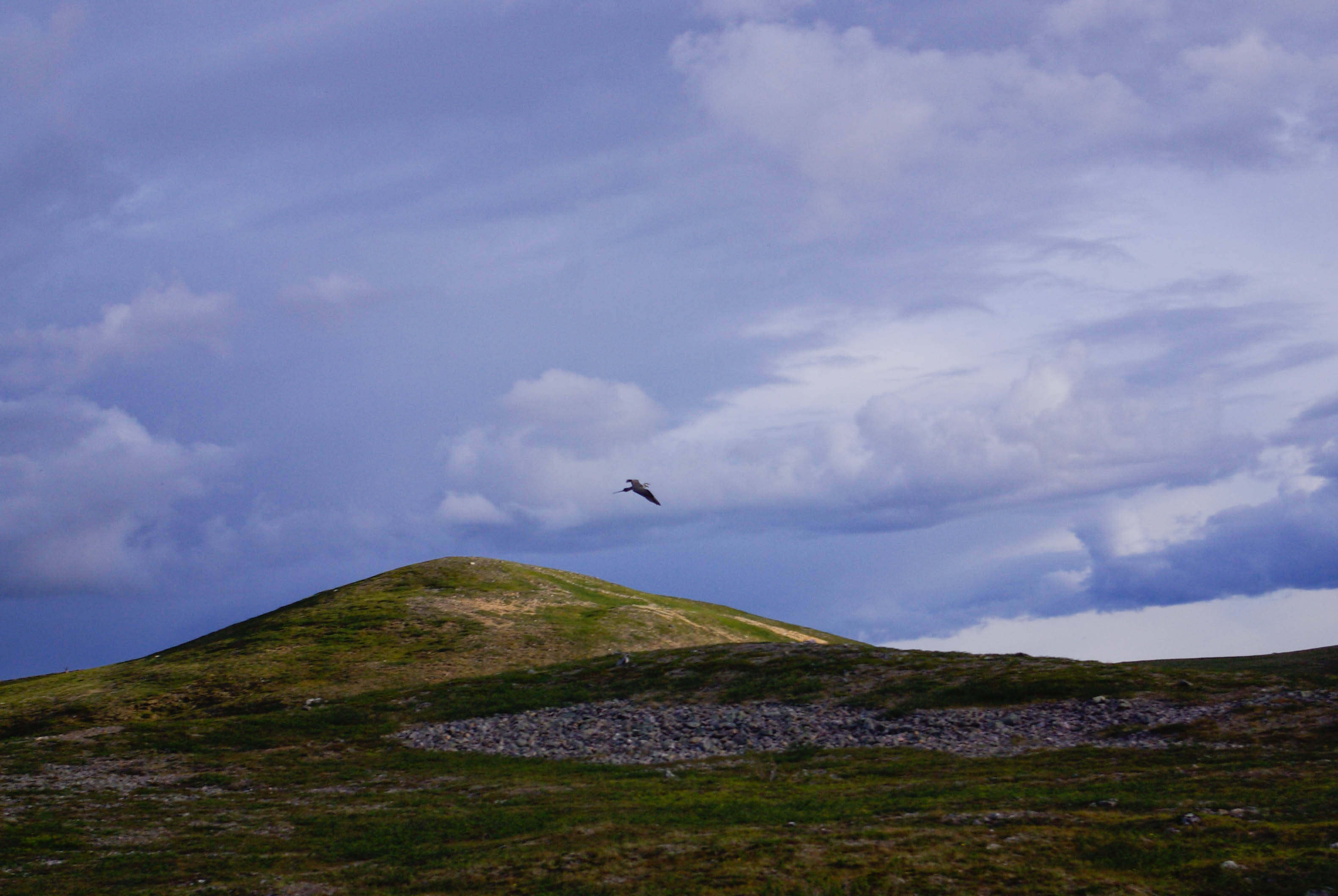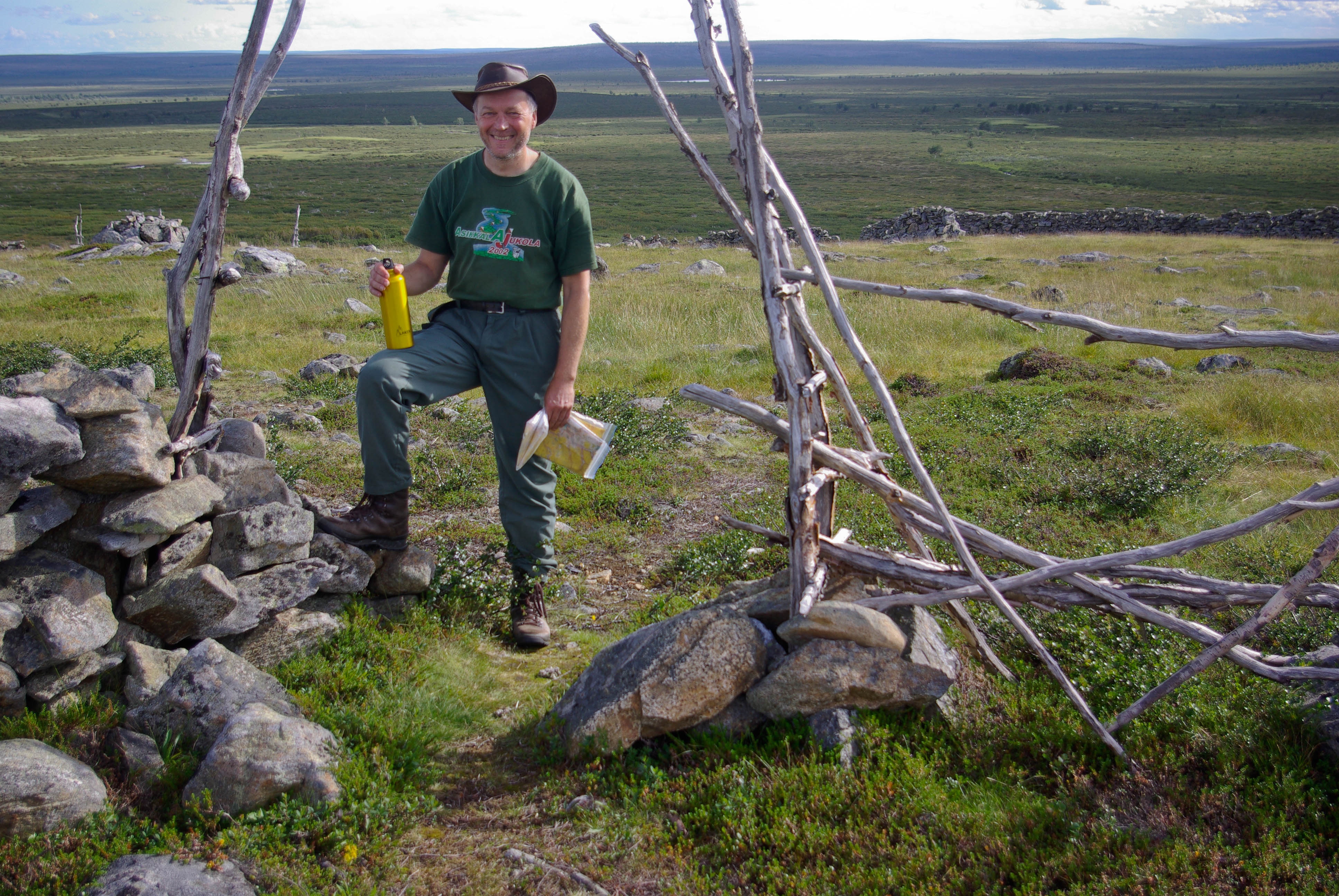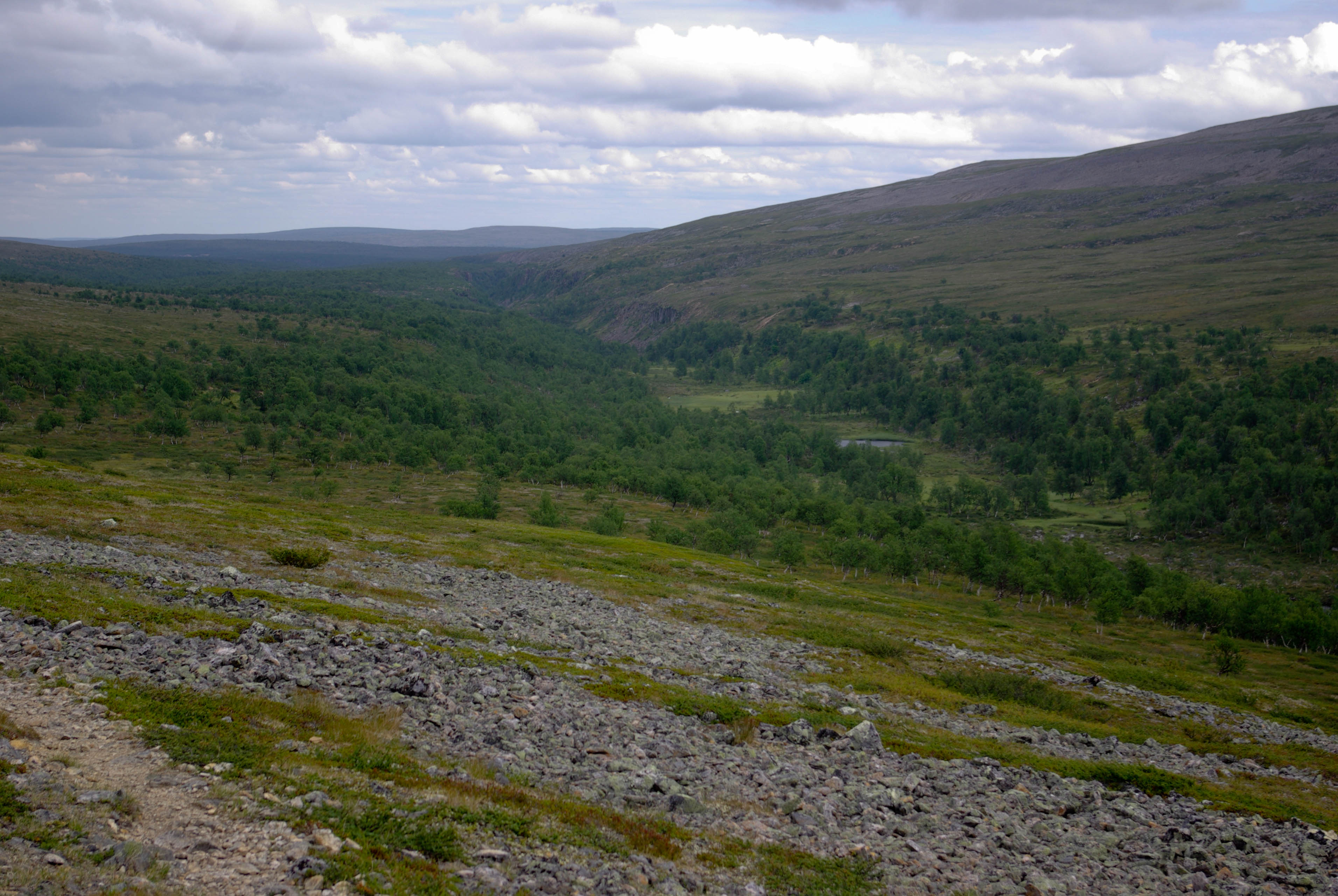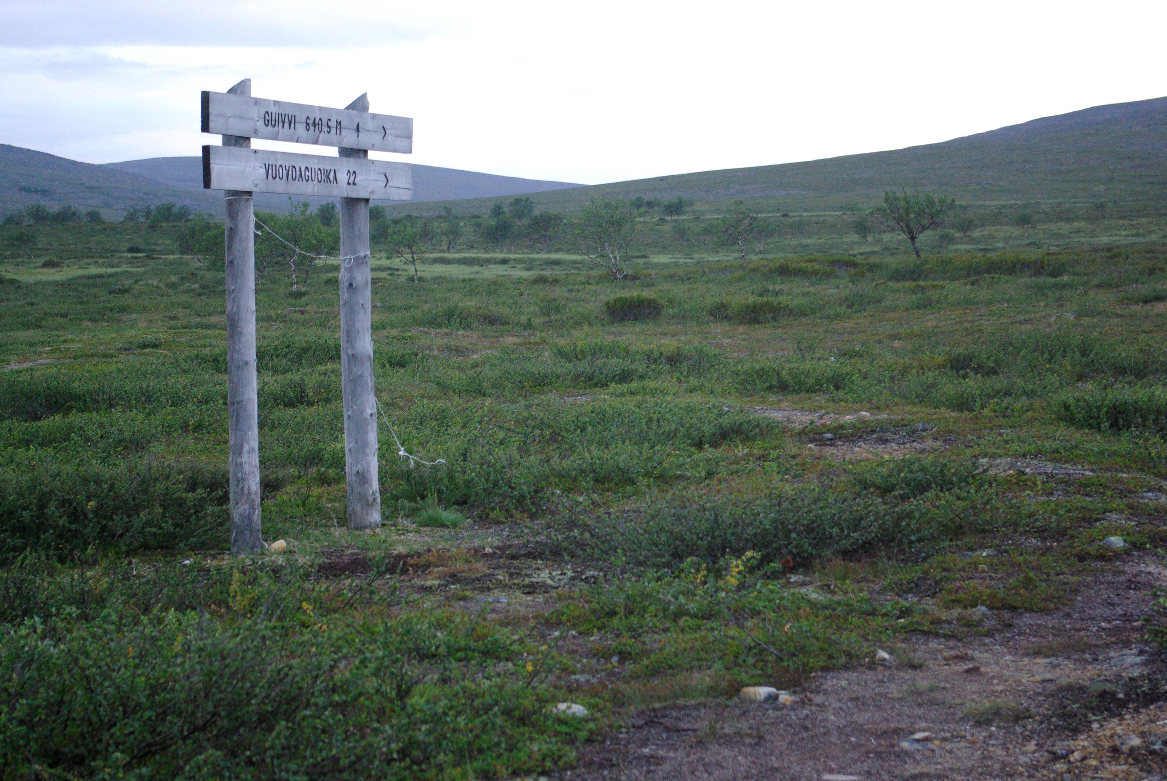 Matka alkoi jyrkällä nousulla portaita pitkin. Yhtä soittoa jatkettiin risteykseen, jossa Kuivin reitti erkanee Kevon reitistä. Maisema oli taas paljakkaa. Kapustarinta hätyytteli turvaan poikasiaan, jotka jostain syystä kaiken sen autiuden keskellä vilistivät pitki ihmisen tallaamaa polkua. Myös riekkoparvi osui tiellemme. Pidimme lounastauon nimettömän puron rannassa. Seuraava etappi oli Buordnajeaggin leiri/nuotiopaikka. Itikkaa oli ylhäälläkin aika runsaasti eikä edessä oleva suo houkutellut lainkaan. Suon ylitys sujui kuitenkin vauhdikkaasti pitkin ihmisen rakentamaa lautatietä. Olisivat siinä vähän vaatimattomammat pitkospuutkin riittäneet. Nuotiopaikalla nähtiin tuttu porukka keiteltiin kahvit valmiiksi sytytetyillä tulilla. Matkalla taukopaikalta tuvalle itikat hyökkäsivät kimppuumme sankkoina laumoina. Yritimme päästä niistä eroon pitämällä vauhtia. Ei auttanut. Joka askeleella nousi esiin uusia verenimijöitä. Lopulta Kuivin tuvan jo häämöttäessä oli pakko turvautua ohviin. Siinä oli tultu melkein 4 km kolmessa vartissa. Tuvassa olisi ollut tilaa vielä kahdelle. Pystytimme kuitenkin teltan, koska ympärillä oli paljon hyviä teltanpaikkoja. Istuimme iltaa nuotiolla, vaikka taivaalta välillä tihutteli vähän vettä.