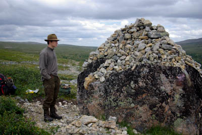 Aurinko oli jo korkealla, kun heräiltiin. Hiekkaranta näytti autiolta ja houkutteli uimaan. Noudatettiin hyväksi havaittua sääntöä: peseydy aina kun voit. Vesi oli sen verran raikasta, että uimisesta ei voinut puhua. Läträyksen jälkeen oli kuitenkin mukava vaihtaa puhdasta vaatetta päälle. Aamutoimet sattuivat hyvään aikaan, sillä kohta paikalle tulvi väkeä sankoin joukoin. Kaikki olivat matkalla Fiellun putoukselle, joten erämaan rauha antoi odottaa itseään. Söimme aamupalan ja lähdimme muiden perään. Polun varrella oli iso kivi, jonka koristeluun on osallistunut joku muukin kuin jääkausi. Oltiin ihan Kevojoen latvoilla. Pysähdyimme tekemään välipalaa Suohppasojan nuotio/leiripaikalle 6,5 km ennen putouksia. Siellä kaikki muutkin olivat. Erään porukan retkioppaana ollut savolaismies kertoi saaneensa Akujoesta komeita tammukoita. Päätöksemme olla kiipeämättä Kuivin yli rinkkojen kanssa sai lopullisen sinetin. Sen sijaan suuntaisimme Kuivin tuvalta lounaaseen Akujoen varteen.