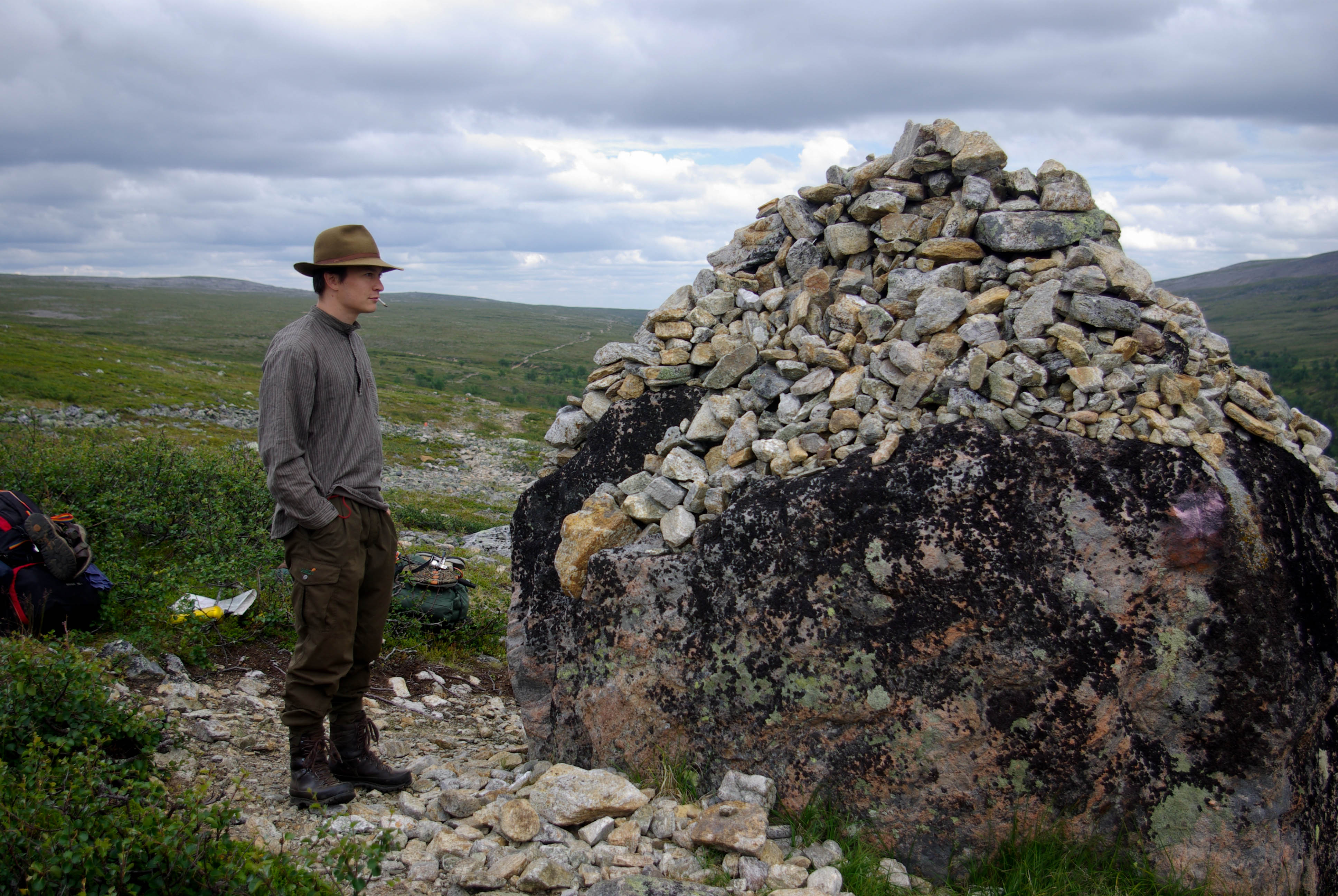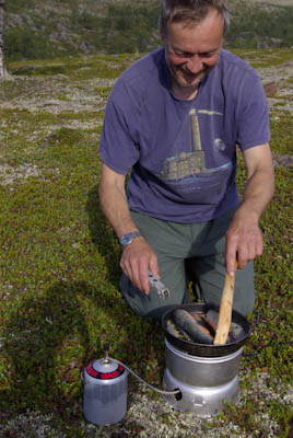 Vaelluksen idea oli nautiskella leirissä ja mahdollisesti kärsiä matkalla. No, älkää nyt käsittäkö väärin, mistään krapulassa vaeltamisesta ei ole kysymys, vaan siitä että ruokaa, vaatteita ja muita tarvikkeita otetaan niin paljon, että mitään ei tarvitse pihistellä. Tällöin käy helposti niin kuin Tapsa Rautavaaralle, että repun painoon lisäystä tulee toinen puoli. Molempien rinkat painoivatkin lähtiessä n. 23 kg.