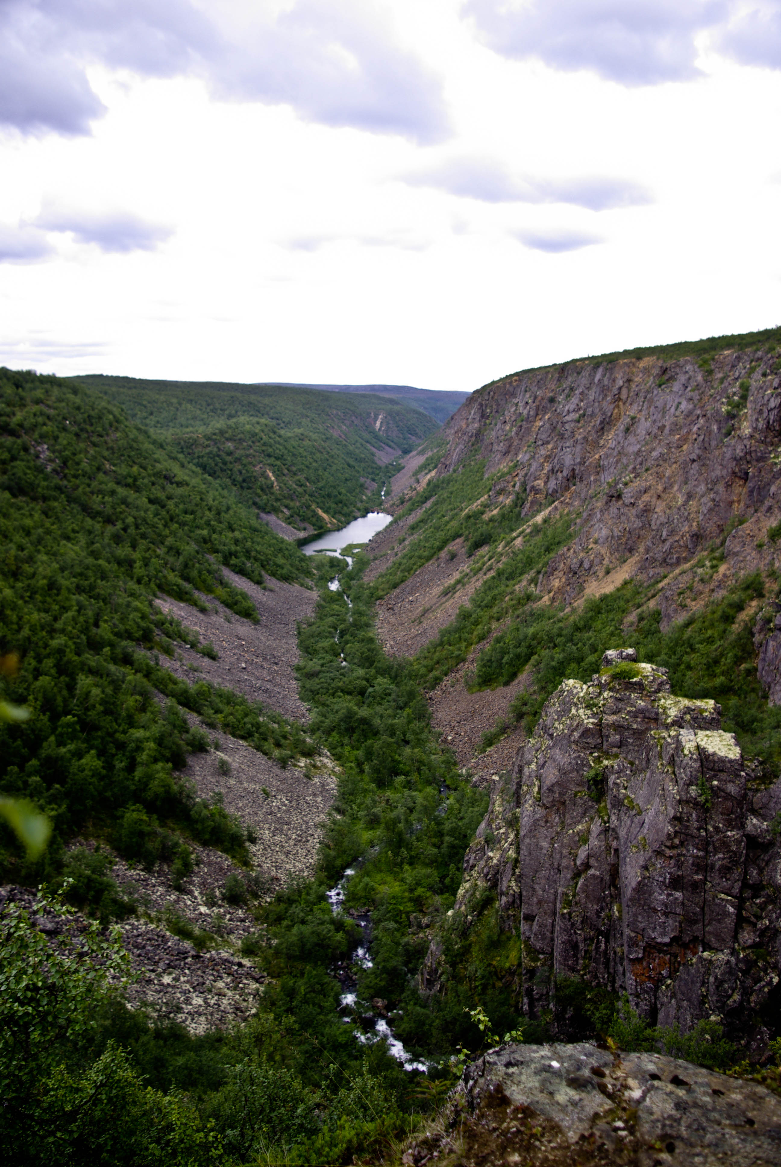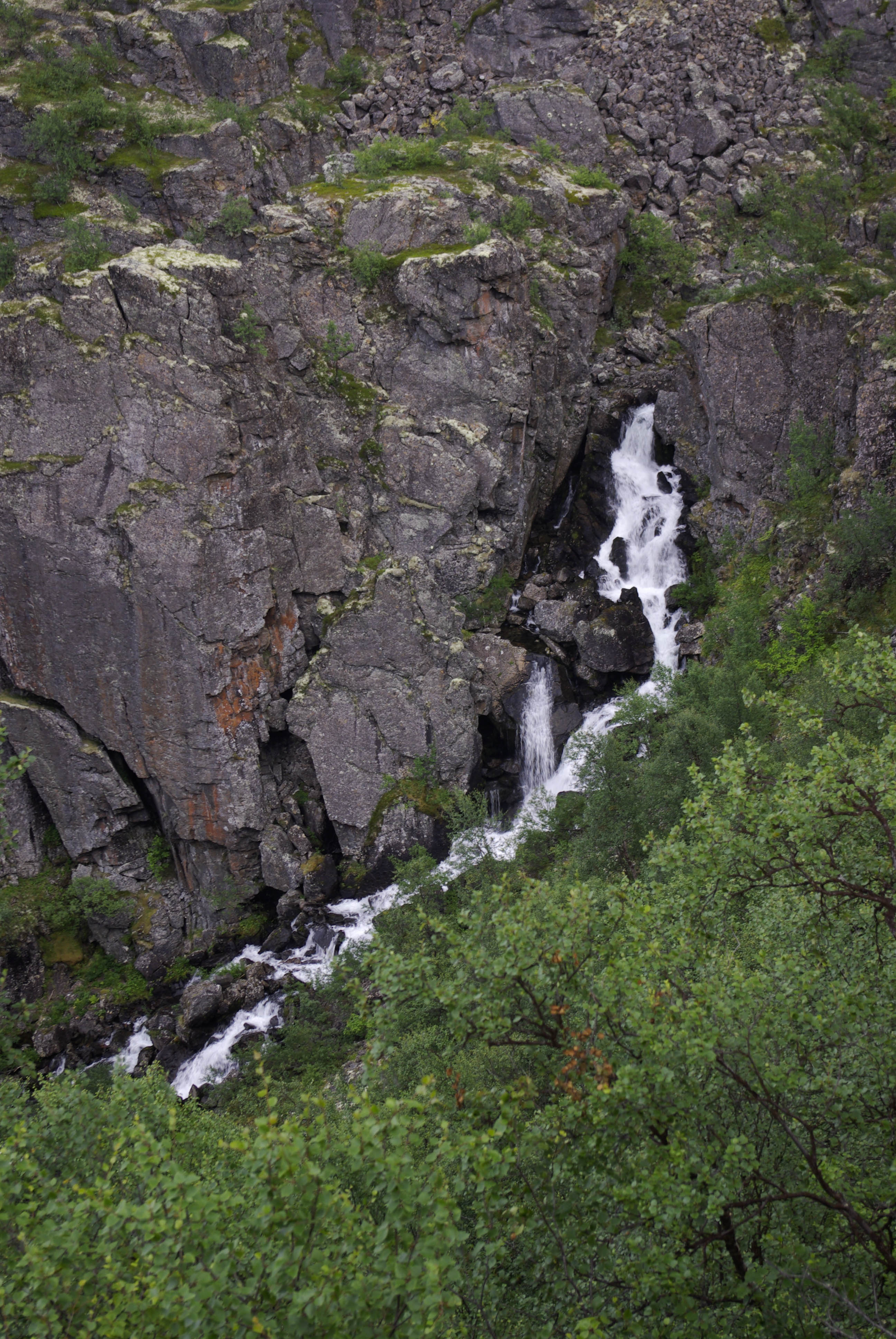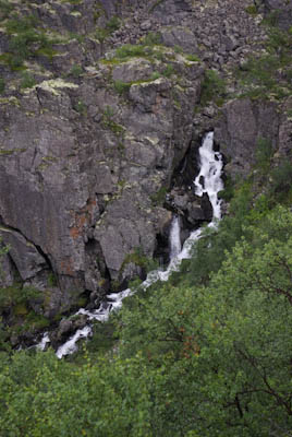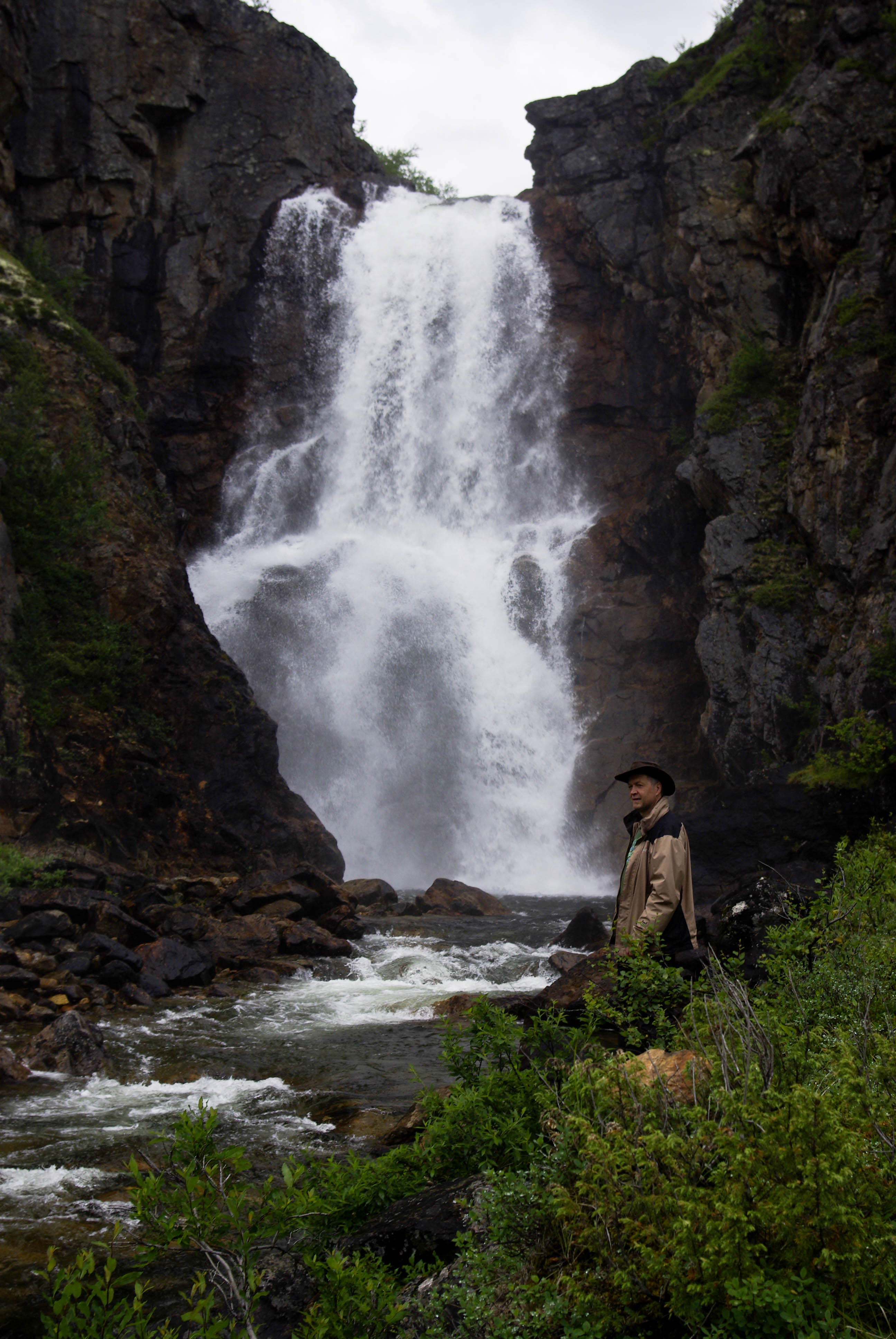 Seuraava etappi oli näköalapaikka, jossa kanjoni aukesi silmiemme eteen jylhänä ja kunnioitusta herättävänä. Näköalapaikalta putouksille polku sukelsi pari kertaa puron varteen sen verran jyrkästi, että oli parhaaksi nähty laittaa oikein portaat. Illaksi luvattu sadealue alkoi myös antaa itsestään merkkejä. Viimeinen jyrkkä ja pitkä lasku putouksen kahlaamolle tapahtui kaatosateessa. Laskun aikana maisema muuttui paljakasta haapoja ja mäntyjä kasvavaksi keitaaksi. Alhaalla oli myös itikkaa ja ihmisiä ihan riittävästi. Turvekammin lähistöllä näytti olevan sen verran vilskettä, että hakeuduimme sateen suojaan telttalavakatokseen. Olimme edellisellä leiripaikalla kuulleet, että kyseiset lavat oli tarkoitettu telttojen alle. Päätimme käyttää palvelua hyväksemme. Se oli hyvä päätös, sillä koko seuraavan yön satoi aika rankasti ja aamulla lavan alla oli lammikko. Pakolliset kuvat kammin sisältä ja putoukselta käytiin nappaamassa seuraavana aamuna.