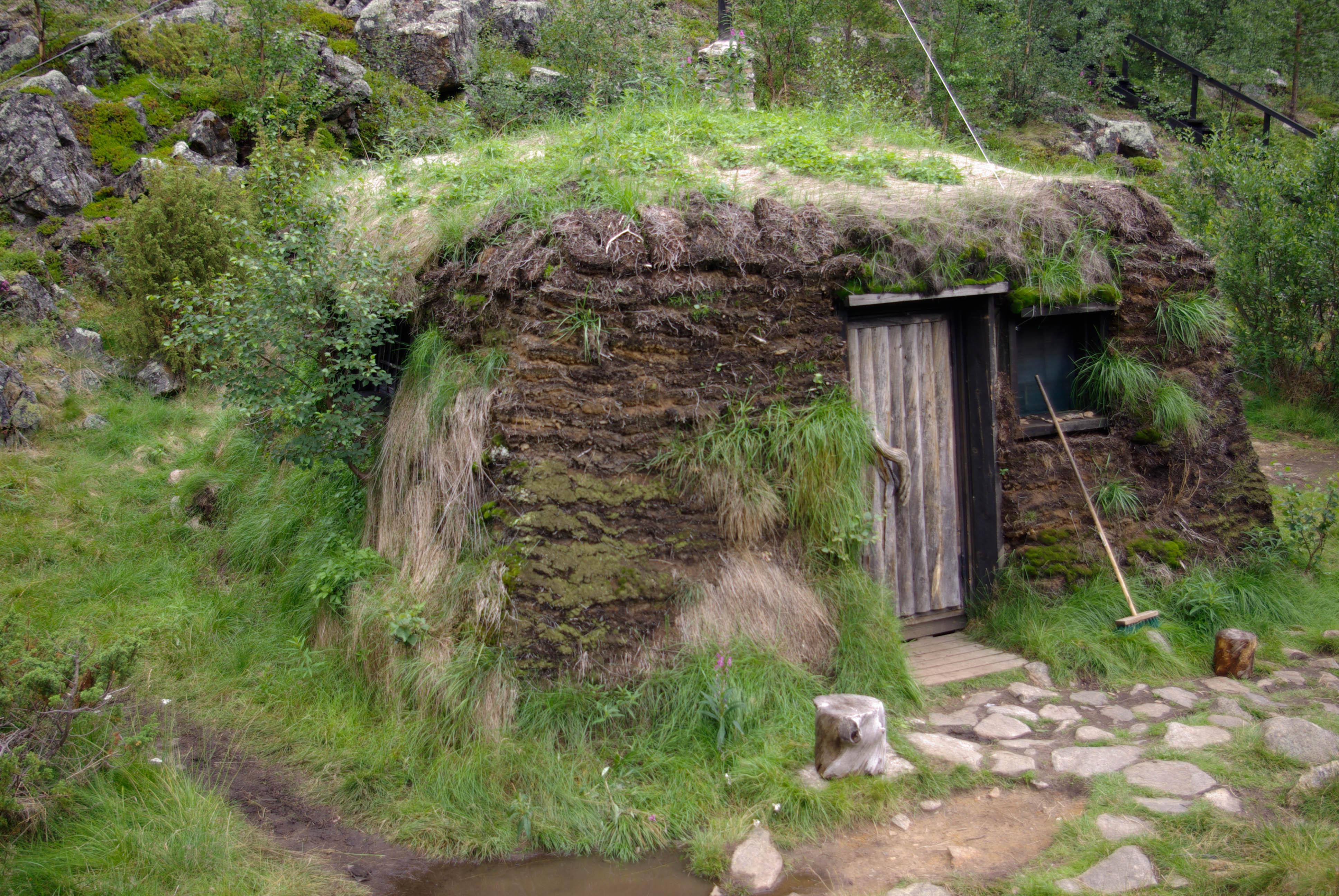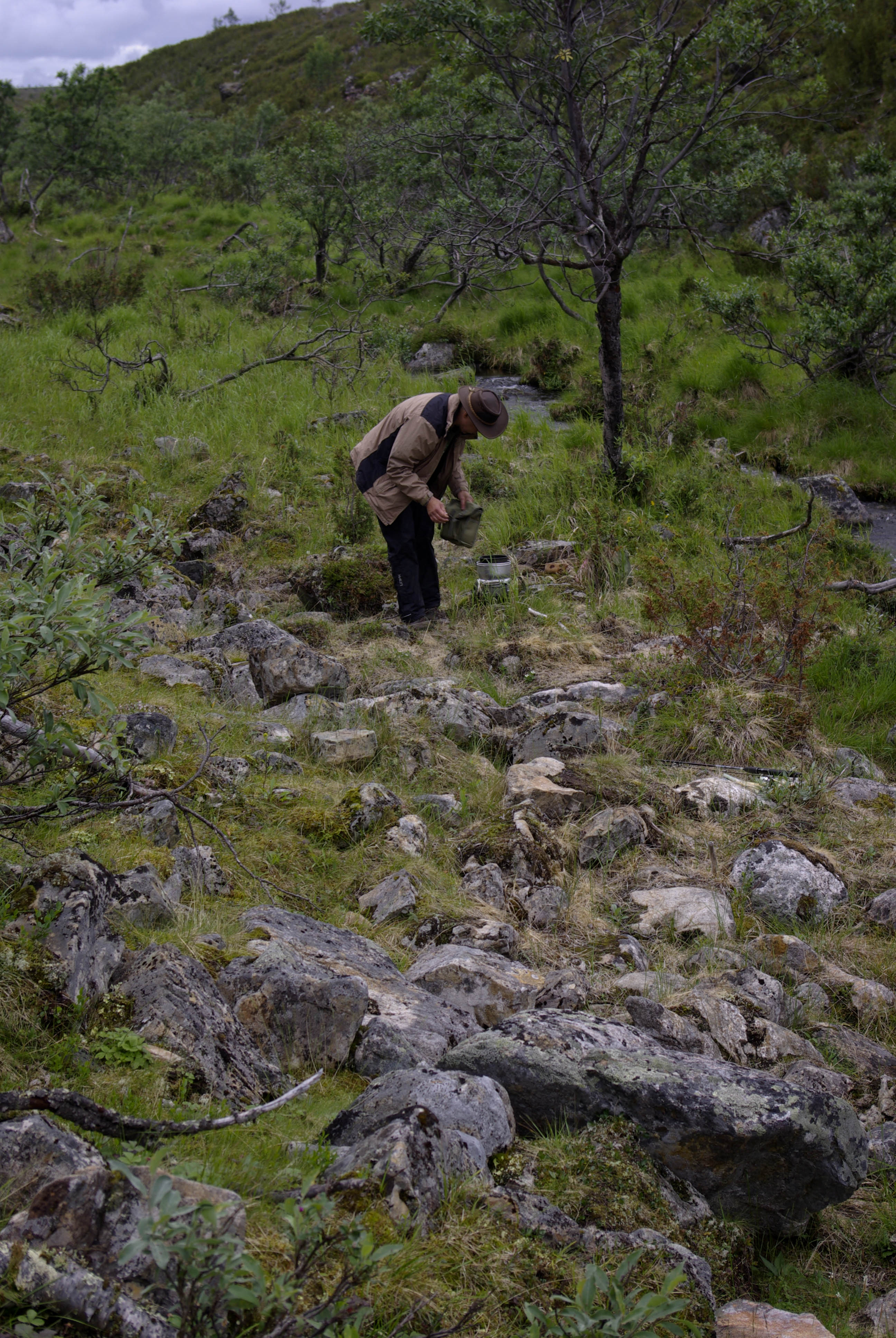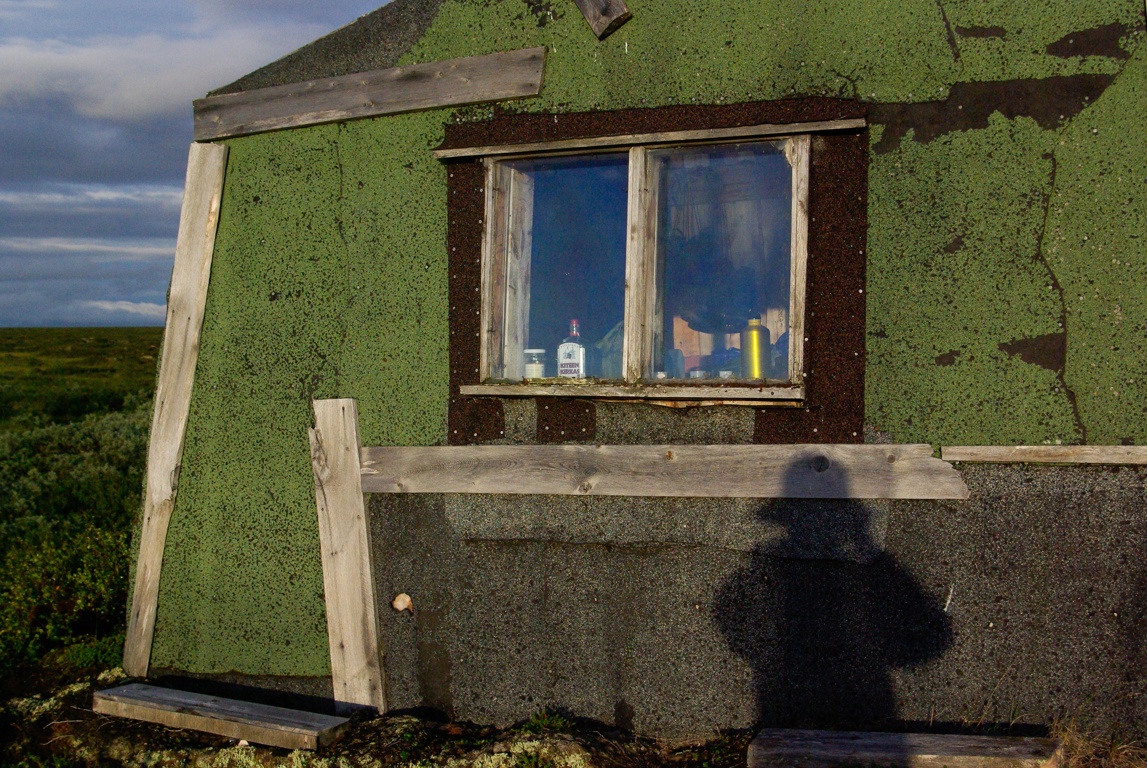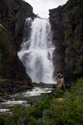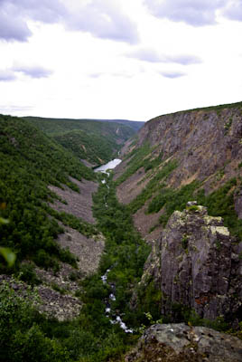 Seuraava etappi oli näköalapaikka, jossa kanjoni aukesi silmiemme eteen jylhänä ja kunnioitusta herättävänä. Näköalapaikalta putouksille polku sukelsi pari kertaa puron varteen sen verran jyrkästi, että oli parhaaksi nähty laittaa oikein portaat. Illaksi luvattu sadealue alkoi myös antaa itsestään merkkejä. Viimeinen jyrkkä ja pitkä lasku putouksen kahlaamolle tapahtui kaatosateessa. Laskun aikana maisema muuttui paljakasta haapoja ja mäntyjä kasvavaksi keitaaksi. Alhaalla oli myös itikkaa ja ihmisiä ihan riittävästi. Turvekammin lähistöllä näytti olevan sen verran vilskettä, että hakeuduimme sateen suojaan telttalavakatokseen. Olimme edellisellä leiripaikalla kuulleet, että kyseiset lavat oli tarkoitettu telttojen alle. Päätimme käyttää palvelua hyväksemme. Se oli hyvä päätös, sillä koko seuraavan yön satoi aika rankasti ja aamulla lavan alla oli lammikko. Pakolliset kuvat kammin sisältä ja putoukselta käytiin nappaamassa seuraavana aamuna.