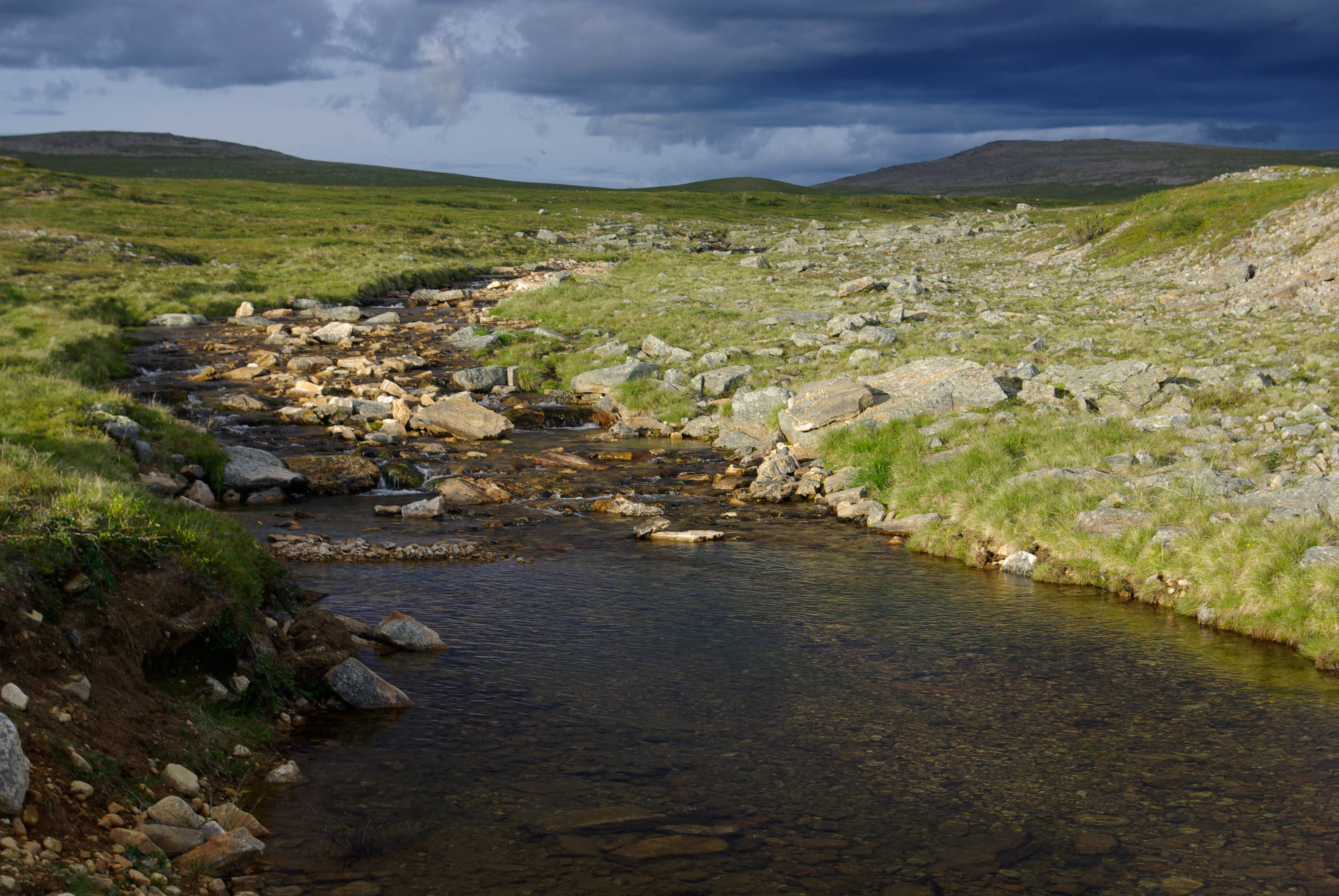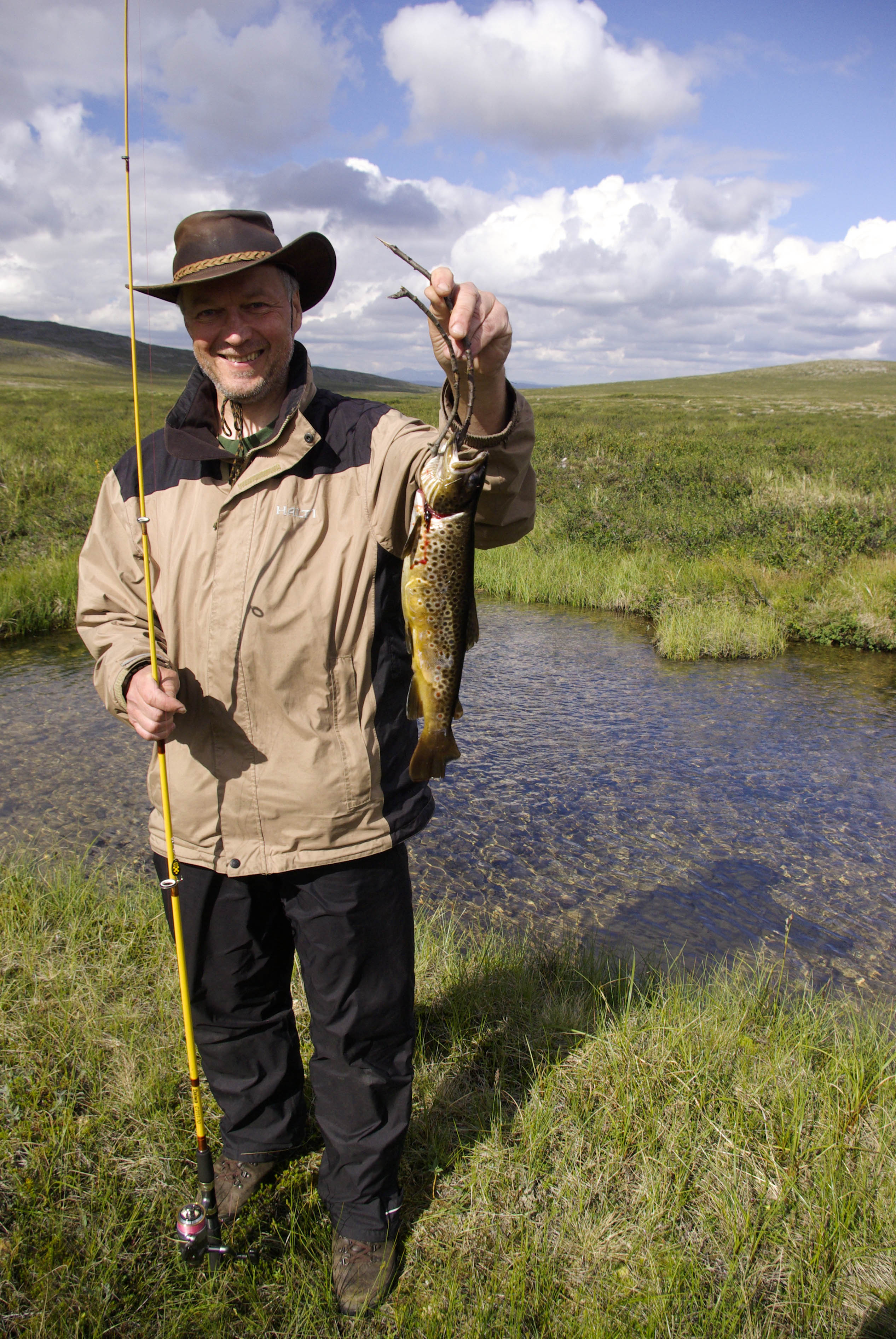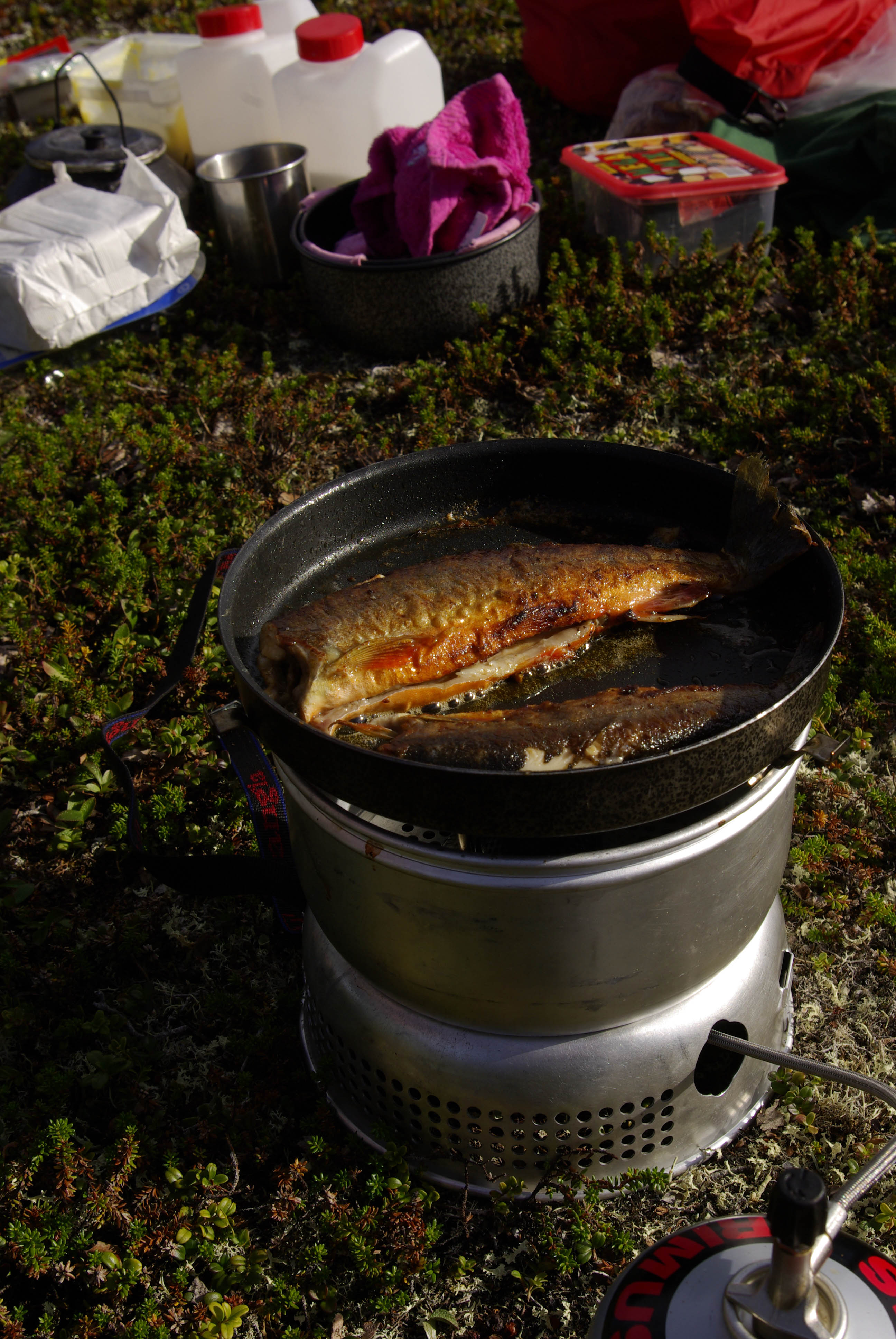 Matka jatkui satulan yli kohti Carasjoen latvoja. Joki virtasi rauhallisesti parin metrin levyisenä soistuvassa maastossa. Pidimme tauon pienen suvannon vieressä olevalla kuivalla kumpareella. Laitoimme riisit kypsymään ja kalastelimme hiukan ympäristössä. Suvannosta tuli yksi komea tammukka. Sitten vähän matkan päässä joen mutkassa hieman isompi torpedo säntäsi matkaan penkan alta. Heitin perään ja heti nappasi. Silmämääräisesti arvioiden täysmittainen taimen. Tämän otuksen vatsasta löytyi juuri syöty sopuli. Saatiin lisäksi vielä muutama tammukka. Matka jatkui Roavveoaivin pohjoispuolitse kohti mutkaa, jossa Carasjoki sukeltaa kalastusalueen ulkopuolelle. Alueelta ei kuitenkaan löytynyt kunnollista leiripaikkaa, joten jatkoimme matkaa. Noin kilometri ennen Gohpalasajaa löytyi mukava leiripaikka joen rannalta. Polttopuita oli riittävästi ja kalat oli saatu jo matkan varrella, joten ilta kului rattoisasti kahvin ja nuotiokalan parissa.