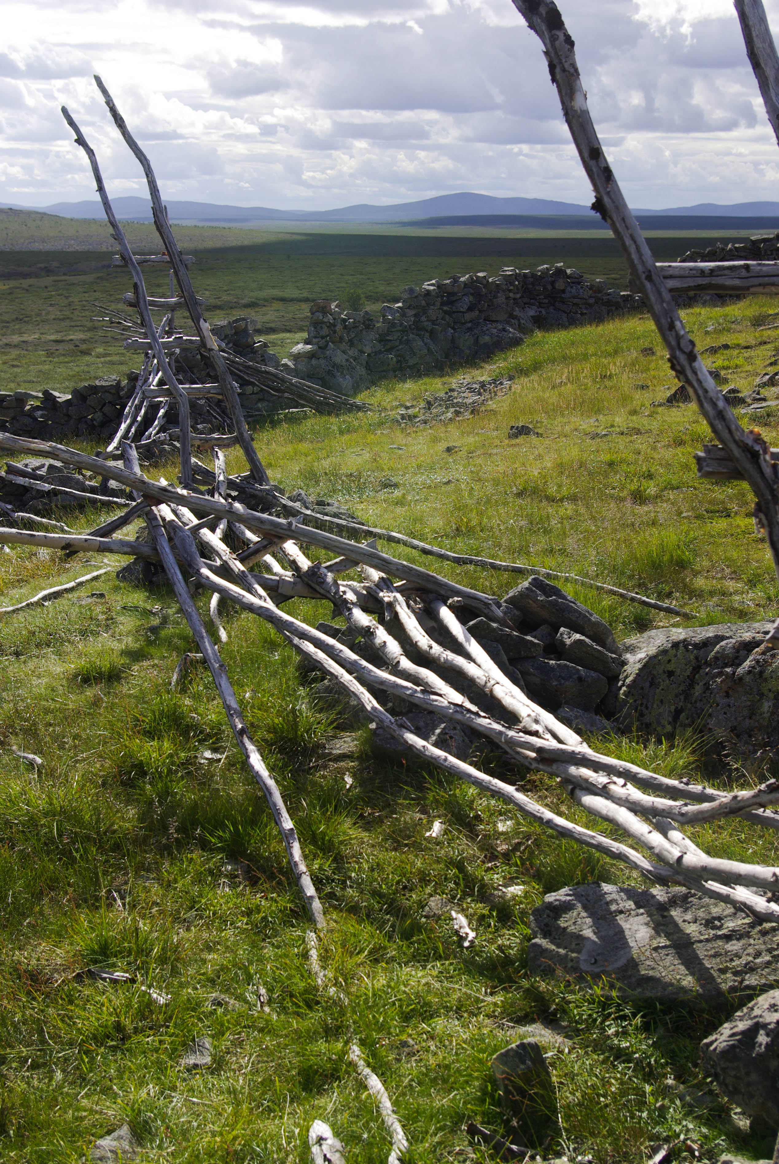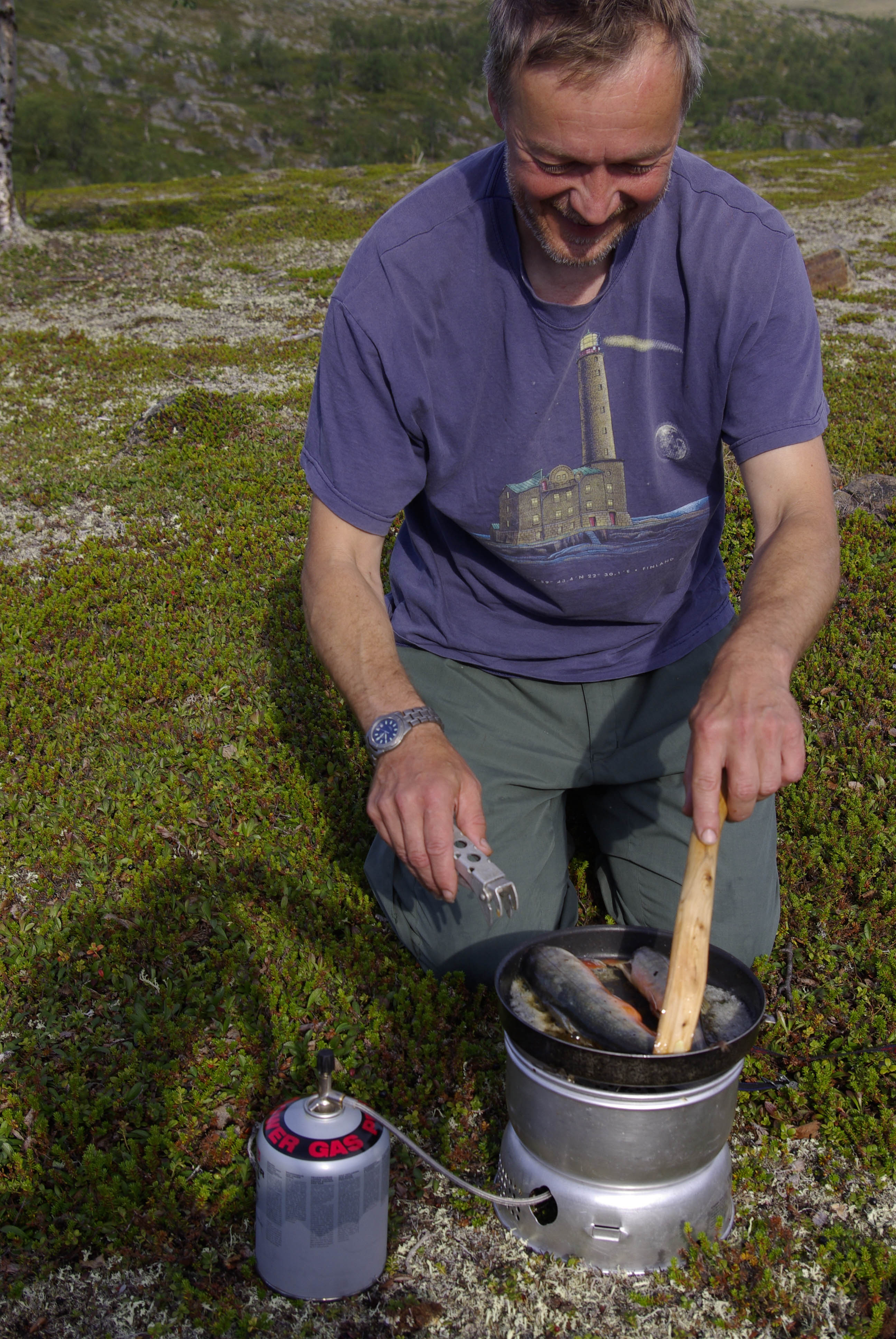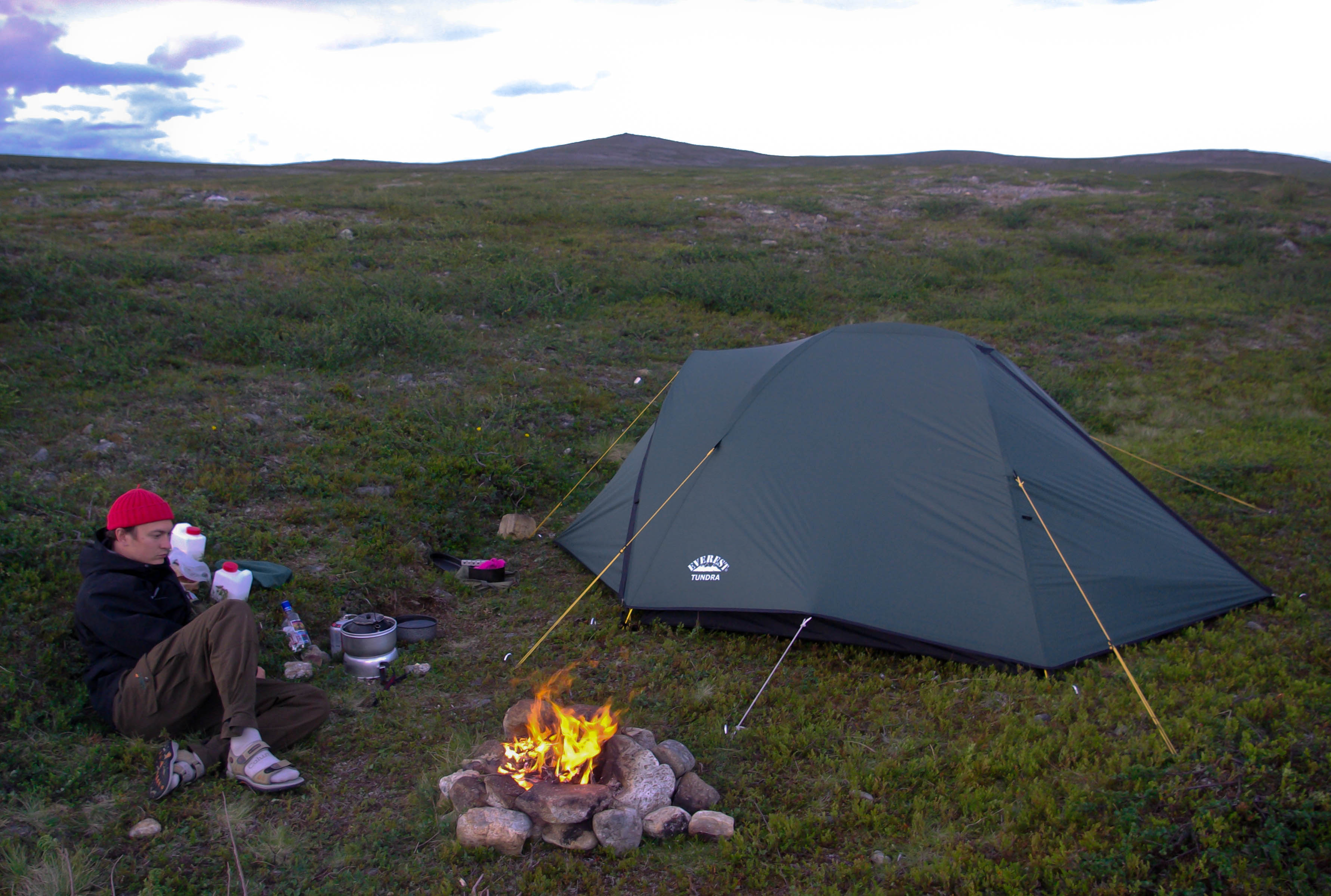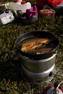 Tänään olisi se päivä, jolloin taas vuoden tauon jälkeen saisi maistaa herkullista tikkutammukkaa. Matka Ceavrresgielaksen kammille sujui melko joutuisasti. Lounasta syötiin Ceavrresjohkan rannalla. Kammilta kuului työn ääniä ja aggregaatin pehmeä hyrinä. Uuden kammin perustukset olivat jo hyvässä mallissa. Lattialautoja aseteltiin paikoilleen. Pääsimme taas valmiille tulille. Keitimme kahvit ja ajattelimme käydä kurkkaamassa vanhaan kammiin, joka oli kuulemma työkaluvarastona. Sadekuuro keskeytti rakennuspuuhat. Meillekin tarjottiin suojaa rakennusmiesten puolijoukkueteltassa, mutta katsoimme parhaaksi lähteä etsimään telttapaikkaa Akujoen varresta. Ensin näytti huonolta, mutta läheltä Suorbmaljohkan suuta löytyi aivan rannasta hieno telttapaikka. Teltta pystyyn ja vavat kasaan. Tammukka tarttui lippaan heti ensimmäisellä heitolla. Toinenkin tarttui melko pian, mutta katkaisi siiman; olisikohan hankautunut heikoksi matkan aikana. Kolmannen tammukan jälkeen syönti lakkasi leiripaikan ympäristössä kokonaan. Se tarjosikin sopivan tilaisuuden huuhdella iholta kahden päivän hiet juoksevassa vedessä. Oli se aika raikasta. Pesun jälkeen limettyneet vaatteet virtaan huuhtoutumaan ja puhtaat päälle. Olo tuntui taas ihmismäiseltä. Runsaan kilometrin pituinen kalaretki etelään päin toi muutaman pulskan tammukan lisää. Kuivaneista katajista ja pystyyn kuolleista koivuista saatiin kelpo nuotio aikaan. Tammukoita laitettiin tikun nokkaan ja nuotiokiville. Punalihaisen tiristessä nuotiolla keitettiin kahvit. Juhlan kunniaksi plöräytettiin vähän koviketta sekaan. Tammukat nautittiin kädestä suuhun-menetelmällä ja päälle ryystettiin sitä terästettyä kahvia. Muuta iltapalaa ei sitten kaivannutkaan. Auringonlasku oli sangen upea.