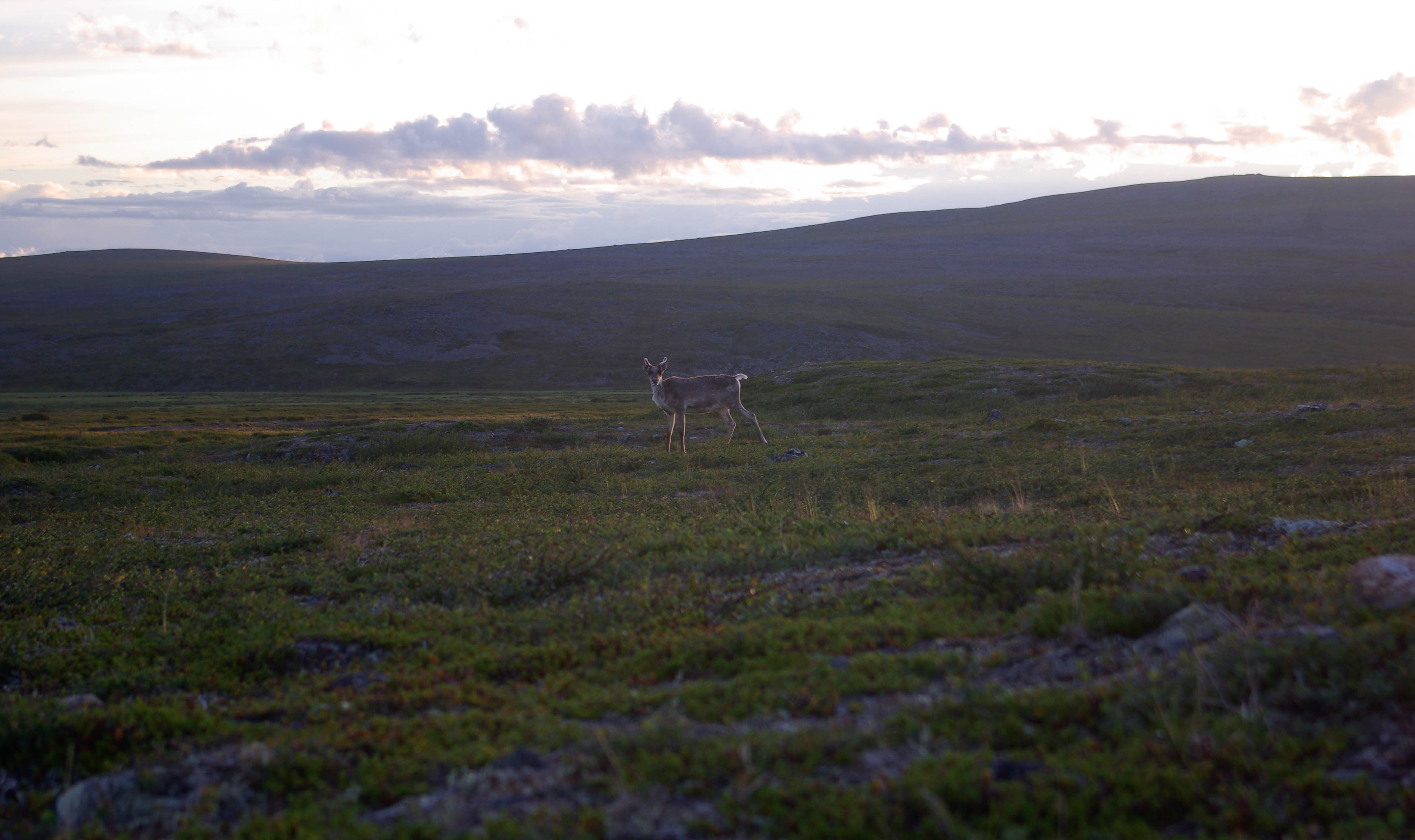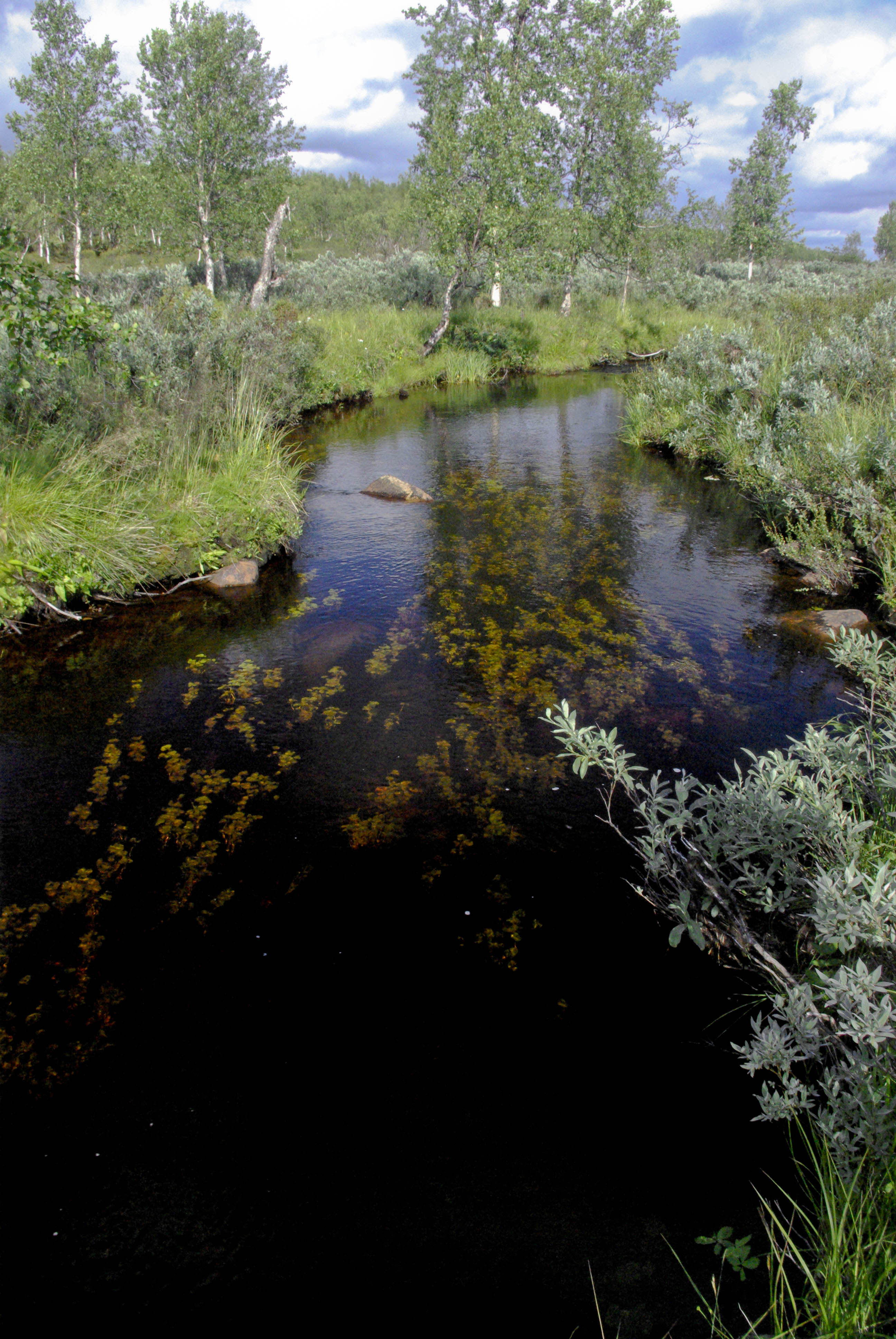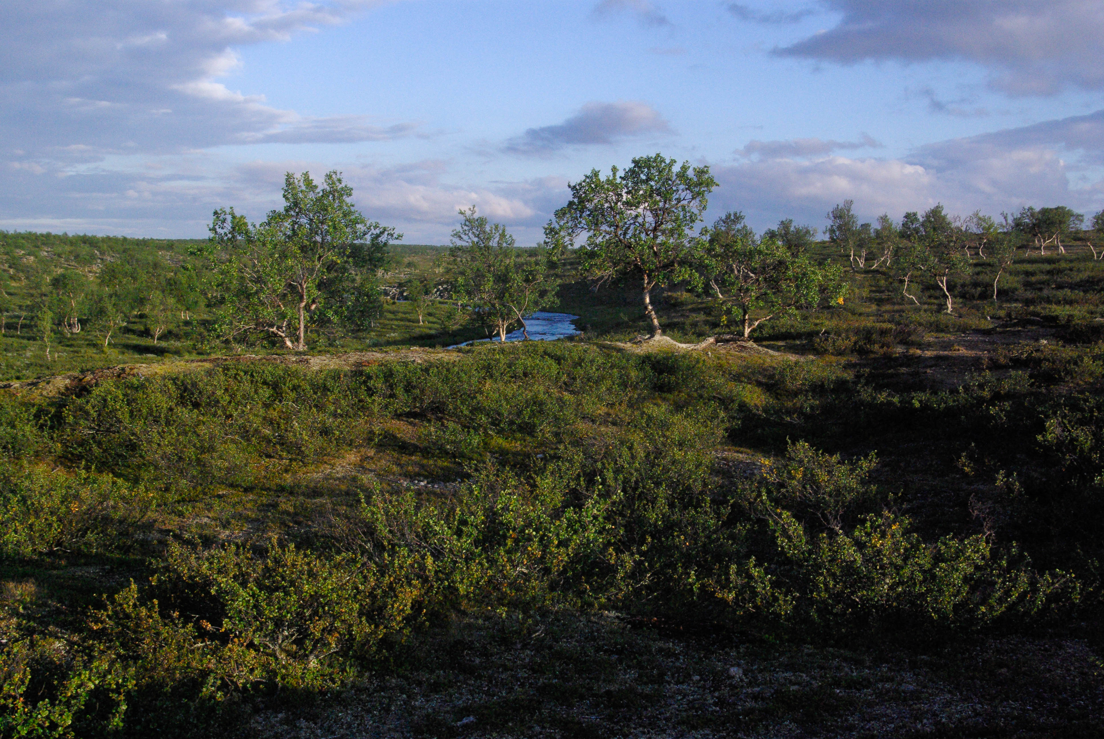 Aamu valkeni aurinkoisena. Matka jatkui kohti pohjoista. Tarkoitus oli leiriytyä paikkaan, josta olisi lyhyt matka Kuiville. Huiputus olisi tarkoitus suorittaa illalla tai seuraavana aamuna. Ensin seurattiin Akujoen vartta, sitten kohti Suorbmaljohkan alkulähteitä. Ainakin läntinen lampi oli matala eikä houkutellut kalastamaan. Syötiin vähän purua ja jatkettiin matkaa puiston rajan suuntaisesti. Seuraavalla harjanteella, keskellä paljakkaa, kasvoi hyvinvoivan näköinen männyn taimi. Harjanteen takana oleva puro oli kartan mukaan hiekkarantainen. Toiveet suojaisasta hiekkatöyräästä olivat kuitenkin turhia. Välipala jouduttiin nauttimaan melko tuulisella paikalla. Sadettakin vähän tihutteli. Matka jatkui edelleen puiston rajaa mukaillen. Seuraavalle purolle osuttiin sattumalta tosi upeaan kohtaan. Pienessä kirkasvetisessä purossa oli metrin syvä sorapohjainen suvanto. Kun töyrään reunalta löytyi vielä hyvä telttapaikka, olimme valmiit jäämään siihen yöksi. Ennen teltan pystyttämistä lähdimme katsomaan löytyykö alempana olevista suolammista kalaa. Lammet olivat pääosin hyvin matalia. Silti tuntui oudolta, että yhtään tärppiä ei tullut koko parituntisen kalastusrupeaman aikana. Rinkoille palatessa aurinko porotti ja hiki virtasi. Ei muuta kuin suvantoon polskimaan. Edessä olisi ilta ilman tikkukalaa. Päätimme hemmotella itseämme letuilla. Teltan vierestä löytyi vanha nuotiopaikka. Keräsimme kuivia katajan ja vaivaiskoivun oksia sen verran, että saatoimme pitää yllä pientä tunnelmanuotiota. Pitkästymisen ehkäisemiseksi kuvailimme välillä ympäristön faunaa. Kennolle tarttui kihu, joka kierteli läheistä heikkanyppylää ja poro. Letutkin siinä maistuivat illan hämärtyessä. Tosin hämärtyminen otti koville, kun aurinko vaan lasketteli pitkin Rassoaivin rinnettä. Vielä yhdentoista aikaan siitä oli puolet näkyvissä. Selkeä keli herätti toiveita yöpakkasista ja itikoitten vähenemisestä. Illalla hengitys hörysi jo lupaavasti, mutta ei vaan jaksanut mennä pakkasen puolelle.
