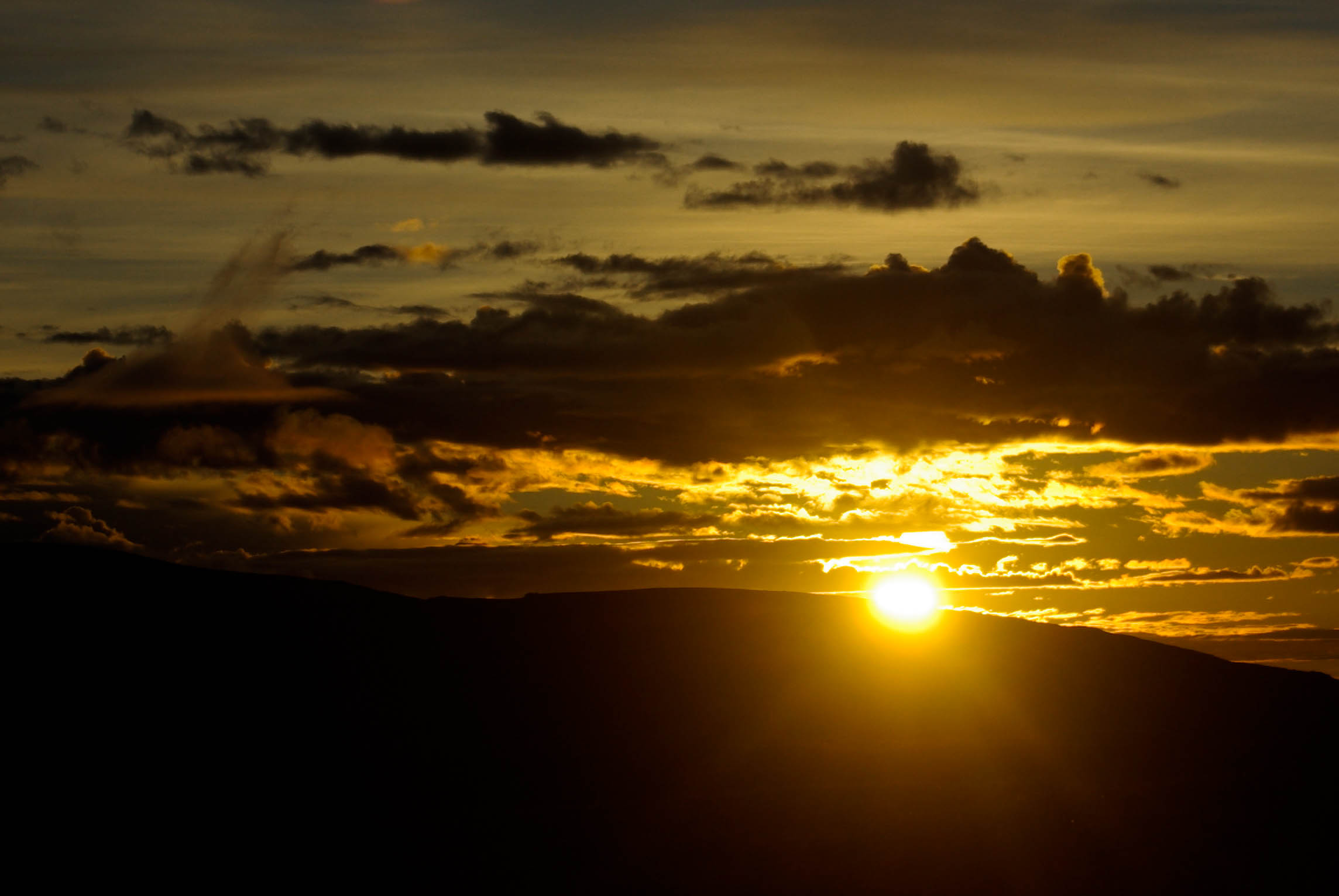 Aurinko laskee pilviverhoon katajain taa.