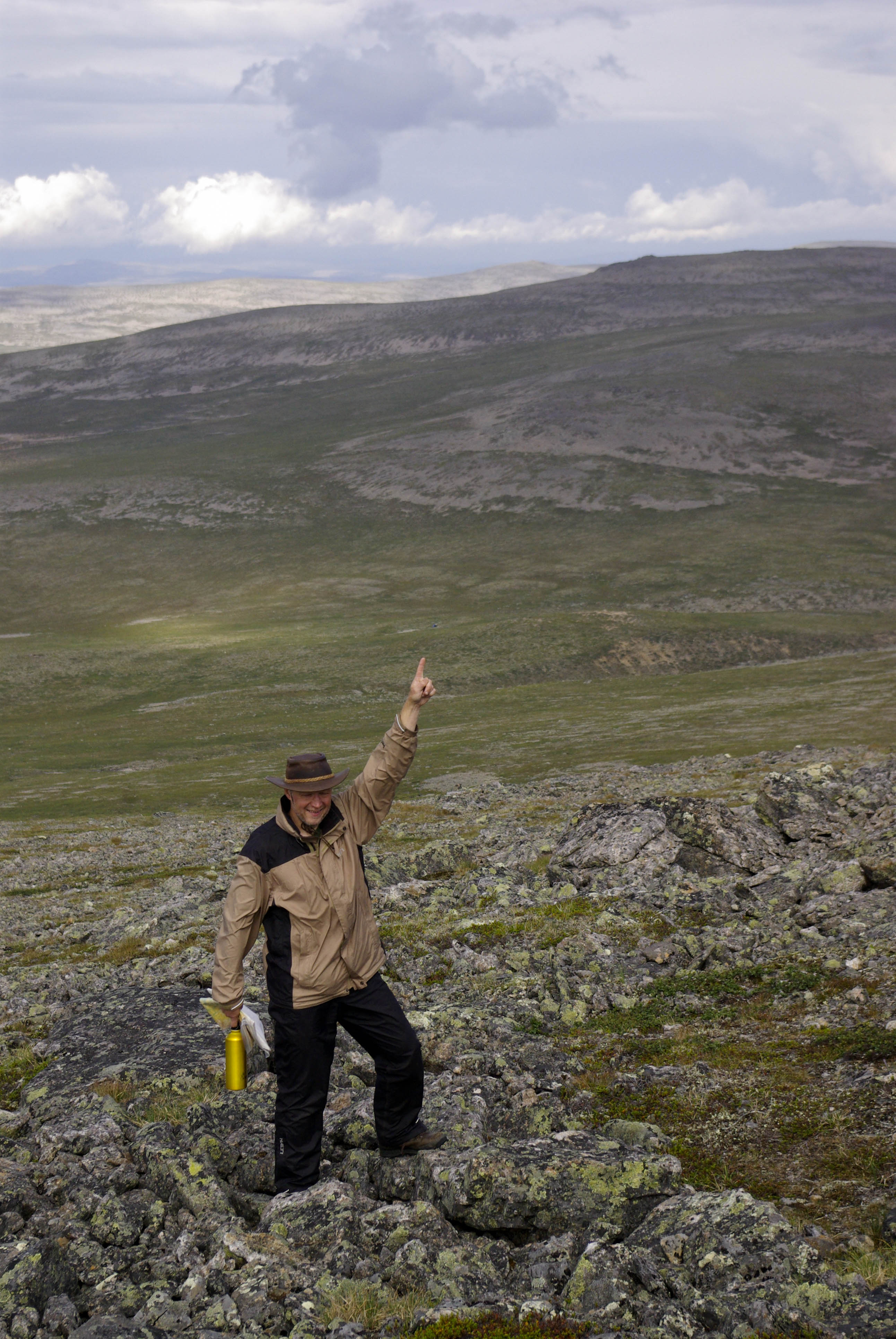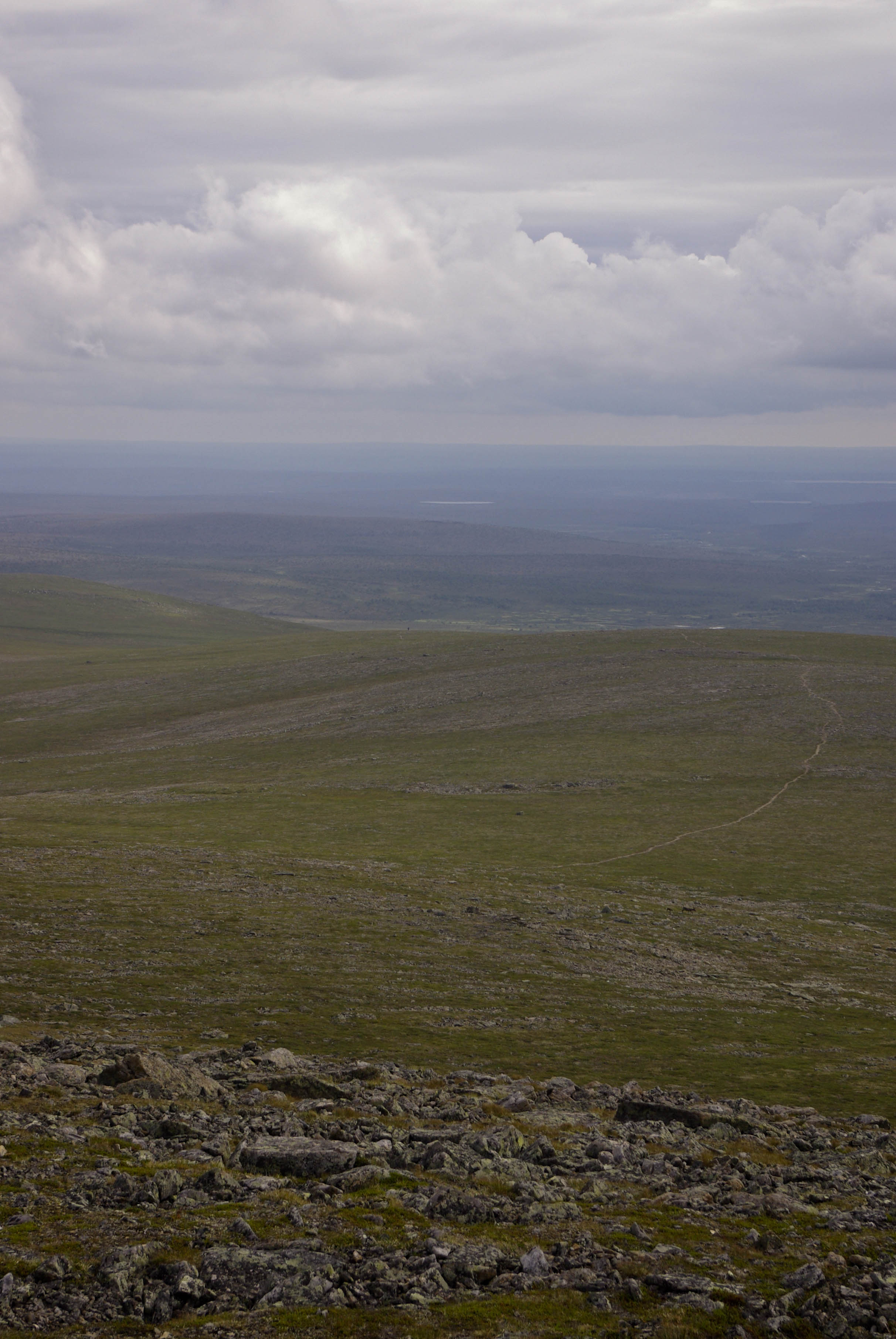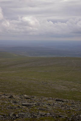 Tänään huiputettaisiin Kuivi, tosin ilman rinkkoja. Lähdimme nousemaan puron vartta pitkin kohti puiston rajaa. Rinkat jätettiin Kuivin ja Guovdaoaivin väliseen satulaan näkyvälle paikalle. Siitä lähdettiin kohti huippua. Tuli vähän rikottua sääntöjä, kun emme menneet merkittyä reittiä pitkin. Meidän lisäksemme siellä kuljeskeli yksinäinen poro. Ilma oli kohtalaisen selkeä ja huipulta oli hienot näkymät. Tuvalta tuleva polku erottui pitkälle, mutta itse tupaa ei näkynyt.