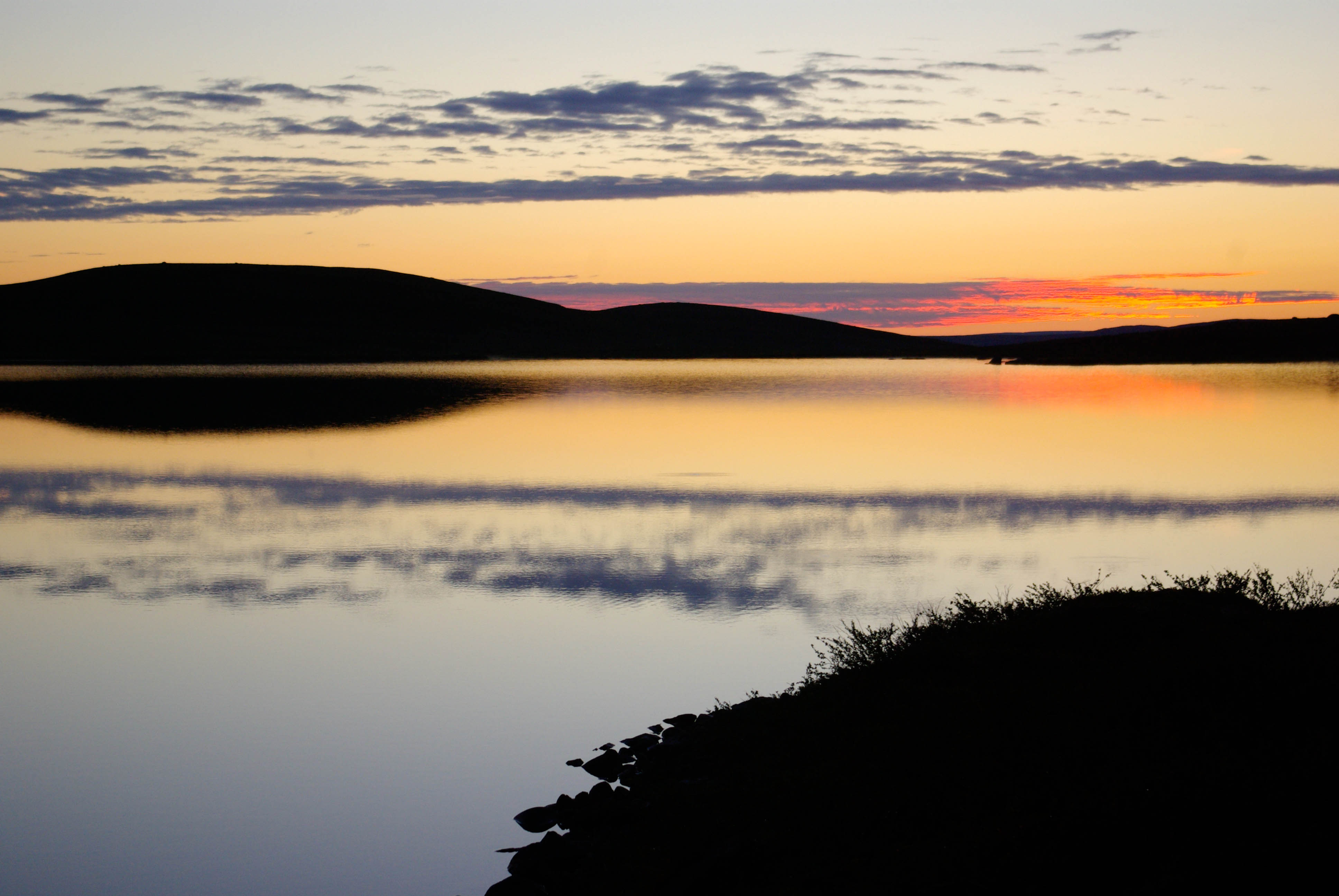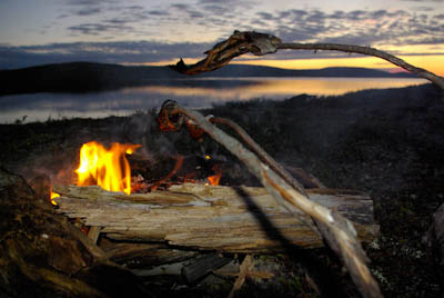 Seuraava kohde oli Loktajavri, jonne mentäisiin ikivanhan poroerotusaitauksen kautta. Ensin kuitenkin käytiin katsastamassa pieni järvi kammilta suoraan pohjoiseen. Vesi oli niin uskomattoman kirkasta, että oli vaikea uskoa olevansa runsaan kilometrin päässä ruskeavetisestä Linkinjohkasta. Varmaan siinä myös kalaa oli, mutta aurinkoinen aamupäivän hetki ei ollut otollinen syönnille. Poroaitauksen jälkeen oli alunperin tarkoitus huiputtaa Erttetvarri matkalla, mutta syystä tai toisesta luovuimme ajatuksesta ja jatkoimme pysähtymättä kohti pohjoiseen nousevalla rinteellä välkehtivää pientä järveä. Satuimme järvelle juuri sopivalla hetkellä. Taivas tummui ja tuuli tyyntyi täysin, aivan kuin tyyntä myrskyn edellä. Samalla rupesivat kalat tuikkimaan ja ottivat myös hanakasti lippaan. Sapuskojen kypsymistä odotellessa saimme riittävästi tammukkaa yhden illan tarpeisiin. Otimme talteen myös mädit ja laitoimme suolaan. Kun olimme syöneet ja teimme lähtöä, tuli sitten se myrskykin. Ukkonen ei osunut aivan kohdalle, vaan salamat leiskuivat jossain Erttetvarrin tienoilla. Viimeisellä etapilla kohti Loktajavrea saimme näkymän myös Goaskinjavrelle, jossa kalastus on syystä tai toisesta kielletty. Syykin selvisi, sillä järven rannalla näytti olevan tupa, jota ei ole ulkoilukartassa, siis yksityinen kalastusparatiisi. Loktajavren itäranta näytti melko soiselta, mutta lounaiskulmassa oli pieni pätkä hiekkarantaa ja pari kelvollista teltanpaikkaa. Pienestä sateesta huolimatta hiekkaranta ja järven kirkas vesi houkuttelivat pesulle. Maasto oli täysin paljakkaa. Luonto tarjosi vain muutaman kuivuneen katajanoksan. Onneksi ihminen oli jättänyt ison kiven juureen pinon halkoja, joita vähän hyödynsimme, kun kalaakin oli. Loktajavresta saimme retken ensimmäisen raudun. Jo oli aikakin, kun kerran alueen pohjoisosia oli mainostettu hyvinä rautuvesinä. Reissun komeista iltaruskoista tämä oli se kenties legendaarisin.