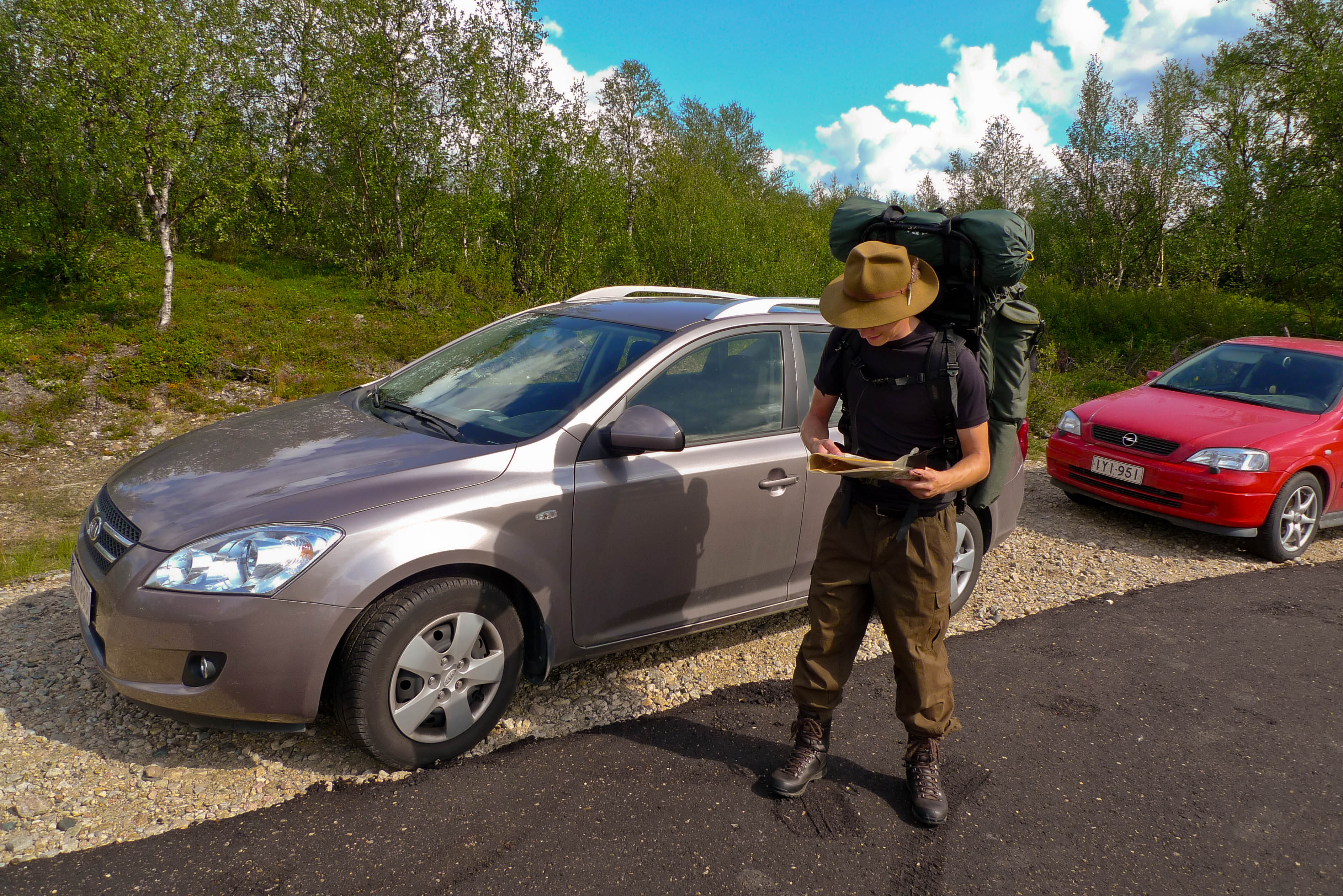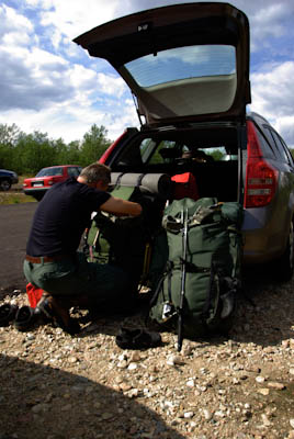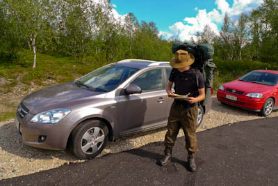 Matkaan lähdettiin Tampereelta autojunalla 31.7.2009 klo 21:36. Matkalla rasvattiin vaelluskengät ja jaettiin pähkinät/kuivahedelmät sopiviin yhden päivät annospusseihin. Makoisien unien jälkeen oltiin Kolarissa puoli kymmenen maissa. Junamatkan hinta oli kaikkineen 207 euroa. Kolarista on matkaa Näkkälään vajaat parisataa kilometriä. Muoniossa käytiin aamukahvilla ja Hetassa syötiin "viimeinen ateria". Näkkälään saavuttiin yhden maissa. Ensin käytiin tiedustelemassa mahdollisuutta päästä vaelluksen jälkeen Samuli Näkkälän saunamökkiin lepäämään yön yli ja keräämään voimia pitkää kotimatkaa varten. Samuli itse ei ollut kotona, mutta saimme puhelinnumeron, josta voisimme tiedustella asiaa sitten kun tarkka saapumisaika olisi tiedossa. Muutama sata metriä Näkkälän talolta eteenpäin oli tien laidassa rengasmainen parkkipaikka, jonka laitaan parkkeerasimme auton. Vaelluskamppeet niskaan, viimeiset tarkistukset, että kaikki on mukana ja sitten matkaan.