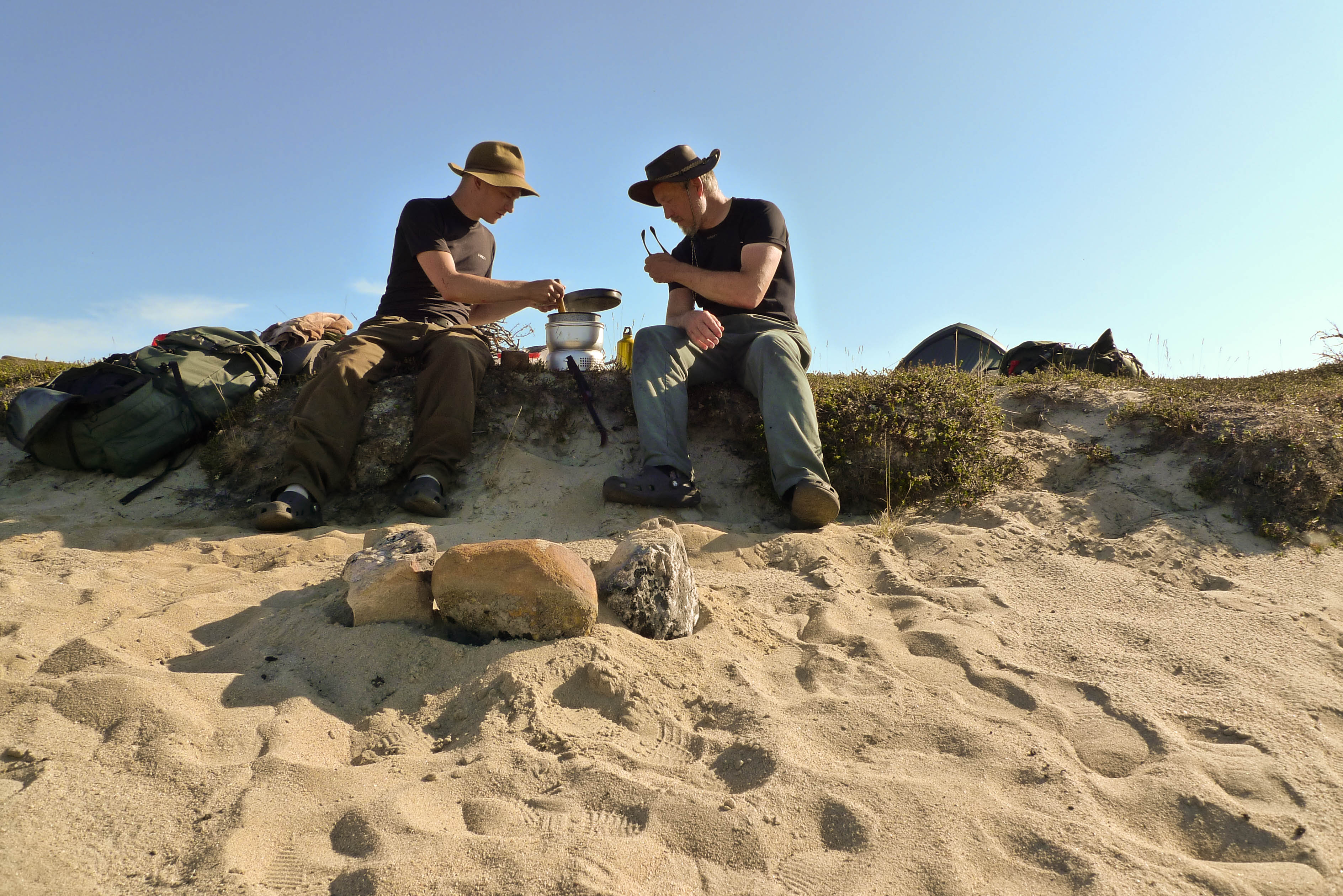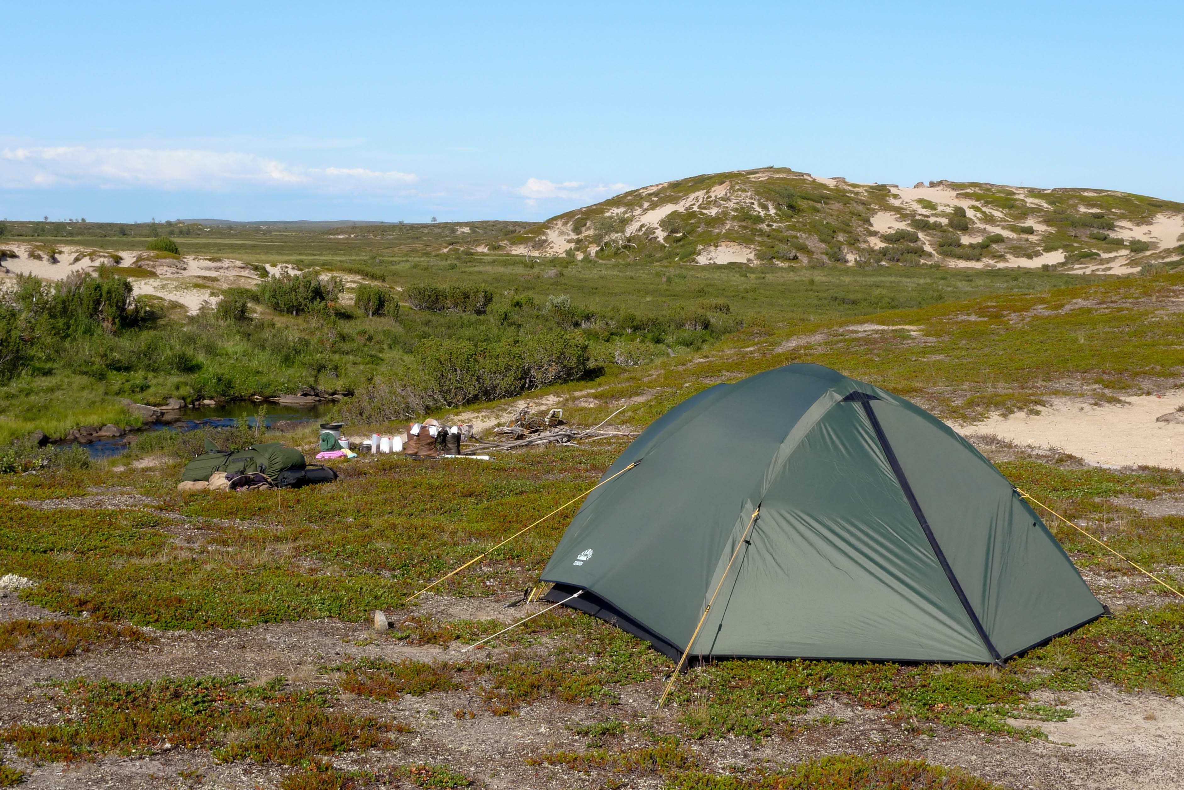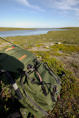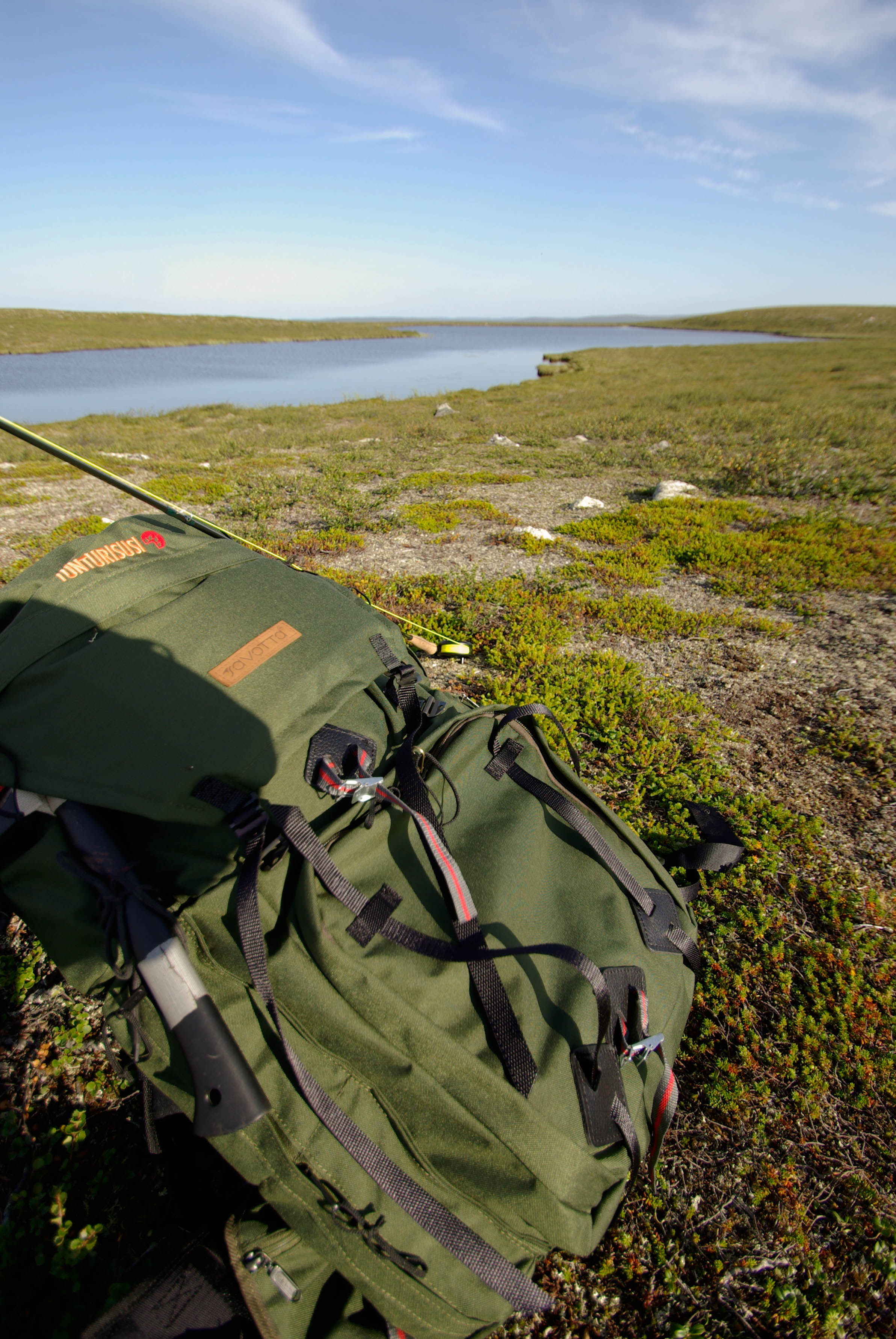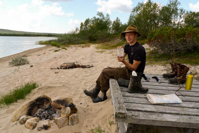 Pääsemme matkaan hieman kolmen jälkeen. Helle paahtaa, hiki virtaa ja rinkat painava hirvittävästi. Pidämme pieniä taukoja parin kolmen kilometrin välein. Heti kun pysähtyy itikat hyökkäävät kimppuun. Ajattelemme, että se on ohimenevää ja että illan viileys tuo pelastuksen. Mönkijäuraa pitkin matka taittuu nopeasti ja aurinko on vielä korkealla, kun saavumme järven koillisnurkkaan. Paikka on upea. Hiekkarannan takana aukeaa kuiva jäkälän peittämä kangas. Koivuja on harvakseltaan ja yksi mäntykin löytyy. Telttapaikkaa ei tarvitse kauaa etsiä. Järvi houkuttelee heittämään lippaa, josko saisi vaikka harrin iltapalaksi. Pian kuitenkin paljastuu karvas pettymys, uistimet ovat jääneet autolle. Perhovehkeet ovat mukana, mutta ne tuntuvat huonolta vaihtoehdolta matalarantaisessa järvessä, kun tuikkejakaan ei näy. Aika nopeasti ajatus kypsyy sille tasolle, että Juho hakee uistimet aamulla. Siitä tulee parikymmentä kilometriä ylimääräistä ilman kantamuksia.
