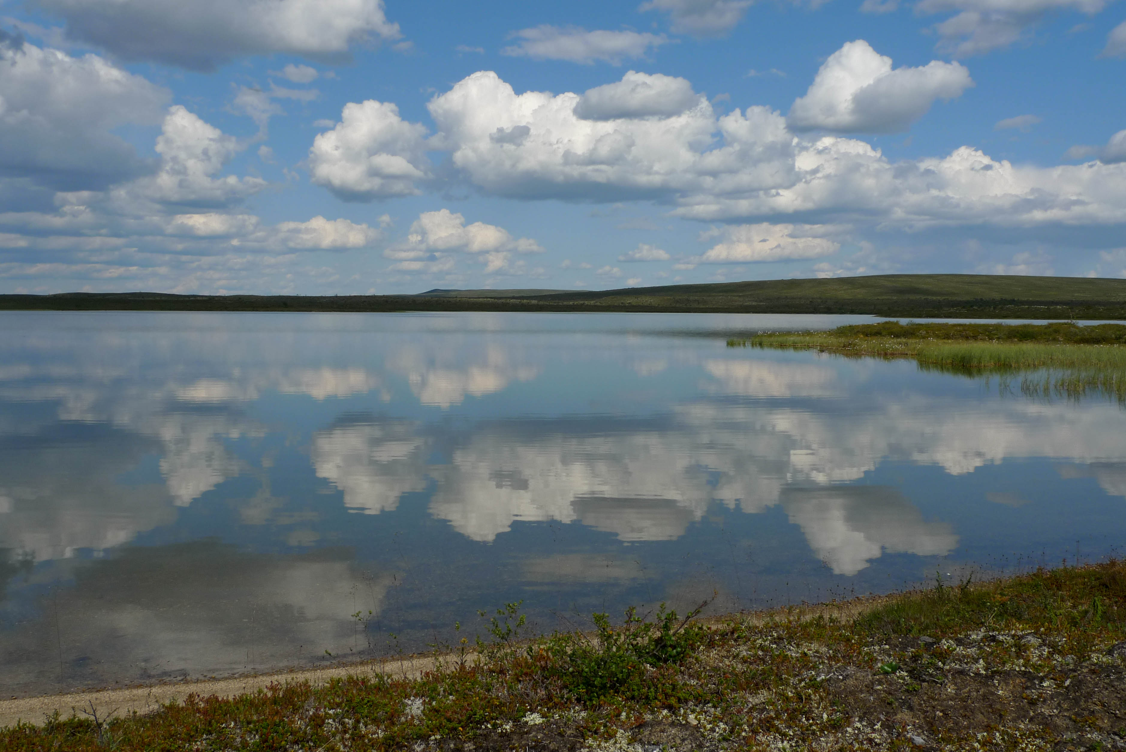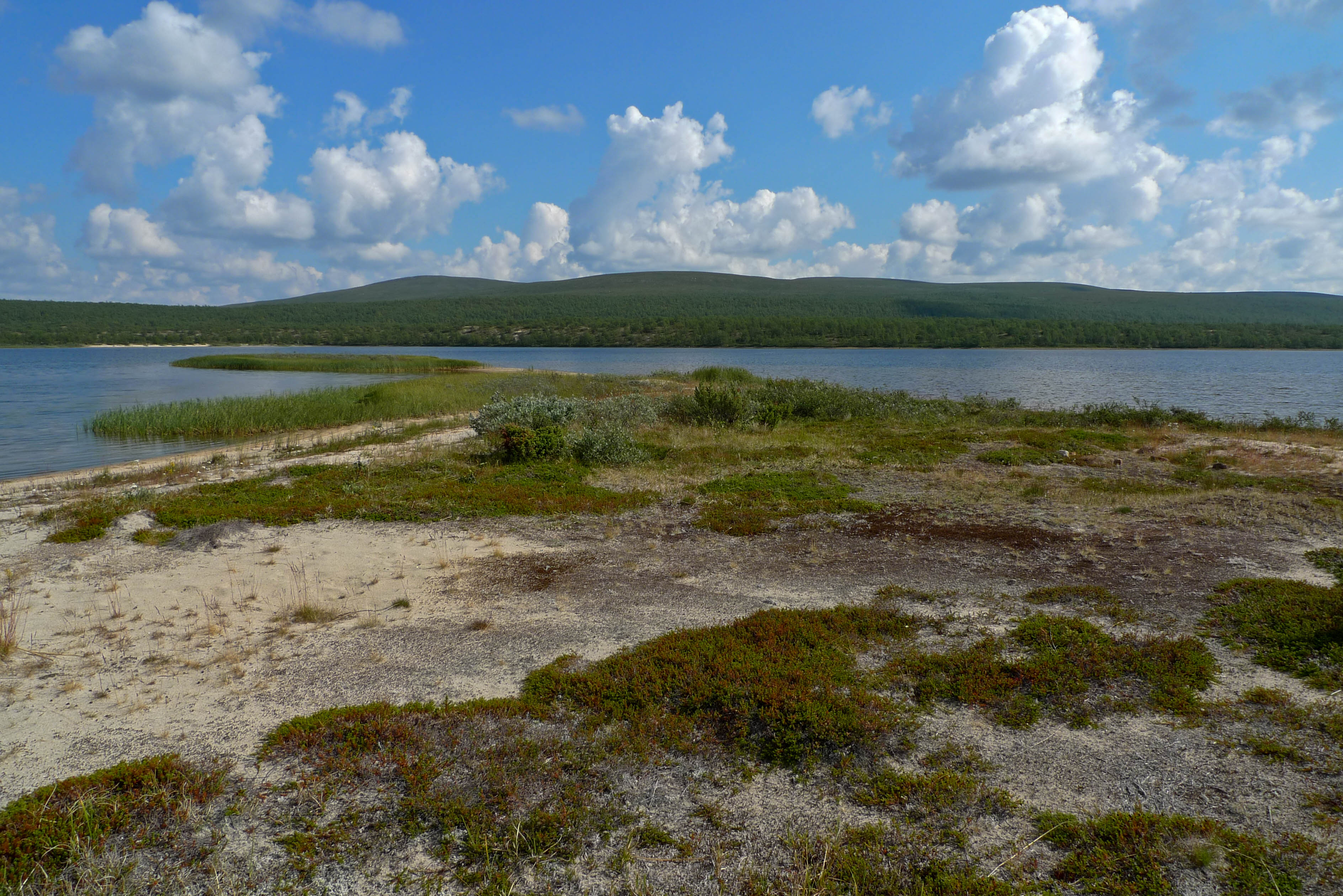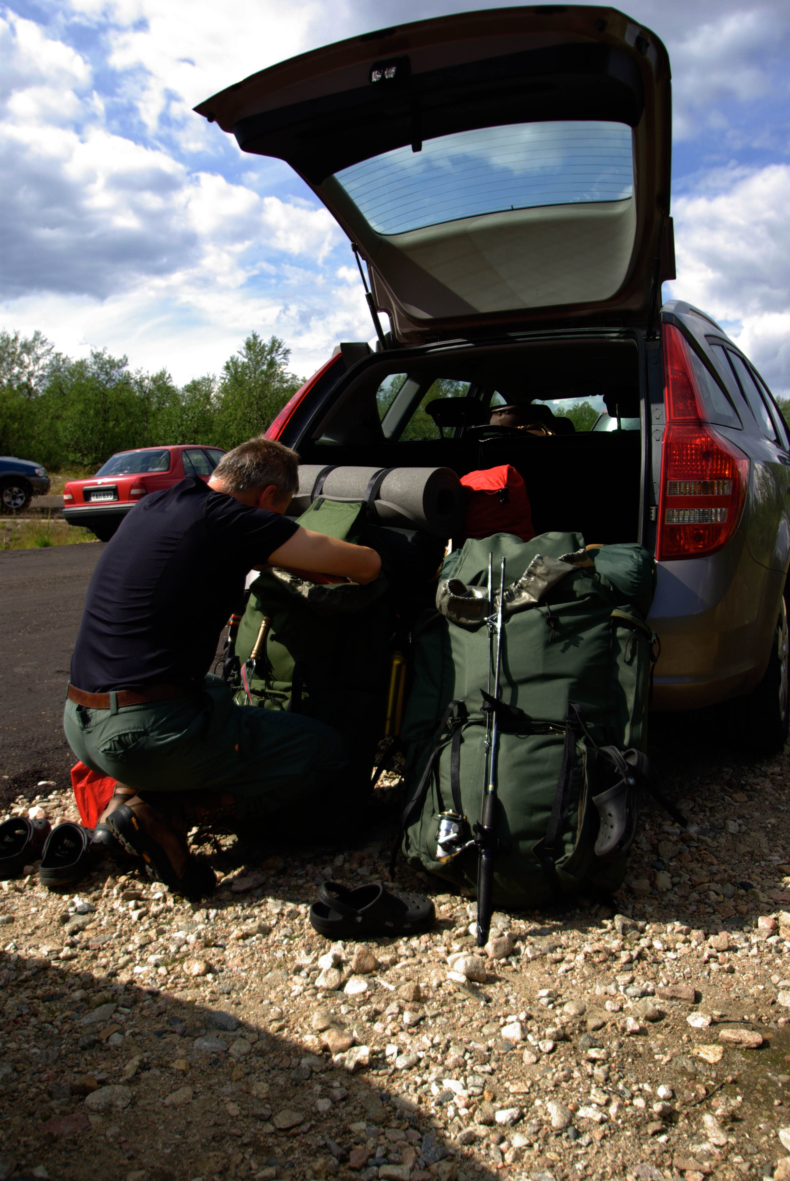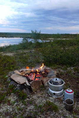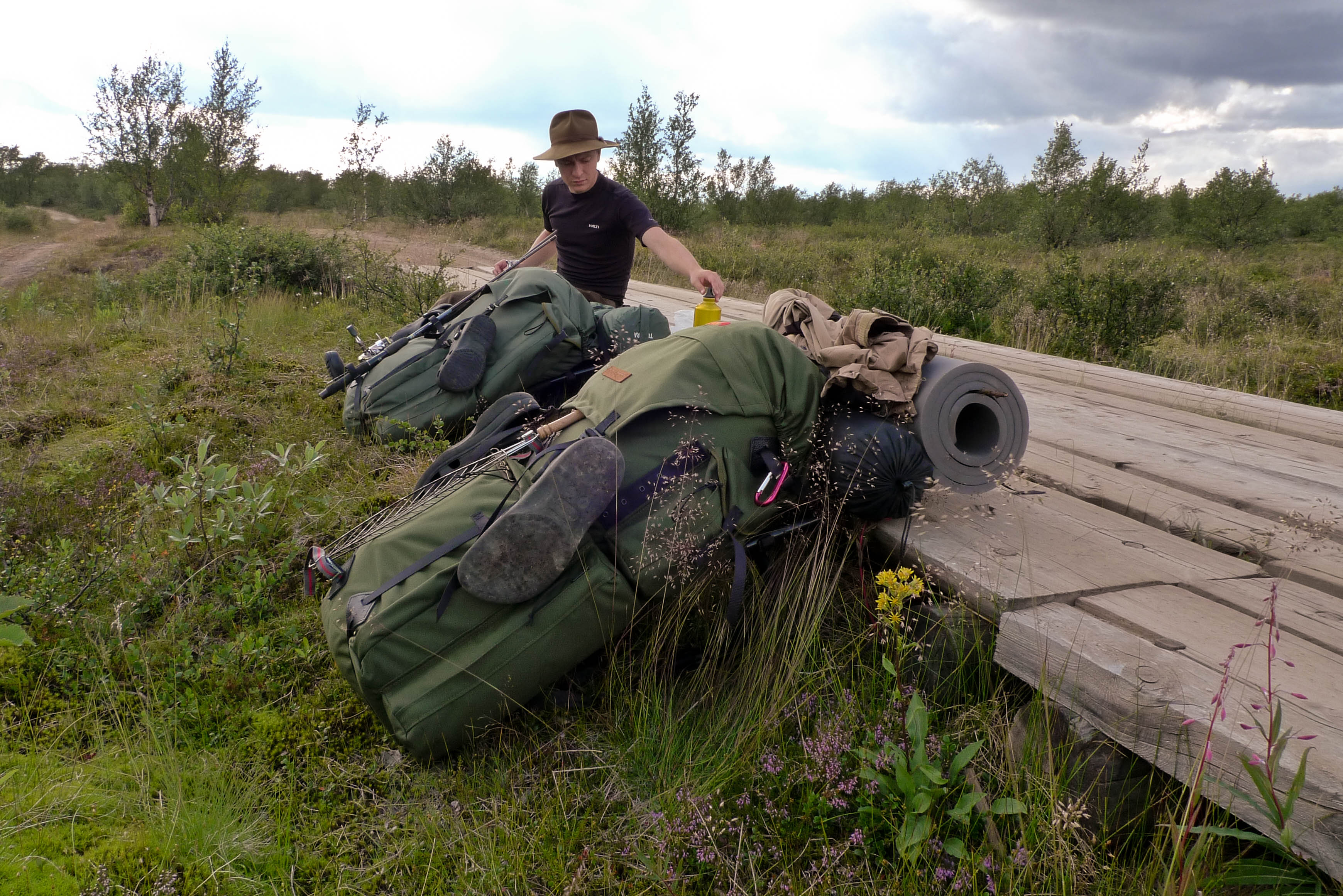 Pääsemme matkaan hieman kolmen jälkeen. Helle paahtaa, hiki virtaa ja rinkat painava hirvittävästi. Pidämme pieniä taukoja parin kolmen kilometrin välein. Heti kun pysähtyy itikat hyökkäävät kimppuun. Ajattelemme, että se on ohimenevää ja että illan viileys tuo pelastuksen. Mönkijäuraa pitkin matka taittuu nopeasti ja aurinko on vielä korkealla, kun saavumme järven koillisnurkkaan. Paikka on upea. Hiekkarannan takana aukeaa kuiva jäkälän peittämä kangas. Koivuja on harvakseltaan ja yksi mäntykin löytyy. Telttapaikkaa ei tarvitse kauaa etsiä. Järvi houkuttelee heittämään lippaa, josko saisi vaikka harrin iltapalaksi. Pian kuitenkin paljastuu karvas pettymys, uistimet ovat jääneet autolle. Perhovehkeet ovat mukana, mutta ne tuntuvat huonolta vaihtoehdolta matalarantaisessa järvessä, kun tuikkejakaan ei näy. Aika nopeasti ajatus kypsyy sille tasolle, että Juho hakee uistimet aamulla. Siitä tulee parikymmentä kilometriä ylimääräistä ilman kantamuksia.