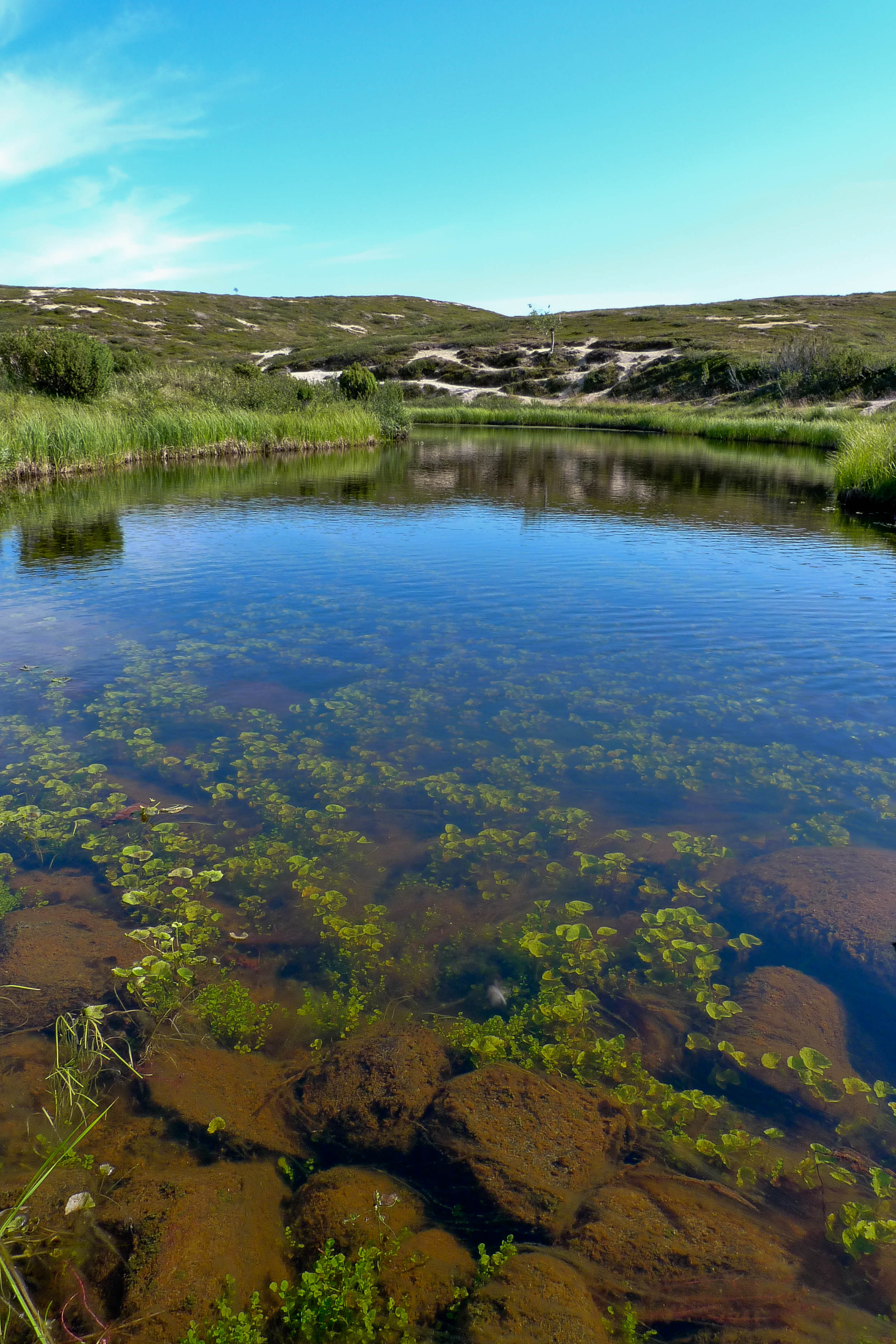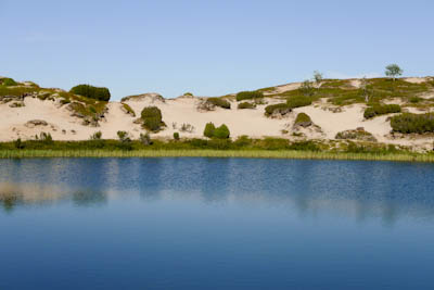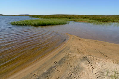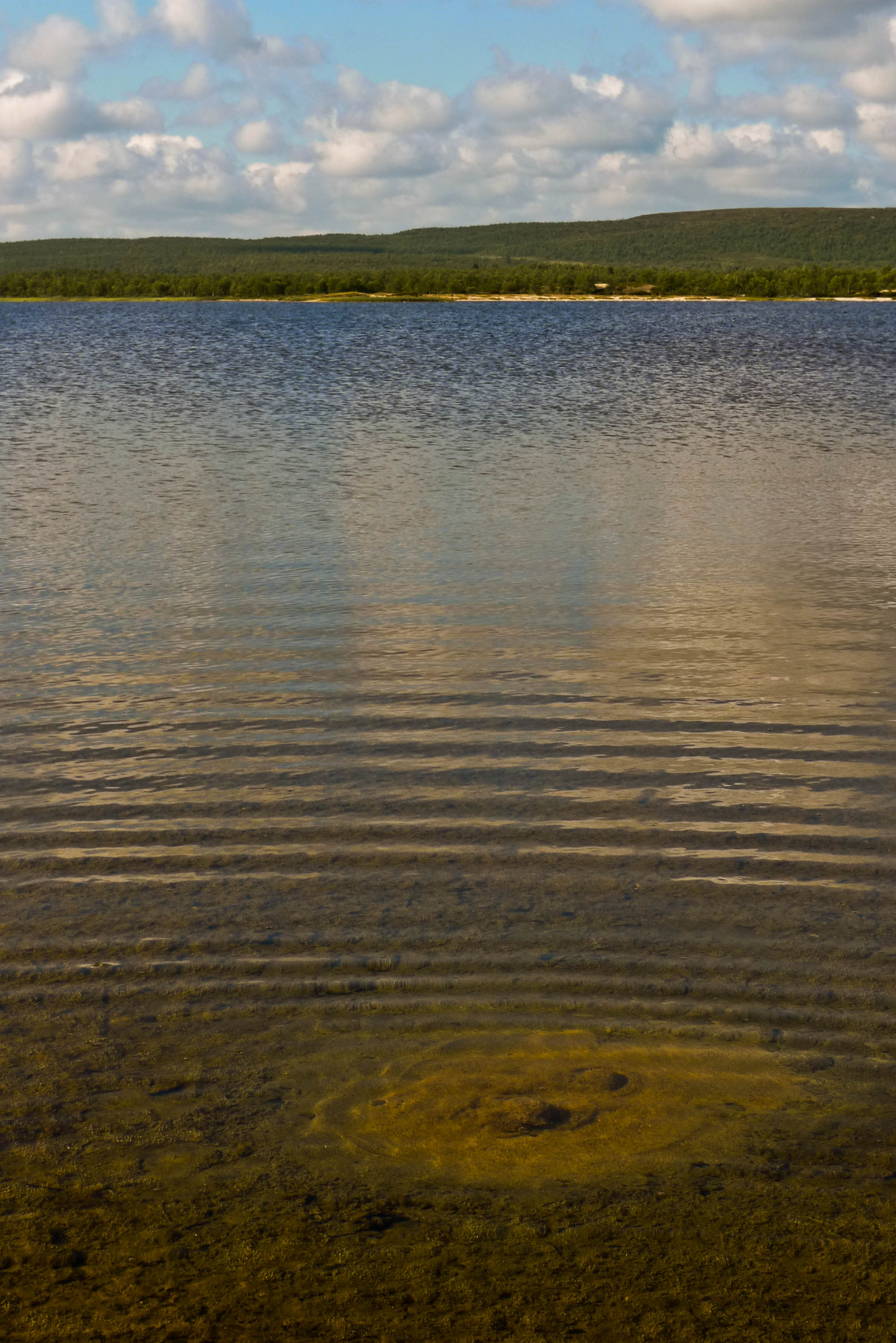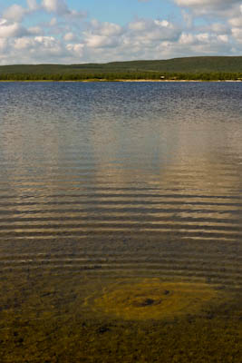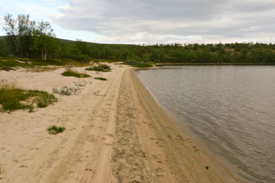 Järvi on todella kaunis korkeine hiekkaharjuineen länsipuolella. Ei mene kauan kun olemme polskuttelemassa viileässä vedessä. Kylvyn jälkeen olo on hetken aikaa taivaallinen. Löydämme oivan leiripaikan lähellä eteläkärkeä olevalta pieneltä niemekkeeltä. Siihen osuisi tuuli kaikilta suunnilta, jos sellainen onni suotaisiin. Niemen viereisessä ruohikkopoukamassa jänkis rouskuttaa tammukanpoikasia. Emme katso kuitenkaan velvollisuudeksemme nykäistä sitä penkalle. Kahvien jälkeen lähdemme kiertämään järveä vastapäivään. Yksi syötävän kokoinen harri erehtyy nappaamaan lippaan, mutta pääsee karkuun. Järven eteläkärjestä lähtevä Maaterjoki aloittaa taipaleensa vaivaisena liruna, jonka yli pääsee helposti kuivin jaloin. Länsirannan hiekkaharjun alla olevassa tyvenessä tuikkii pikkuisia kaloja, mutta mitään ei jää koukkuun. Ylitämme järven hiekkasärkältä. Nokialaisilla olisi päässyt yli, mutta vaelluskengät piti riisua. Palaamme leiriin ja keittelemme lämmintä juomaa. Illan viileys vie mäkärät, mutta hyttyset jäävät kiusaksemme.