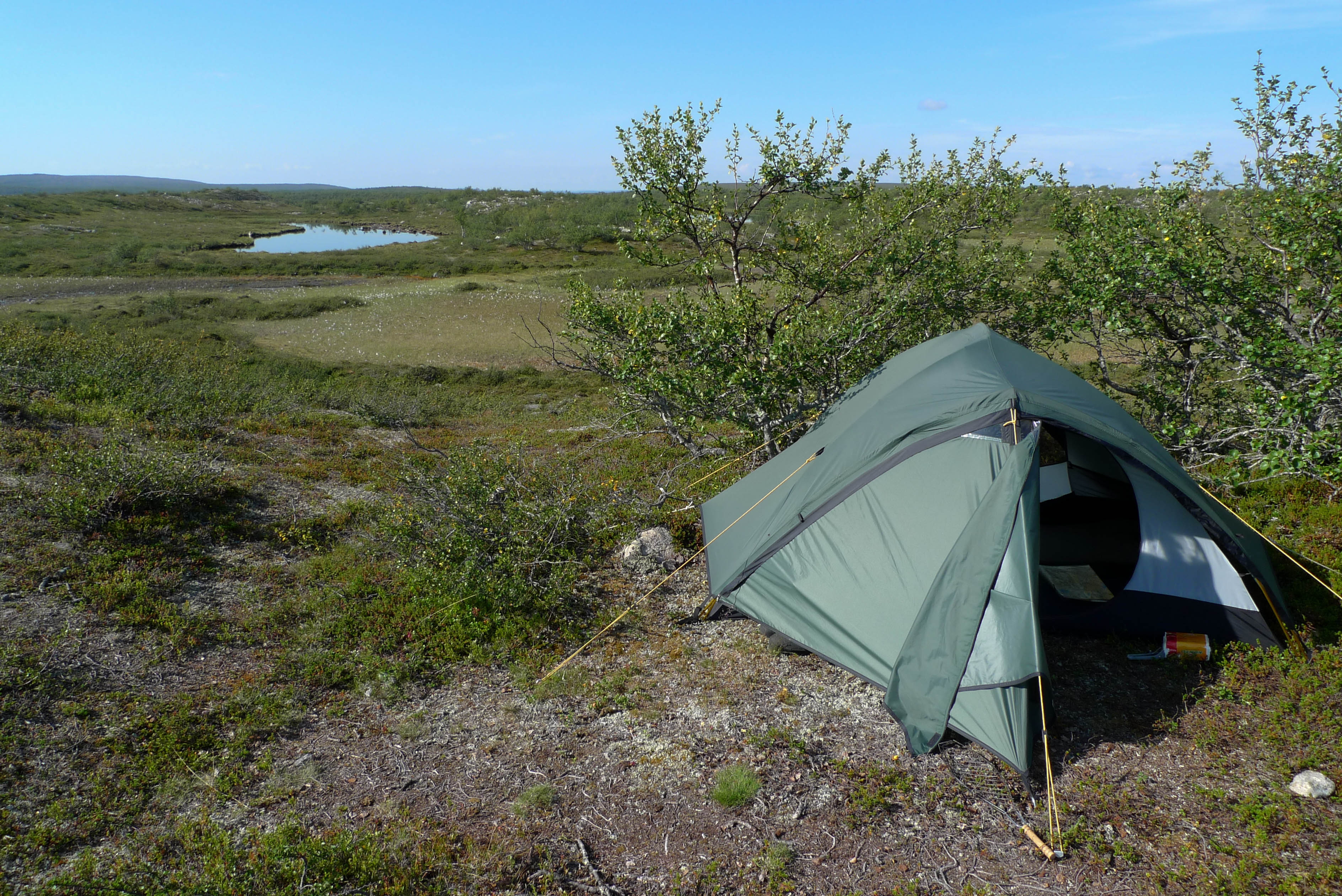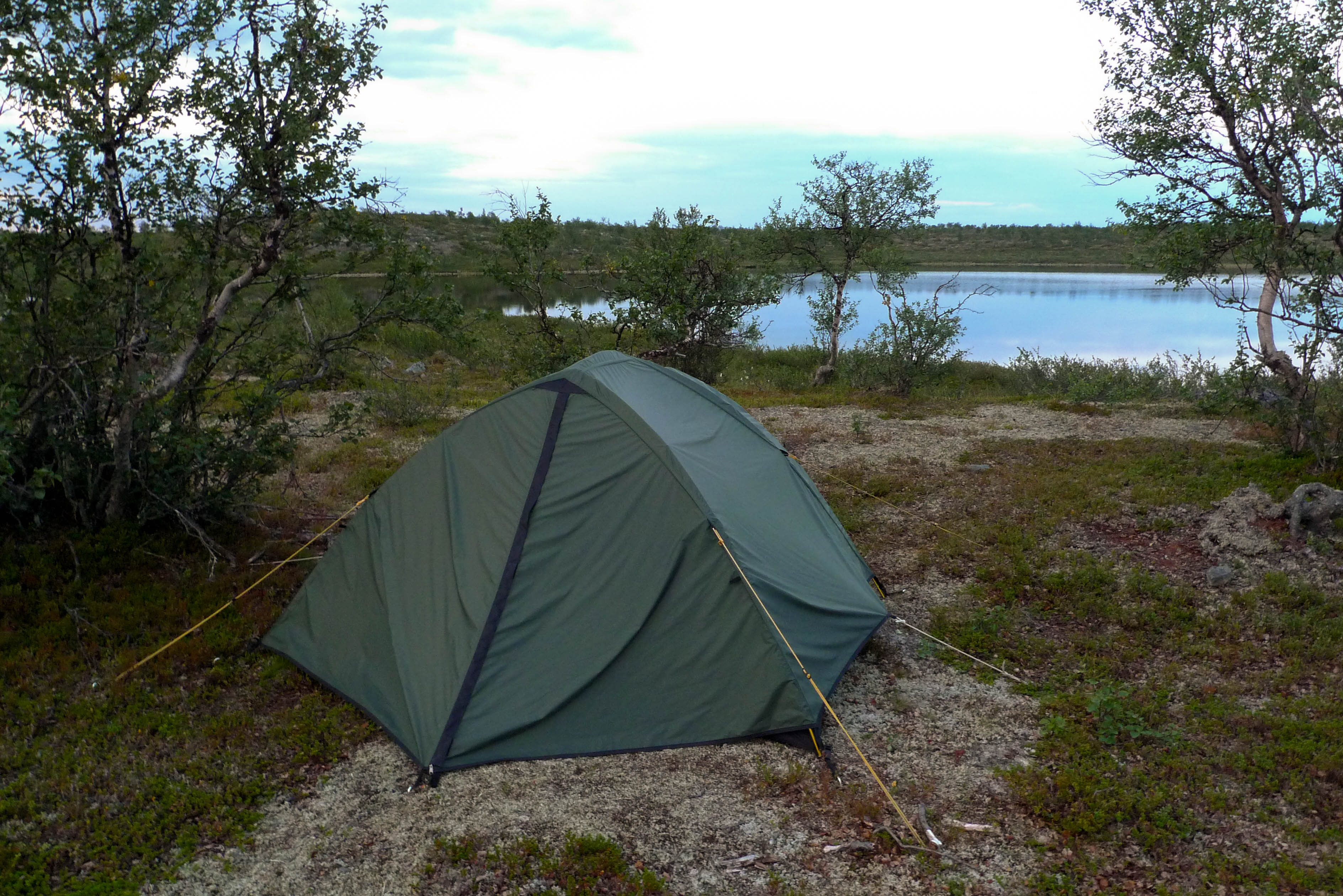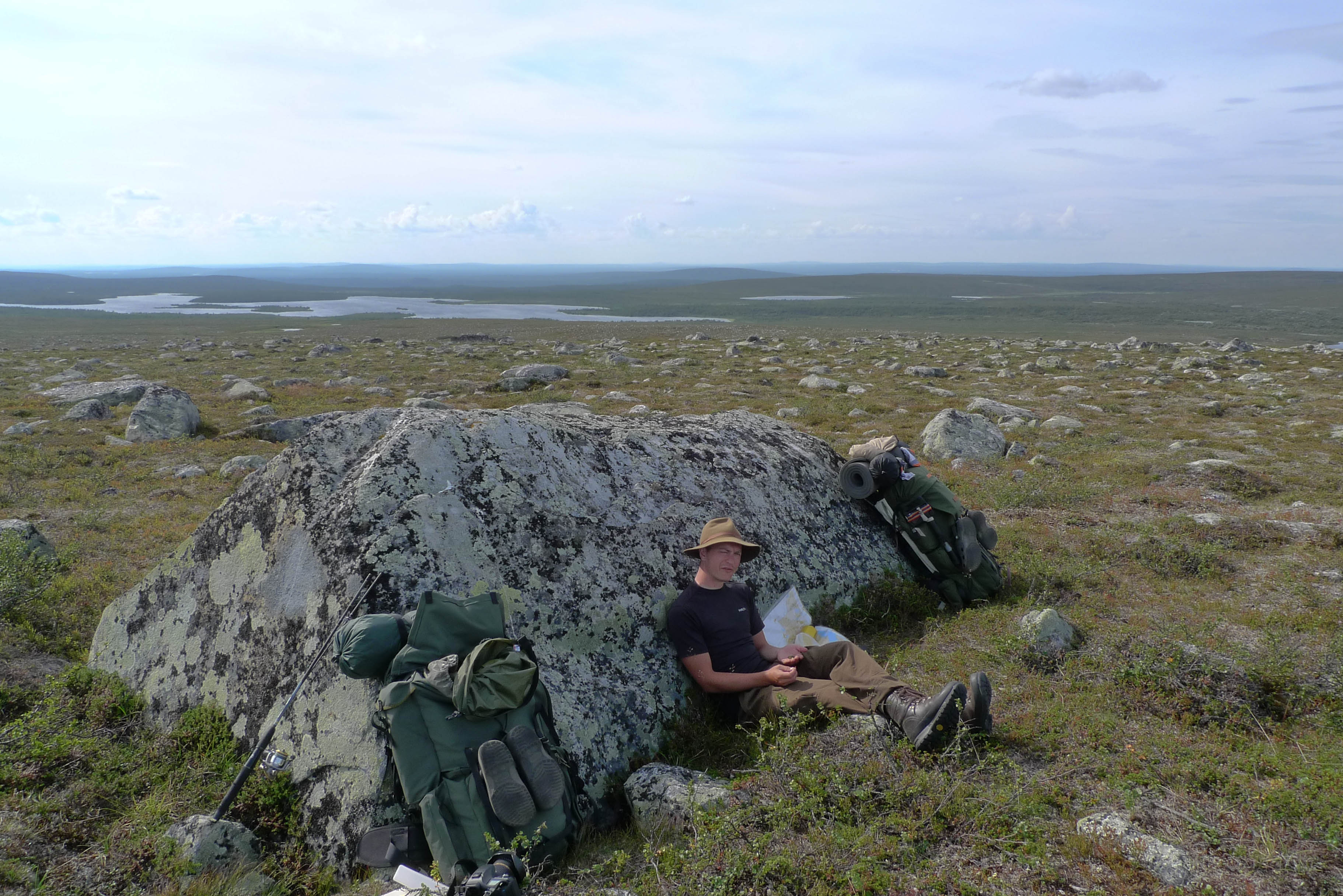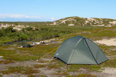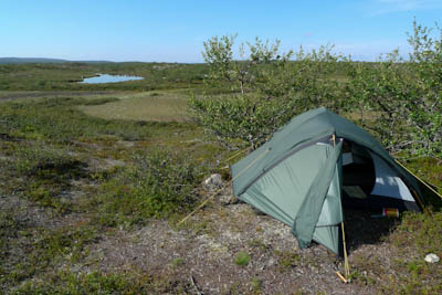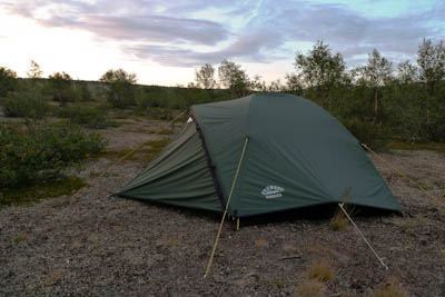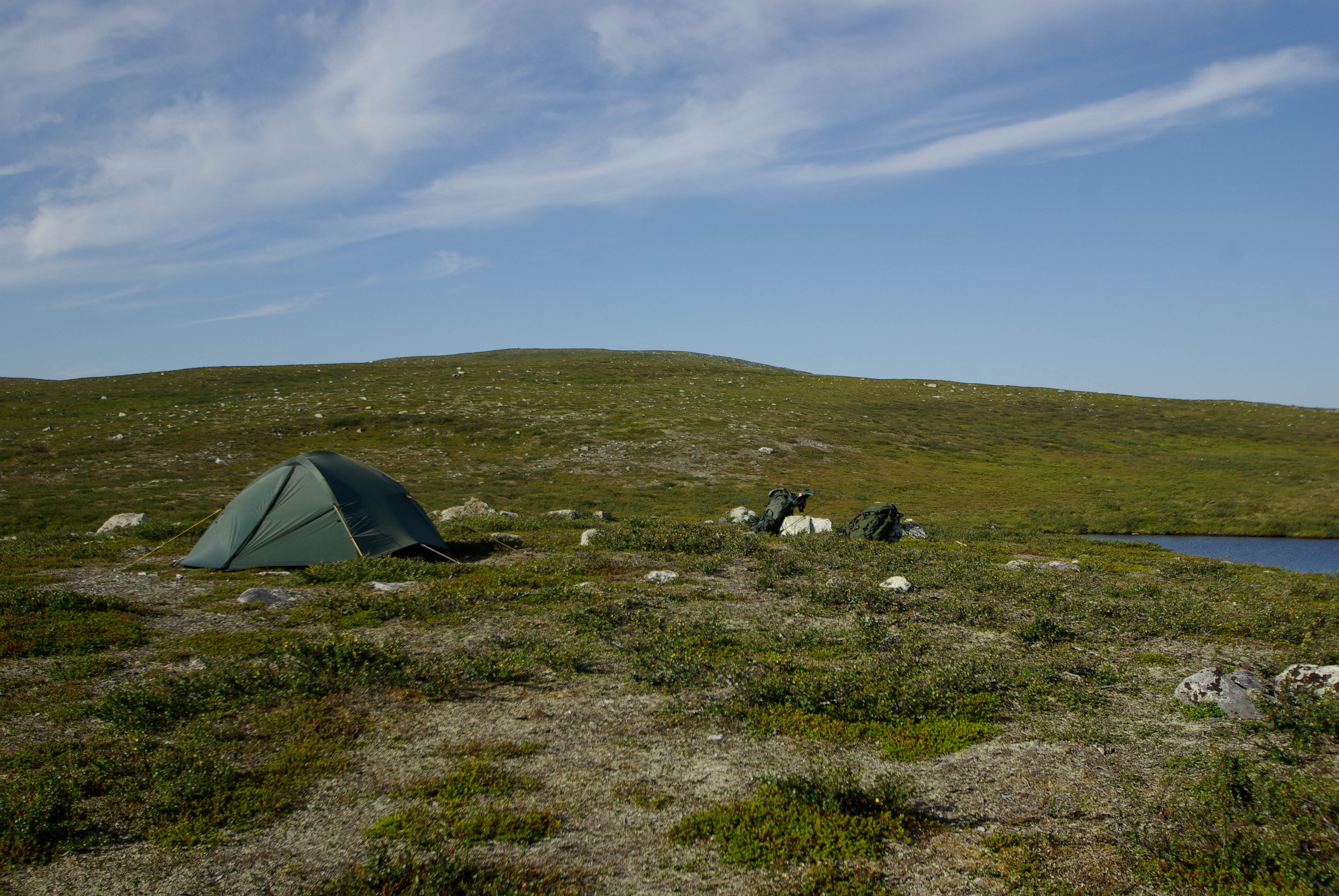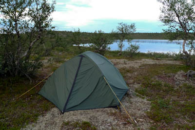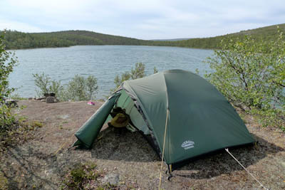 Päätämme lähteä etsimään leiripaikkaa Olkojärveen pohjoisesta työntyvältä niemekkeeltä. Jätämme rinkat vajaan kilometrin päähän rannasta siltä varalta, että joudumme jatkamaan etsintää muualta. Päätös osoittautuu hyväksi, sillä järven ranta on epämiellyttävän möykkyinen ja kivinen leiripaikaksi. Vesikin on ruskehtavaa ja ranta uhkuu suon läheisyyttä, jota emme kaipaa näissä oloissa. Kierrämme katsastamassa myös pari pienempää järveä Olkojärven pohjoispuolella. Ei sopivaa telttapaikkaa. Palaamme rinkoille ja koilliseen, jossa on pieniä järviä vähän kuhmuraisemmassa maastossa. Sieltä löytyykin sopiva kuiva kumpare, johon pystytämme leirin. Aluksi vähän tuulee ja itikat vaivaavat vain vähän.