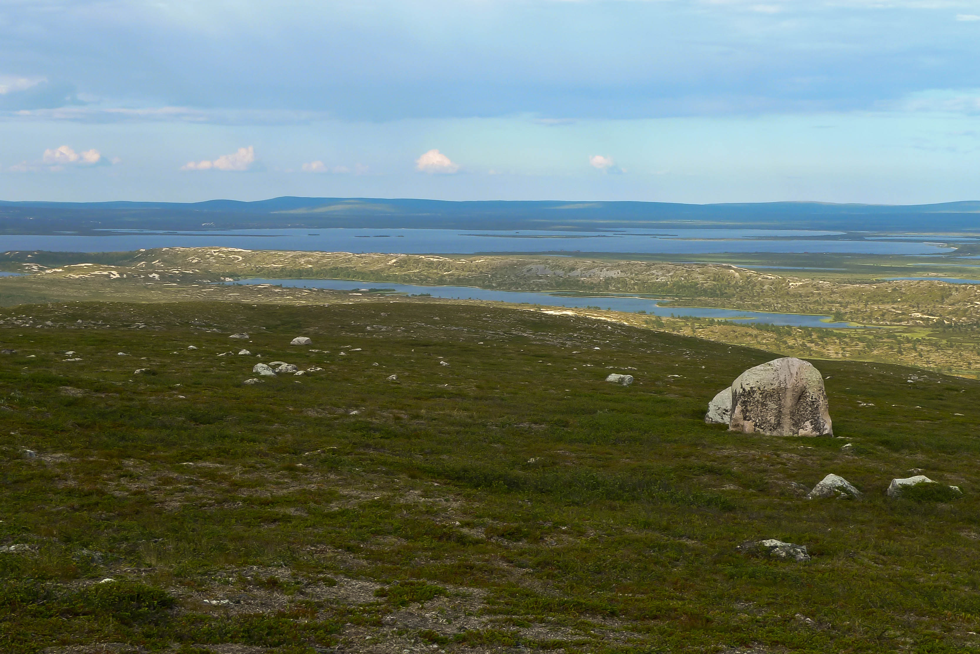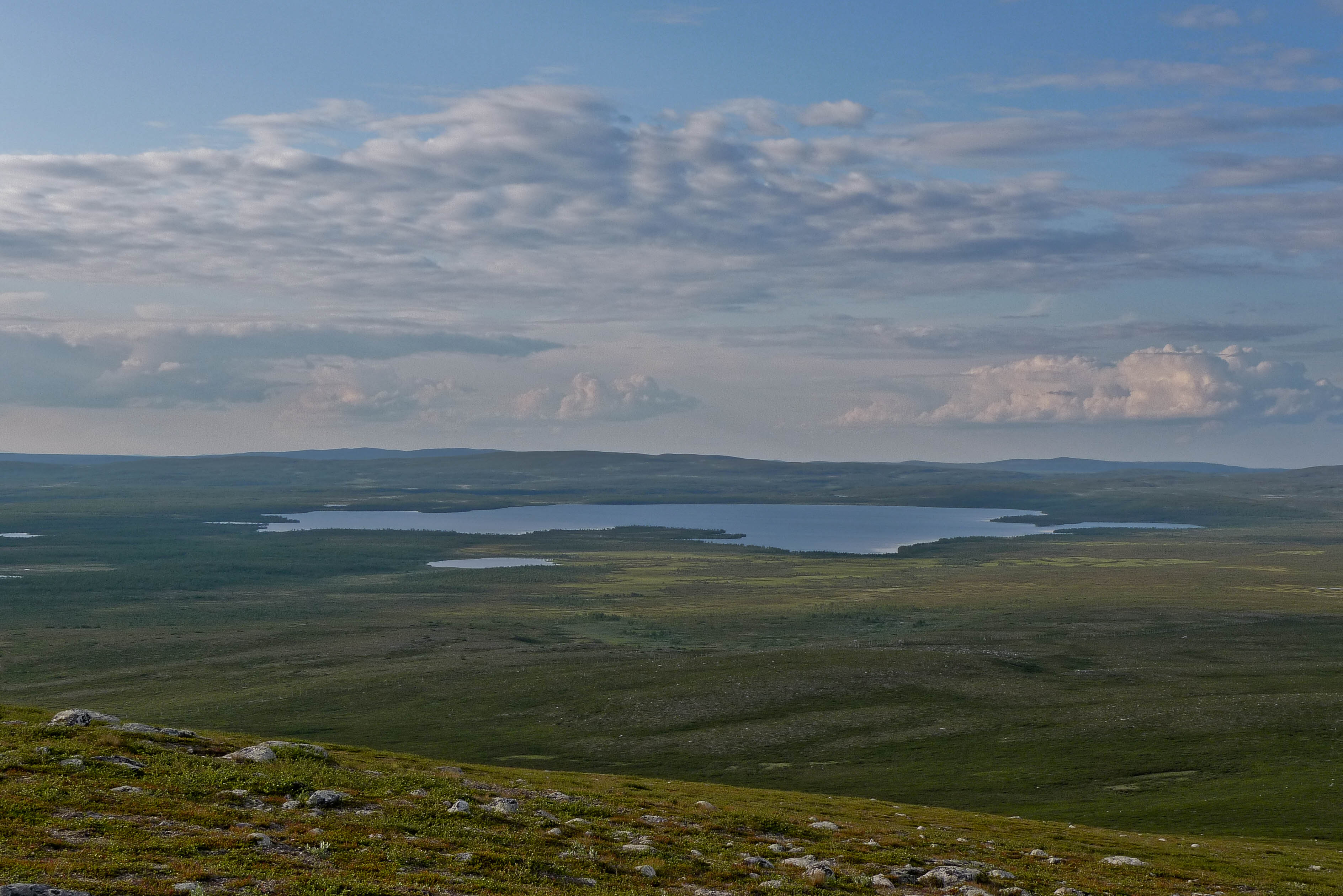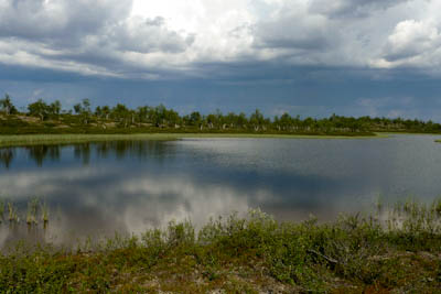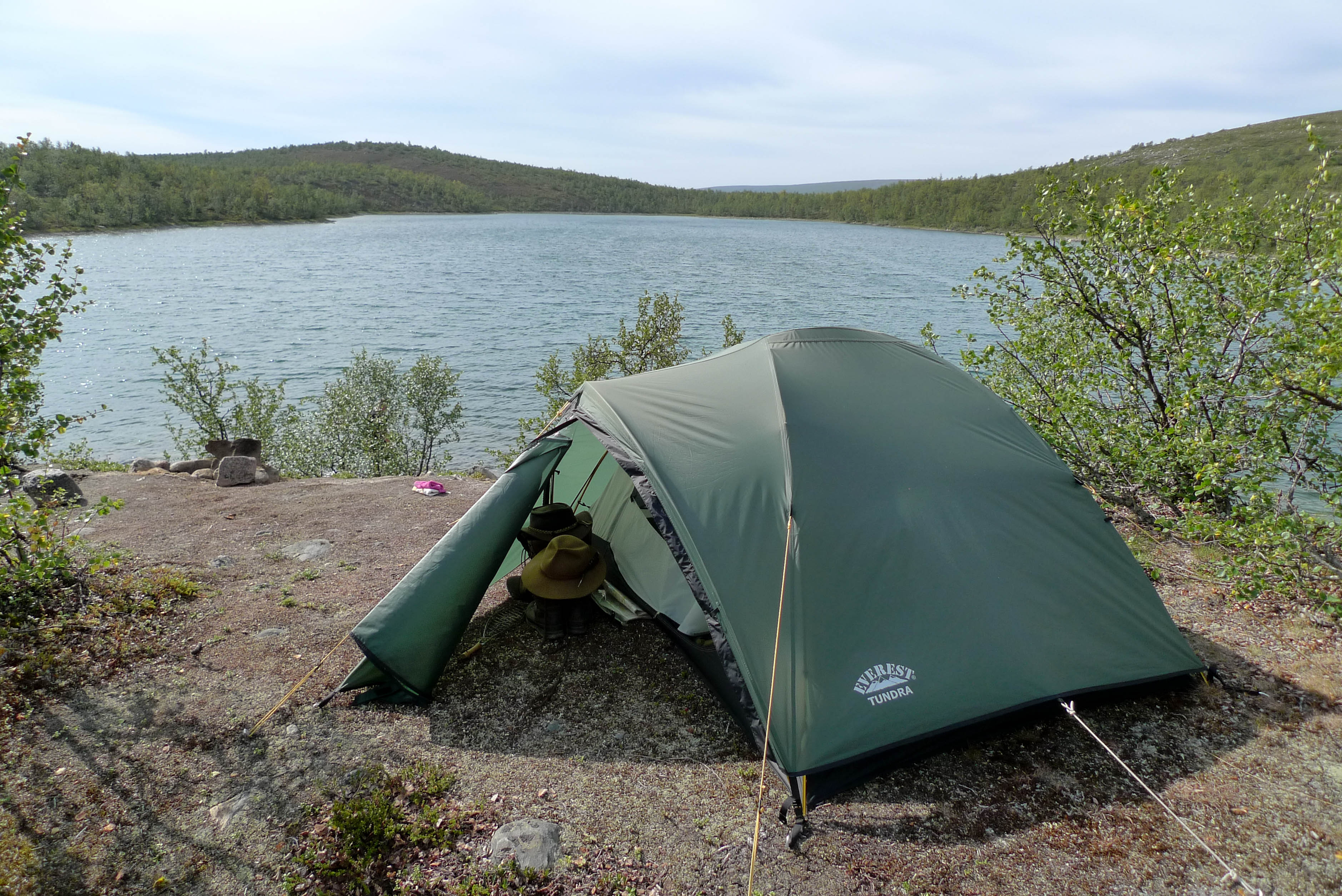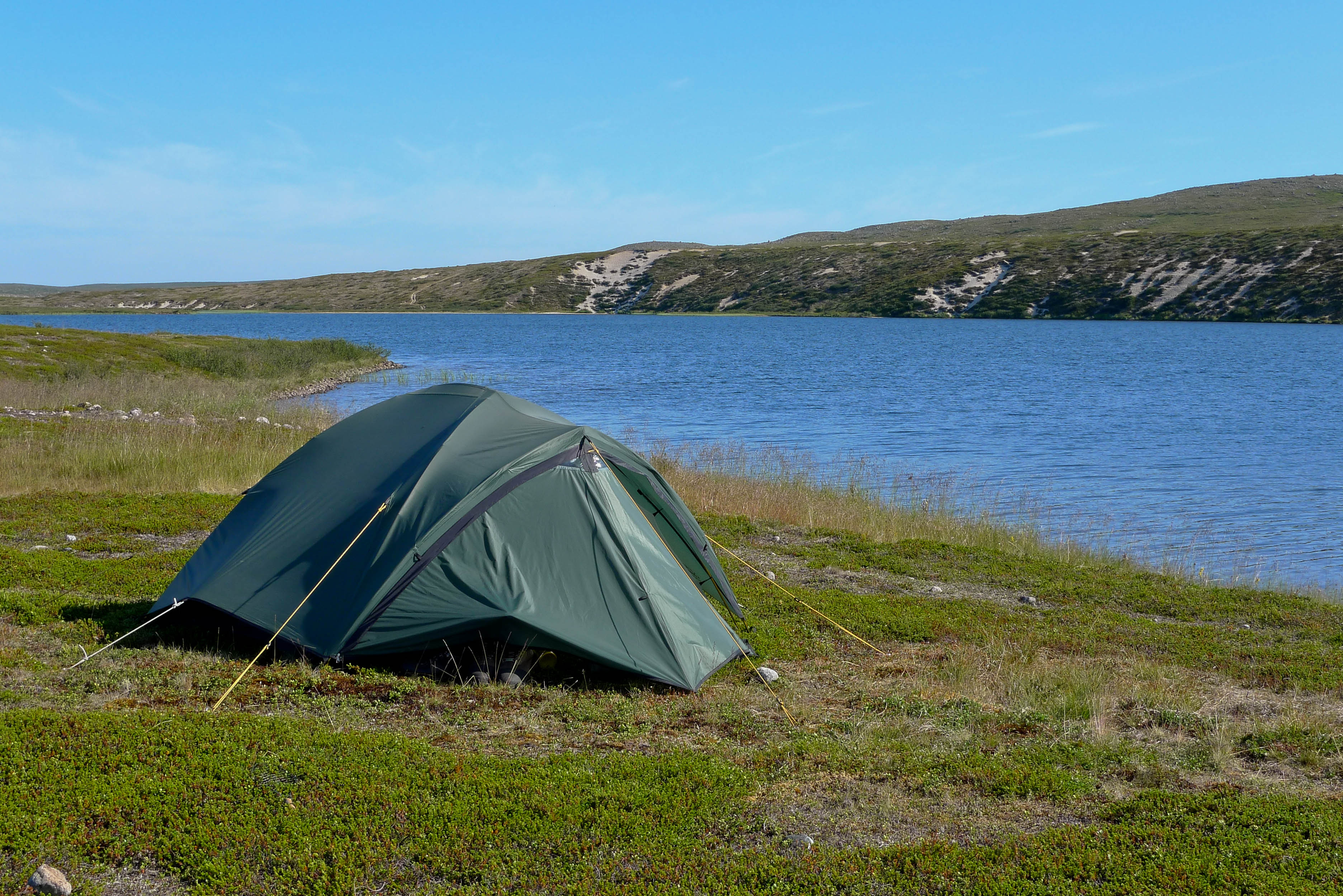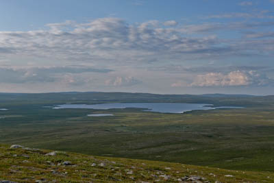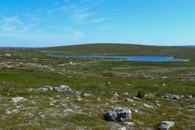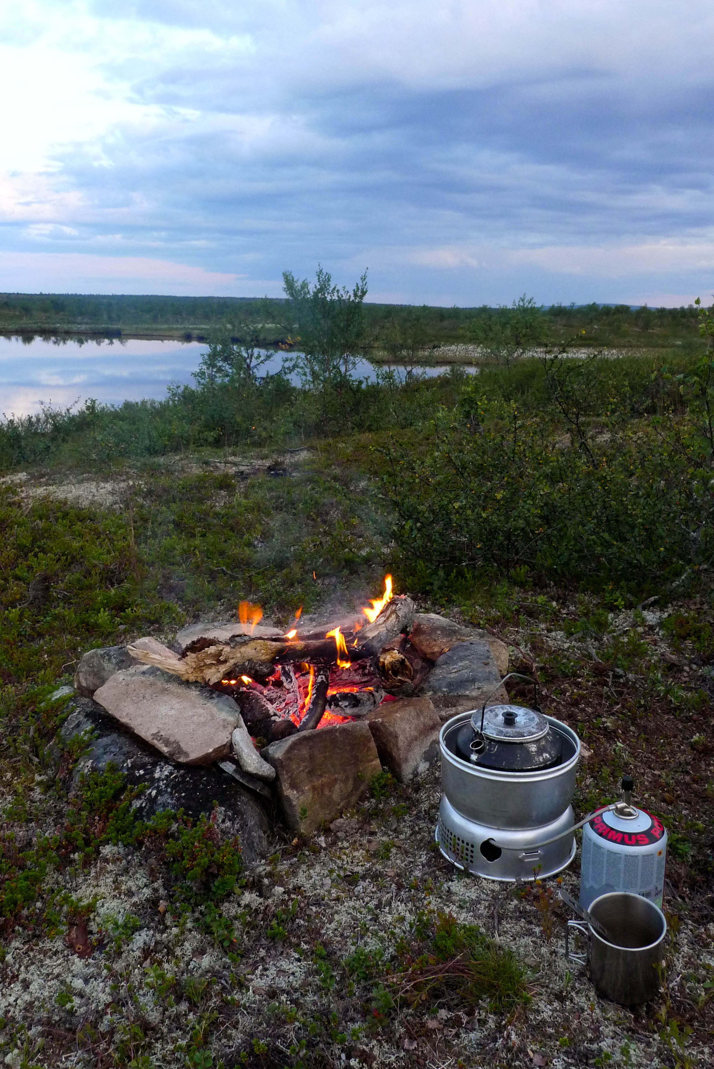 Päätämme lähteä etsimään leiripaikkaa Olkojärveen pohjoisesta työntyvältä niemekkeeltä. Jätämme rinkat vajaan kilometrin päähän rannasta siltä varalta, että joudumme jatkamaan etsintää muualta. Päätös osoittautuu hyväksi, sillä järven ranta on epämiellyttävän möykkyinen ja kivinen leiripaikaksi. Vesikin on ruskehtavaa ja ranta uhkuu suon läheisyyttä, jota emme kaipaa näissä oloissa. Kierrämme katsastamassa myös pari pienempää järveä Olkojärven pohjoispuolella. Ei sopivaa telttapaikkaa. Palaamme rinkoille ja koilliseen, jossa on pieniä järviä vähän kuhmuraisemmassa maastossa. Sieltä löytyykin sopiva kuiva kumpare, johon pystytämme leirin. Aluksi vähän tuulee ja itikat vaivaavat vain vähän.