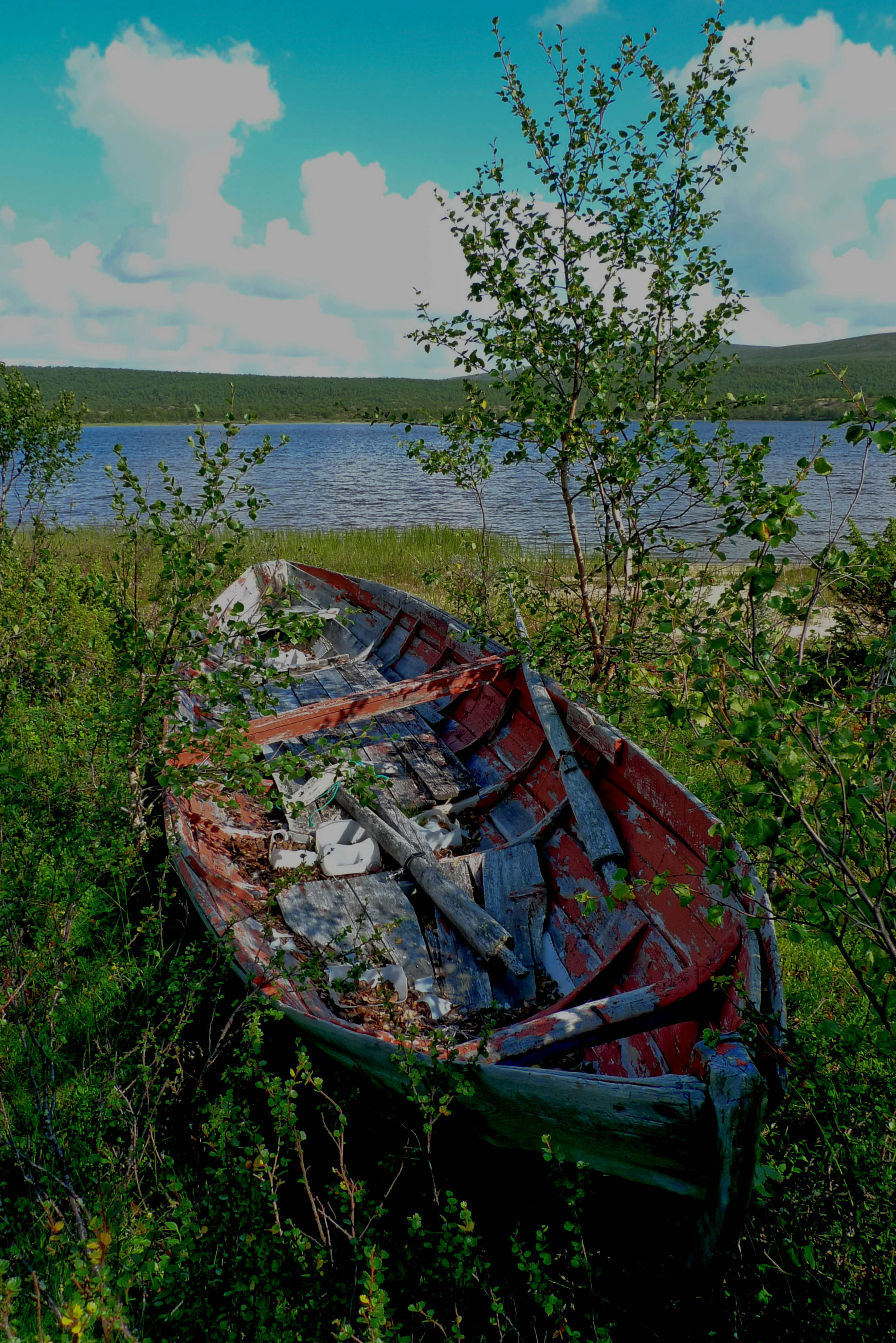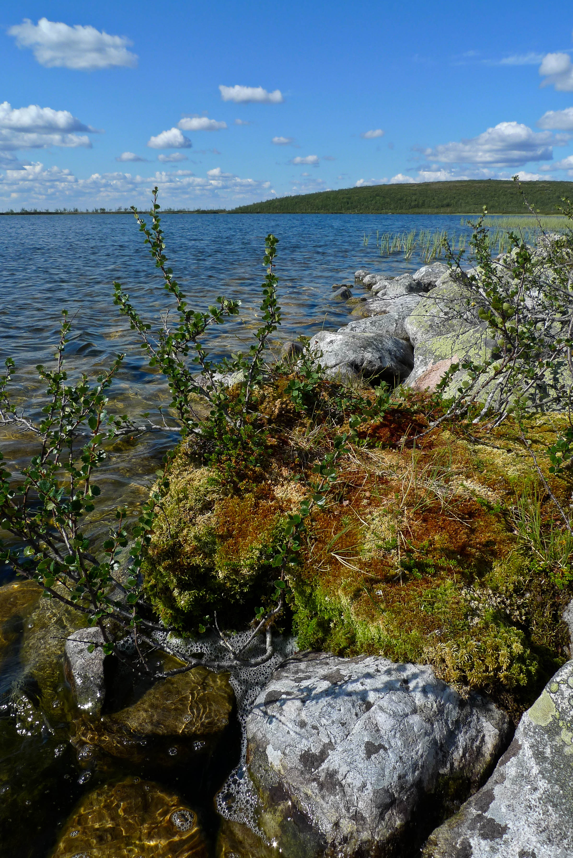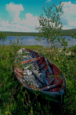 Aamupalaksi kaurapuuroa, vanikkaa ja kahvit. Juho lähtee hakemaan uistimia. Kierrän järven, perhostelen ja otan valokuvia. Järveen yhteydessä olevat purot ovat vaivaisia liruja, joissa ei kannata uittaa perhoa. Järvi saa vettä myös lähteistä. Eteläpuolella on lupaavan näköinen syvä suolämpäre, jossa heittelen perhoa. Ei edes jänkis ole syöntipäällä. Kalastelen myös länsipuolella olevalta hiekkasärkältä, tuloksetta. Särkän lähellä makaa rannalla vanha puupaatti, joka on parhaat päivänsä nähnyt. Pongaan myös yksinäisen komeasarvisen poron. Järven pohjoispuolella, lähellä Haukijoen alkua, näkyy hiekassa maastopyörän ja isohkot koiraeläimen jäljet. En jaksa tarkastella niitä sen enempää, lienee pyöräilijän koira. Haukijoen alku on syvää suouomaa, mutta järven puolelta pääsee yli kenkiä riisumatta. Siitäkään uomasta ei tule kalaa, vaikka lupaavan näköinen onkin. Kierrettyäni järven kiertelen vielä vähän kameran kanssa. Kun palaan leiriin, Juho onkin jo tullut aamulenkiltään.