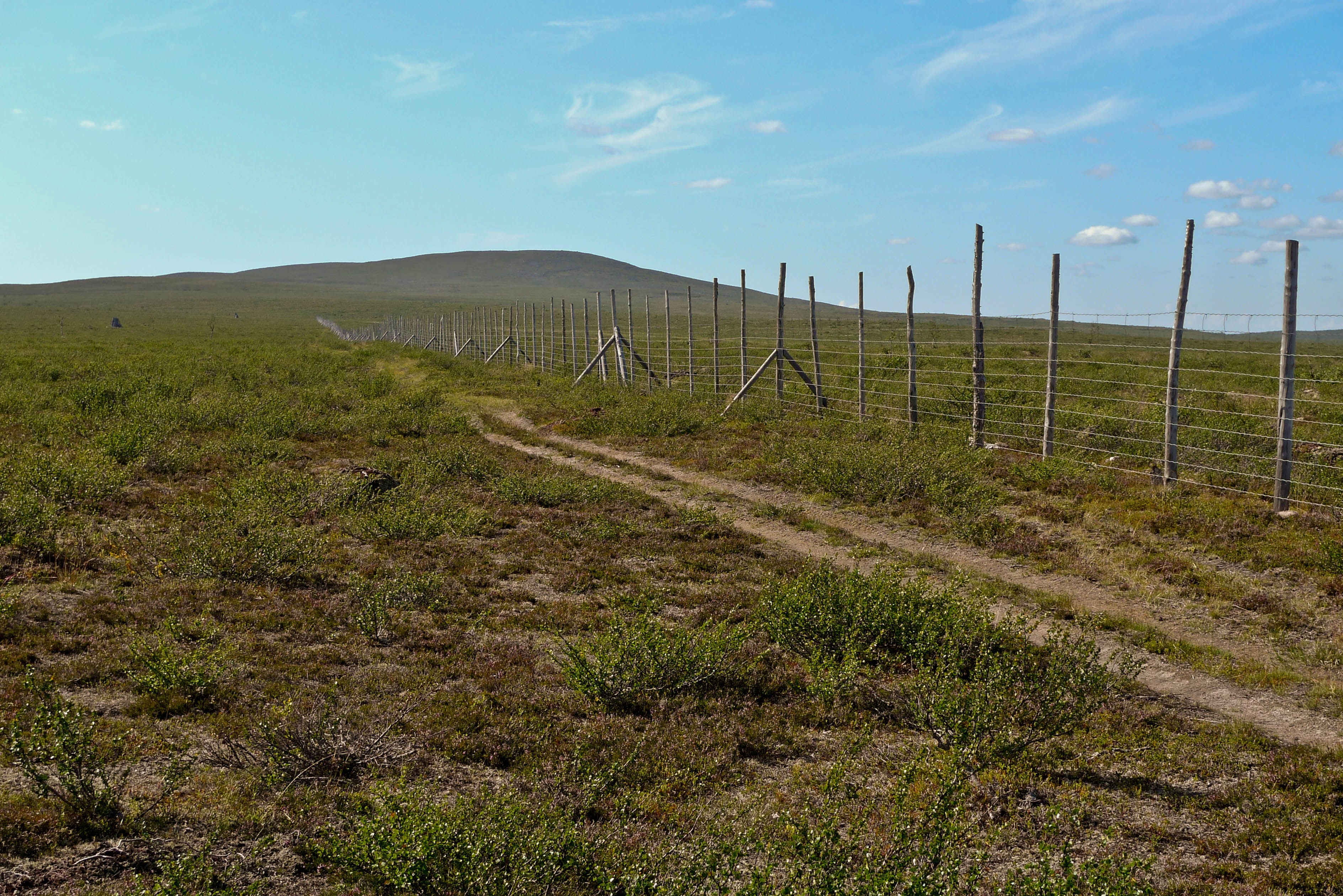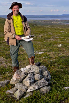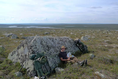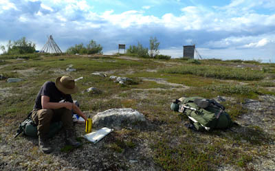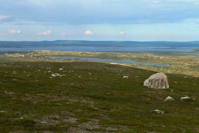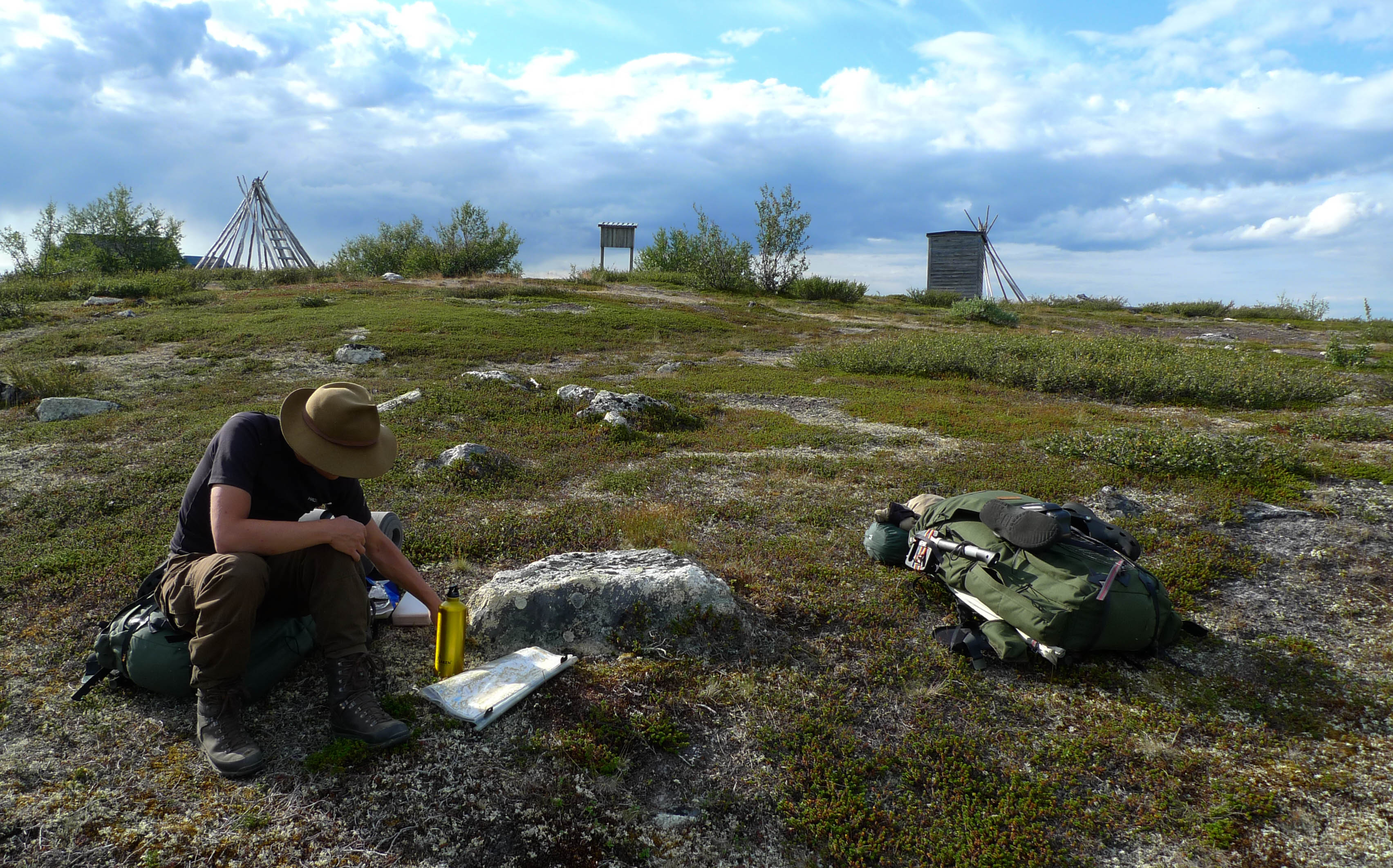 Vaellus alkaa lähestyä loppuaan. Vielä pitäisi keksiä joku mukava leiripaikka viimeiseksi yöksi muutaman kilometrin päässä Näkkälästä. Nousemme tukevaa mönkijänuraa pitkin Ainuppivaaralle ja katsastelemme ympäristöä. Kokeilemme myös kännyköitä - ei kenttää. Jatkamme satulasta Olkovaaralle. Matalamman huipun lähellä on iso kivi, jonka kupeeseen istahdamme nauttimaan vähän kuivaa purtavaa. Teleanorin linkki jossain Norjan puolella antaa yhden tolpan DNA:lle. Saan yhteyden kotiin ja Samuli Näkkälään. Saunamökki järjestyy paluupäiväksi ja yön yli.
