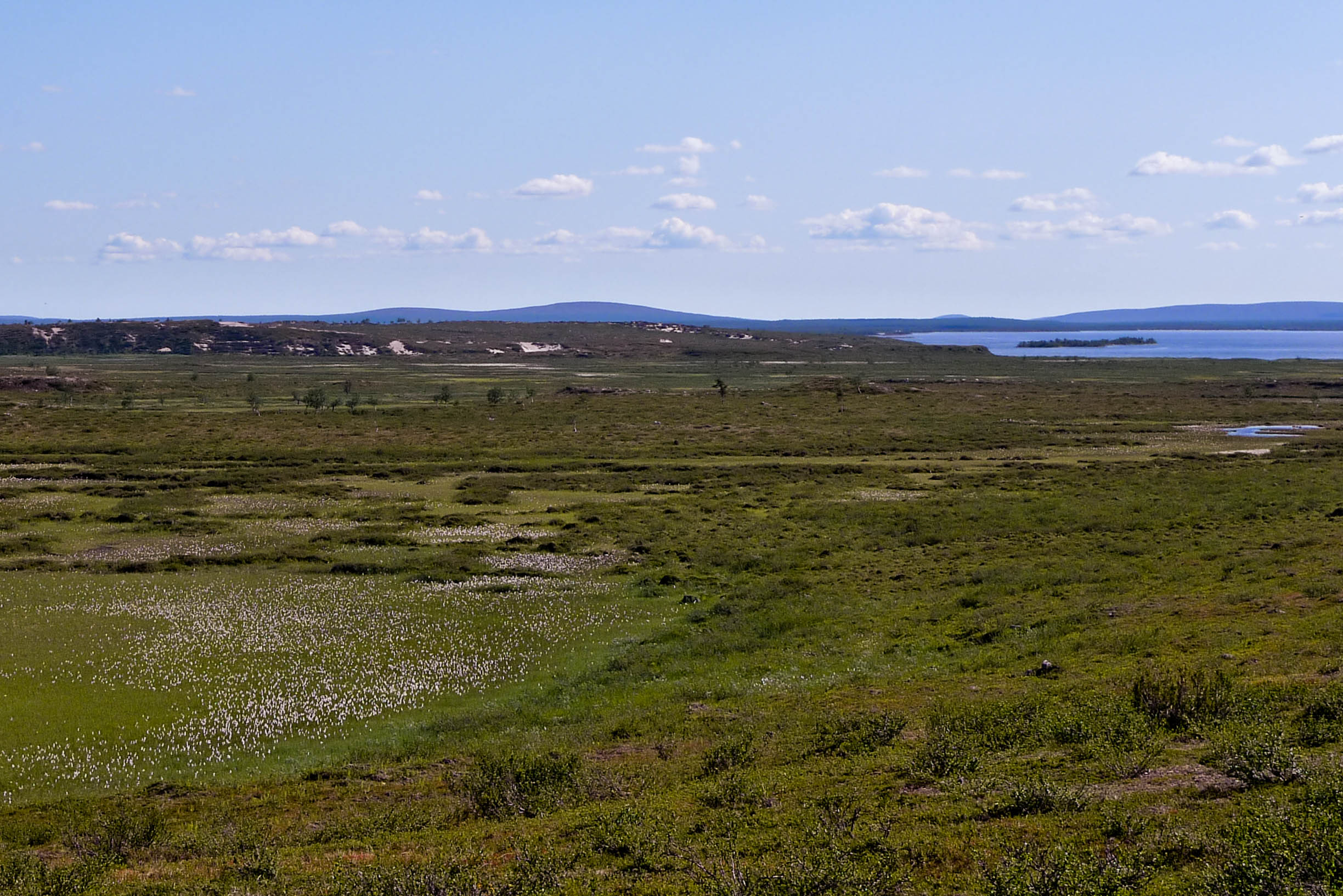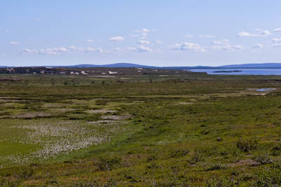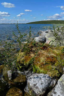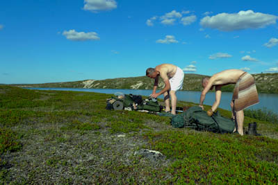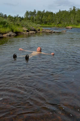 Ensimmäinen haaste on joen ylitys. Saaren edusta näytti parhaalta paikalta. Teemme varmuuden vuoksi pari kolmatta tukipistettä ja lähdemme kahlaamaan crocsit jalassa. Ylitys sujuu helposti. Vesi yltää enimmillään polveen asti. Kun rinkat on saatu vastarannalle, on aika virkistäytyä. Kellimme aika tovin virtaavassa vedessä. Viileässä vedessä itikoiden saavuttamattomissa olo on taivaallinen. Kaikkea aikansa ja sitten taas matkaan märkä paita päällä. Otamme suunnan kohti pitkäniemeä Vuomajärvien välissä. Hieman ennen lukittua kämppää yhytämme melko leveän puron, josta pääsee yli kuivin jaloin vain Ison Vuomajärven rannan tuntumasta. Puroa ei näy kartassa. Pienen Vuomajärven pinta näyttää olevan hieman korkeammalla. Purossa puikkelehtii n. 10 sentin mittaisia tammukoita. Ilma on niin lämmin, että emme viitsi kalastella matkan varrella. Istuskelemme hetken järven rannalla ja jatkamme matkaa kohti Ainuppivaaraa. Matkalla on tarkoitus tehdä sapuskat Mahkuvaaran satulassa olevan lammen rannalla. Järvi ei ole kauhean matala, mutta vesi näyttää samealta. Epäilemme porojen sekoittaneen veden. Matka jatkuu kohti Lompoloa. Siinä vasta hieno järvi. Vesi on kristallinkirkasta eikä suota missään nurkassa. Nautimme tukevan illallisen itärannalla. Nauttimisesta voi puhua, koska tuulenvire järveltä rajoittaa hieman itikoiden toimintaa. Lähdemme etsimään leiripaikkaa Ainuppijärven rannalta. Ranta osoittautuu kuitenkin möykkyiseksi ja itikoita on paljon enemmän. Palaamme Lompolon pohjoisrannalle, josta löytyy parikin hyvää leiripaikkaa kuivien hiekkatöyräiden päältä. Vanhasta nuotionpohjasta paljastuu useita tuubin jäännöksiä. Lienevätkö sisältäneet kallen mätitahnaa vai jotain syöttitahnaa. Hiekkatöyräältä on hyvät näkymät yli koko järven. Tarkkailemme sitä koko illan, mutta sormen kokoiset lohikalan poikaset siellä vain tuikkivat. Kai siellä pitäisi emokalojakin olla, kun järvi on täysin eristetty muista vesistöistä. Rannalta heitetty lippa ei niitä kuitenkaan kiinnosta. Tyydymme paistamaan lettuja illanistujaisiksi. Ilta on viihtyisä ja valvomme melko myöhään.