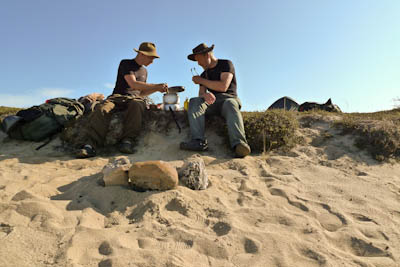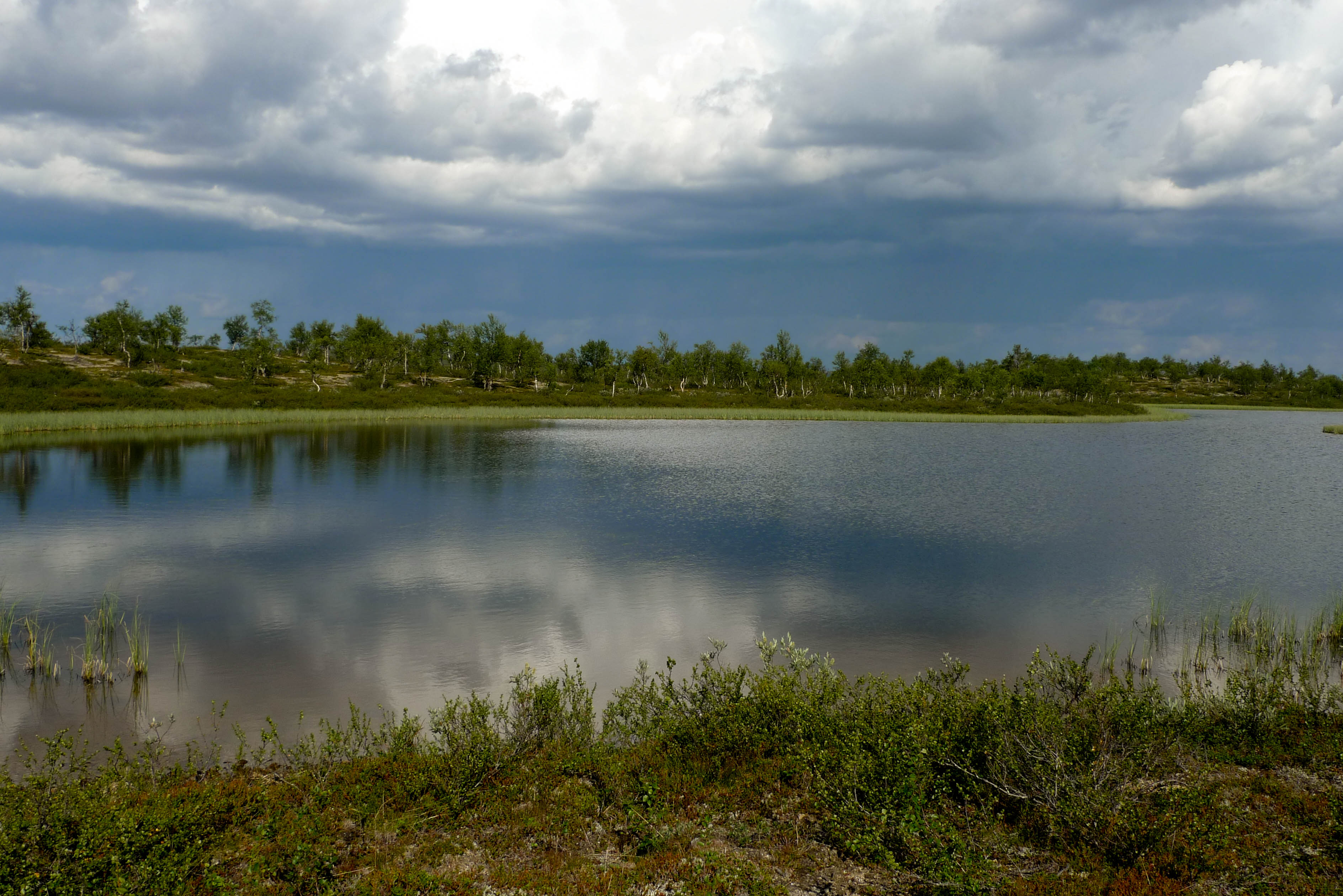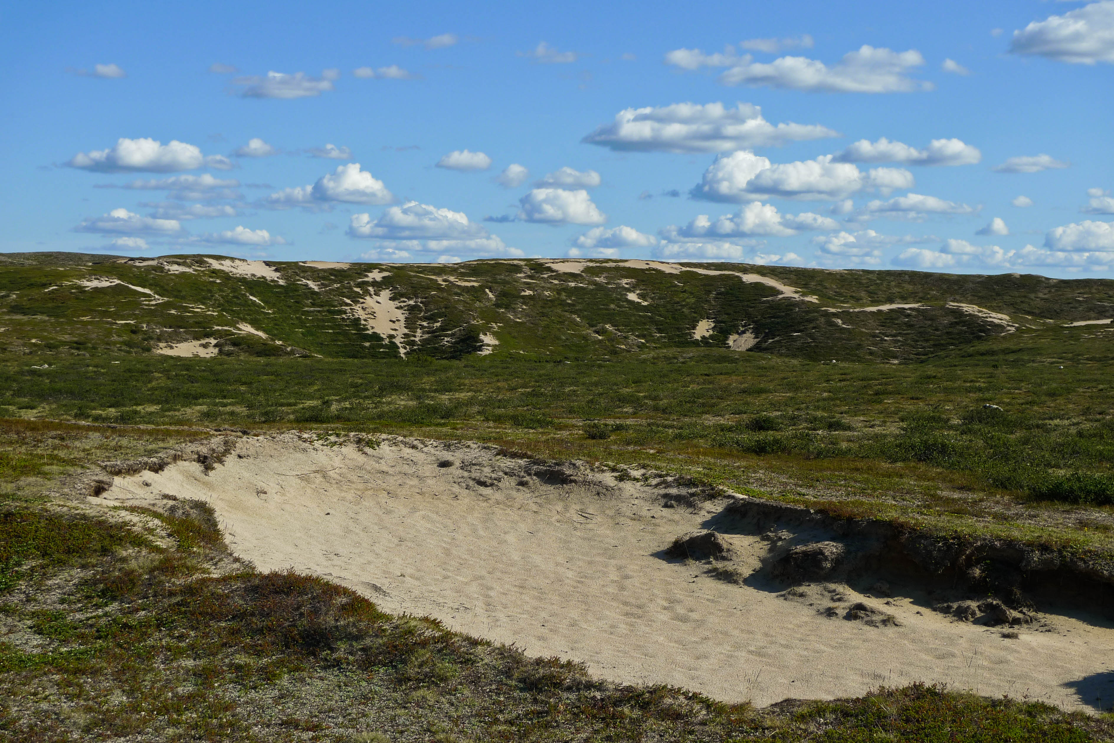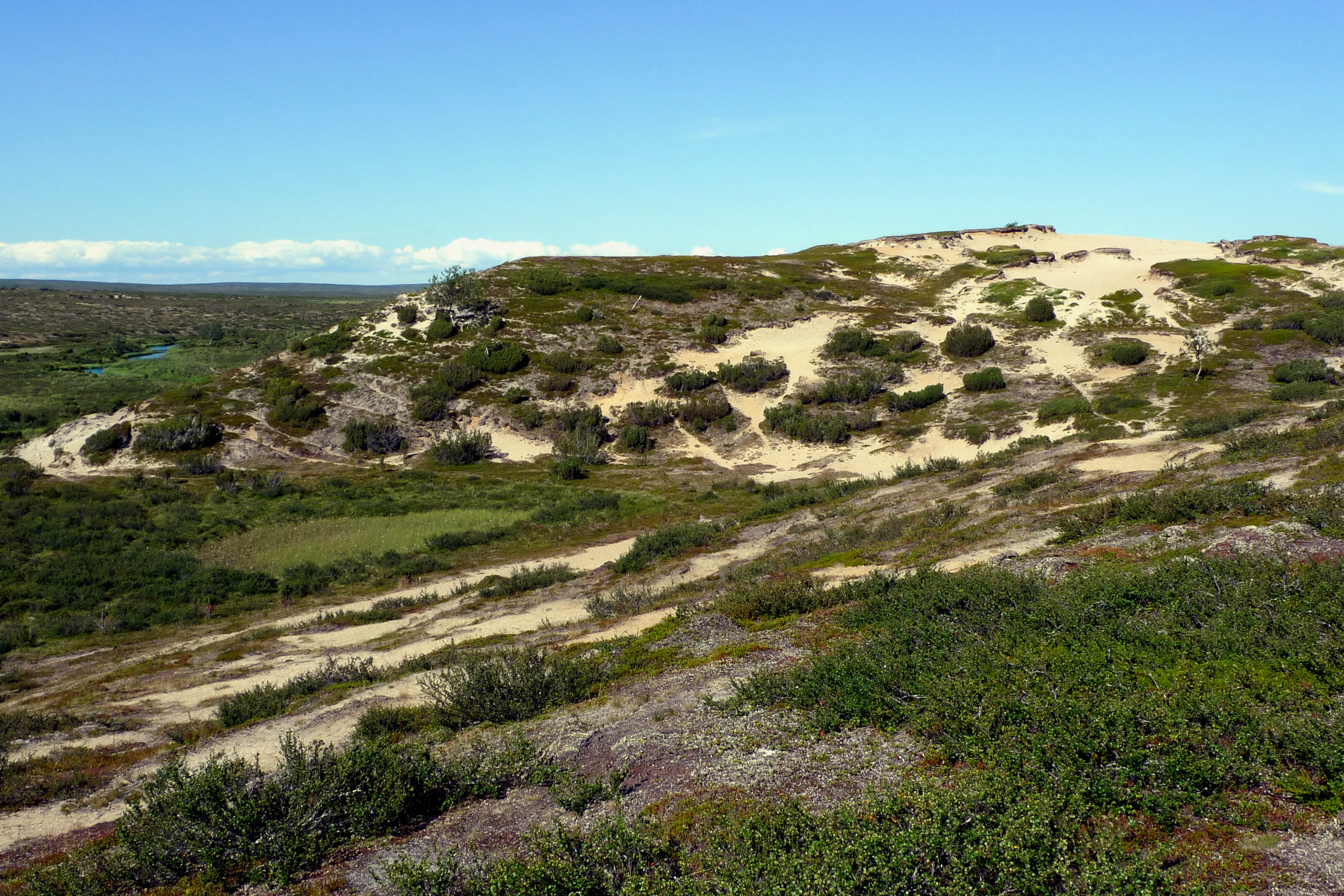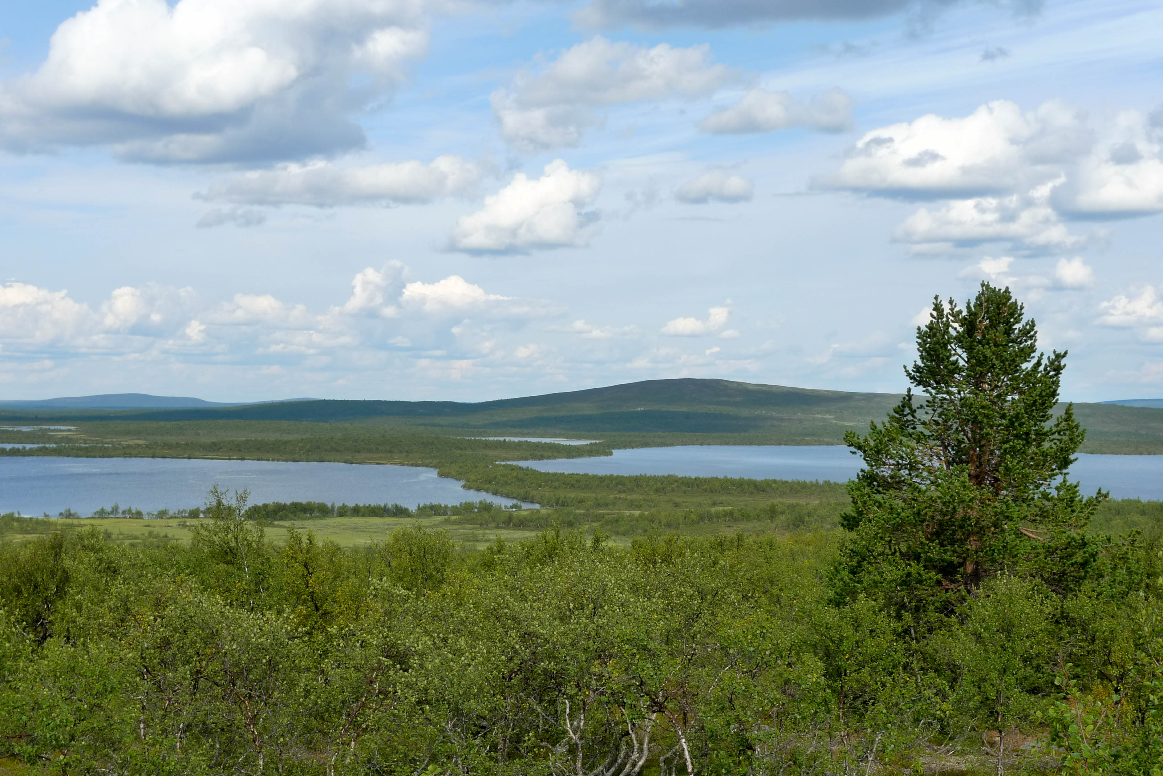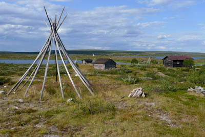 Heräämme totuttuun tapaan helteiseen ja tyyneen aamuun. Tarkoituksena on katsastaa vanha lapinkylä ja jatkaa siitä hieman etelään Kalkuojan varteen. Kun leiri on purettu aurinko paahtaa jo armottamasti pilvettömältä taivaalta. Päätämme järjestää lähtömme kunniaksi pienen mistermärkäteepaitakisan. Joesta löytyy sopiva paikka, jossa on puhdas hiekkapohja ja vettä vyötäisiin. Siellä on niin mukava kelliä, että ei haluaisi tulla ollenkaan ylös. Lopulta kuitenkin lähdemme liikkeelle märissä paidoissamme. Kuljemme joen itäpuolta kunnes yhytämme lapinkylään johtavan mönkijänuran. Joen varressa on teltta ja muutama ihminen. Kohtaamme vielä yhden katajaa kasvavan hiekkadyynin ja pidämme pienen tauon hiekkatörmän varjossa. Matka jatkuu autiomaisissa tunnelmissa Juhanijoelle, jossa taas pidämme tauon ja täytämme vesipullon. Seuraava pysähdys on Niemijärvellä, jossa käymme uimassa ja teemme tukevat sapuskat. Ruokailun aikana pilvilautta lähestyy pohjoisesta ja voimakkaat tuulenpuuskat rikkovat järven pinnan. Koemme jopa pientä sateen uhkaa. Matkalla kohti lapinkylää saamme niskaamme vähän kevyttä sadetta mutta lämmintä piisaa. Ylittäessämme Kalkujärven ja Kalkulompolon välistä puroa havaitsemme jotain liikettä vedessä. Lähempi tarkastelu paljastaa pienen jänkiksen. Emme viitsi koota kalavehkeitä. Istuskelemme jonkin aikaa lapinkylän laitamilla ja otamme muutaman kuvan. Mitään liikettä ei näy eikä mönkijöitä pihoissa. Jatkamme etelälounaaseen johtavaa mönkijänuraa pitkin. Nousemme 447,3 metrin korkeudella olevan nimettömän järven koillispuolella olevalle kukkulalle tarkastelemaan edessä olevaa maastoa. Järven ja joen välissä oleva laakea kumpare näyttää sopivalta leiripaikalta. Kumpareelta löytyykin vanha nuotiopaikka ja sopiva teltanpaikka. Pystytämme teltan ja keitämme kahvia. Itikat edelleen kiusanamme, mutta järveltä tuulee sen verran, että nauttiminen onnistuu ulkoilmassa.