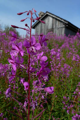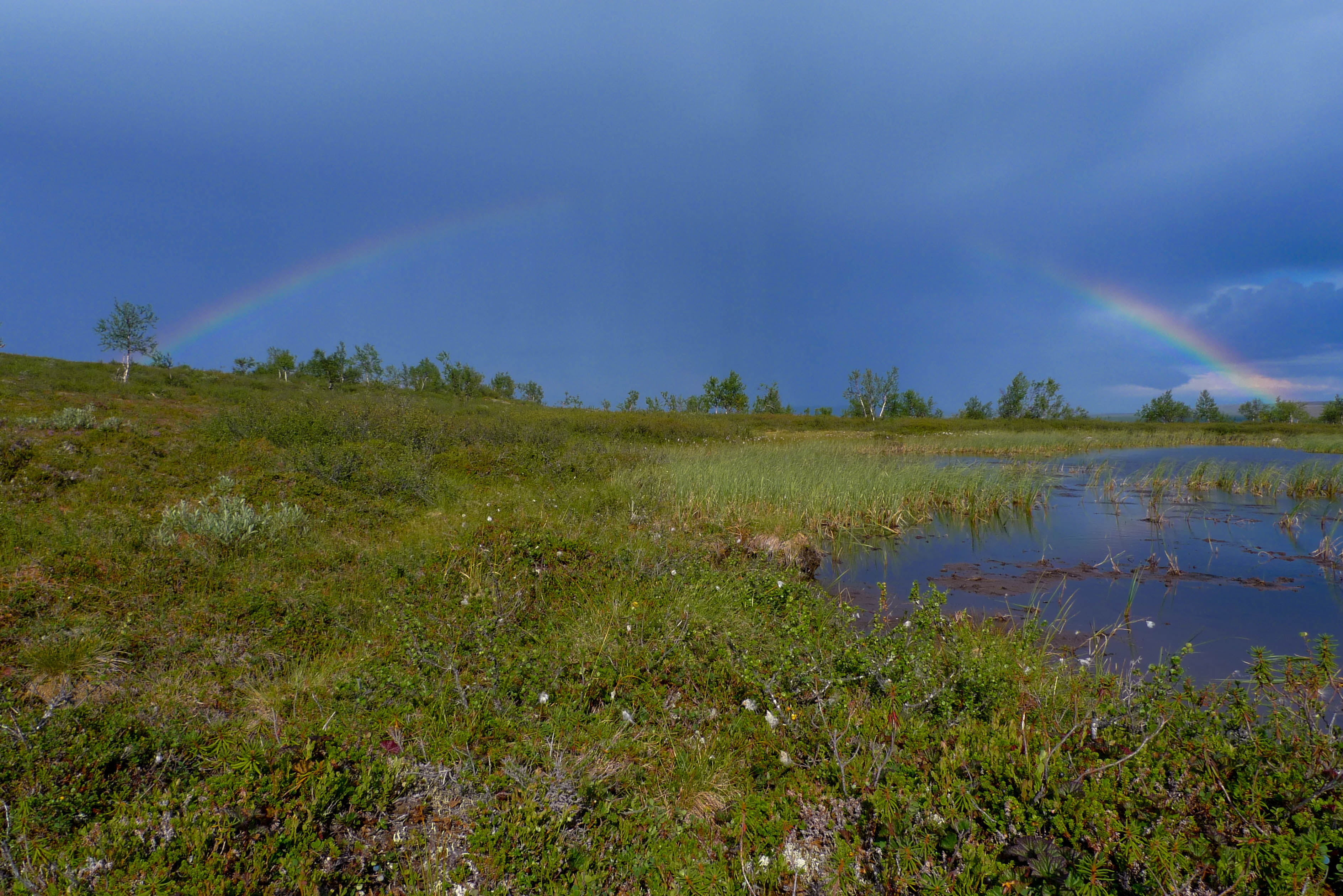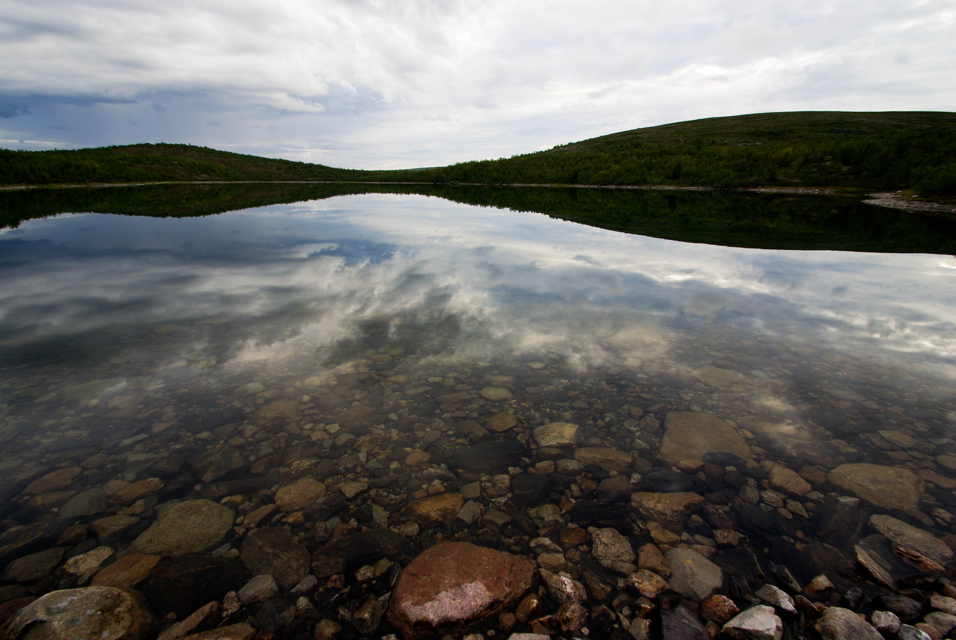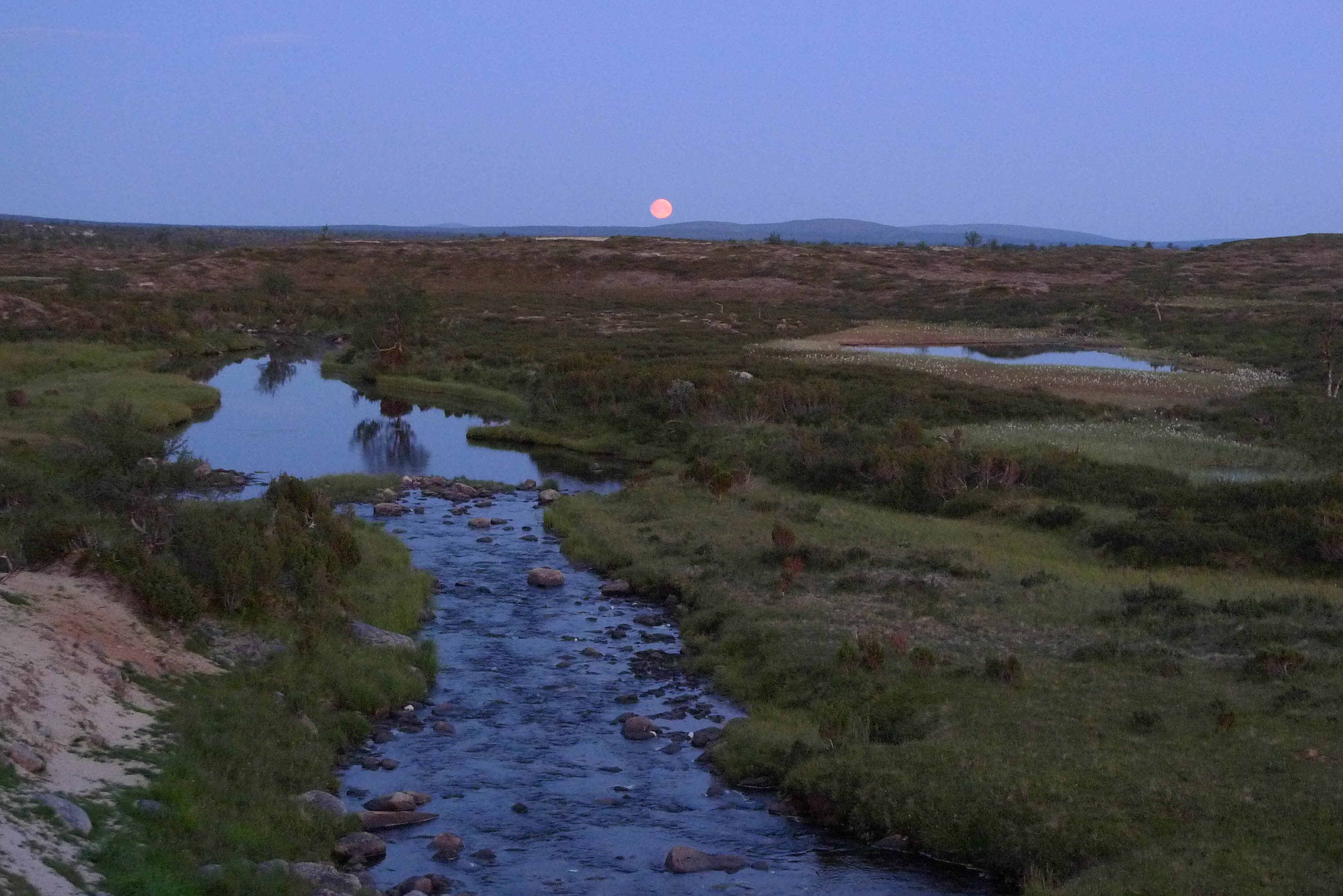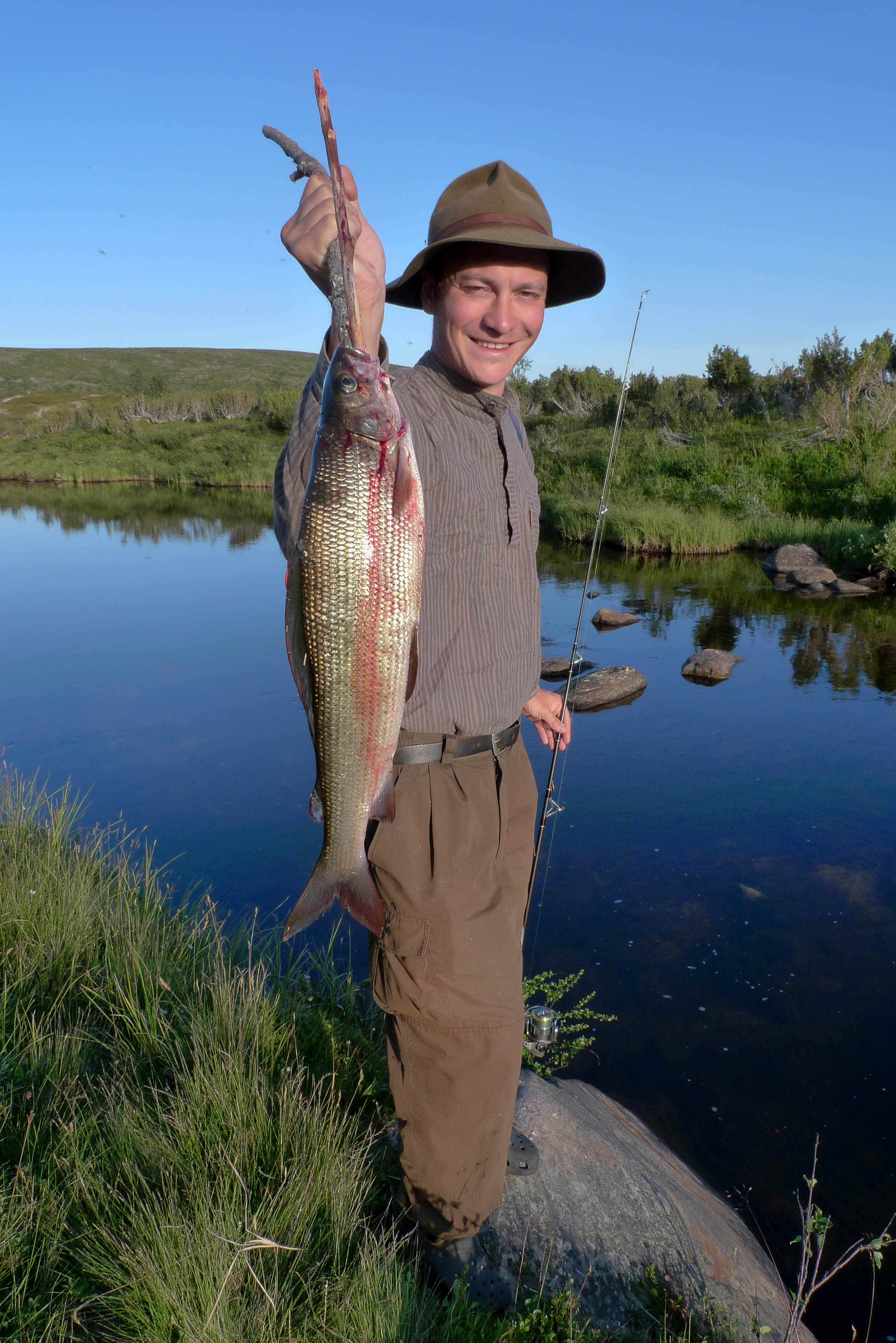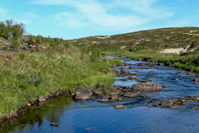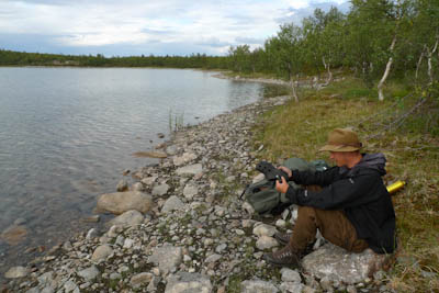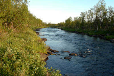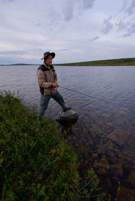 Kokoamme kalavehkeet ja aloitamme järvestä. Kun vielä kokoan perhovehkeitä on jänkis napannut lippaan, katkaissut siiman, mutta pudottanut lipan rantaveteen. Juho kahlaa lipan talteen. Hetken kuluttua samassa paikassa tuntuu perhovavassa voimakas nykäisy ja räikkä ulvoo. Olen varma, että kyseessä on jalokala, vaan mitä vielä puolitoistakiloinen jänkishän se siellä. Perho on aivan suupielessä ja saan kalan rantaan. Emme kuitenkaan rupea jänkiksen laittoon, vaan suuntaamme joelle. Tulemme kohtaan, jossa Galggoluobbalat muuttuu joeksi. Syvä ruskeavetinen suvanto ei houkuttele kalastamaan, koska jänkistähän sieltä vain. Lähdemme alavirtaan. Joki on vähävetinen ja eteneminen sujuu parhaiten keskellä kiveltä kivelle. Molemmat saavat pienen harrin, luultavasti saman, joka vapautetaan kerta toisensa jälkeen. Kivikkojen välissä olevat suvannot näyttävät kalaisita, mutta tyhjä jää käteen. Miten voi olla, että tuollaisista paikoista ei tule kalaa? Itikat kiusaavat siinä määrin, että jaksamme kalastella vain kilometrin verran. Paluumatka rämmitään pajukossa/suossa hieman kauempana uomasta. Istumme vielä tovin nuotiolla ja painumme pehkuihin.