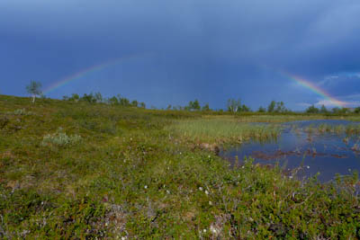 Aamu valkenee helteisenä ja tyynenä. Raskailta puhteilta tuntuvat jopa leirin dokumentointi ja sovittu Pekan uuden karhean rinkan ikuistus autenttisessa ympäristössä. Tarkoituksena on puikkelehtia soiden välistä Maaterlompololle. Matkaamme ensin poroaidan vieressä olevaa mönkijäuraa pitkin Rajavaaran lounaislaidassa olevelle pikkujärvelle. Järvi on hieno ja kirkasvetinen. Kalaa ei tule. Tosin odotuksetkaan ole kovin korkealla kirkkaassa päivänpaisteessa. Hilla alkaa kypsyä. Norjan puolella olevalla Lukkoaivilla näkyy olevan jonkinlainen tönö (turisthytte). Teemme kunnon sapuskat, keitämme kahvit ja jatkamme matkaa kohti haukilempsiä. Kahden suon välissä pysähdymme ihailemaan näkymää Pöyrisjärvelle. Saamme tepastella hetken näkemättä mönkijänuraa, mutta jostain se taas ilmestyy jalkojemme alle. Haukilempsin takana virtaa taas yksi Haukijoki. Mönkijänura menee joen yli melko vaikean näköisestä paikasta. Huomaamme joessa vilkasliikkeisen tammukan. Se ei kuitenkaan ota lippaan. Hollojoen jälkeen otamme kiintopisteeksi Dihkkecohkkan huipun ja jatkamme matkaa kuivassa helppokulkuisessa maastossa pitkin mönkijäuraa, joka vie Maaterlompolon keskellä olevalle hiekkakannakselle. Odotamme järveä näkyviin kuin kuuta nousevaa, mutta vesi alkaa välkkymään vasta muutama sata metriä ennen määränpäätä.
