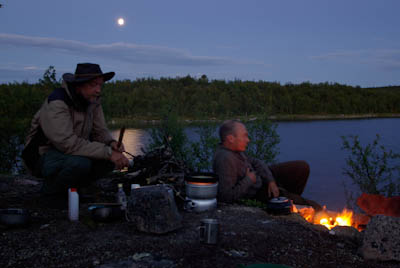 Matka jatkuu kohti Saarikoskea. Yhytämme joen Saarikosken niskalla. Suvannossa näkyy heti tuikki. Vaikka itikat vainoavat hullun lailla, kasaamme virvelin ja kohta kosken niskalta nousee kiloinen jänkis. Käymme katsomassa kosken loppupäätä. Saareen pääsee vaelluskengät jalassa, mutta oikeanpuoleinen uoma on vähän syvempi. Palaamme rinkoille ja käymme vielä pikaisesti Tollakaskoskella. Loppuliu'usta, melko voimakkaasta virrasta, iskee lippaan taisteluntahtoinen otus. Pettymys on valtaisa, kun sekin osoittautuu jänkikseksi. Tämä ja itikoiden ärhäkkyys tyrehdyttää halut jatkaa kalastusta. En viitsi edes kasata perhovapaa. Löydämme mukavan näköisen leiripaikan Saarikosken kupeesta suuren männyn alta. Heti, kun teltta on saatu pystyyn, ole täysin valmis viettämään loppuillan hyttysverkon suojissa. Juho käy vielä virkistäytymässä koskessa, ennen kuin vetäydymme telttaan keittelemään lämpimiä juomia apsidin alla. Trangian hoitaminen tapahtuu siten, että vetoketjuun avataan vain käden mentävä aukko. Ajattelemme kauhulla mitä tapahtuisi, jos teltta hajoaisi. Levittäytyisimme pieninä palasina miljoonien mäkärien leuoissa ympäri jänkää.