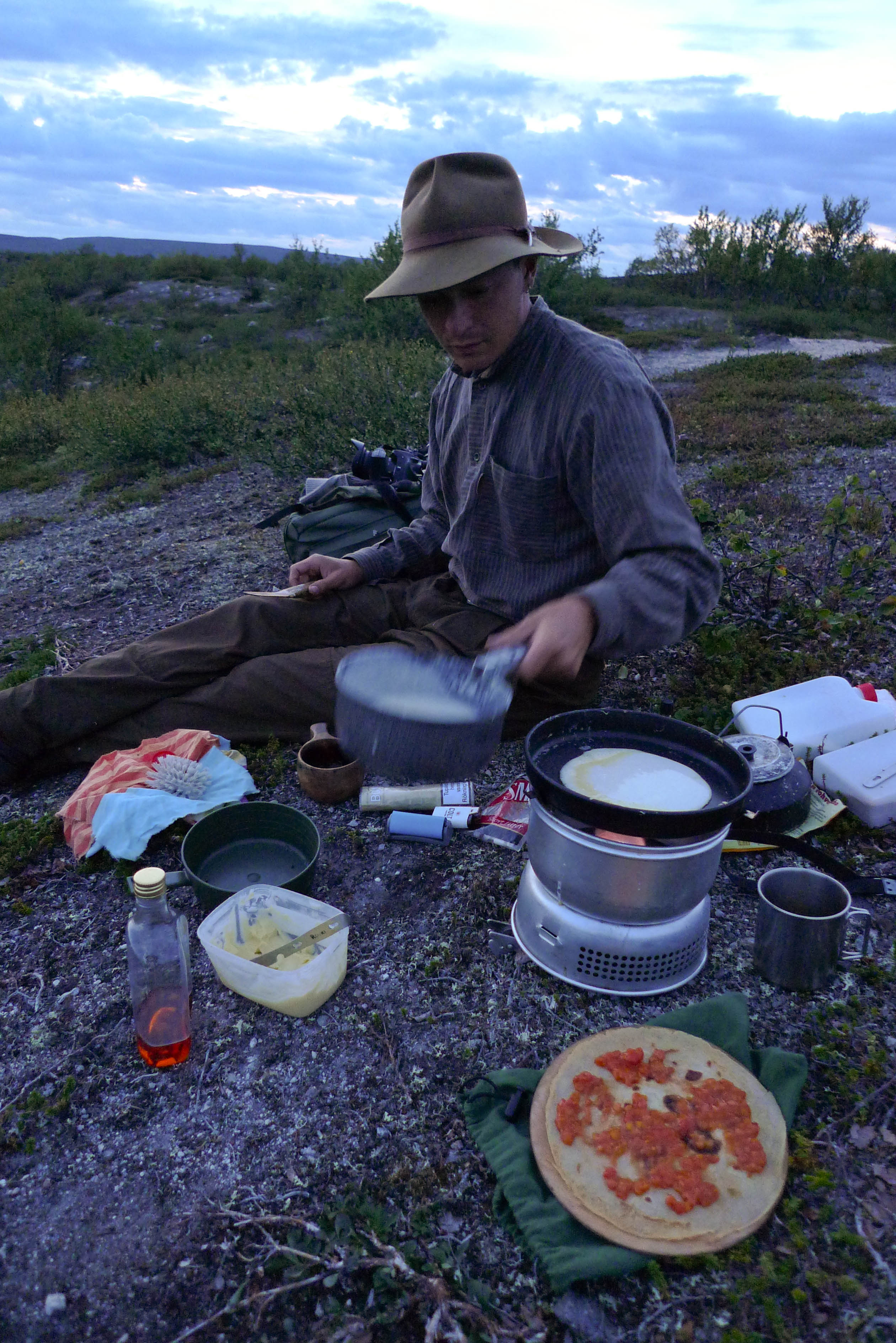 Lähdemme testaamaan järven kalaisuutta. Heti kun laskeudumme kumpareelta alas varvikkoon, itikat löytävät meidät. Sinnikäs parvi pyörii väkkäränä pään ympärillä. Isot mäkärät poukkoilevat päin naamaa, välillä osuen silmään, pienet ryömivät salakavalasti hiusrajaan rouskuttamaan lihaa, hyttyset laskeutuvat inisten iholle ja rupeavat aikailematta tunkemaan kärsää sisään. Kalat eivät osoita aktiivisuuttaan millään tavalla. Juho käy keräämässä pussillisen hilloja ja palaamme kumpareelle. Kiusankappaleet seuraavat meitä kuin hai laivaa. Sekoitamme lettutaikinan, johon tulee aika paljon lihaa joukkoon. Illan viilentyessä ryhdymme letunpaistoon. Lakkahillokrepsit kruunaavat viimeisen illan.