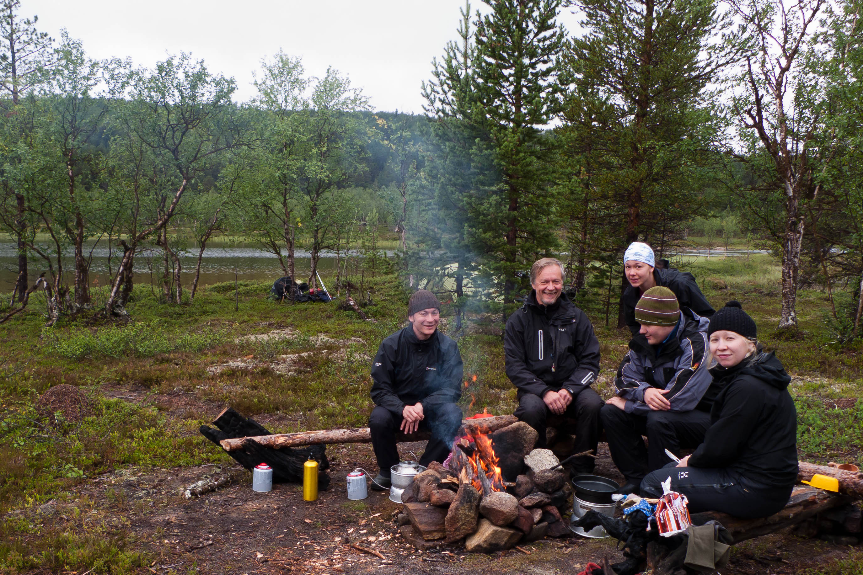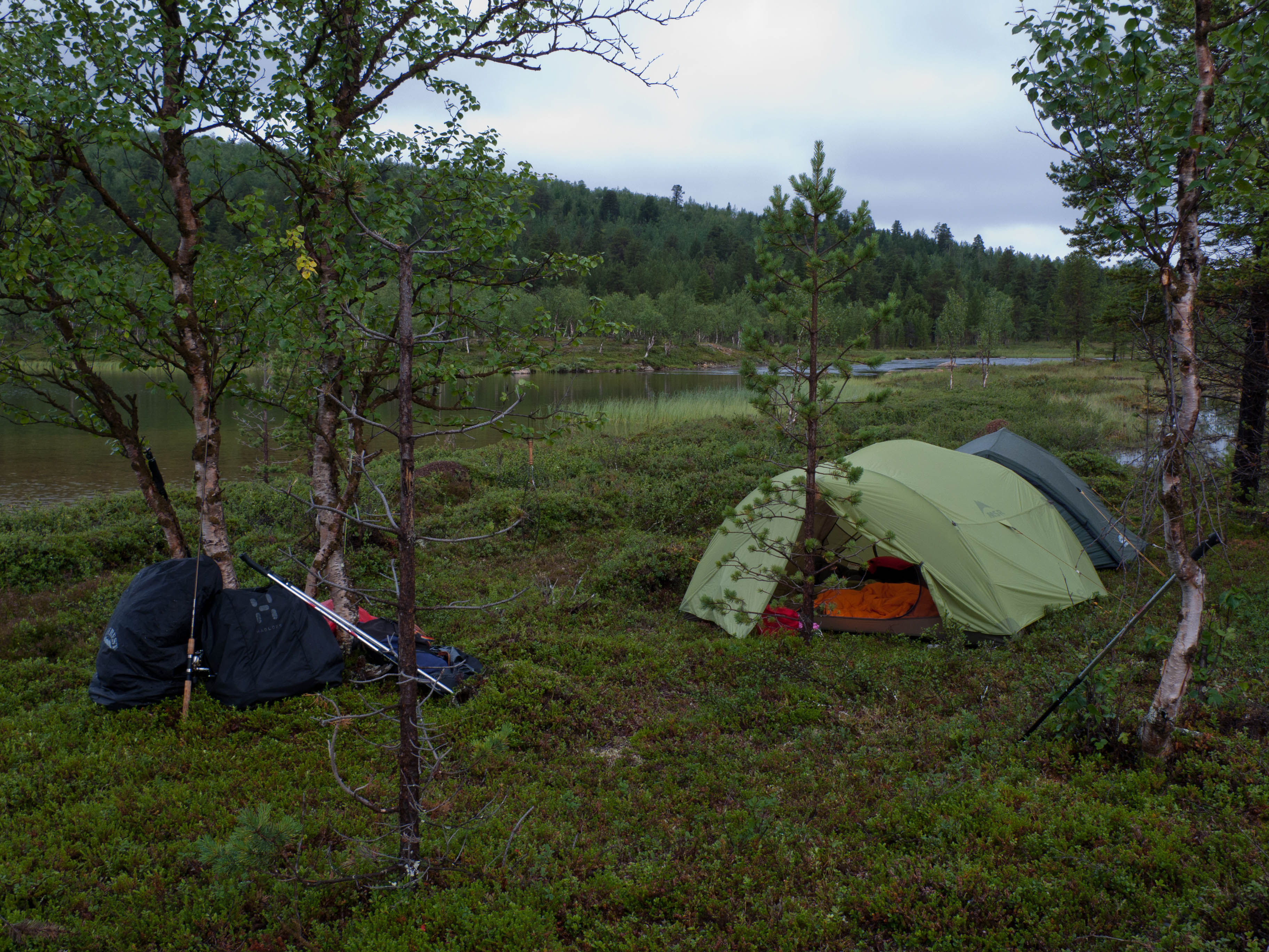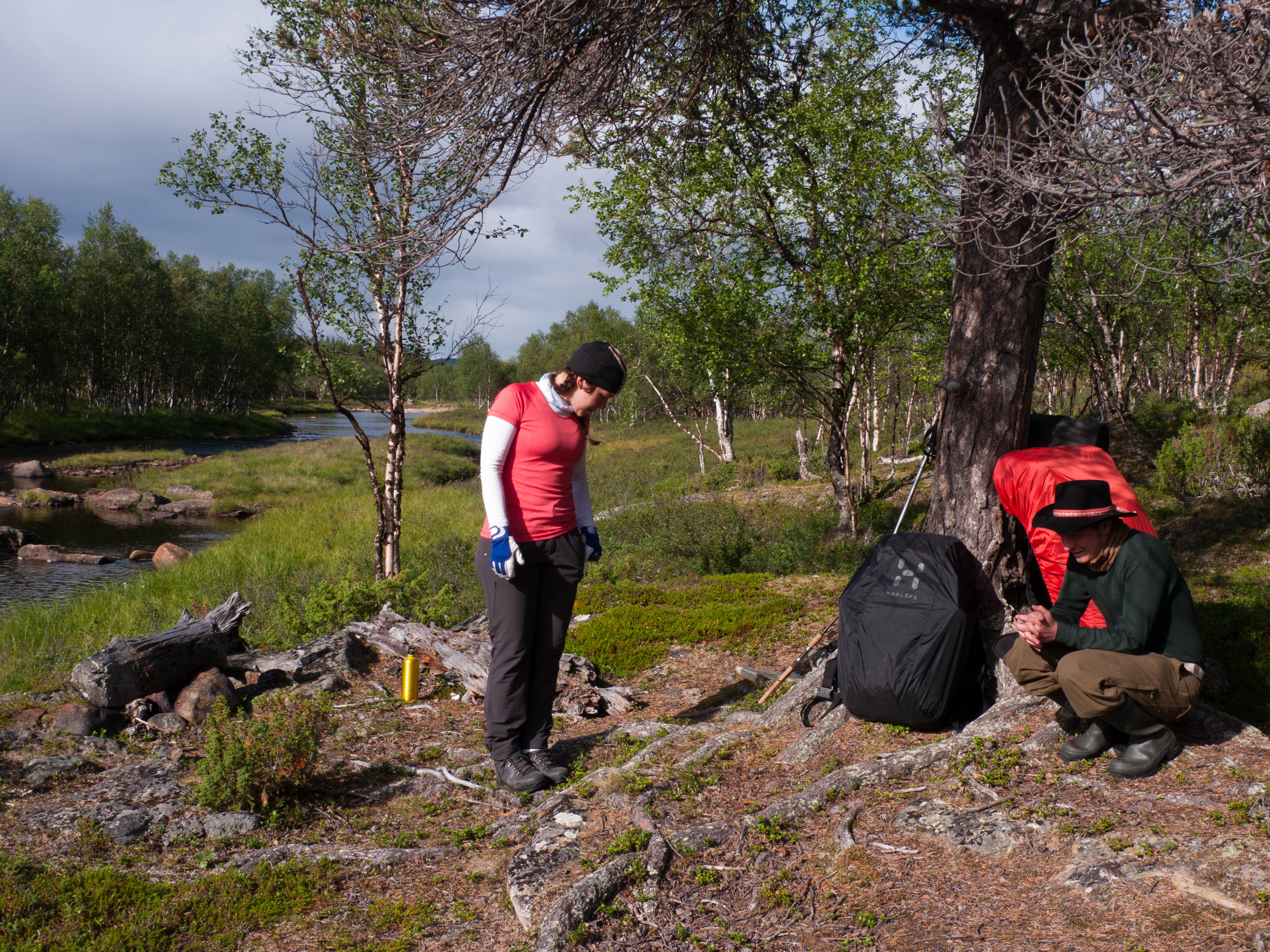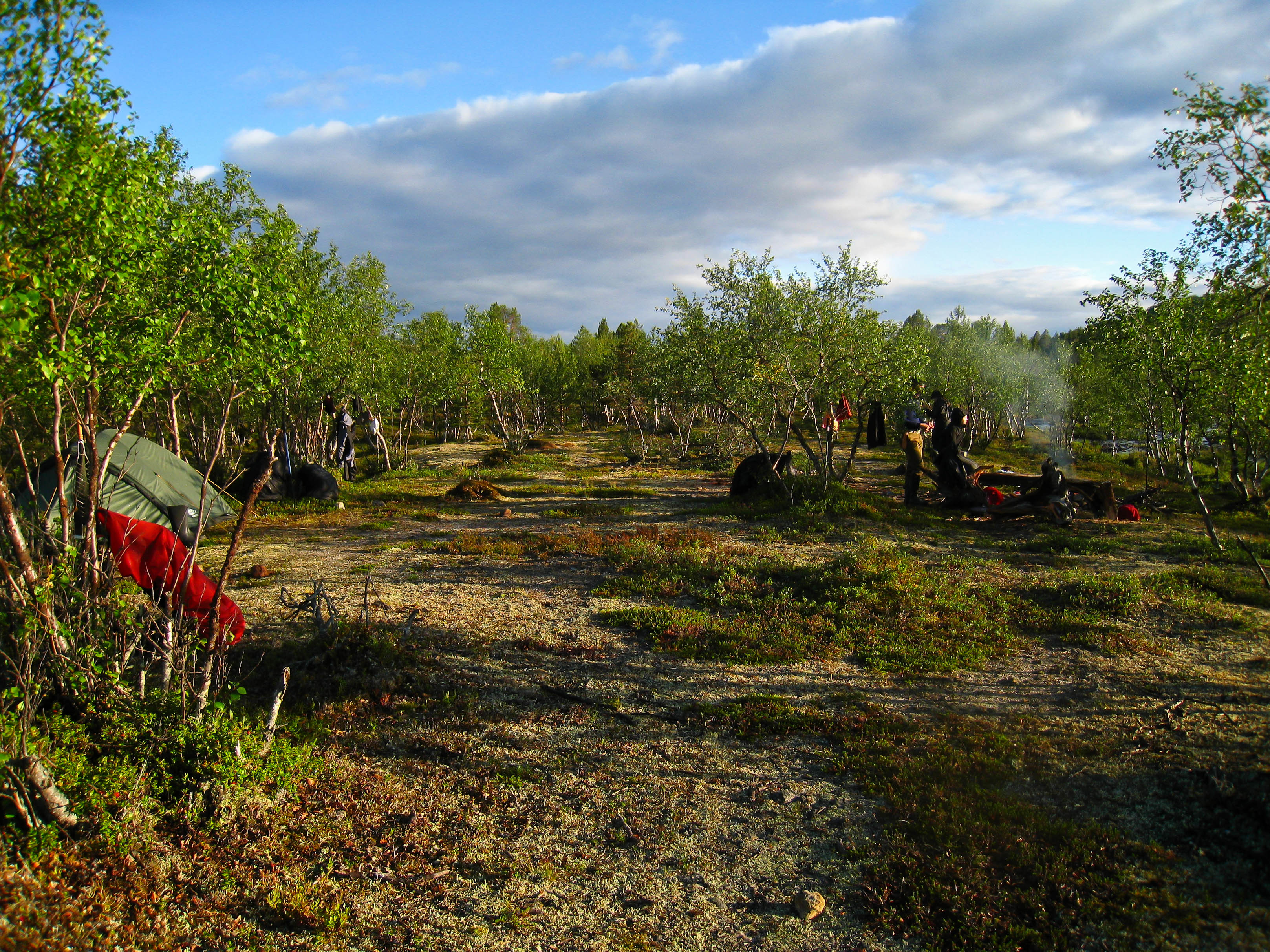 Ensimmäiseksi leiripaikaksi oli valittu Ylemmän Honkavuoman järvimäisen suvannon pohjoispää. Olimme yöpyneet Juhon kanssa 2006 samassa paikassa vatsat täynnä makoisaa harjusta. Nyt vähän jännitti oliko paikka edelleen yhtä kalaisa. Kuljimme alun Kielajoen varressa kulkevaa polkua pitkin. Jo ennen Alemman Honkavuoman ylitystä polku meni pienen suon läpi, jossa tytöt saivat katsoa tarkkaan mihin astuivat lyhytvartisissa vaelluskengissään. Saapasmiehillä ei ollut mitään ongelmia. Hokavuomakin ylittyi helposti saappailla, mutta kengänkuluttajilla oli ensimmäinen kahlaus edessään. Crocsit suojaavat hyvin varpaita kahlatessa ja pitävät yllättävän hyvin liukkailla kivillä. Lisäksi ne säilyttävät keveytensä märkinäkin ja kuivuvat nopeasti. Ylityksen jälkeen alkoi tiputella vettä. Laskimme rinkat selästä ja vedimme goreteksia ylle. Samalla nautimme ensimmäiset kulaukset vettä suoraan luonnosta. Alkoi tuntua siltä, että olisimme jo erämaassa. Otimme suunnan länsilounaaseen nimettömän mäen pohjoispuolella oleville nimettömille järville. Järjestyksessä toisen järven rannalla pidimme pienen lepotauon. Siinä oli sen verran itikoita, että kaivoimme punaisen ohvin esille, mutta sen koomin moista parfyymiä ei juuri tarvittu. Edessä oli päätös jatkaisimmeko reilun kilometrin päässä alkavalle polulle vai menisimmekö suorinta tietä kukkuloiden yli. Valitsimme lyhemmän ja raskaamman vaihtoehdon. Ylhäällä on kuitenkin mukava käväistä katsomassa maisemia. Sieltä näkyi polun takana oleva järvi, pätkä Ylempää Honkavuomaa ja pätkä Kielajokea. Kiipeäminen heti alkumatkasta ei ollut mikään loistava idea siihen nähden, että melkein kaikilla oli uuden uutukaiset jalkineet. Huipulla jouduttiinkin vähän huoltamaan jalkoja. Urakkaa oli jäljellä enää pari kilometriä alamäkeen. Perille saavuttiin kymmenen maissa. Etelässä oli kymmeneltä jo aika pimeää, mutta täällä valoa riitti. Vanha nuotiopaikka oli hyvässä kunnossa, mutta penkit puuttuivat. Läheltä löytyi toinen nuotiopaikka, josta saimme hyvät penkit. Kun teltat oli saatu pystyyn ja nuotio palamaan, maistui pizza alkupaloiksi. Ennen nukkumaanmenoa ehdittiin vielä napostelemaan lähiruokaa - halsterissa kypsytettyä harjusta. Harjus kävi lippaan ja perhoon niin, että puolessa tunnissa oli riittävästi särvintä. Iltaa istuttiin nuotiolla vähän yli puolen yön.