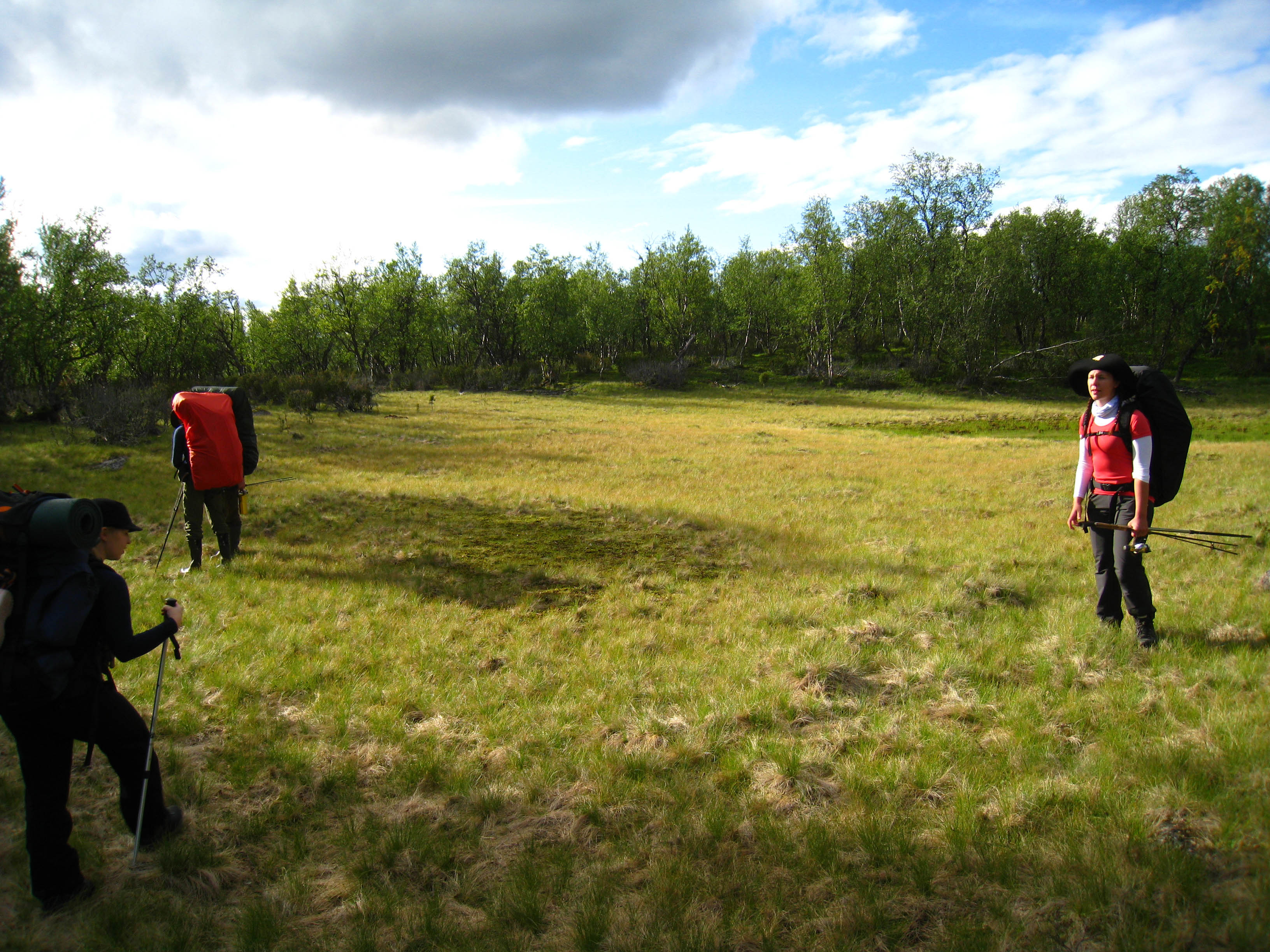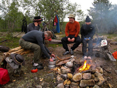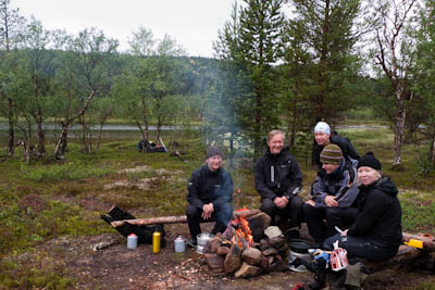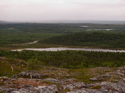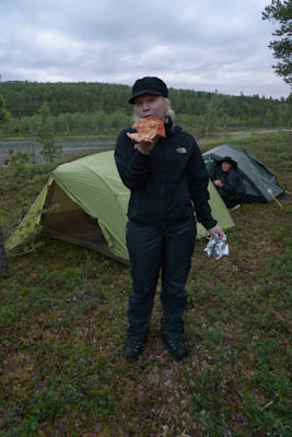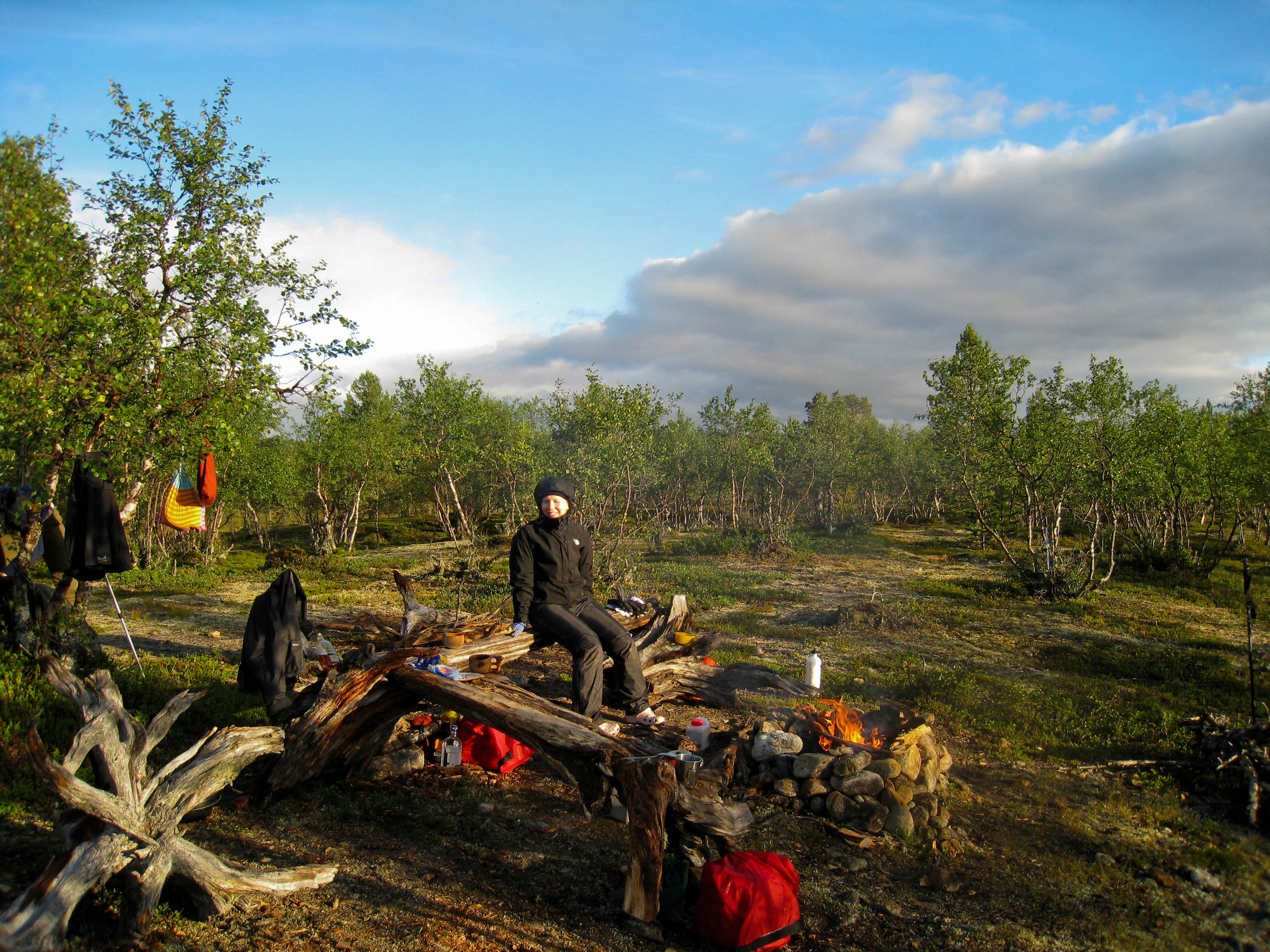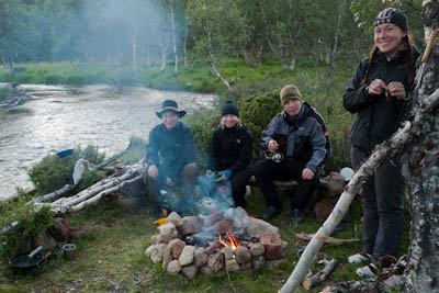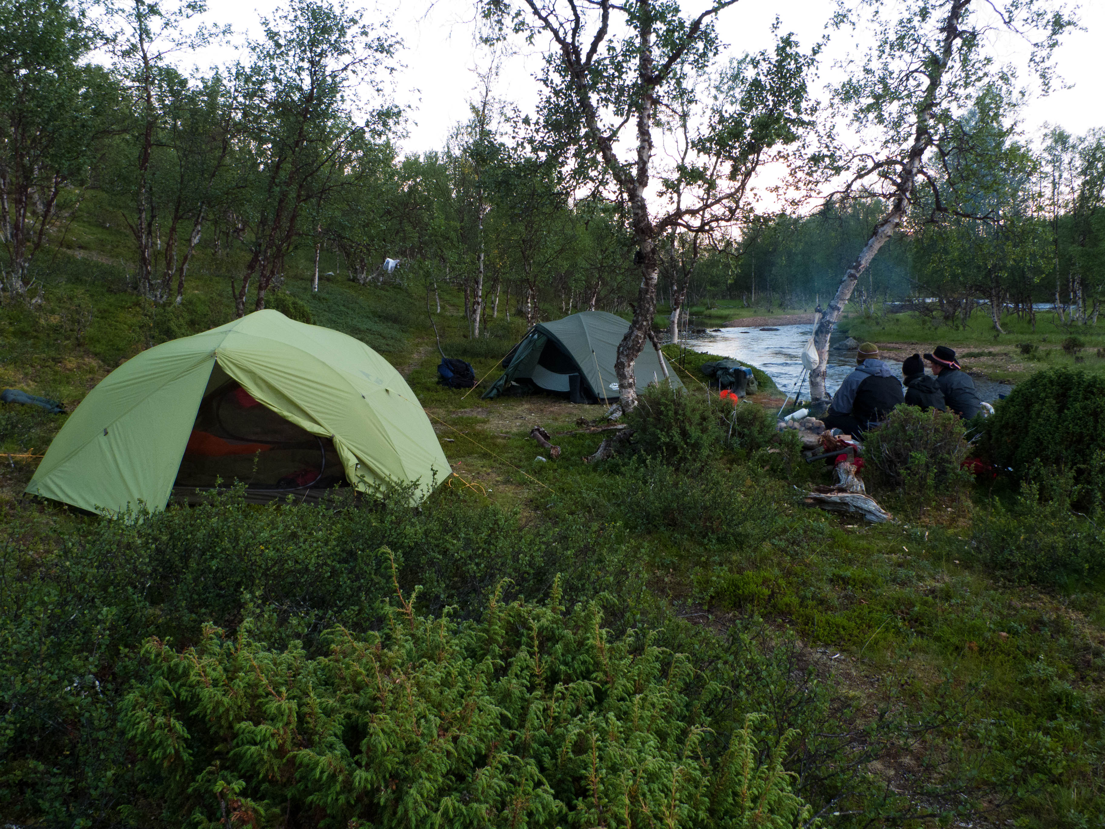 Ensimmäiseksi leiripaikaksi oli valittu Ylemmän Honkavuoman järvimäisen suvannon pohjoispää. Olimme yöpyneet Juhon kanssa 2006 samassa paikassa vatsat täynnä makoisaa harjusta. Nyt vähän jännitti oliko paikka edelleen yhtä kalaisa. Kuljimme alun Kielajoen varressa kulkevaa polkua pitkin. Jo ennen Alemman Honkavuoman ylitystä polku meni pienen suon läpi, jossa tytöt saivat katsoa tarkkaan mihin astuivat lyhytvartisissa vaelluskengissään. Saapasmiehillä ei ollut mitään ongelmia. Hokavuomakin ylittyi helposti saappailla, mutta kengänkuluttajilla oli ensimmäinen kahlaus edessään. Crocsit suojaavat hyvin varpaita kahlatessa ja pitävät yllättävän hyvin liukkailla kivillä. Lisäksi ne säilyttävät keveytensä märkinäkin ja kuivuvat nopeasti. Ylityksen jälkeen alkoi tiputella vettä. Laskimme rinkat selästä ja vedimme goreteksia ylle. Samalla nautimme ensimmäiset kulaukset vettä suoraan luonnosta. Alkoi tuntua siltä, että olisimme jo erämaassa. Otimme suunnan länsilounaaseen nimettömän mäen pohjoispuolella oleville nimettömille järville. Järjestyksessä toisen järven rannalla pidimme pienen lepotauon. Siinä oli sen verran itikoita, että kaivoimme punaisen ohvin esille, mutta sen koomin moista parfyymiä ei juuri tarvittu. Edessä oli päätös jatkaisimmeko reilun kilometrin päässä alkavalle polulle vai menisimmekö suorinta tietä kukkuloiden yli. Valitsimme lyhemmän ja raskaamman vaihtoehdon. Ylhäällä on kuitenkin mukava käväistä katsomassa maisemia. Sieltä näkyi polun takana oleva järvi, pätkä Ylempää Honkavuomaa ja pätkä Kielajokea. Kiipeäminen heti alkumatkasta ei ollut mikään loistava idea siihen nähden, että melkein kaikilla oli uuden uutukaiset jalkineet. Huipulla jouduttiinkin vähän huoltamaan jalkoja. Urakkaa oli jäljellä enää pari kilometriä alamäkeen. Perille saavuttiin kymmenen maissa. Etelässä oli kymmeneltä jo aika pimeää, mutta täällä valoa riitti. Vanha nuotiopaikka oli hyvässä kunnossa, mutta penkit puuttuivat. Läheltä löytyi toinen nuotiopaikka, josta saimme hyvät penkit. Kun teltat oli saatu pystyyn ja nuotio palamaan, maistui pizza alkupaloiksi. Ennen nukkumaanmenoa ehdittiin vielä napostelemaan lähiruokaa - halsterissa kypsytettyä harjusta. Harjus kävi lippaan ja perhoon niin, että puolessa tunnissa oli riittävästi särvintä. Iltaa istuttiin nuotiolla vähän yli puolen yön.