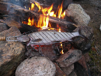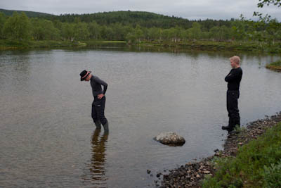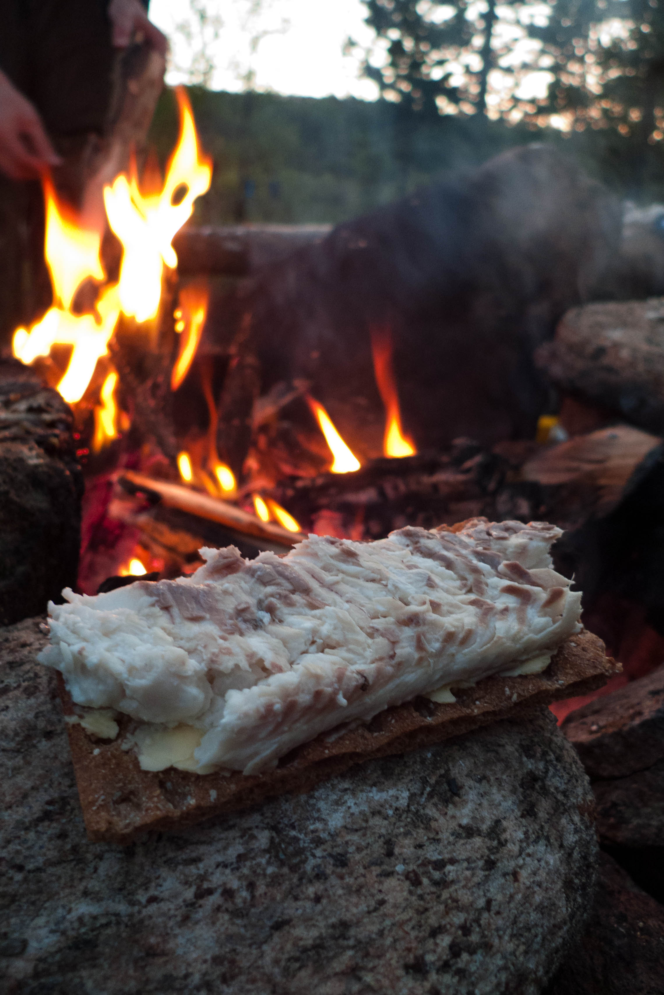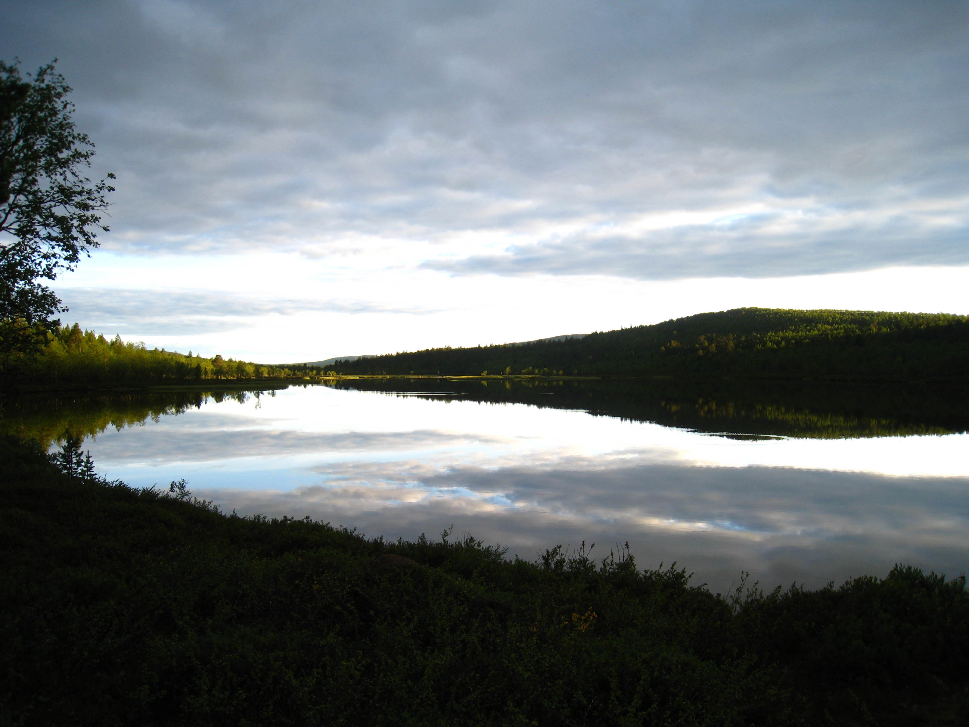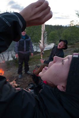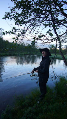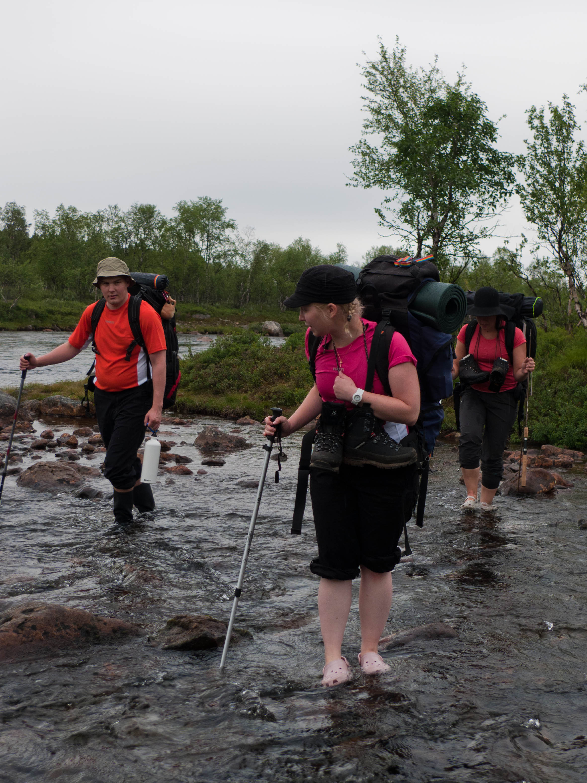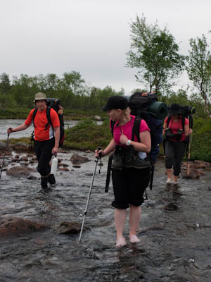 Ensimmäiseksi leiripaikaksi oli valittu Ylemmän Honkavuoman järvimäisen suvannon pohjoispää. Olimme yöpyneet Juhon kanssa 2006 samassa paikassa vatsat täynnä makoisaa harjusta. Nyt vähän jännitti oliko paikka edelleen yhtä kalaisa. Kuljimme alun Kielajoen varressa kulkevaa polkua pitkin. Jo ennen Alemman Honkavuoman ylitystä polku meni pienen suon läpi, jossa tytöt saivat katsoa tarkkaan mihin astuivat lyhytvartisissa vaelluskengissään. Saapasmiehillä ei ollut mitään ongelmia. Hokavuomakin ylittyi helposti saappailla, mutta kengänkuluttajilla oli ensimmäinen kahlaus edessään. Crocsit suojaavat hyvin varpaita kahlatessa ja pitävät yllättävän hyvin liukkailla kivillä. Lisäksi ne säilyttävät keveytensä märkinäkin ja kuivuvat nopeasti. Ylityksen jälkeen alkoi tiputella vettä. Laskimme rinkat selästä ja vedimme goreteksia ylle. Samalla nautimme ensimmäiset kulaukset vettä suoraan luonnosta. Alkoi tuntua siltä, että olisimme jo erämaassa. Otimme suunnan länsilounaaseen nimettömän mäen pohjoispuolella oleville nimettömille järville. Järjestyksessä toisen järven rannalla pidimme pienen lepotauon. Siinä oli sen verran itikoita, että kaivoimme punaisen ohvin esille, mutta sen koomin moista parfyymiä ei juuri tarvittu. Edessä oli päätös jatkaisimmeko reilun kilometrin päässä alkavalle polulle vai menisimmekö suorinta tietä kukkuloiden yli. Valitsimme lyhemmän ja raskaamman vaihtoehdon. Ylhäällä on kuitenkin mukava käväistä katsomassa maisemia. Sieltä näkyi polun takana oleva järvi, pätkä Ylempää Honkavuomaa ja pätkä Kielajokea. Kiipeäminen heti alkumatkasta ei ollut mikään loistava idea siihen nähden, että melkein kaikilla oli uuden uutukaiset jalkineet. Huipulla jouduttiinkin vähän huoltamaan jalkoja. Urakkaa oli jäljellä enää pari kilometriä alamäkeen. Perille saavuttiin kymmenen maissa. Etelässä oli kymmeneltä jo aika pimeää, mutta täällä valoa riitti. Vanha nuotiopaikka oli hyvässä kunnossa, mutta penkit puuttuivat. Läheltä löytyi toinen nuotiopaikka, josta saimme hyvät penkit. Kun teltat oli saatu pystyyn ja nuotio palamaan, maistui pizza alkupaloiksi. Ennen nukkumaanmenoa ehdittiin vielä napostelemaan lähiruokaa - halsterissa kypsytettyä harjusta. Harjus kävi lippaan ja perhoon niin, että puolessa tunnissa oli riittävästi särvintä. Iltaa istuttiin nuotiolla vähän yli puolen yön.