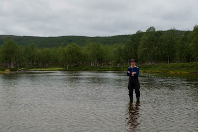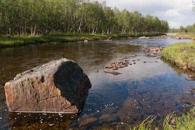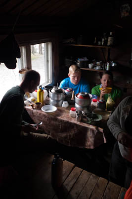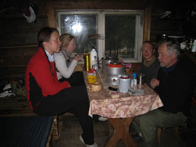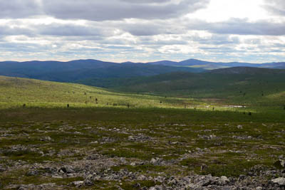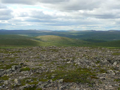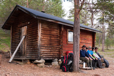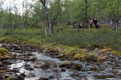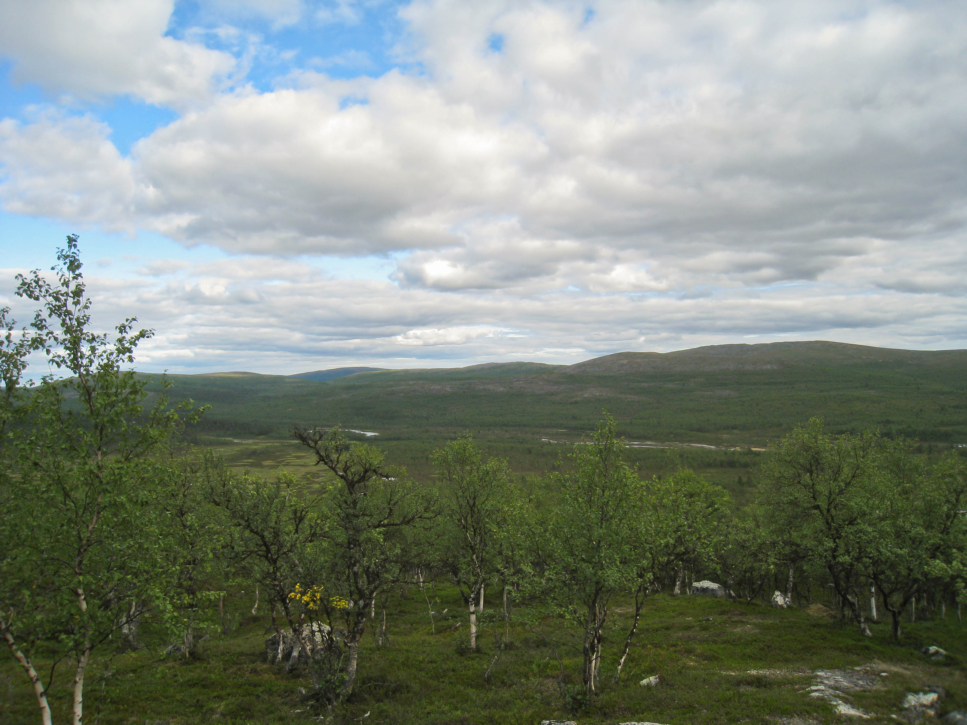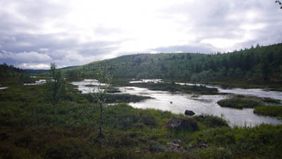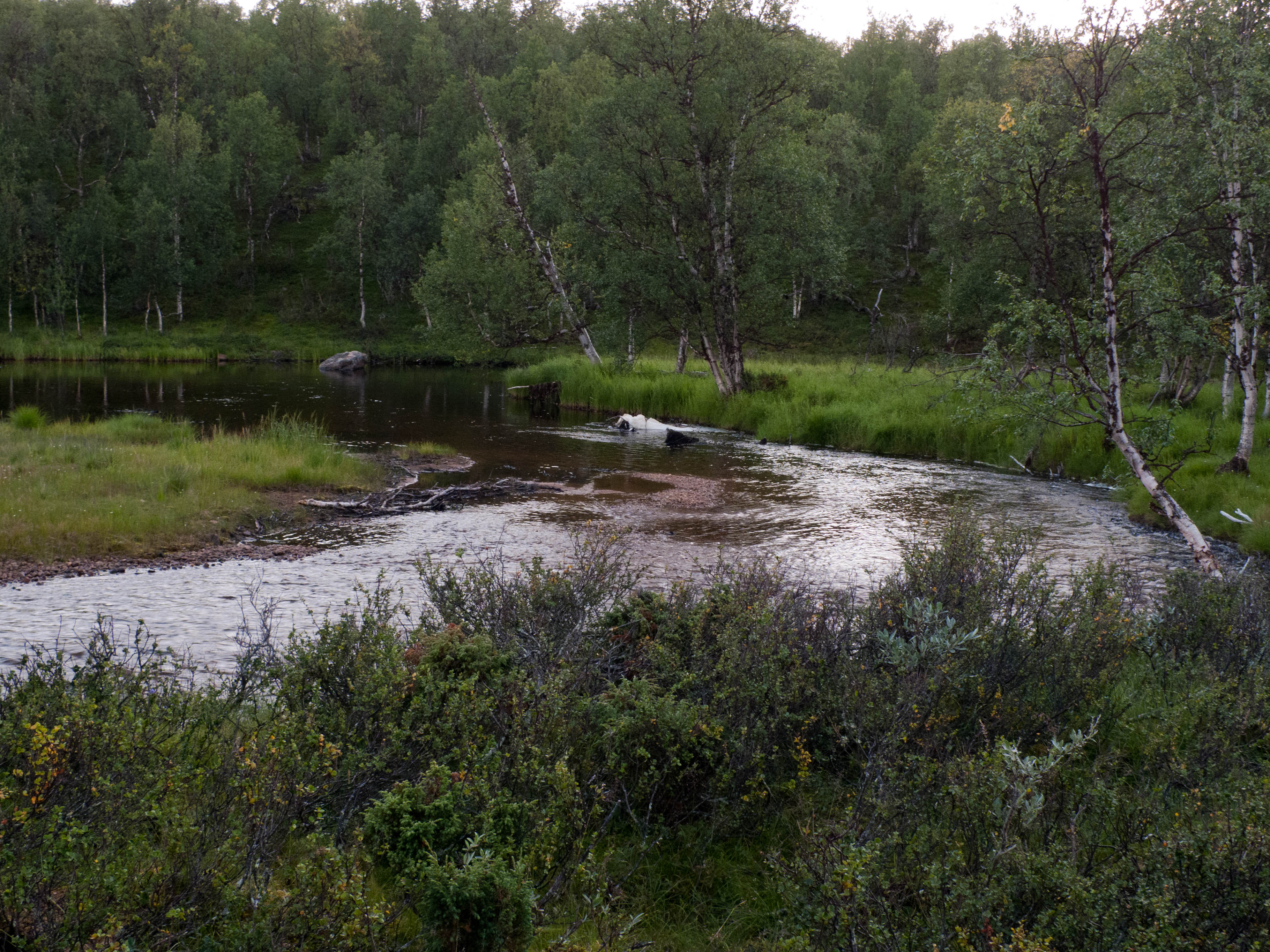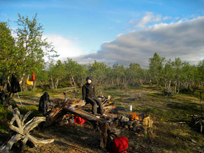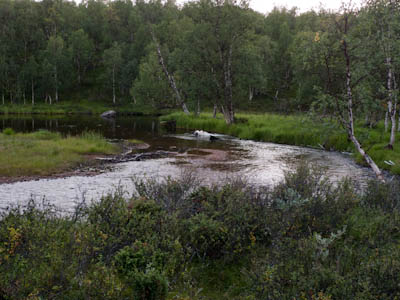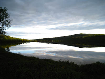 Tästä alkoi ikäänkuin tämän lyhyehkön vaelluksen paluumatka. Illalla olisi tarkoitus olisi katsastaa vanha rajavartioston tupa ja mahdollisesti viettää yksi yö teltan sijasta lauteilla. Suuria odotuksia ei sen suhteen ollut, sillä tupa ja sitä ympäröivä hiekkakenttä idyllisine lampineen tiedettiin melko suosituksi kohteeksi. Alkuun palailtiin pari kilometriä omia jälkiä pohjoiseen. Siitä laajojen suoalueiden itäpuolelta koukaten Tivreladducumman ja Kielajoen välimaastoon. Näin jälkikäteen harmittaa ettemme kiertäneet vielä seuraavaa kukkulaa itäpuolelta ja tulleet joen varteen sen koillispuolella olevan, ainakin kartalla hienolta näyttävän, kurun kautta. Valitsemallamme tiellä maasto oli helppokulkuista, mutta itseäni vaivasi jo pari päivää tuloaan tehnyt flunssa. Pysähdyimme päivälliselle Tivreladducumman pohjoispuolella, missä Kielajoen rantajuntu kulkee aivan rannan tuntumassa. Rannassa jököttävän muhkean petäjän juurella oli todella idyllinen taukopaikka. Kielajoki suorastaan kerjää kasaamaan perhovehkeet, mutta pidän näppini kurissa, koska käsittääkseni rauhoitus ulottuu nykyään ihan latvoille asti. Matka jatkui kohti tupaa. Hieman ennen em. kurusta laskevaa puroa kohtasimme pari nuorta miestä, jotka olivat pitäneet taukoa kämpän luona. Kämppä oli jäänyt tyhjilleen heidän lähdettyään. Se herätti vähän toivoa mahdollisesta kämppäyöstä. Puro ylittyi melko helpolla kengät jalassa. Heti puron jälkeen erkanimme Kielajoesta ja otimme suunnan suoraan kohti kämppää. Alimman, vähän erillään olevan lammen kohdalla alkoi tiputella vettä. Emme kuitenkaan ryhtyneet sadeasuihin, vaan lisäsimme vauhtia. Vajaan kilometrin päässä odotti katto ja seinät. Kämppä oli kohtalaisen hyvässä hapessa ihan huussia myöten. Jos nyt jotain negatiivista haluaisi sanoa, niin ruokapakkausten jämät nuotiopaikoilla, vain viisi halkoa eteisessä ja lystikkäiden käviöiden jallupulloihin jättämät kellertävät nesteet (emme viitsineet edes haistella). Aluksi tuli vähän apea olo - mihin tässä ilkeää laskea voileipänsä jne. Toinen asia, joka huolestutti, oli seuraava päivämatka Giellaroaivvin yli ensimmäisen yön leiripaikalle. Se saattaisi olla melko rankka ja aikaaviepä, koska suurin osa matkasta tehtäisiin neitseellisessä maastossa. Kymmenen maissa alkoi tuntua siltä, että ketään ei tule yön selästä. Kävimme taloksi ja kohta kämppä tuntui jo ihan kodikkaalta. Ihan mielenkiinnosta heittelin vähän lippaa lammikoihin ja kyllä sieltä välillä hyökkäsi pieni tammukka uistimen perään. Ei ollut kuitenkaan mieltä ottaa halsterikaloja, koska melko varmaa oli, että kaikki luonnon polttopuut olisi joutunut hakemaan vähän kauempaa. Keskityimme sen sijaan rinkkojen keventämiseen ja teimme herkulliset shorizo-muusit ja sen päälle vielä lättyjä.