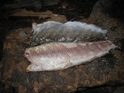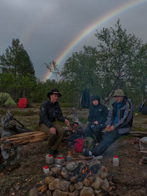 Ensimmäisestä aamusta erämaassa haluttiin jättää mukava muisto. Nukuttiin niin kauan kuin unta riitti ja aamupala nautittiin kaikessa rauhassa nuotion loimussa. Päivän urakka olisi vain vajaat kahdeksan kilometriä joen vartta ylävirtaan. Leiripaikka oli testattu ja hyväksi havaittu aikaisemmalla vaelluksella. Pirteä joukko lähti matkaan vasta puoli kahden maissa. Maasto oli pääosin helppokulkuista tasaista hiekkapenkkaa. Toisinaan ilmestyi polku näkyviin kuin kiusallaan kadotakseen taas jäljettömiin. Säilytimme näköyhteyden Honkavuomaan, joka virtasi välillä hitaasti syvässä suouomassa, välillä nopeasti kapeassa rännissä, levittäytyi paikoitellen järvimäiseksi suvannoksi, paikoitellen monihaaraiseksi palmikoksi. Vähän etäpin puolivälin jälkeen osuimme korkean sorapenkan päällä olevalle idylliselle ja melko siistiin kuntoon jätetylle nuotiopaikalle, jossa nautimme päivän pääaterian. Siinä joki oli melko leveä ja matala eikä antanut mitään merkkiä kalasta. Ruuan päätteeksi alkoikin sataa ja matka jatkui goretekseissä. Vajaat kolme kilsaa metsäistä kukkulan reunaa, jossa piti vähän kiemurrella, ja tulimme kohtaan, jossa joki tekee jyrkän mutkan. Siitä alkoi parin kilsan mittainen hiekkaharjanne, jossa telttapaikkaa riittää. Pidimme pienen tauon, vaikka matkaa oli jäljellä enää runsas kilometri. Mutkasta suunniteltuun leiripaikkaan joki virtaa hitaasti syvässä suouomassa, josta aiemman kokemuksen mukaan saisi helposti narrattua muutaman tammukan iltapalaksi. Loppumatka taittui hujauksessa ja vanha leiripaikka oli entisellään. Kukaan ei ollut keksinyt käyttää polttopuina muhkeista tervaskannoista tehtyjä penkkejä. Eikä aikaakaan, kun teltat oli pystytetty, polttopuut kerätty ja nuotio sytytetty. Tunnelma oli korkealla jo ennen terästettyä kahvia. Vartin mittainen sadekuuro vähän häiritsi kahvittelua, mutta antoi vastineeksi komean sateenkaaren. Kahvittelun jälkeen käytiin pyytämässä muutama tammukka halsteriin. Siinä se ilta kului rattoisasti lämpimiä juomia siemaillen ja lähiruokaa napostellen. Puolenyön lähestyessä usva hiipi virtaa pitkin ja nuotiosta huolimatta luihin ja ytimiin tunkeva kylmyys ajoi porukan lämpimiin makuupusseihin.
