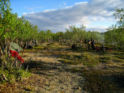 Yön viileys tuntui vielä aamuauringon paisteessa. Tehtiin tulet ihan vaan tunnelman vuoksi. Aamupala ja muut välttämättömät aamutoimet ottivat aikansa ja liikkeelle päästiin vasta yhden maissa. Siihen mennessä ilma oli jo lämminnyt siinä määrin, että kaikki yhden ja yksi kaikkien puolesta lähtivät matkaan teepaitasillaan. Tarkoituksena oli vaeltaa Kielajoelle Urroaivin kupeeseen. Muuta tietoa kohteesta ei ollut kuin, että kartan mukaan siellä oli muutamia rantakaistaleita, jossa ei ole suota eikä pajukkoa. Suunnitelma oli ylittää Honkavuoma ensimmäisessä paikassa, josta pääsee kenkien kanssa yli, ja nousta Tsappoaivin itärinteellä olevien soiden yläpuolelle. Ylitys toteutui jo ennen Kellonkadottamaäytsiä. Välttääksemme karttaan merkityn rakan nousimme melko jyrkkää rinnettä ylös äytsin pohjoispuolella ja jatkoimme äytsin yli Tsappoaivin itärinteelle. Tämä oli varmaan huono valinta, koska näin jälkikäteen huomasin, että esim. Kansalaisen karttapaikassa mitään rakkaa ei ole merkitty. Toivoimme, että seuraavassa nimettömässä äytsissä Tsappoaivin ja Tuolbaoaivin välissä olisi juotavaksi kelpaavaa vettä. Niinhän sieltä löytyi soistunut pieni puro, jossa oli kirkasta hyvää vettä. Teimme päivällisen ja lepäilimme vähän. Sitten äytsiä ylös ja Tuolbaoaivin länsirinnettä lounaaseen. Matkaan mahtui pajukkoa ja pieniä puroja, joista ei ole mitään mainintaa kartassa. Tavoittelimme Kielajoen itärannan polkua, joka oli merkitty Genimapin ulkoilukarttaan. Mitään selvää polkua ei kuitenkaan löytynyt. Sensijaan näytti pitkään siltä, että meidän ja Kielajoen välissä on ylitsepääsemätön suo, joka jatkuu loputtomiin. Kun olimme aikamme kulkeneet suon ylälaidassa metristen koivujen seassa löytyi vihdoin kannas, joka johdatteli meidät joen rantaan. Saavuimme paikkaan, jossa joki muodostaa peräsuolta muistuttavan lahdelman. Siinä penkalla oli hyviä telttapaikkoja, mutta penkka oli varmaan kymmenen metriä korkea. Halusimme veden äärelle paikkaan, jossa voi ojentaa mukin teltan oviaukosta ja kahmaista raikasta vettä. Mietimme edellä nähtyjä suorantoja ja sitä, että jokainen kilometri etelään summautuu seuraavan päivän matkaan. No, vajaan puolen kilometrin päästä löytyi lähes ihanteellinen rantakaistale, jossa oli valmiiksi nuotiopaikka. Joki teki jyrkän mutkan vasempaan ja rauhoittui pyöreäksi suvannoksi jatkaakseen taas melkoista haipakkaa alkuperäiseen suuntaansa koilliseen. Suvannon pohjoisrannalla oli vanhaa pajukkoa, josta irtosi helpolla kuivaa nuotiopuuta. Se olikin tarpeen, sillä seuraava yö oli retken vilpoisin. Illan mittaan lämpötila laski lähelle nollaa ja hengitys huurusi näyttävästi. Istuimme iltaa puolen yön tienoille nautiskellen nestemäistä lämmikettä kunnes kylmyys ja silmiin käyvä savu ajoi yöpuulle.
