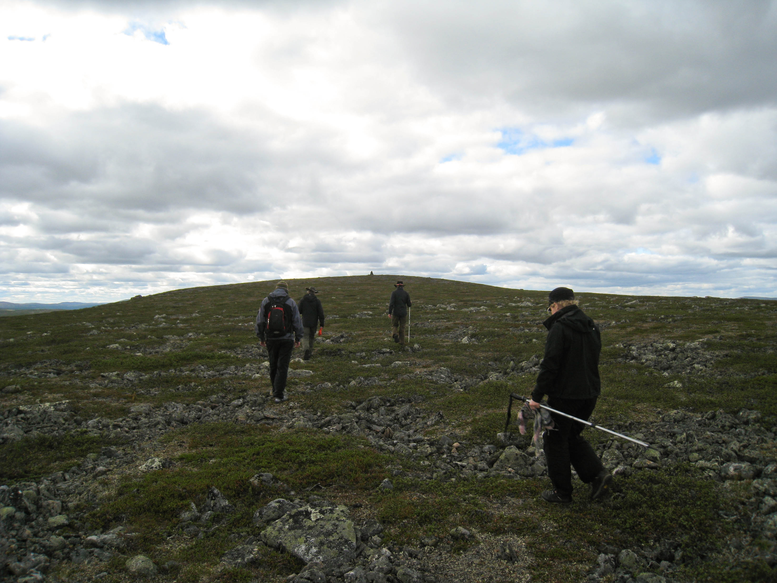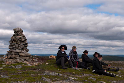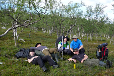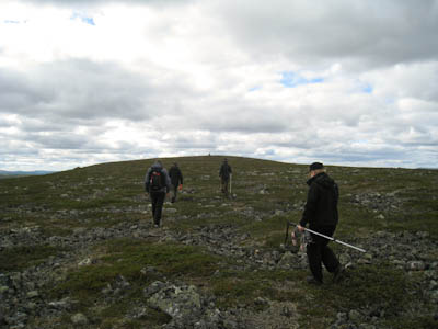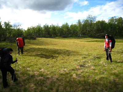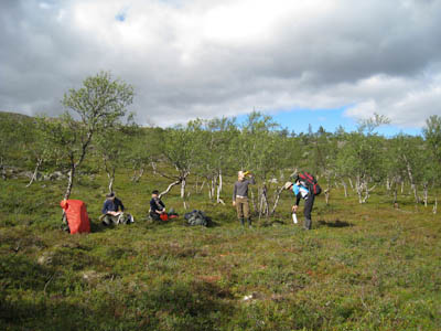 Aamulla olo oli huomattavasti parantunut shorizo oli avannut sieraimet ja hillitysti nautittu droppi oli tappanut suuren määrän basilleja. Aurinko paistoi ja kutsui lammen rantaan pienelle pulahdukselle. Sitä oli kaivattukin, sillä viileähköt kelit olivat pitäneet sellaiset halut loitolla koko alkumatkan. Matkaan päästiin ensimmäistä kertaa ennen puolta päivää. Lähdimme seuraamaan Giellaroaivvilta laskevaa puroa. Tarkoitus oli nauttia päivällinen puron varressa vähän ennen huippua. Niin helpolta kuin suunnistus tuntuikin johdatin porukan muutaman sata metriä harhaan etelästä tulevalle haaralle. Emme lähteneet tekemään korjausliikettä, vaan suuntasimme suoraan kohti huippua. Rinnesuosta selviydyttyämme edessä oli varsinainen kiitorata, jota pitkin huippu lähestyi hyvää vauhtia. Huipulla istuskeltiin tovi ja ihasteltiin maisemia etelään ja kaakkoon melko kirkkaassa puolipilvisessä säässä. Matka jatkui kohti koillista notkoa, josta odotimme löytävämme vettä ruuanlaittoon, emmekä joutuneet pettymään. Pieni puro tarjosi kristallinkirkasta vettä ja kuiva mättäikkö ennen alhaalla odottavia soita oli oivallinen ja suojaisa taukopaikka. Matka jatkui soiden itäpuolella olevan nenän yli kohti koillista. Nenältä laskeuduttaessa saimme hienon näkymän laajalle suoalueelle, joka jatkui Honkavuomalle asti. Kaukaa katsottuna suokin voi näyttää kauniilta - ei kuitenkaan houkuttelevalta. Paikka näytti juuri sellaiselta, että jos jossain uskoisi kohtaavansa karhun, niin siellä. Nenän juurella roikkui tunturikoivun oksassa kymmeniä metrejä siististi käärittyä kalliin näköistä köyttä aivankuin jonkin nopean kulkupelin kyydistä siihen tarttuneena. Kiersimme suot luoteispuolelta ja suuntasimme Slubboruaivin satulaan, jossa istuskelimme hetken hikisiä sukkia kuivattelmassa. Viimeinen kilometrin rykäys Honkavuoman rantaan mentiin aika haipakkaa alamäkeen. Rannassa iski jo toistamiseen samana päivänä halu pulahtaa veteen. Annettiin ensin yhden komean harjuksen väistyä tieltä, kahlattiin yli ja pulahdettiin veteen. Ei kyllä illemmalla siitä kohtaa, joka oli ensimmäisenä iltana ollut hyvä ottipaikka, tullut yhtään tärppiä - onko kaloilla niin pitkä muisti vai jäikö siihen liian voimakas ihmisen haju:-) Ilta oli ikimuistoinen. Tuuli tyyntyi ja laskeva aurinko punasi järvimäisen suvannon selän. Kalat tuikkivat kaikkialla. Suurin osa lienee ollut harjuksia. Järvien välisen vuolteen loppuliu'usta nappasi kaksi komeaa harjusta, jotka pääsivät samantien halsteriin, vuoronperään, sillä kumpikin täytti 40-senttisen halsterin kokonaan. Edes kuvaa ei maltettu napata koko saaliista, mikä näin jälkikäteen harmittaa. Iltaa istuttiin syöden ja juoden. Jokainen jäljellä oleva vanikka sai peitteekseen aimo kerroksen höyryävää harjusta ja jokainen kupponen pari korkillista koviketta. En tiedä mitä juhlittiin, sillä seuraavana päivänä odottaisi paluu arkeen.