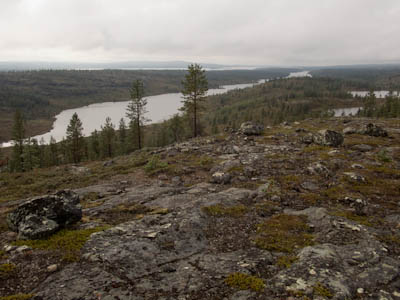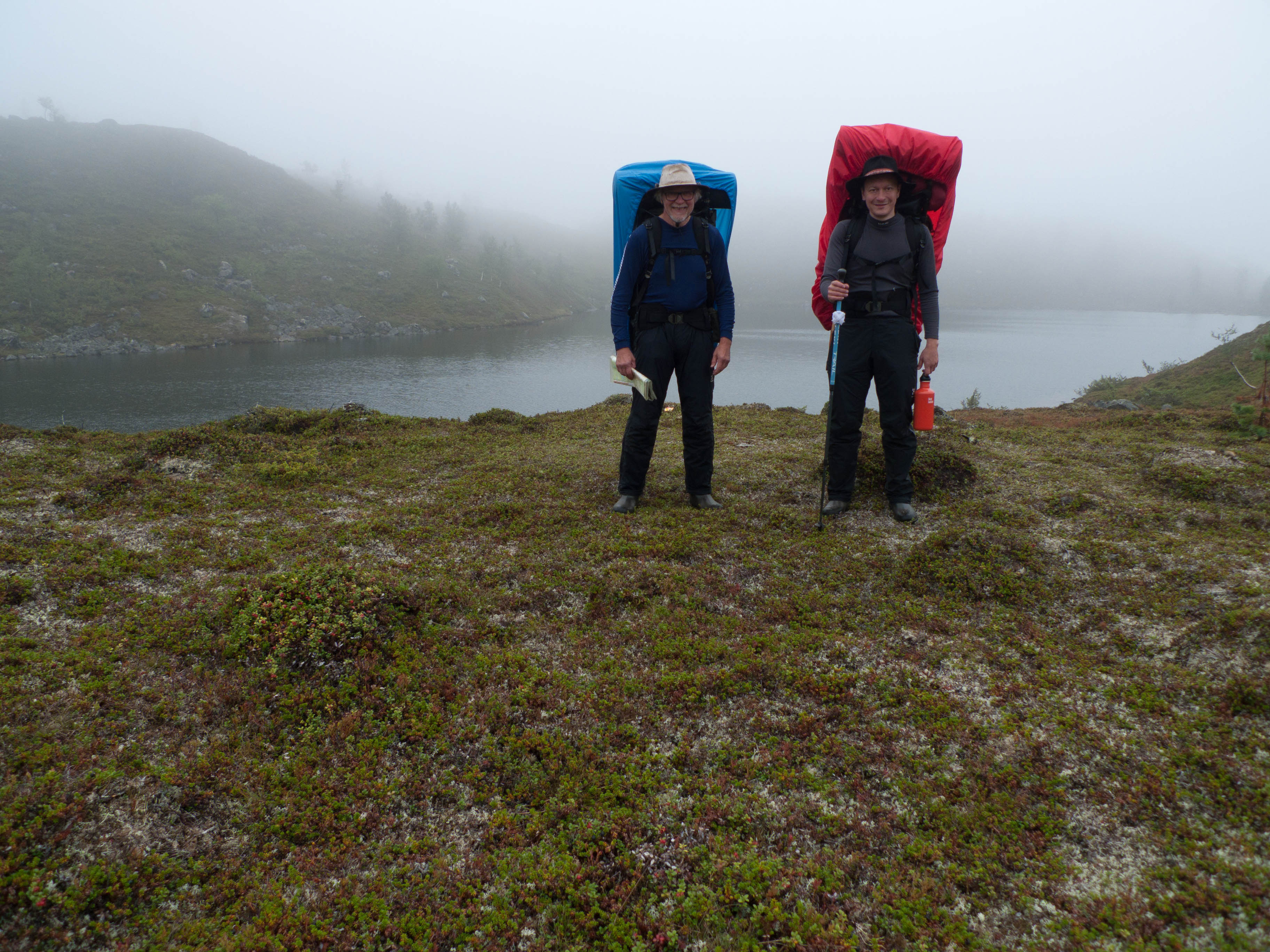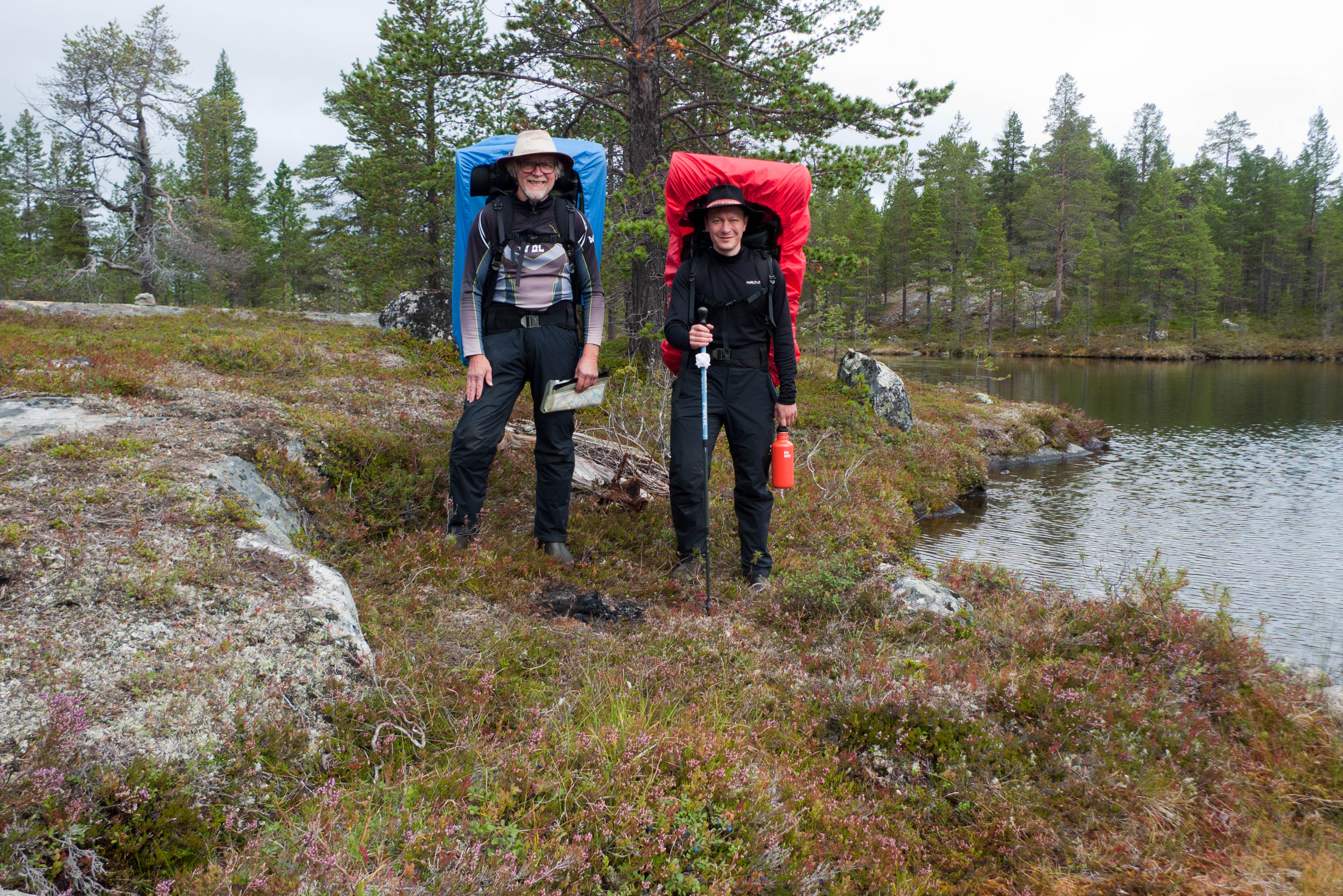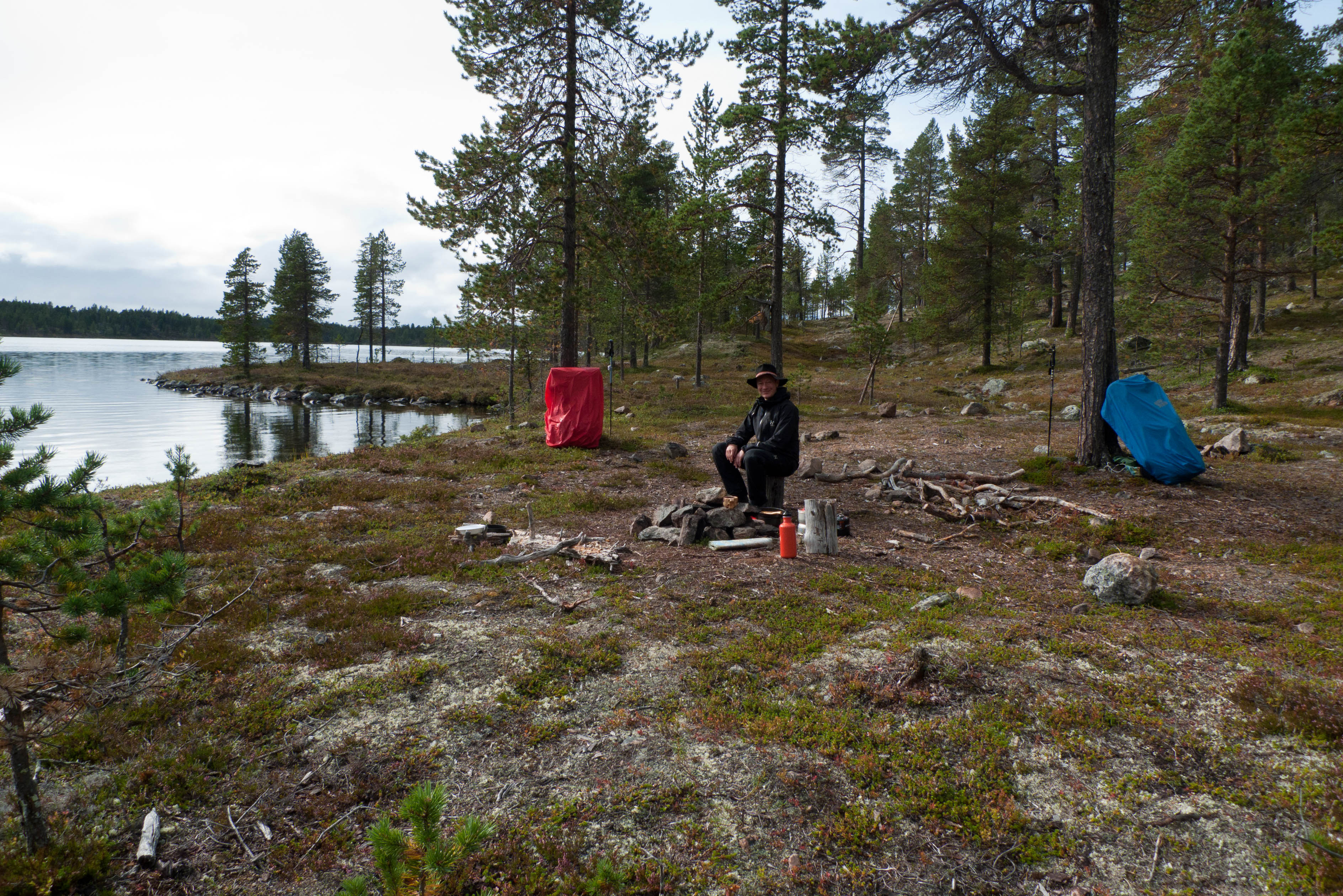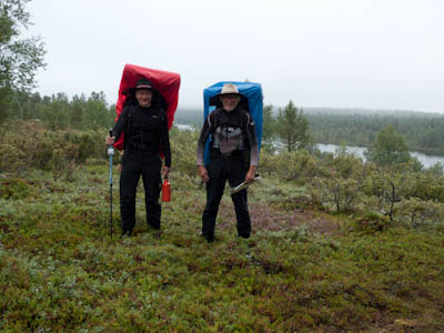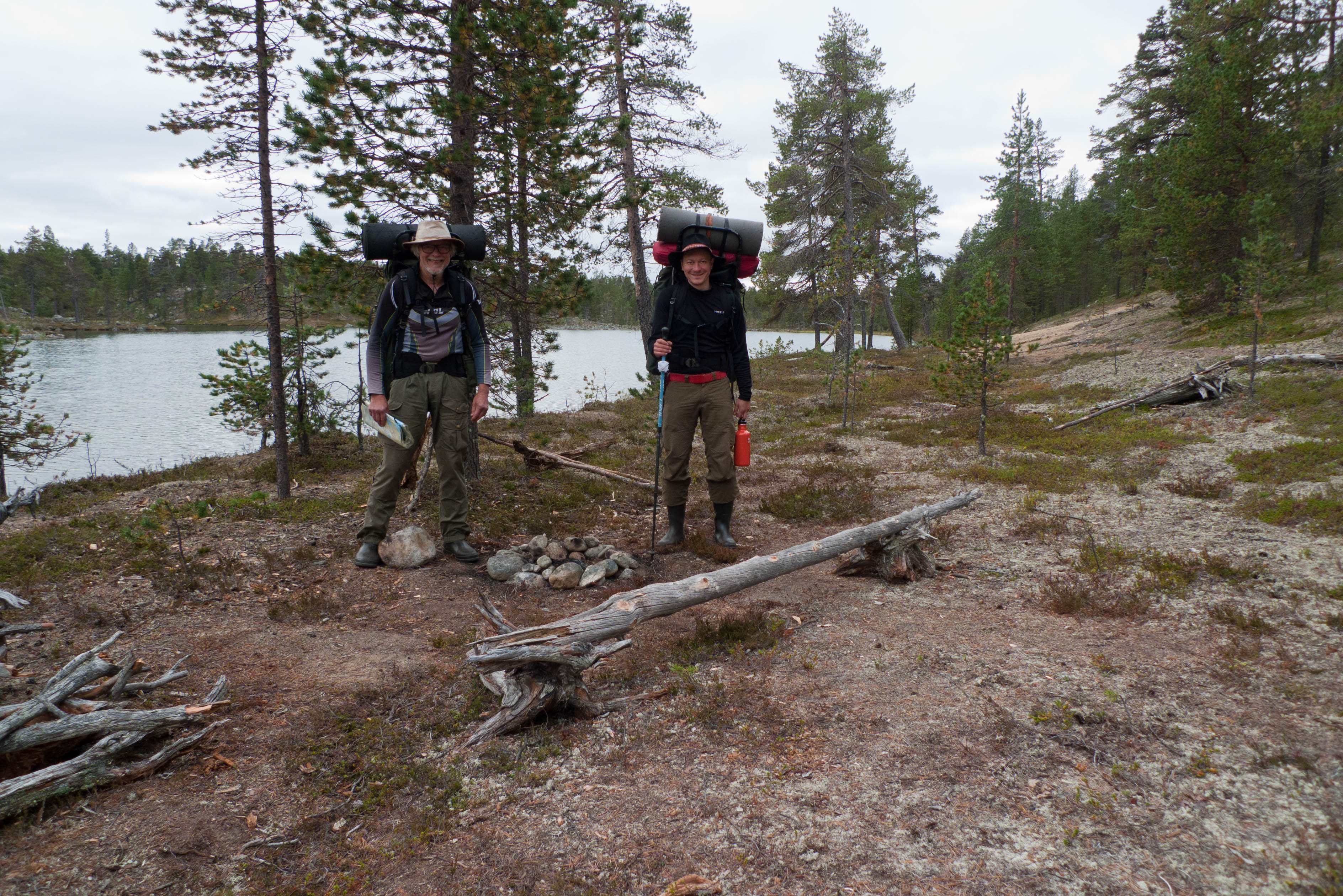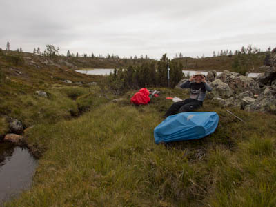 Aamu oli harmaa ja viileä mutta onneksi poutainen. Sateen mahdollisuuttakaan ei voinut sulkea pois. Vedettiin sadesuojat rinkkojen päälle ja lähdettiin melko poikkeuksellisesti liikkeelle sadeasuissa. Tavoitteena oli Surnujärven vuonomainen lahdelma, johon laskee pieni puro Lujapuolijärvestä. Ensin mentiin vähän matkaa Aittajärven rantaa etelään ja sitten lähdettiin pikkuhiljaa nousemaan Kallopään rinnettä kaakkoon. Kun päästiin paljakalle käännettiin nokka itään ja siitä Kallopään pohjoiskärjen yli kohti Äälisjärven eteläkärkeä. Rinteeltä näkuyi paljon pieniä järviä, joista yhden rannalla laskettiin rinkat hetkeksi maahan ja syötiin kuivahedelmiä. Äälisjärven eteläisimmän lahden rannalla oli yksityinen mökki, jota ei ollut merkitty Karttakeskuksen paperikarttaan, vaikka näkyy monissa sähköisissä aineistoissa. Jatkettiin itään päin Surnujärvelle asti. Rannasta ei löytynyt teltan paikkoja, mutta pienen hakemisen jälkeen löydettiin hyvä teltan paikka vähän ylempää pienen puron läheltä. Mukavuudenhaluinen retkeilijä kun ei halua hakea vettä toista sataa metriä jyrkkää rinnettä alas-ylös. Sen paremmin vastaranta kuin lahden peräosa eivät näyttäneet kummoisilta telttailumaastoila. Ruuan jälkeen alkoi ramasemaan oikein kunnolla ja mentiin telttaan ottamaan pienet päikkärit, jotka venyivät yli tunnin mittaisiksi ja päättyivät siihen, kun sade alkoi rummuttamaan teltan kattoa. Ei kuitenkaan jääty telttaan sadetta pitämään, vaan puettiin sään mukaiset asusteet ylle ja lähdettiin kalaan. Hyvä tovi kalastettiin, mutta saaliksi saatiin vain nakin mittainen hauki. Sateen hieman hellittäessä lähdettiin kunnianhimoisesti väsäämään iltanuotiota tihkusateessa. Onneksi löytyi hieman tervasta, joka saatiin kuin saatiinkin syttymään. Puron notko suojasi sopivasti tuulelta ja tuntui, että se jopa hillitsi vähän nuotioon osuvaa tihkusadetta. Lopulta oli kuitenkin pakko vetäytyä yöpuulle. Pinnasta likomärät goreteksit aseteltiin mahdollisimman väljästi absidien suojiin ja toivottiin, että aamulla olisi vähän kuivempaa ja lämpimämpää keliä.