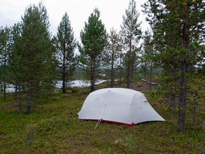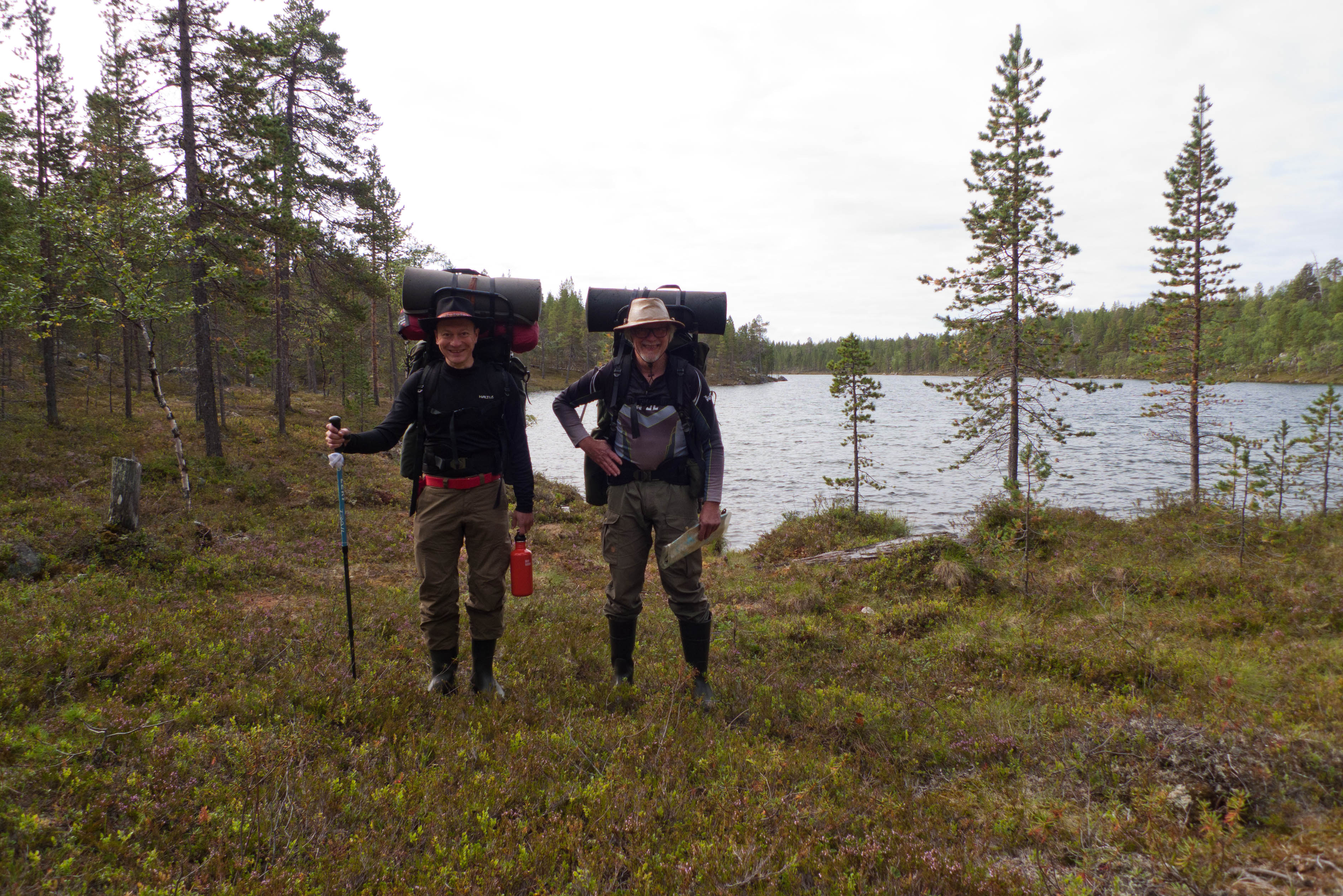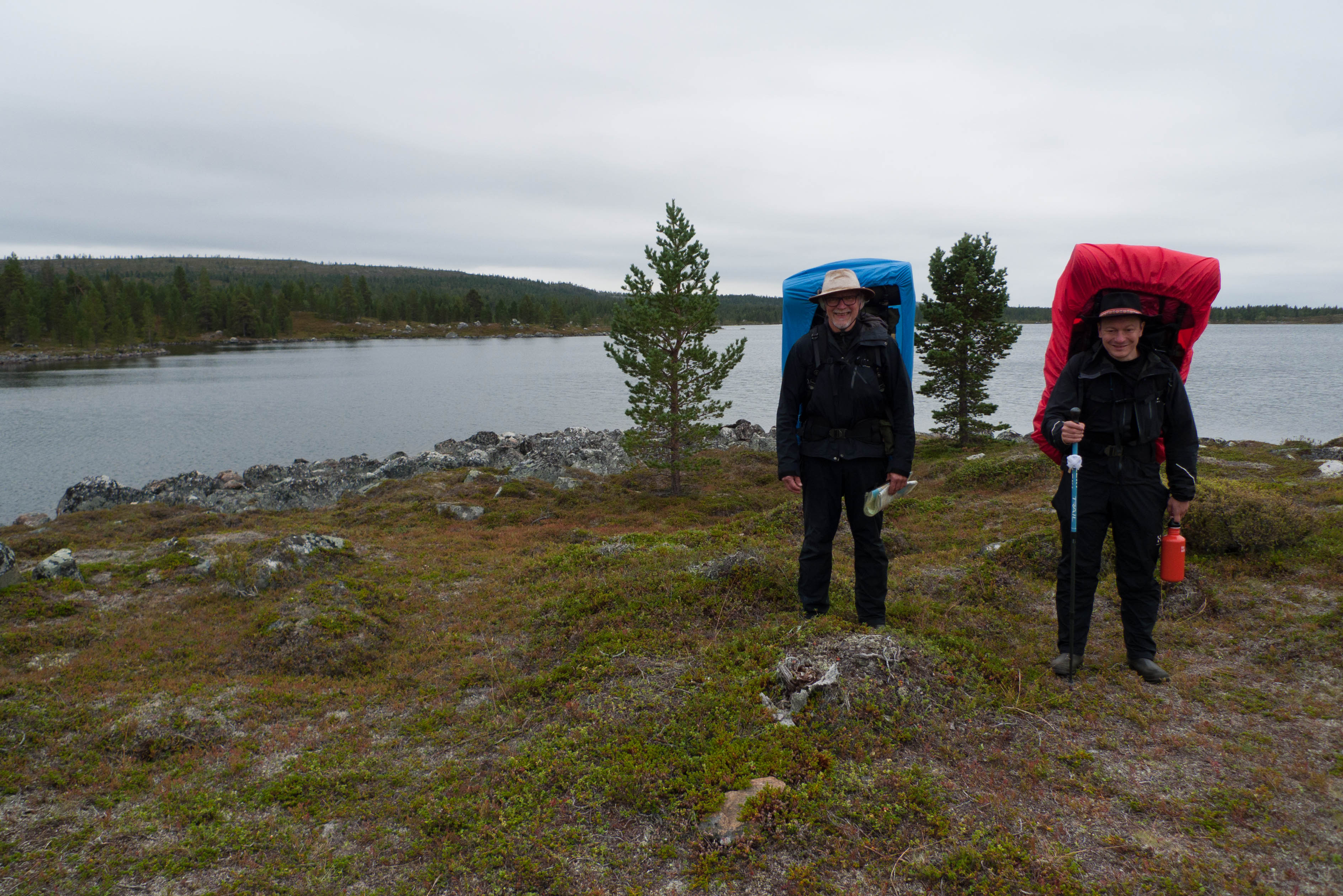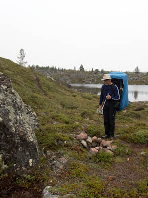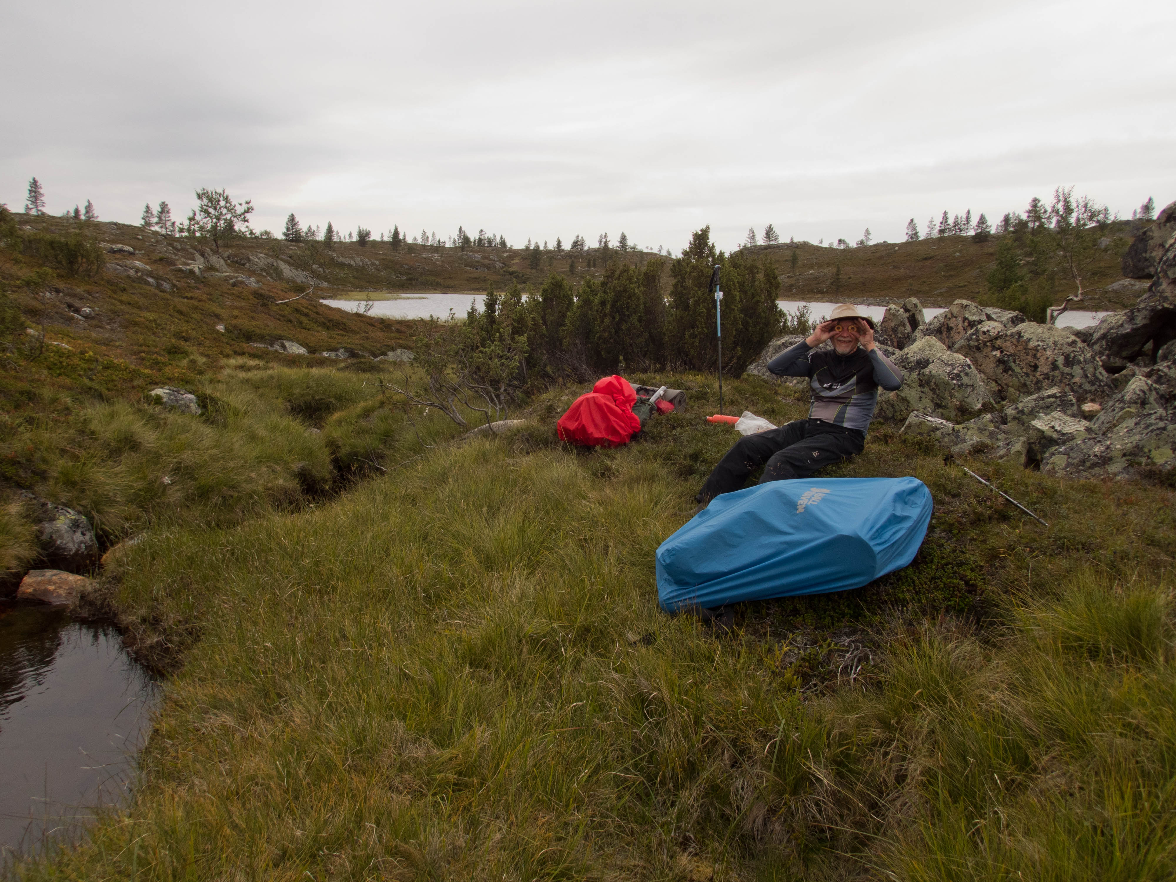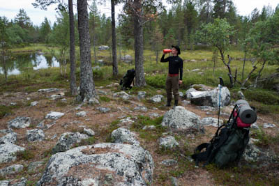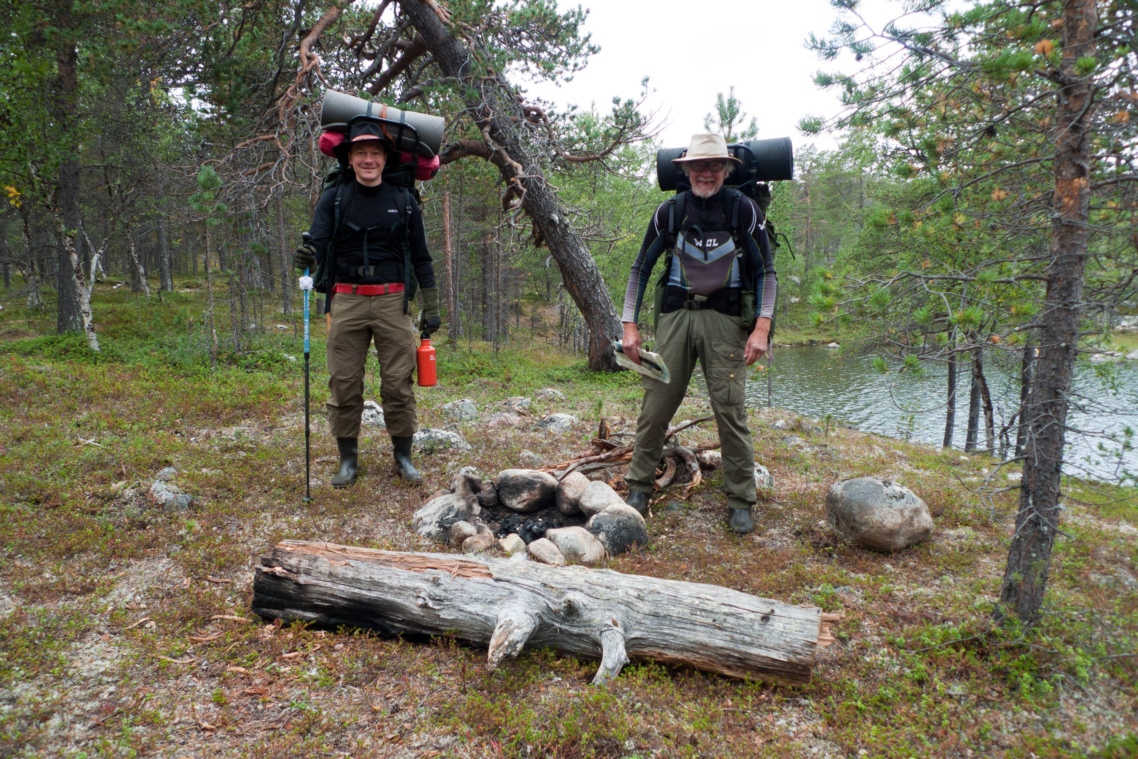 Aamu oli harmaa ja viileä mutta onneksi poutainen. Sateen mahdollisuuttakaan ei voinut sulkea pois. Vedettiin sadesuojat rinkkojen päälle ja lähdettiin melko poikkeuksellisesti liikkeelle sadeasuissa. Tavoitteena oli Surnujärven vuonomainen lahdelma, johon laskee pieni puro Lujapuolijärvestä. Ensin mentiin vähän matkaa Aittajärven rantaa etelään ja sitten lähdettiin pikkuhiljaa nousemaan Kallopään rinnettä kaakkoon. Kun päästiin paljakalle käännettiin nokka itään ja siitä Kallopään pohjoiskärjen yli kohti Äälisjärven eteläkärkeä. Rinteeltä näkuyi paljon pieniä järviä, joista yhden rannalla laskettiin rinkat hetkeksi maahan ja syötiin kuivahedelmiä. Äälisjärven eteläisimmän lahden rannalla oli yksityinen mökki, jota ei ollut merkitty Karttakeskuksen paperikarttaan, vaikka näkyy monissa sähköisissä aineistoissa. Jatkettiin itään päin Surnujärvelle asti. Rannasta ei löytynyt teltan paikkoja, mutta pienen hakemisen jälkeen löydettiin hyvä teltan paikka vähän ylempää pienen puron läheltä. Mukavuudenhaluinen retkeilijä kun ei halua hakea vettä toista sataa metriä jyrkkää rinnettä alas-ylös. Sen paremmin vastaranta kuin lahden peräosa eivät näyttäneet kummoisilta telttailumaastoila. Ruuan jälkeen alkoi ramasemaan oikein kunnolla ja mentiin telttaan ottamaan pienet päikkärit, jotka venyivät yli tunnin mittaisiksi ja päättyivät siihen, kun sade alkoi rummuttamaan teltan kattoa. Ei kuitenkaan jääty telttaan sadetta pitämään, vaan puettiin sään mukaiset asusteet ylle ja lähdettiin kalaan. Hyvä tovi kalastettiin, mutta saaliksi saatiin vain nakin mittainen hauki. Sateen hieman hellittäessä lähdettiin kunnianhimoisesti väsäämään iltanuotiota tihkusateessa. Onneksi löytyi hieman tervasta, joka saatiin kuin saatiinkin syttymään. Puron notko suojasi sopivasti tuulelta ja tuntui, että se jopa hillitsi vähän nuotioon osuvaa tihkusadetta. Lopulta oli kuitenkin pakko vetäytyä yöpuulle. Pinnasta likomärät goreteksit aseteltiin mahdollisimman väljästi absidien suojiin ja toivottiin, että aamulla olisi vähän kuivempaa ja lämpimämpää keliä.