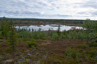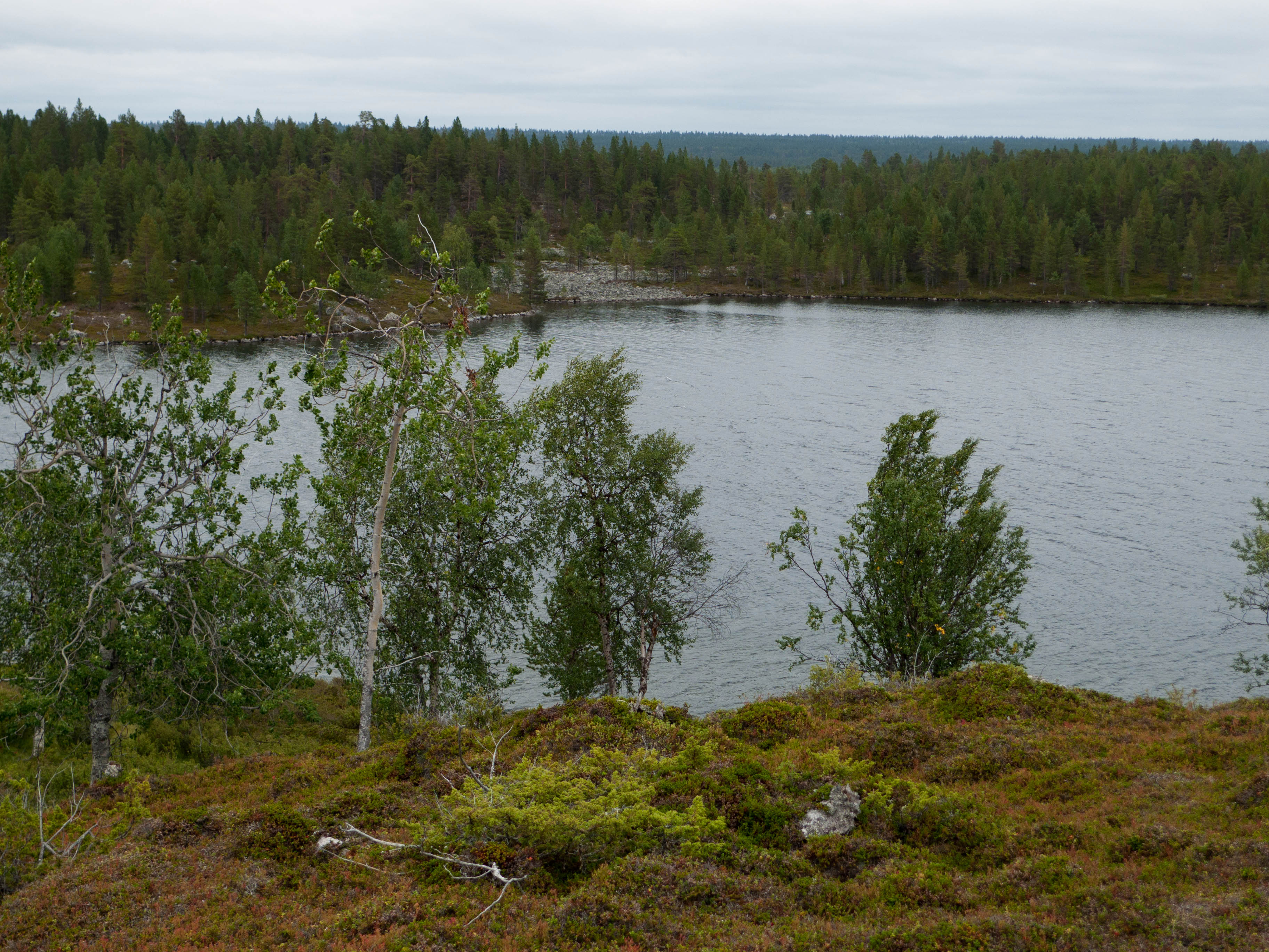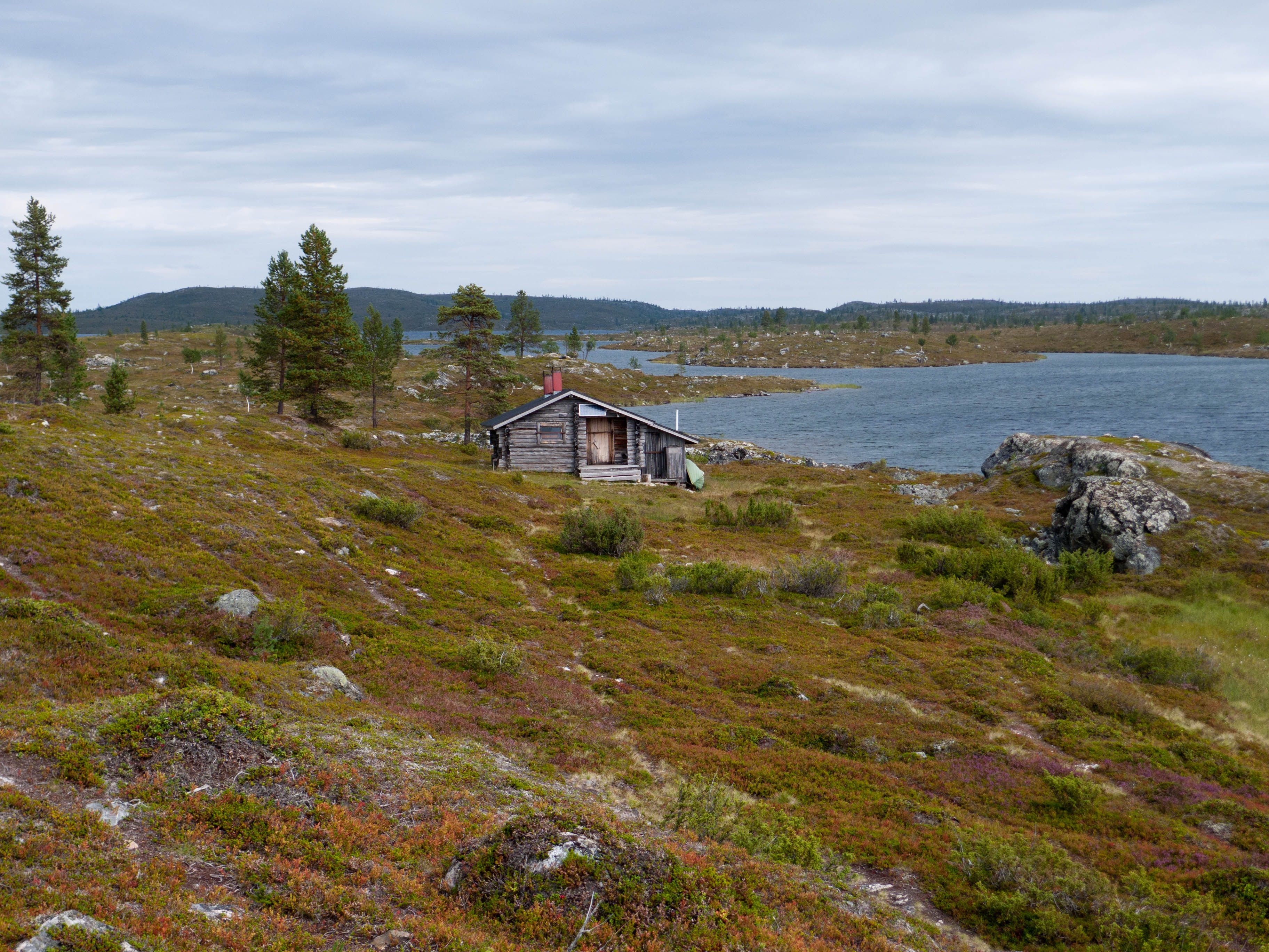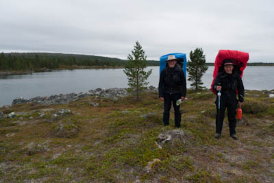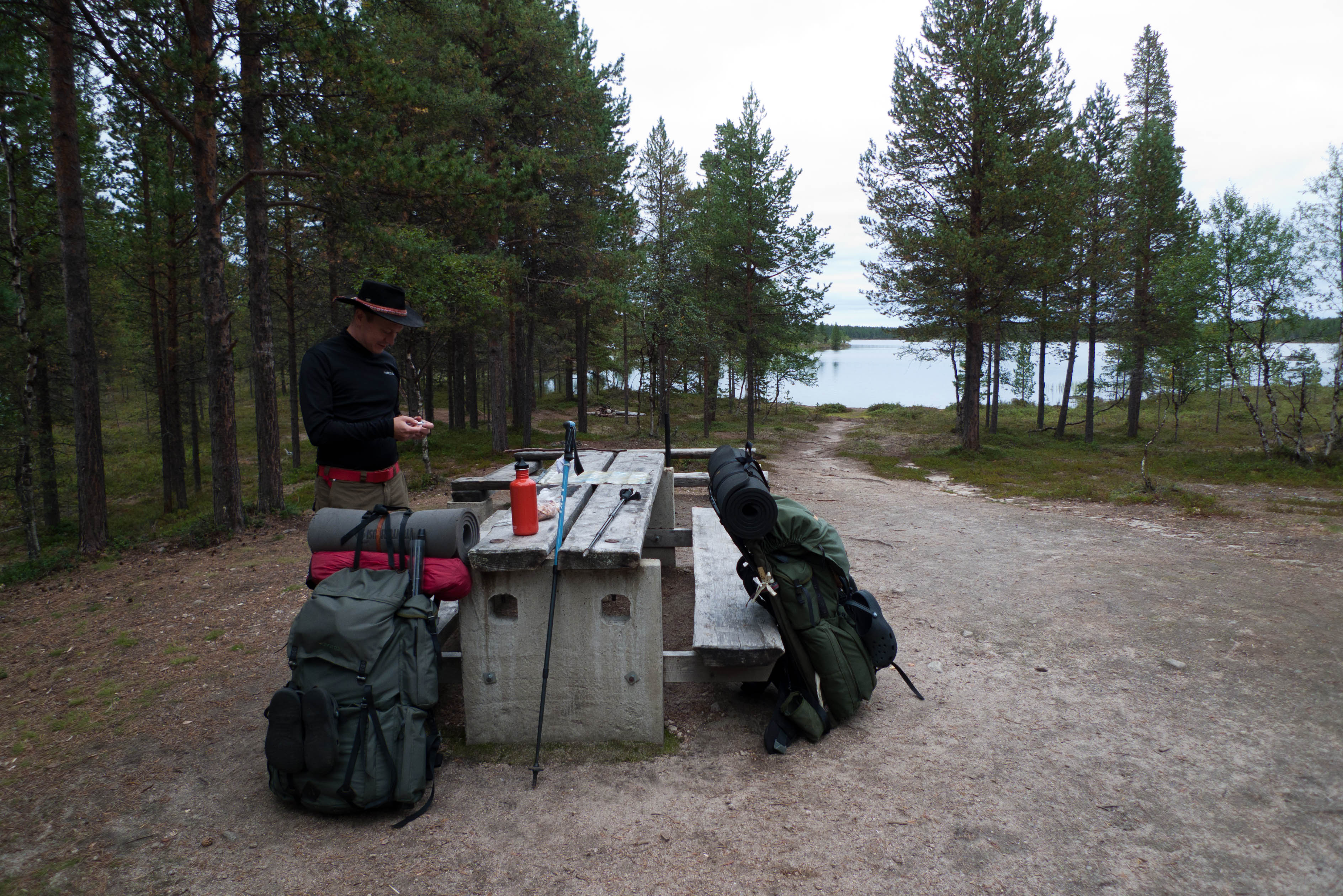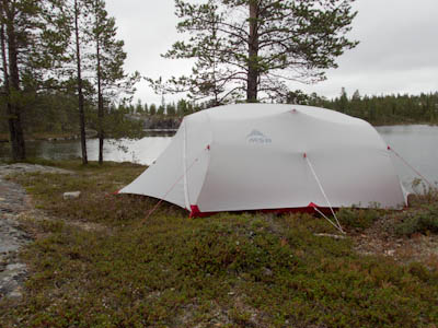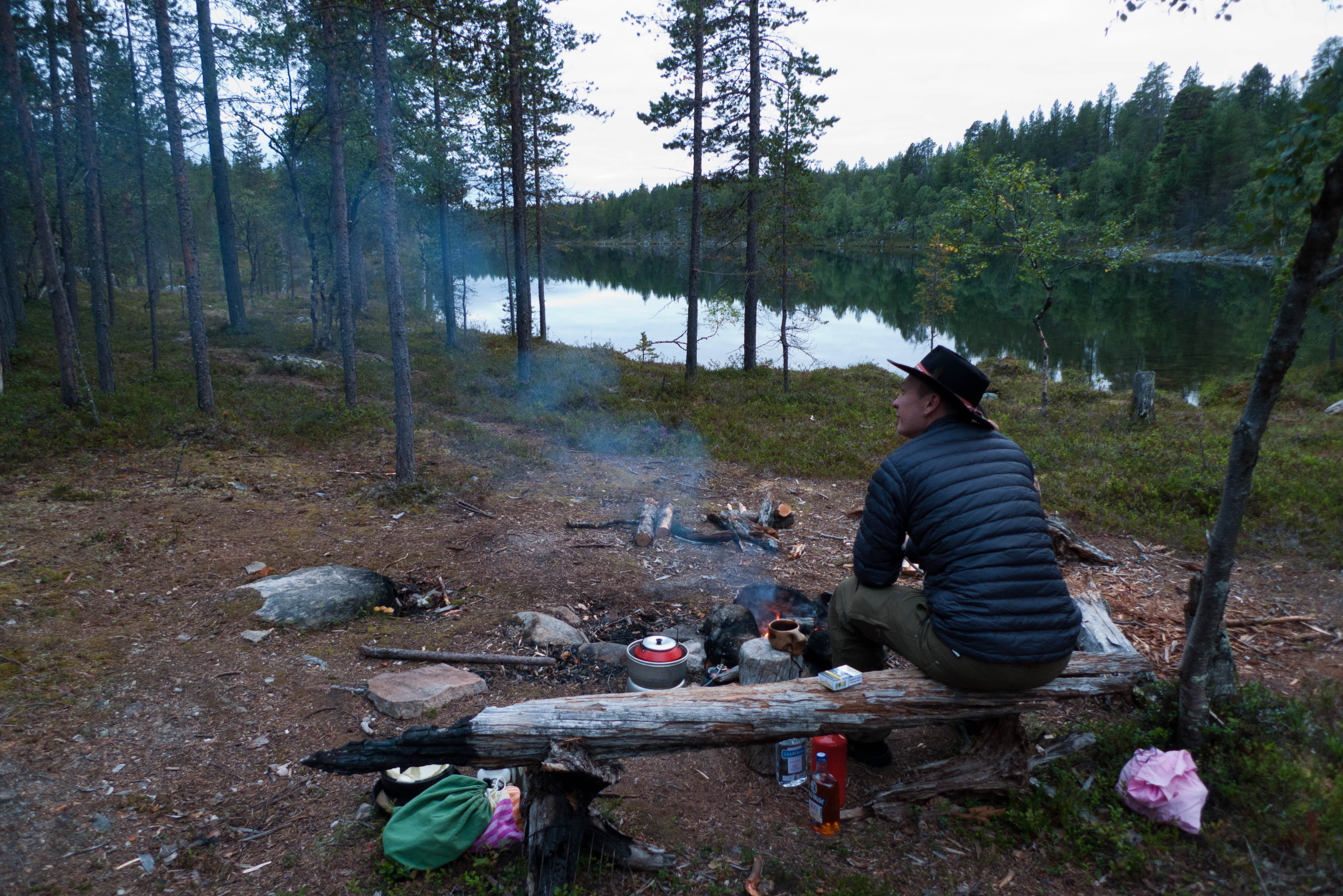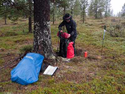 Aamu oli harmaa ja viileä mutta onneksi poutainen. Sateen mahdollisuuttakaan ei voinut sulkea pois. Vedettiin sadesuojat rinkkojen päälle ja lähdettiin melko poikkeuksellisesti liikkeelle sadeasuissa. Tavoitteena oli Surnujärven vuonomainen lahdelma, johon laskee pieni puro Lujapuolijärvestä. Ensin mentiin vähän matkaa Aittajärven rantaa etelään ja sitten lähdettiin pikkuhiljaa nousemaan Kallopään rinnettä kaakkoon. Kun päästiin paljakalle käännettiin nokka itään ja siitä Kallopään pohjoiskärjen yli kohti Äälisjärven eteläkärkeä. Rinteeltä näkuyi paljon pieniä järviä, joista yhden rannalla laskettiin rinkat hetkeksi maahan ja syötiin kuivahedelmiä. Äälisjärven eteläisimmän lahden rannalla oli yksityinen mökki, jota ei ollut merkitty Karttakeskuksen paperikarttaan, vaikka näkyy monissa sähköisissä aineistoissa. Jatkettiin itään päin Surnujärvelle asti. Rannasta ei löytynyt teltan paikkoja, mutta pienen hakemisen jälkeen löydettiin hyvä teltan paikka vähän ylempää pienen puron läheltä. Mukavuudenhaluinen retkeilijä kun ei halua hakea vettä toista sataa metriä jyrkkää rinnettä alas-ylös. Sen paremmin vastaranta kuin lahden peräosa eivät näyttäneet kummoisilta telttailumaastoila. Ruuan jälkeen alkoi ramasemaan oikein kunnolla ja mentiin telttaan ottamaan pienet päikkärit, jotka venyivät yli tunnin mittaisiksi ja päättyivät siihen, kun sade alkoi rummuttamaan teltan kattoa. Ei kuitenkaan jääty telttaan sadetta pitämään, vaan puettiin sään mukaiset asusteet ylle ja lähdettiin kalaan. Hyvä tovi kalastettiin, mutta saaliksi saatiin vain nakin mittainen hauki. Sateen hieman hellittäessä lähdettiin kunnianhimoisesti väsäämään iltanuotiota tihkusateessa. Onneksi löytyi hieman tervasta, joka saatiin kuin saatiinkin syttymään. Puron notko suojasi sopivasti tuulelta ja tuntui, että se jopa hillitsi vähän nuotioon osuvaa tihkusadetta. Lopulta oli kuitenkin pakko vetäytyä yöpuulle. Pinnasta likomärät goreteksit aseteltiin mahdollisimman väljästi absidien suojiin ja toivottiin, että aamulla olisi vähän kuivempaa ja lämpimämpää keliä.