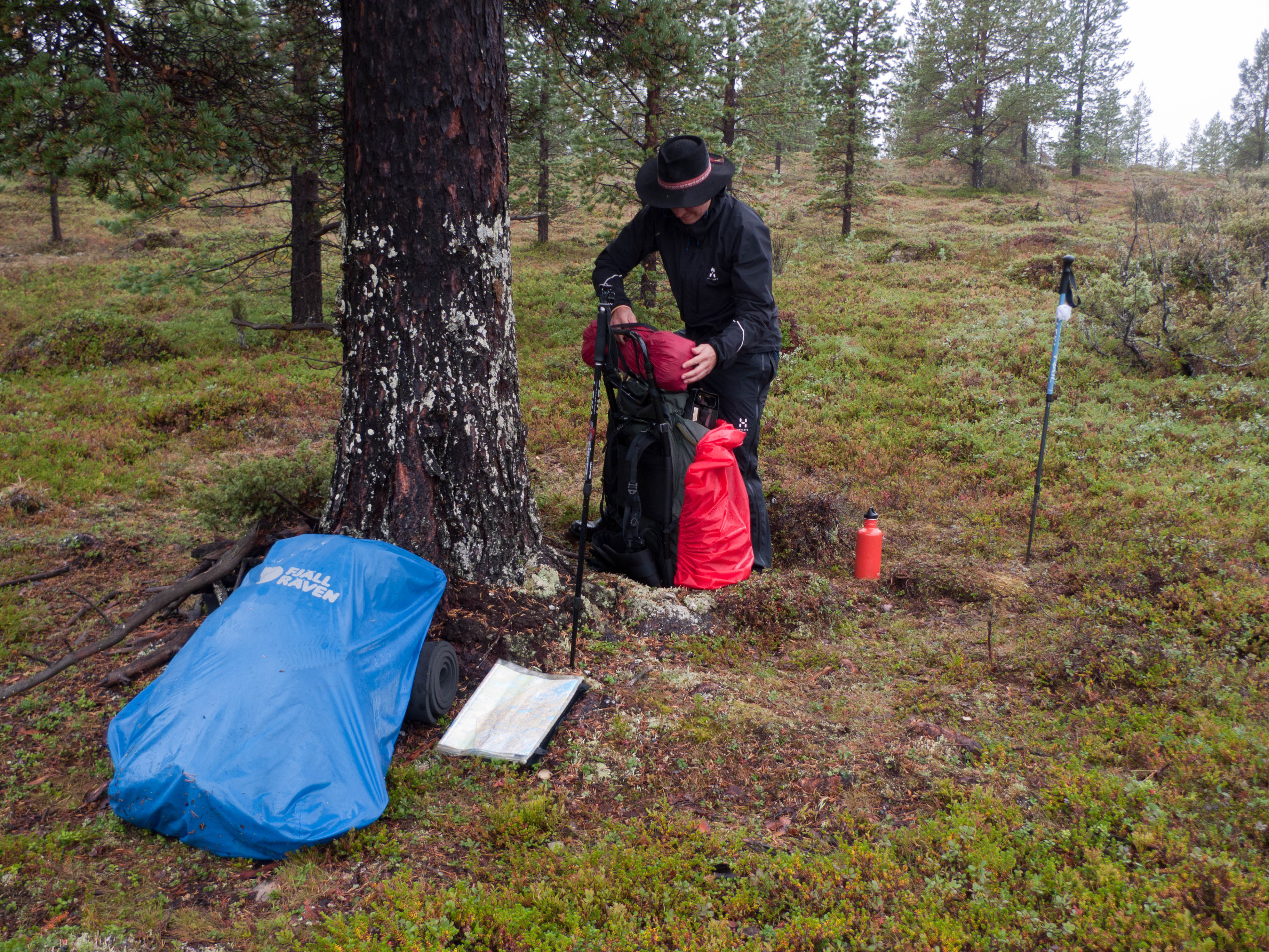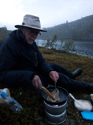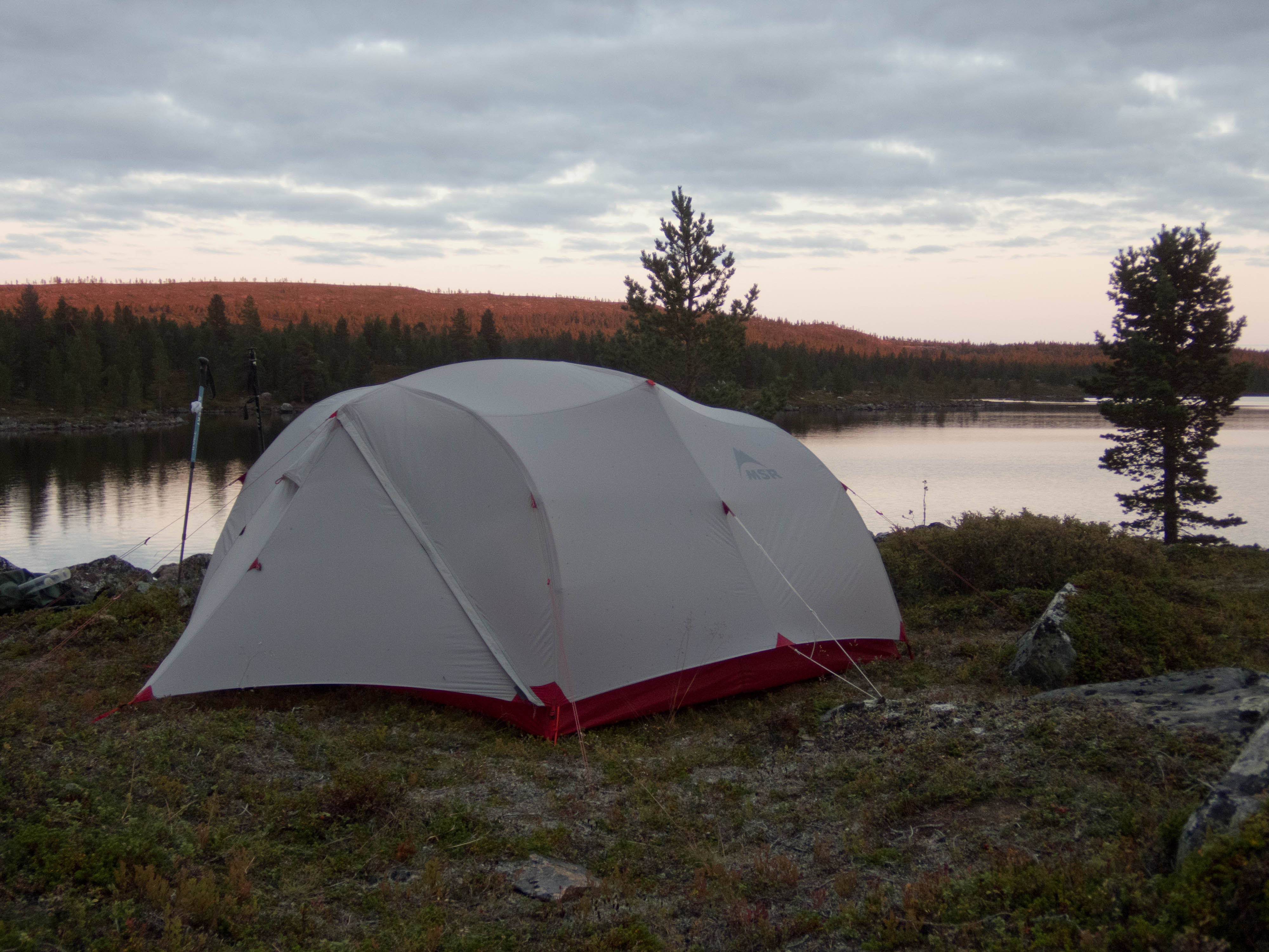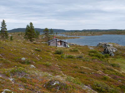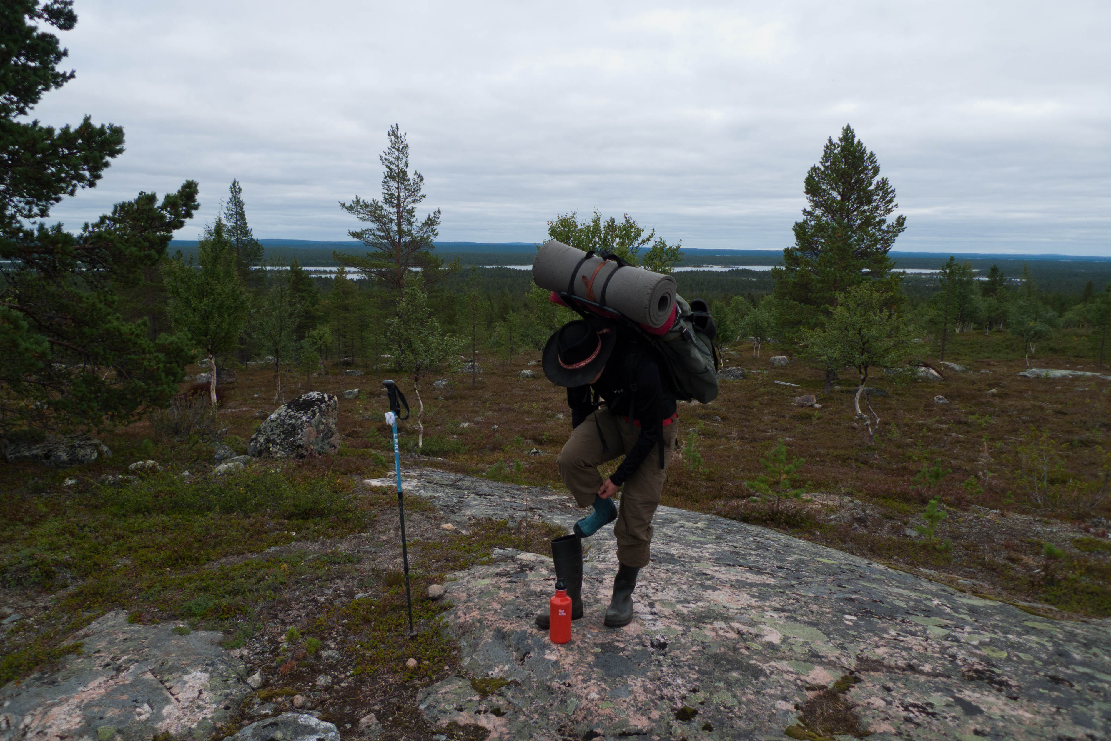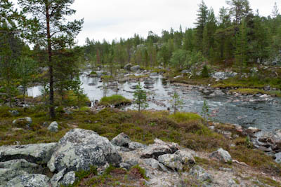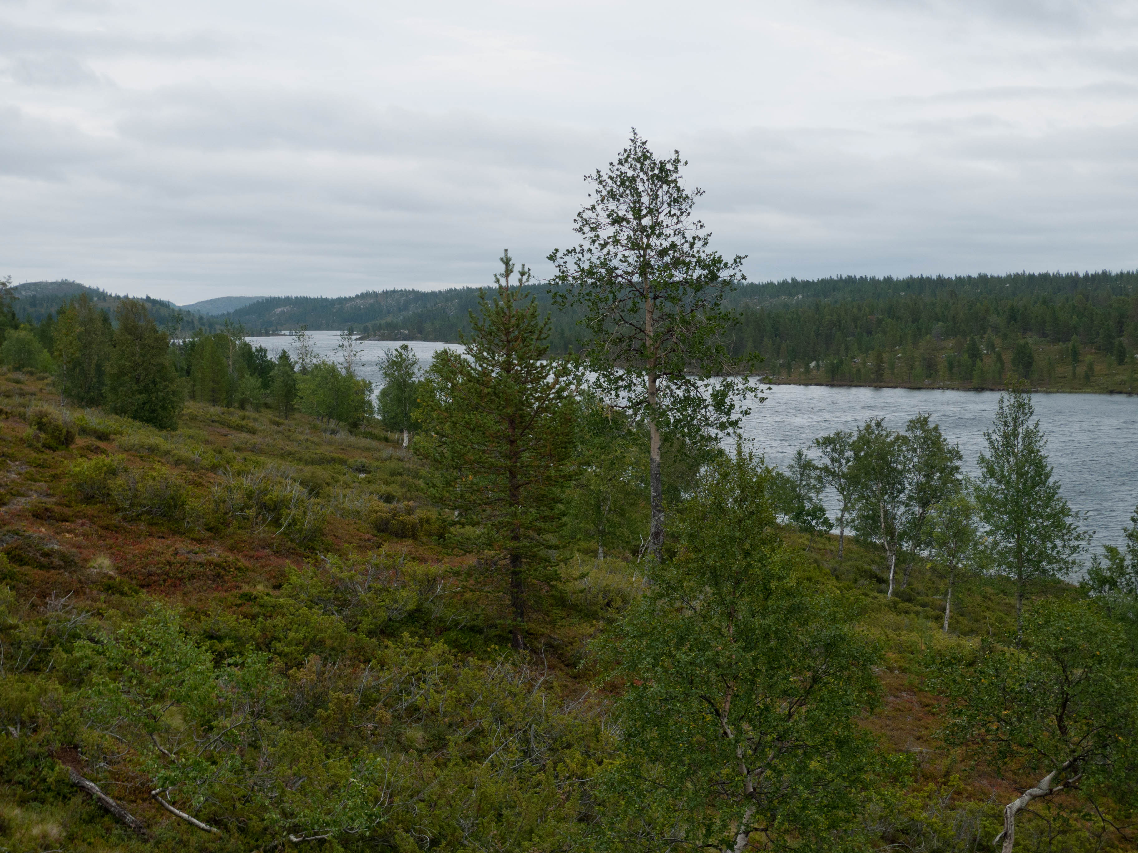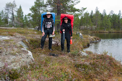 Aamu oli harmaa ja viileä mutta onneksi poutainen. Sateen mahdollisuuttakaan ei voinut sulkea pois. Vedettiin sadesuojat rinkkojen päälle ja lähdettiin melko poikkeuksellisesti liikkeelle sadeasuissa. Tavoitteena oli Surnujärven vuonomainen lahdelma, johon laskee pieni puro Lujapuolijärvestä. Ensin mentiin vähän matkaa Aittajärven rantaa etelään ja sitten lähdettiin pikkuhiljaa nousemaan Kallopään rinnettä kaakkoon. Kun päästiin paljakalle käännettiin nokka itään ja siitä Kallopään pohjoiskärjen yli kohti Äälisjärven eteläkärkeä. Rinteeltä näkuyi paljon pieniä järviä, joista yhden rannalla laskettiin rinkat hetkeksi maahan ja syötiin kuivahedelmiä. Äälisjärven eteläisimmän lahden rannalla oli yksityinen mökki, jota ei ollut merkitty Karttakeskuksen paperikarttaan, vaikka näkyy monissa sähköisissä aineistoissa. Jatkettiin itään päin Surnujärvelle asti. Rannasta ei löytynyt teltan paikkoja, mutta pienen hakemisen jälkeen löydettiin hyvä teltan paikka vähän ylempää pienen puron läheltä. Mukavuudenhaluinen retkeilijä kun ei halua hakea vettä toista sataa metriä jyrkkää rinnettä alas-ylös. Sen paremmin vastaranta kuin lahden peräosa eivät näyttäneet kummoisilta telttailumaastoila. Ruuan jälkeen alkoi ramasemaan oikein kunnolla ja mentiin telttaan ottamaan pienet päikkärit, jotka venyivät yli tunnin mittaisiksi ja päättyivät siihen, kun sade alkoi rummuttamaan teltan kattoa. Ei kuitenkaan jääty telttaan sadetta pitämään, vaan puettiin sään mukaiset asusteet ylle ja lähdettiin kalaan. Hyvä tovi kalastettiin, mutta saaliksi saatiin vain nakin mittainen hauki. Sateen hieman hellittäessä lähdettiin kunnianhimoisesti väsäämään iltanuotiota tihkusateessa. Onneksi löytyi hieman tervasta, joka saatiin kuin saatiinkin syttymään. Puron notko suojasi sopivasti tuulelta ja tuntui, että se jopa hillitsi vähän nuotioon osuvaa tihkusadetta. Lopulta oli kuitenkin pakko vetäytyä yöpuulle. Pinnasta likomärät goreteksit aseteltiin mahdollisimman väljästi absidien suojiin ja toivottiin, että aamulla olisi vähän kuivempaa ja lämpimämpää keliä.