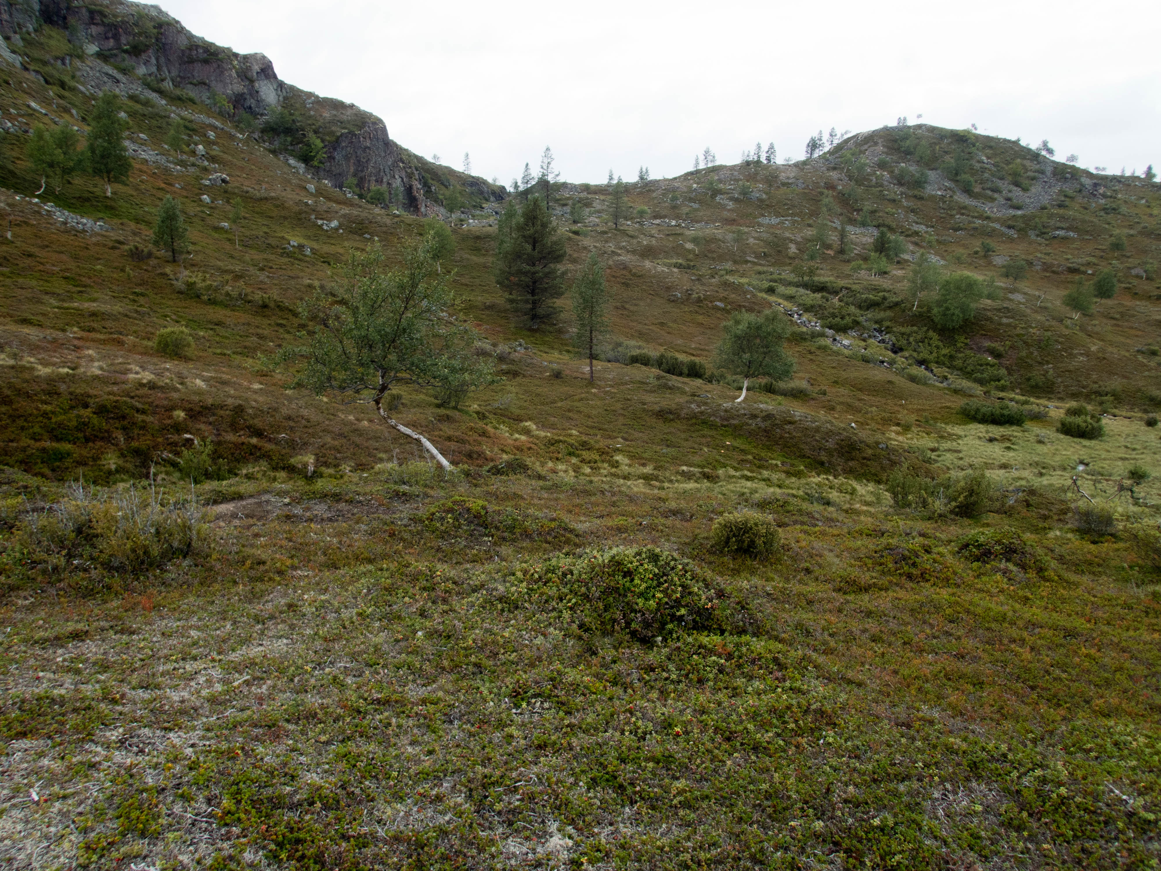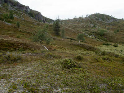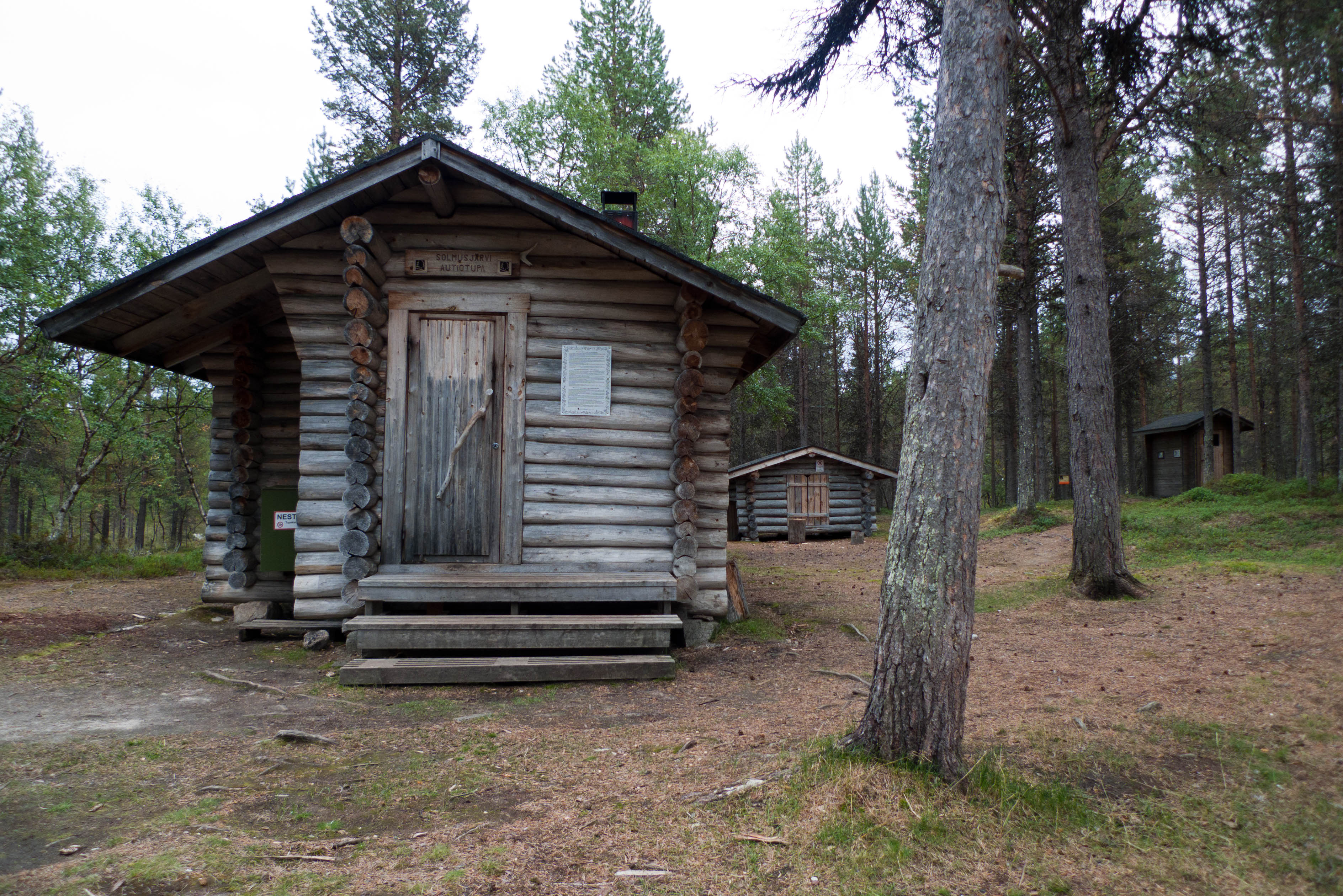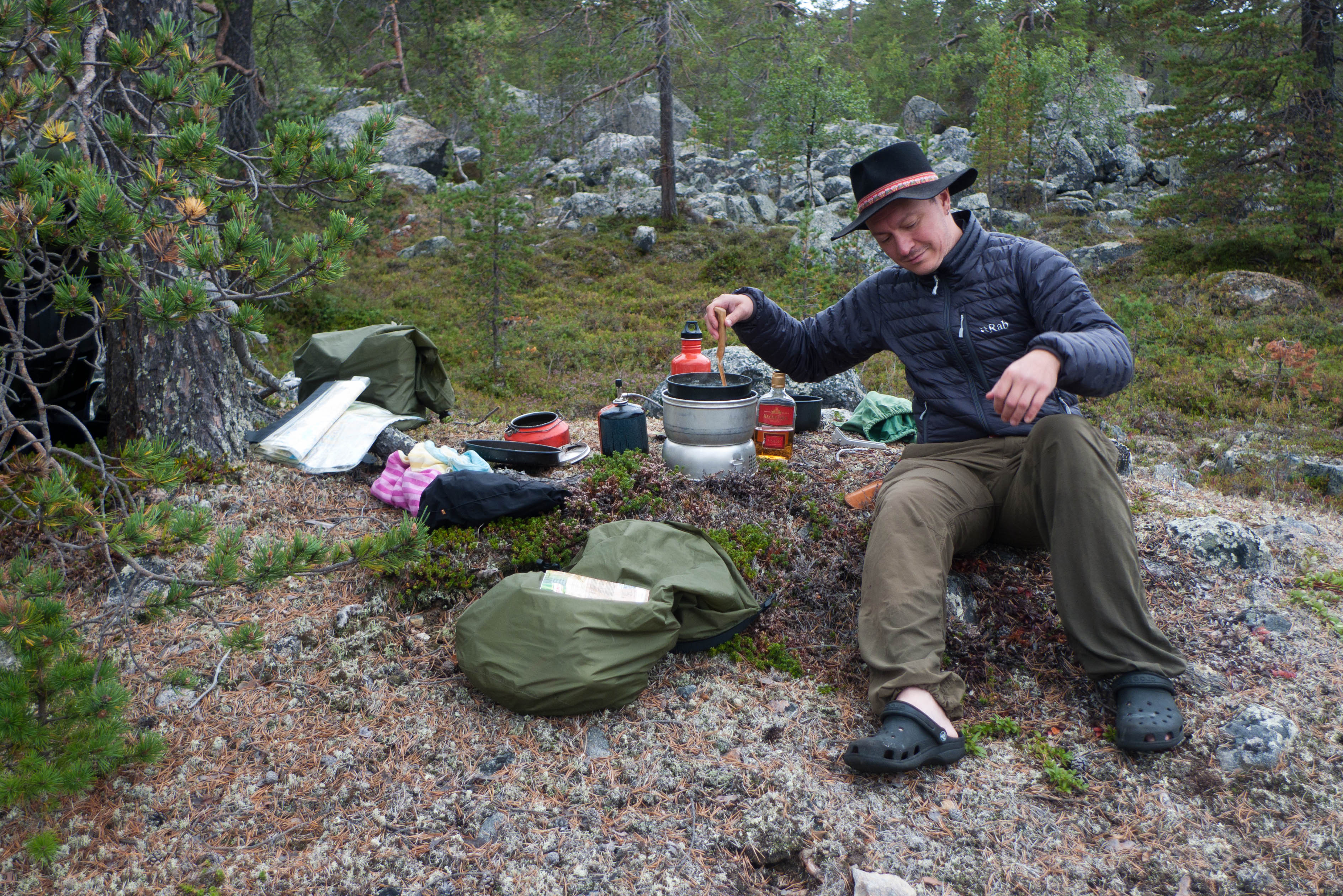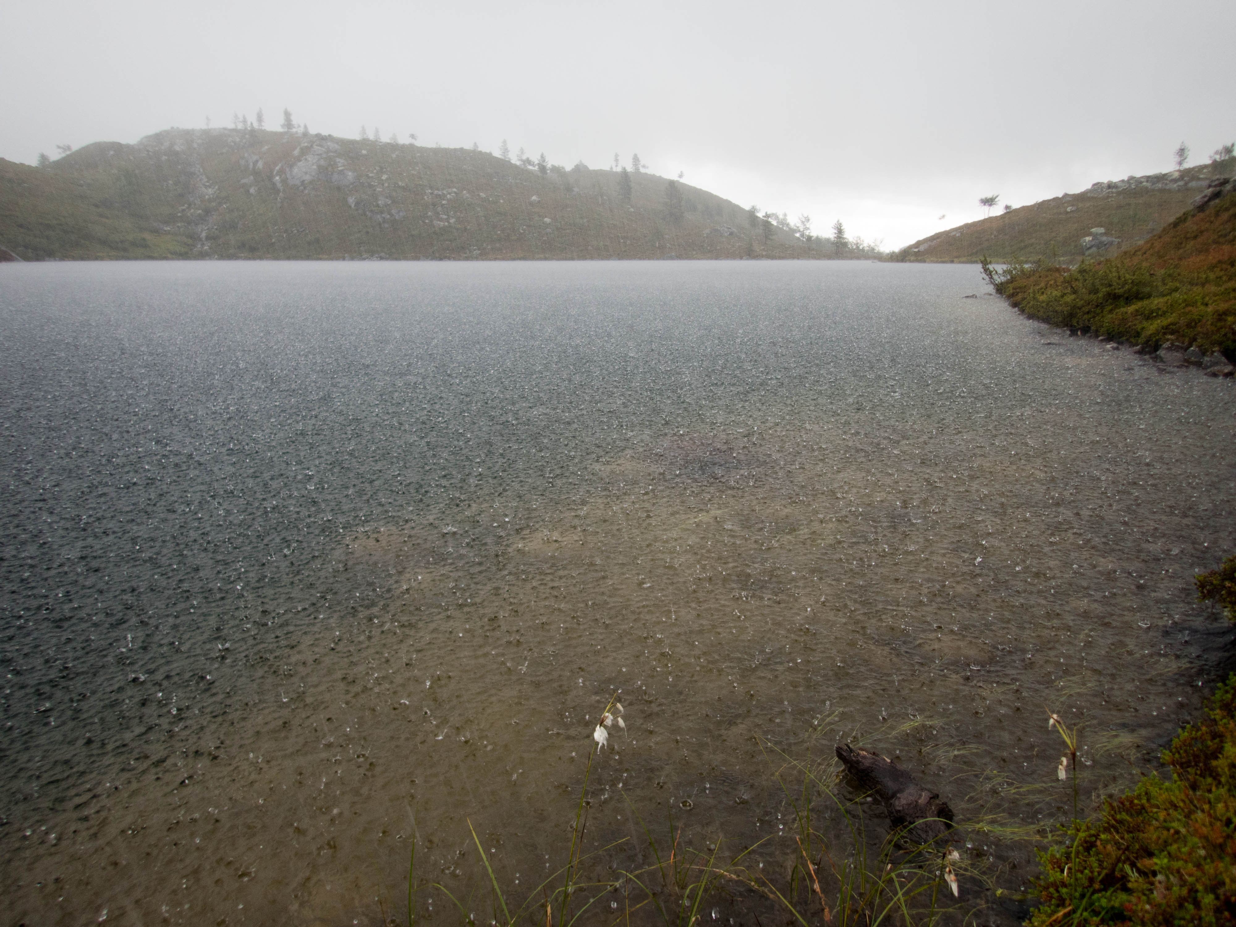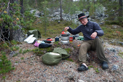 Aamu oli harmaa ja viileä mutta onneksi poutainen. Sateen mahdollisuuttakaan ei voinut sulkea pois. Vedettiin sadesuojat rinkkojen päälle ja lähdettiin melko poikkeuksellisesti liikkeelle sadeasuissa. Tavoitteena oli Surnujärven vuonomainen lahdelma, johon laskee pieni puro Lujapuolijärvestä. Ensin mentiin vähän matkaa Aittajärven rantaa etelään ja sitten lähdettiin pikkuhiljaa nousemaan Kallopään rinnettä kaakkoon. Kun päästiin paljakalle käännettiin nokka itään ja siitä Kallopään pohjoiskärjen yli kohti Äälisjärven eteläkärkeä. Rinteeltä näkuyi paljon pieniä järviä, joista yhden rannalla laskettiin rinkat hetkeksi maahan ja syötiin kuivahedelmiä. Äälisjärven eteläisimmän lahden rannalla oli yksityinen mökki, jota ei ollut merkitty Karttakeskuksen paperikarttaan, vaikka näkyy monissa sähköisissä aineistoissa. Jatkettiin itään päin Surnujärvelle asti. Rannasta ei löytynyt teltan paikkoja, mutta pienen hakemisen jälkeen löydettiin hyvä teltan paikka vähän ylempää pienen puron läheltä. Mukavuudenhaluinen retkeilijä kun ei halua hakea vettä toista sataa metriä jyrkkää rinnettä alas-ylös. Sen paremmin vastaranta kuin lahden peräosa eivät näyttäneet kummoisilta telttailumaastoila. Ruuan jälkeen alkoi ramasemaan oikein kunnolla ja mentiin telttaan ottamaan pienet päikkärit, jotka venyivät yli tunnin mittaisiksi ja päättyivät siihen, kun sade alkoi rummuttamaan teltan kattoa. Ei kuitenkaan jääty telttaan sadetta pitämään, vaan puettiin sään mukaiset asusteet ylle ja lähdettiin kalaan. Hyvä tovi kalastettiin, mutta saaliksi saatiin vain nakin mittainen hauki. Sateen hieman hellittäessä lähdettiin kunnianhimoisesti väsäämään iltanuotiota tihkusateessa. Onneksi löytyi hieman tervasta, joka saatiin kuin saatiinkin syttymään. Puron notko suojasi sopivasti tuulelta ja tuntui, että se jopa hillitsi vähän nuotioon osuvaa tihkusadetta. Lopulta oli kuitenkin pakko vetäytyä yöpuulle. Pinnasta likomärät goreteksit aseteltiin mahdollisimman väljästi absidien suojiin ja toivottiin, että aamulla olisi vähän kuivempaa ja lämpimämpää keliä.