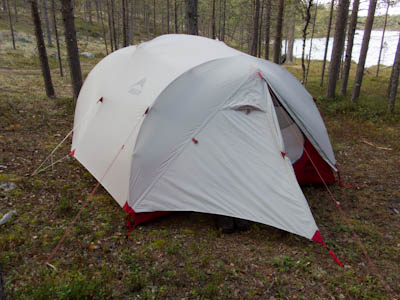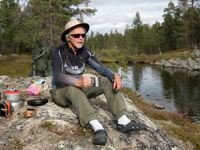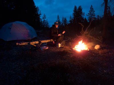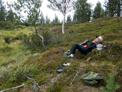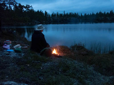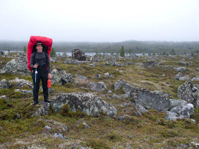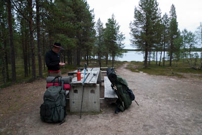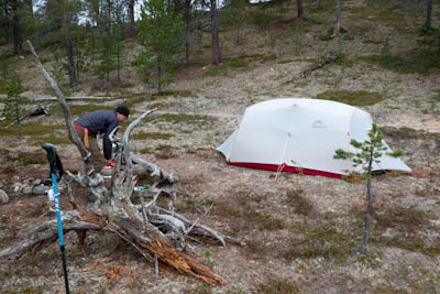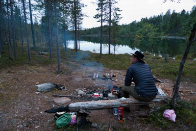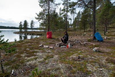 Ollaan tultu siihen pisteeseen, että nokka pitää kääntää kotia kohti. Lähdetään länttä kohti ja yritetään löytää helpot ylityspaikat kahdelle nimettömälle joelle, joista toinen laskee Isosta Rovijärvestä Ylimmäiseen Porijärveen ja toinen Tuulijärvestä Kärsilän Tuulijärveen. Ylitysten jälkeen ruvetaan etsimään leiripaikkaa. Suunnistus ei mennyt ihan putkeen. Kun mentiin ilman kompassia, erehdyttiin yhdestä järvestä ja tehtiin aika pitkä harharetki pohjoiseen ennen kuin päästiin takaisin kartalle. No, nähtiin vähän enemmän hienoja maisemia, mm. Kivisten ja Sorasten vanha Ford Transit. Ei mennyt ensimmäisen joen ylityskään ihan putkeen. Katsottiin, että ylitys onnistuu saappaat jalassa, mutta viimeinen kivi ennen vastarantaa olikin keikkukivi, joka suisti Juhon kyljelleen. Vähän mustelmia ja toinen saapas hörppäsi. Loppumatka etenikin ilman kommelluksia. Maasto oli pääosin kivistä ja vaikeakulkuista. Jankkilaan vievää polkua ylitettäessä oli hetkellisesti vähän hiekkaisempaa ja tasaisempaa. Päätimme käydä katsastamassa Kärsilän Tuulijärvelle pistävän niemen josko sieltä löytyisi joku teltan paikka. Alue osittautuikin varsinaiseksi leirintäalueeksi monine nuotiopaikkoineen. Joku oli kyhännyt sinne oikein saunankin, vain pressu puuttui. Pystytimme teltan lähelle niemen kärkeä, mutta järveltä puhaltava kylmä tuuli ajoi meidät iltanuotiolle vähän loitommalle. Alueen ahkerasta käytöstä kieli myös irtonaisten polttopuiksi kelpaavien oksien vähyys. Ennen illanistujaisia käytiin kalalla, mutta syönti oli olematonta, kuten yleensäkin tuulisella ilmalla. Tuikkeja ei näkynyt edes tuulelta suojassa olevissa poukamissa.