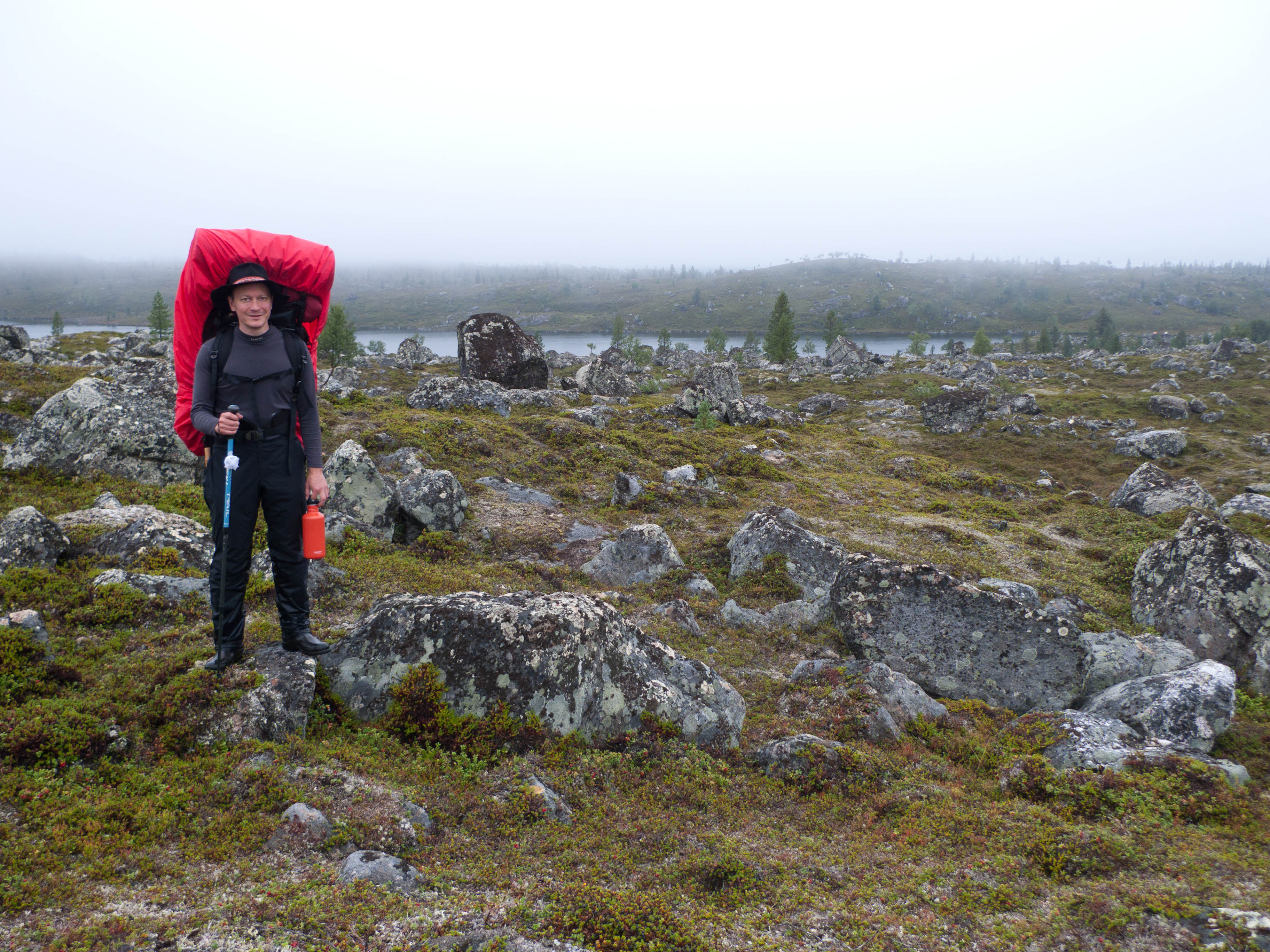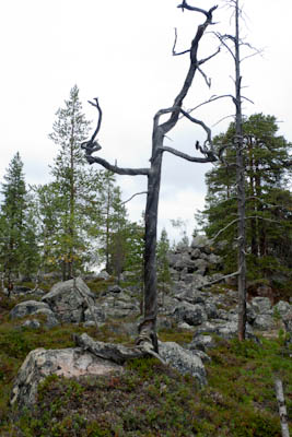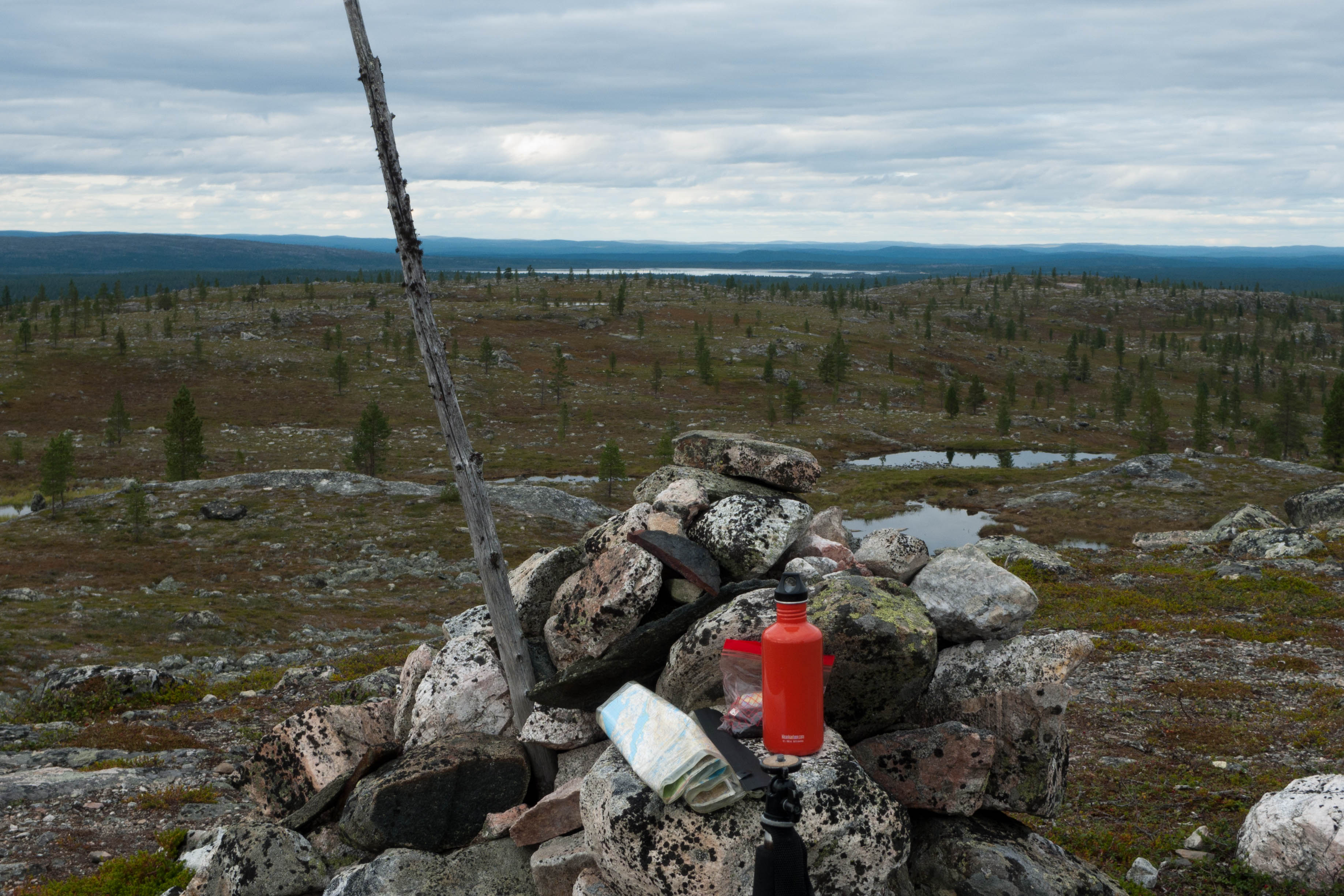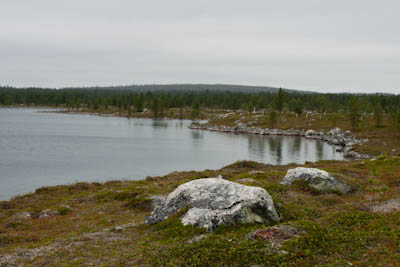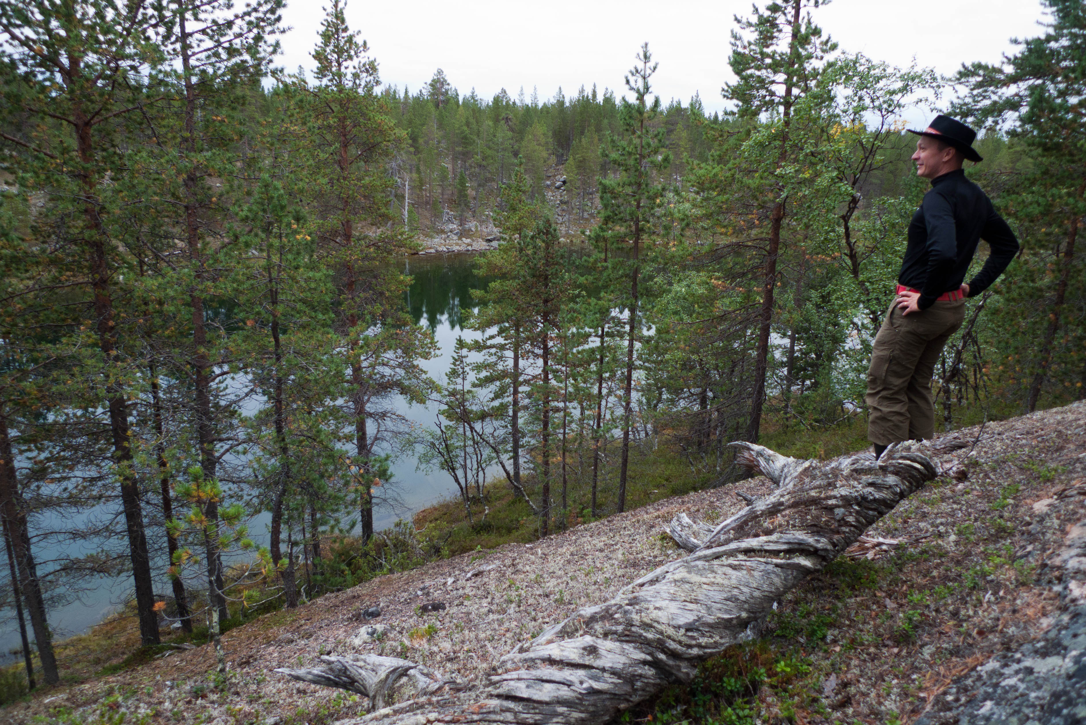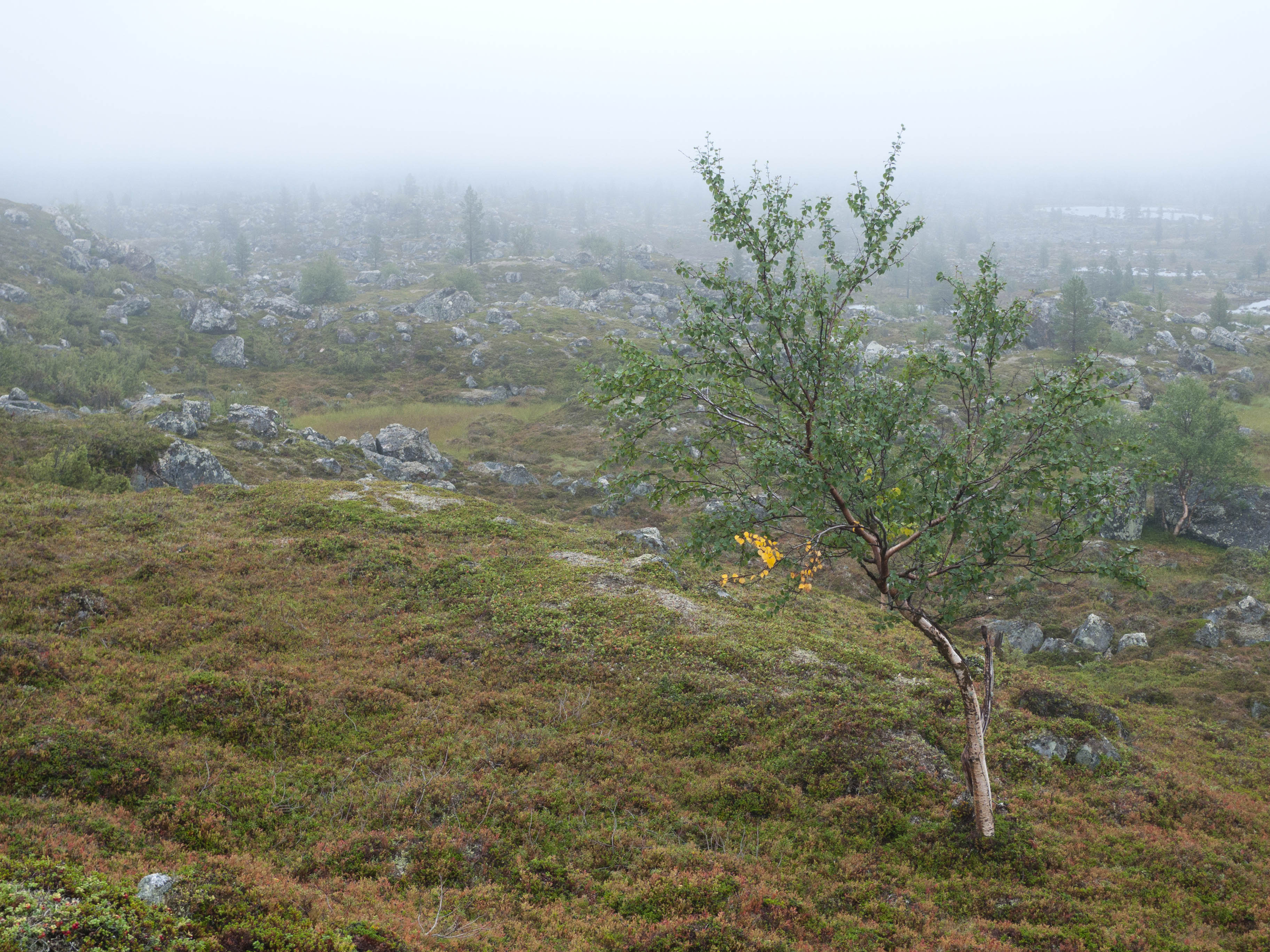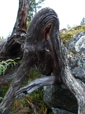 Aamu oli edellisen kaltainen. Sumu oli niin sakeaa, että näkyvyyttä oli vain pari sataa metriä. Liikkeelle lähdettiin sadehousuissa ja pitkähihaisessa paidassa. Tavoitteena oli Taljavaaran pohjoispuolella oleva nimetön järvi, jota olimme sivunneet edellisellä reissulla 2011. Ensimmäinen välietappi oli Hirvasjärven itäpääty, johon olimme leiriytyneet em. reissulla. Maasto oli kivikkoista ylänköä, jossa kasvoi harvakseltaan puita, ei kovin helppokulkuista. Suuntaa piti vähän väliä katsoa kompassista, kun ei näkynyt mitään erityisiä maanmerkkejä. Lopulta Hirvasjärvi putkahti esiin sumun seasta. Siellä näytti olevan kaksi lasikuituvenettä kenollaan samassa paikassa kuin edelliselläkin reissulla. Meidän kymmenen vuotta sitten kunnostama nuotiopaikkakin oli entisellään. Ehkä sitä oli joku käyttänyt, kun sammaltakaan ei ollut pohjalla. Matka jatkui turhalla kiipeämisellä edessä olevalle mäelle vain toteamaan, että sen takana on suota joka puolella. Seuraava moka tehtiin Hirvasselän pohjoispuolella, kun tultiin nimettömän, korkeudella 153.0 olevan järven rantaan. Jotenkin pääteltiin, että edessä oleva kapeikko on se järven päässä oleva kannas ja vesi on niin korkealla ettei siitä eikä seuraavastakaan pääse yli. Joten lähdettiin kiertämään oikean kautta yksi ylimääräinen kilometri. Näitä mokia on vaikea käsittää kotona nettikartan ääressä, mutta rinkka selässä vähän väsyneenä ja itikoiden inistessä päättelykyky joskus sakkaa. Siinä kannaksella olevassa lätäkössä lillui erikoisen näköistä mössöä, vaikka järven vesi oli molemmin puolin ihan kirkasta. Loppumatka sujui taas ongelmitta. Nimettömän kohdejärven eteläkärjessä odotti sama veistoksellinen juurakko, jonka ikuistin edellisellä reissulla. Vähän näyttää ajan hammas syöneen. Puolukka oli ottanut rungon kasvualustakseen ennen sen maatumista. Lähdettiin etsimään telttapaikkaa järven länsirannalta. Aika pitkälle saatiin mennä, mutta lopulta löydettiin oikein hyvä leiripaikka. Matkalla törmättiin erikoiseen luonnon muovaamaan vesiliukumäkeen, ei kuitenkaan testattu. Illan mittaan kierrettiin koko järvi kalastellen, mutta ei mitään. Syvyyttäkin oli paikoitelleen niin, että luulisin kalan selviävän talven yli. Tummuvassa illassa tuijoteltiin tyyntyvää järven pintaa, mutta yhtään selvää tuikkia ei näkynyt. Pitäisiköhän tämäkin järvi liittää Vätsärin lukuisaan Kalattomien järvien luetteloon.