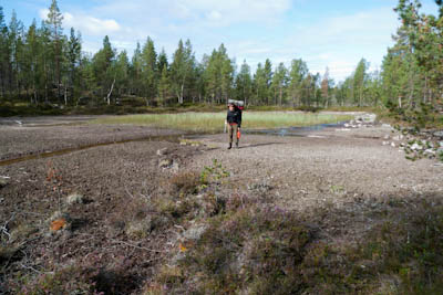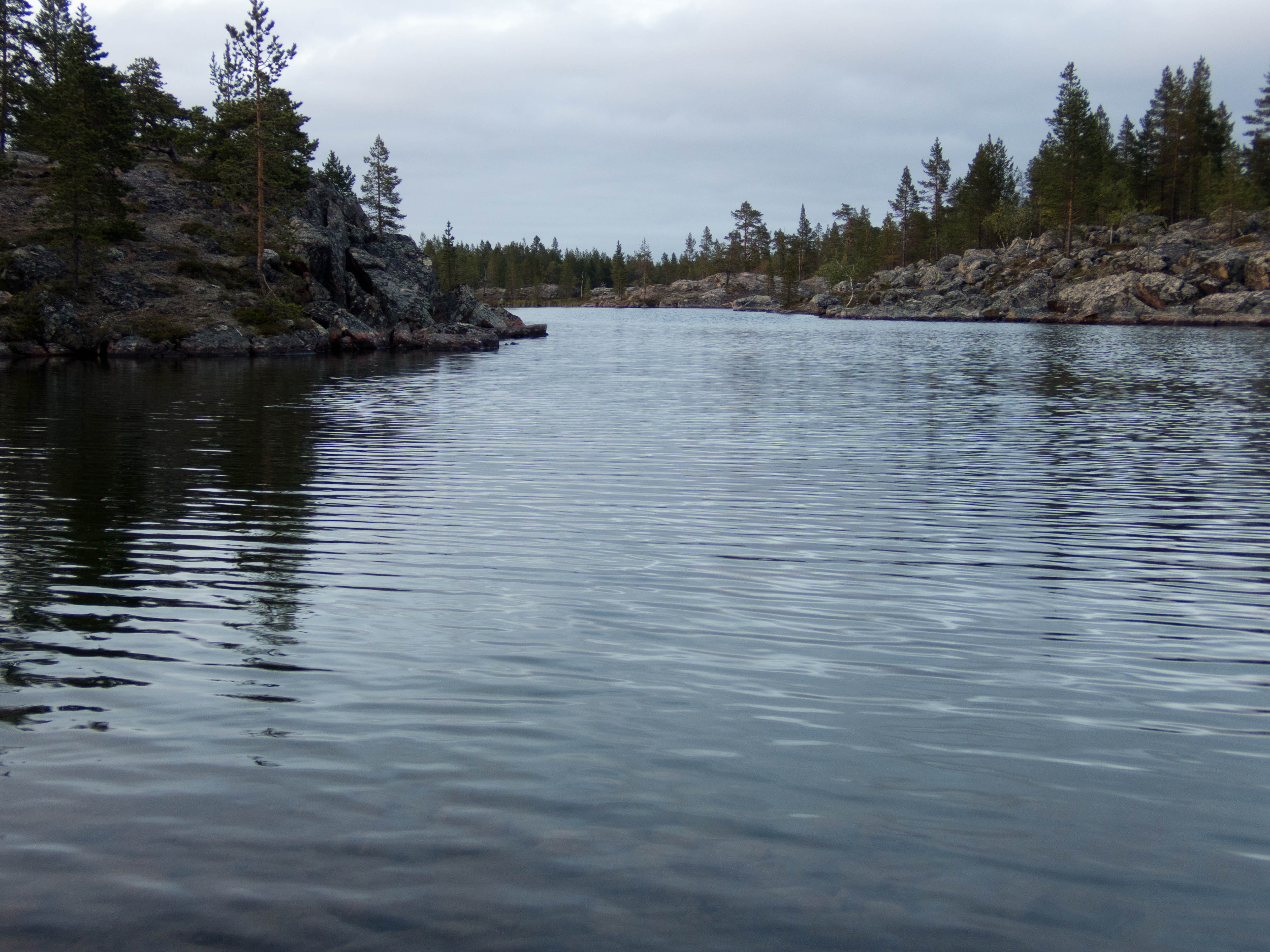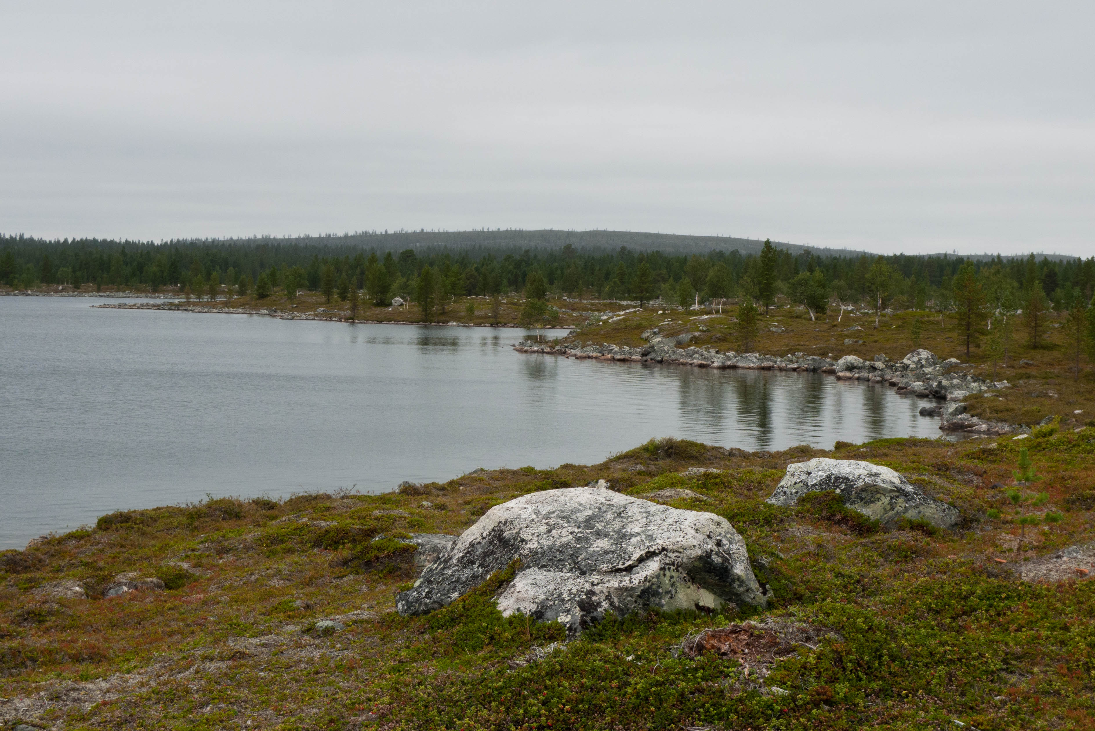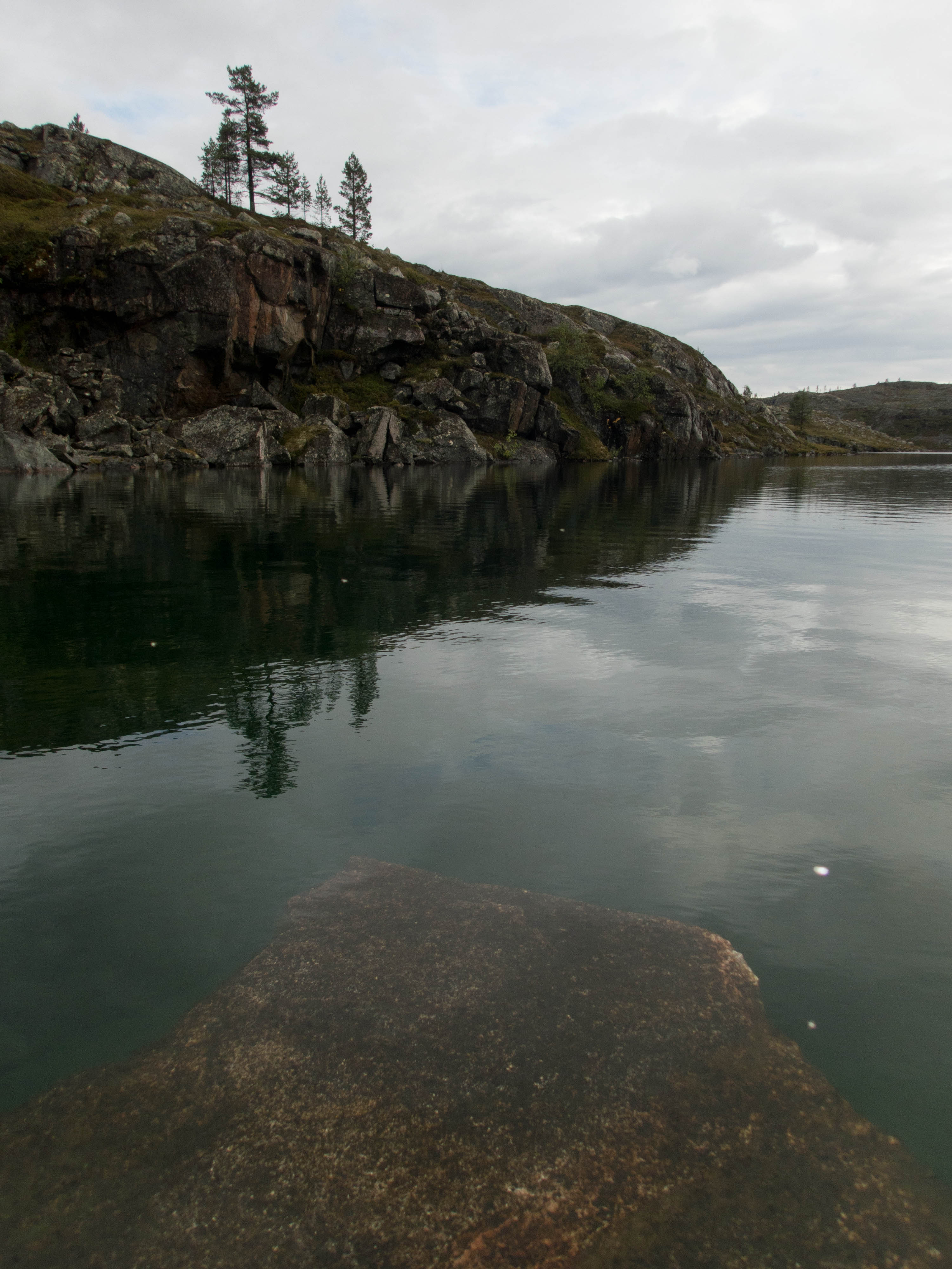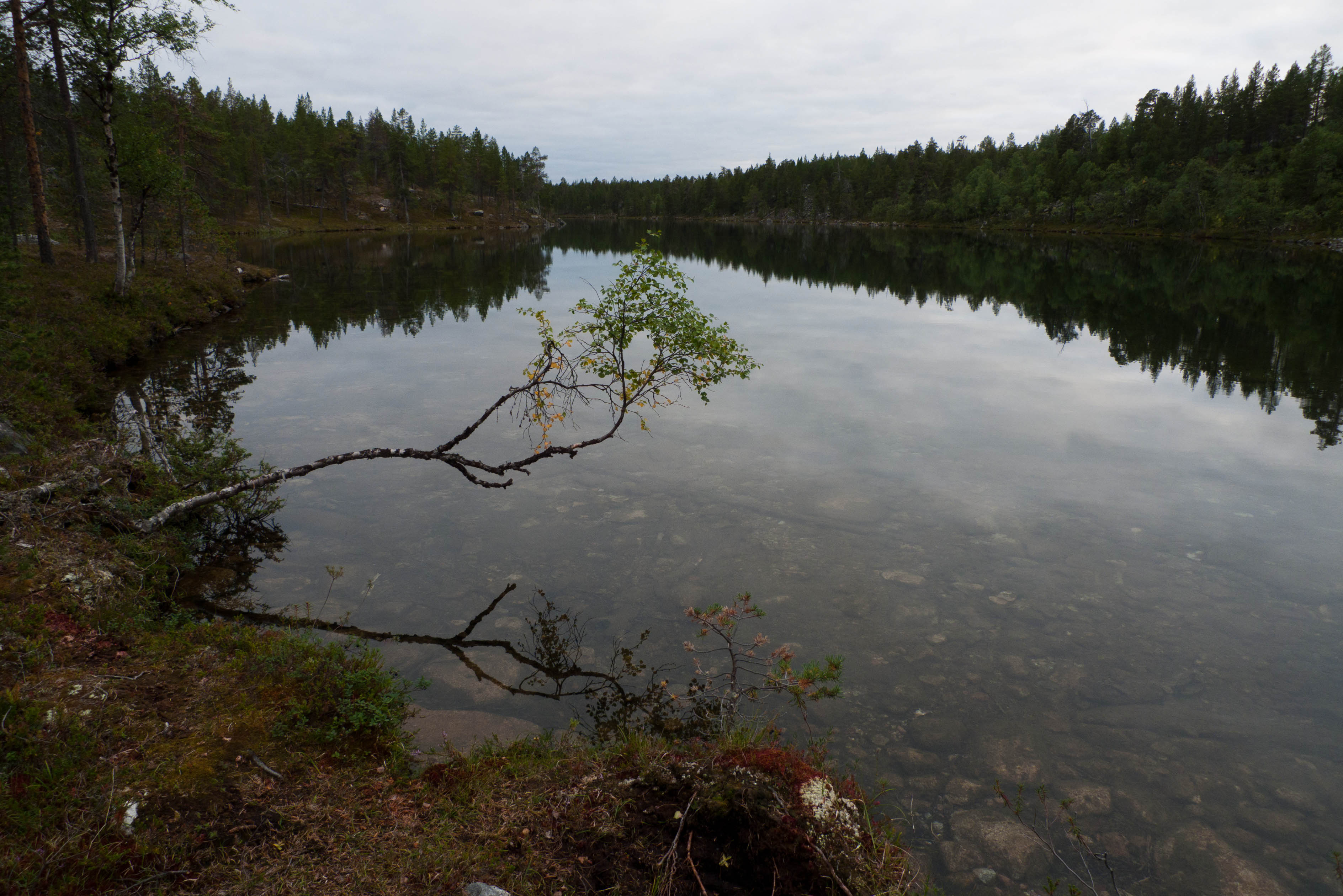 Aamu oli edellisen kaltainen. Sumu oli niin sakeaa, että näkyvyyttä oli vain pari sataa metriä. Liikkeelle lähdettiin sadehousuissa ja pitkähihaisessa paidassa. Tavoitteena oli Taljavaaran pohjoispuolella oleva nimetön järvi, jota olimme sivunneet edellisellä reissulla 2011. Ensimmäinen välietappi oli Hirvasjärven itäpääty, johon olimme leiriytyneet em. reissulla. Maasto oli kivikkoista ylänköä, jossa kasvoi harvakseltaan puita, ei kovin helppokulkuista. Suuntaa piti vähän väliä katsoa kompassista, kun ei näkynyt mitään erityisiä maanmerkkejä. Lopulta Hirvasjärvi putkahti esiin sumun seasta. Siellä näytti olevan kaksi lasikuituvenettä kenollaan samassa paikassa kuin edelliselläkin reissulla. Meidän kymmenen vuotta sitten kunnostama nuotiopaikkakin oli entisellään. Ehkä sitä oli joku käyttänyt, kun sammaltakaan ei ollut pohjalla. Matka jatkui turhalla kiipeämisellä edessä olevalle mäelle vain toteamaan, että sen takana on suota joka puolella. Seuraava moka tehtiin Hirvasselän pohjoispuolella, kun tultiin nimettömän, korkeudella 153.0 olevan järven rantaan. Jotenkin pääteltiin, että edessä oleva kapeikko on se järven päässä oleva kannas ja vesi on niin korkealla ettei siitä eikä seuraavastakaan pääse yli. Joten lähdettiin kiertämään oikean kautta yksi ylimääräinen kilometri. Näitä mokia on vaikea käsittää kotona nettikartan ääressä, mutta rinkka selässä vähän väsyneenä ja itikoiden inistessä päättelykyky joskus sakkaa. Siinä kannaksella olevassa lätäkössä lillui erikoisen näköistä mössöä, vaikka järven vesi oli molemmin puolin ihan kirkasta. Loppumatka sujui taas ongelmitta. Nimettömän kohdejärven eteläkärjessä odotti sama veistoksellinen juurakko, jonka ikuistin edellisellä reissulla. Vähän näyttää ajan hammas syöneen. Puolukka oli ottanut rungon kasvualustakseen ennen sen maatumista. Lähdettiin etsimään telttapaikkaa järven länsirannalta. Aika pitkälle saatiin mennä, mutta lopulta löydettiin oikein hyvä leiripaikka. Matkalla törmättiin erikoiseen luonnon muovaamaan vesiliukumäkeen, ei kuitenkaan testattu. Illan mittaan kierrettiin koko järvi kalastellen, mutta ei mitään. Syvyyttäkin oli paikoitelleen niin, että luulisin kalan selviävän talven yli. Tummuvassa illassa tuijoteltiin tyyntyvää järven pintaa, mutta yhtään selvää tuikkia ei näkynyt. Pitäisiköhän tämäkin järvi liittää Vätsärin lukuisaan Kalattomien järvien luetteloon.
